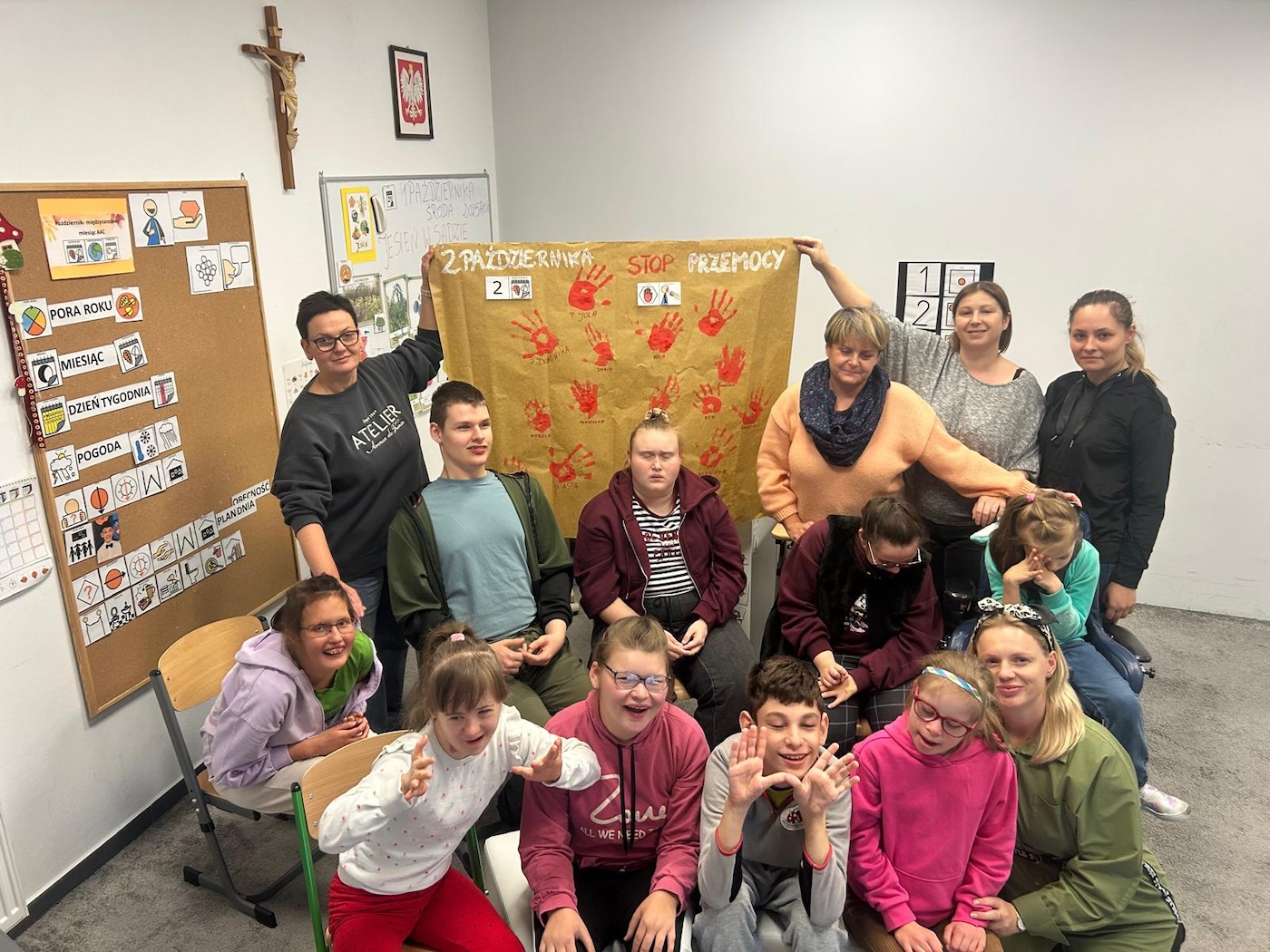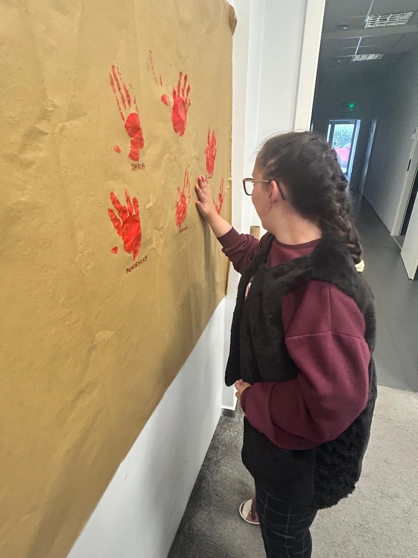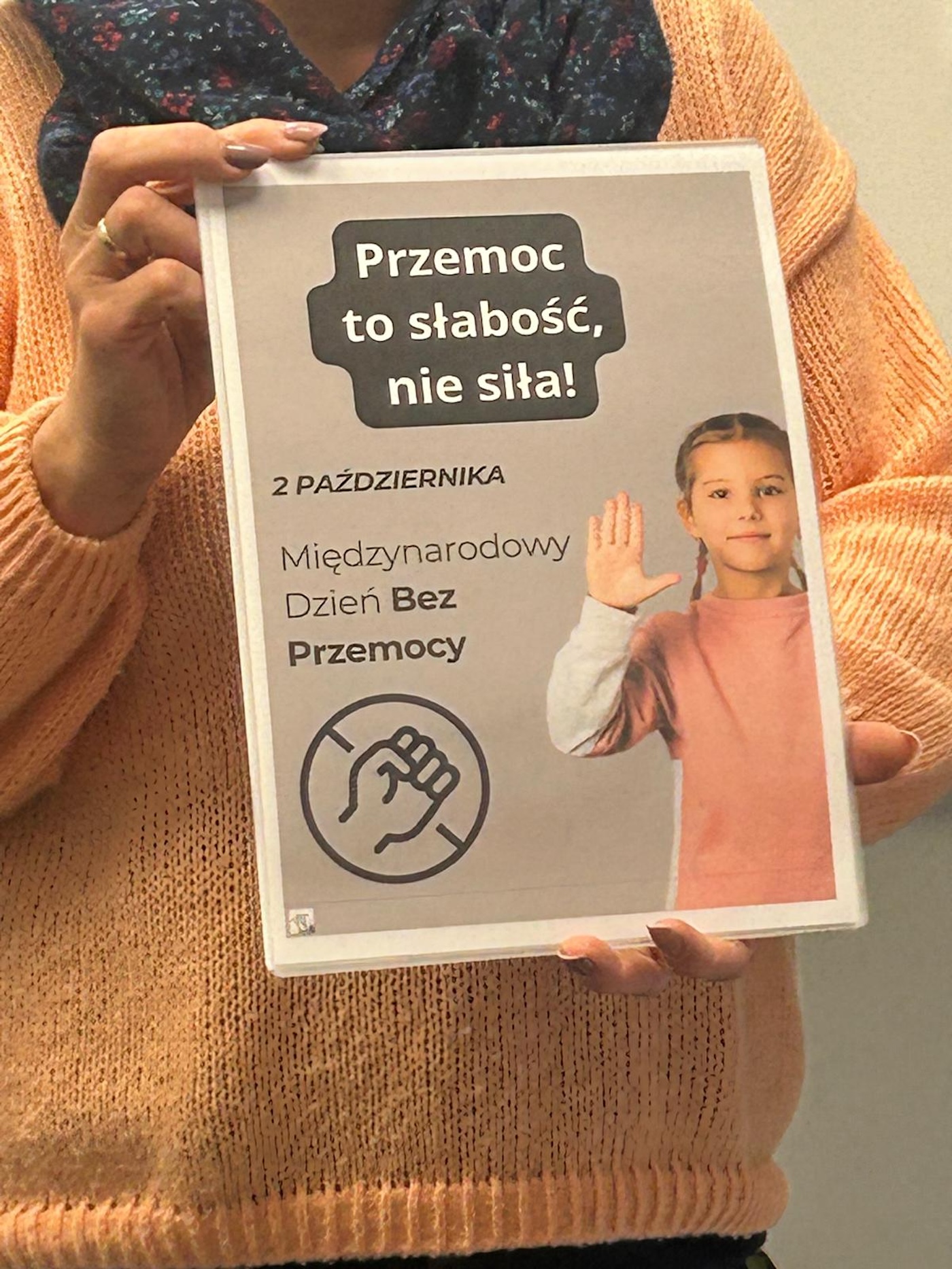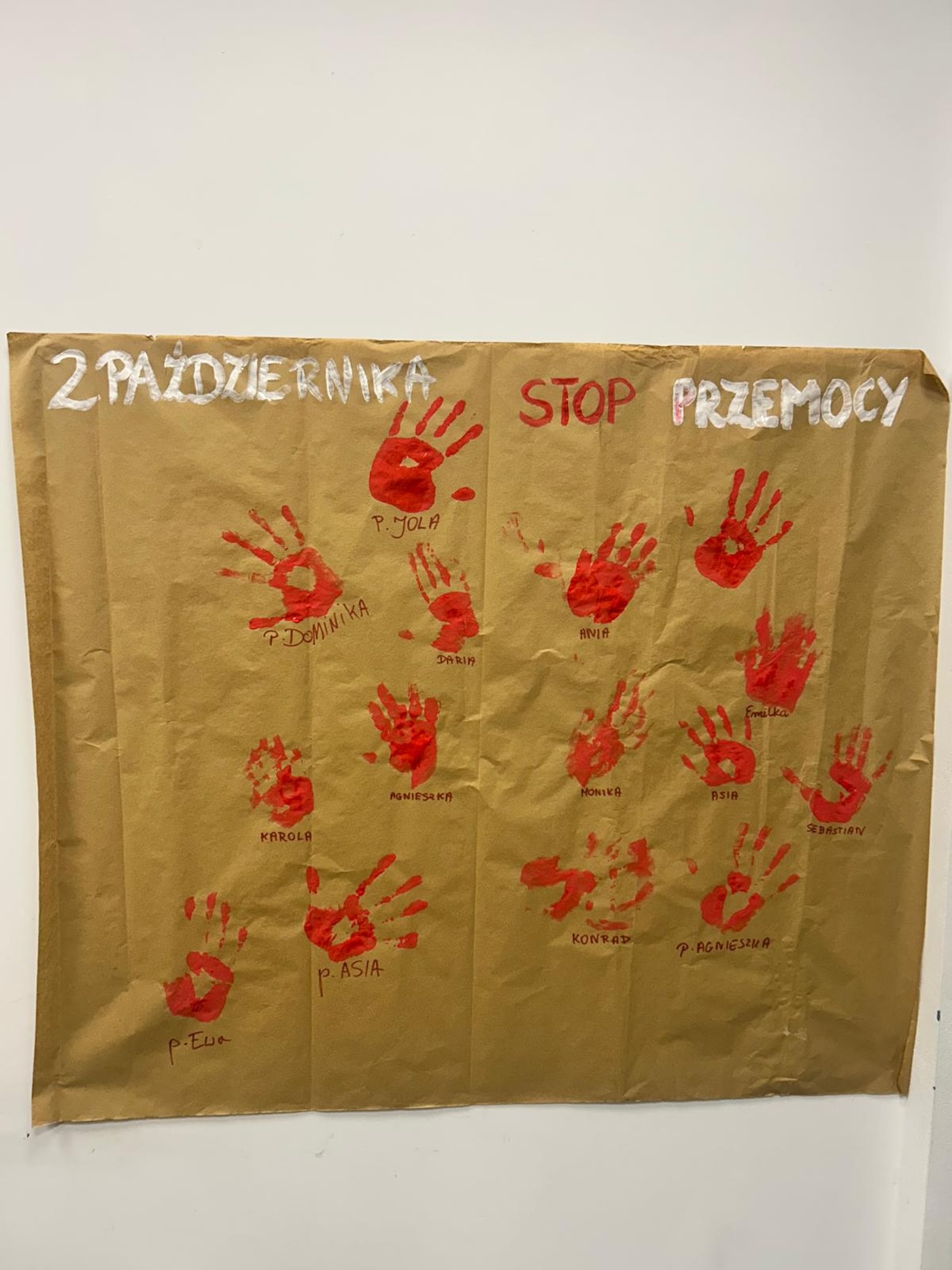 2 października obchodziliśmy w naszej szkole Międzynarodowy Dzień bez Przemocy. Celem tego dnia było uświadomienie uczniom, czym jest przemoc, jak jej przeciwdziałać, w jaki sposób reagować w sytuacjach trudnych oraz jak powinniśmy się wobec siebie nawzajem zachowywać. Zajęcia miały różnorodny charakter – rozmawialiśmy o emocjach i zachowaniach, pracowaliśmy z kartami pracy oraz prowadziliśmy wspólne dyskusje. Uczniowie obejrzeli film edukacyjny „Stop przemocy” i wysłuchali piosenki poruszającej temat przemocy w szkołach. Na zakończenie każde dziecko, wspólnie z opiekunem, wykonało symboliczną pracę plastyczną – odciskając czerwoną dłoń jako znak sprzeciwu wobec przemocy. Obchody Dnia bez Przemocy stanowiły ważny element działań wychowawczych szkoły. Uczniowie aktywnie uczestniczyli w zajęciach, wykazali się zaangażowaniem i zrozumieniem podejmowanej tematyki.