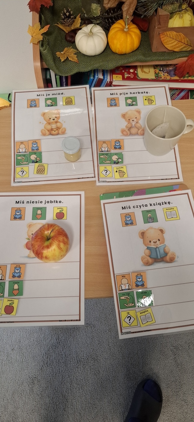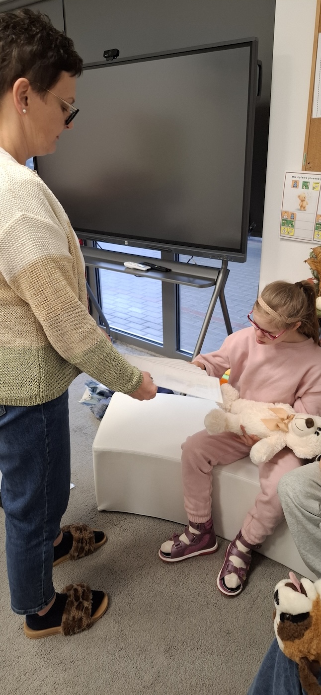 Następnie dzieci z oddziału III przystąpiły do zajęć plastycznych. Na przygotowanym wcześniej szablonie misia, przy wsparciu nauczyciela, nakładały klej i posypywały sylwetkę misia brązową posypką, tworząc fakturę przypominającą futerko. Na zakończenie każdy miś został udekorowany kokardką, dzięki czemu prace nabrały indywidualnego charakteru.