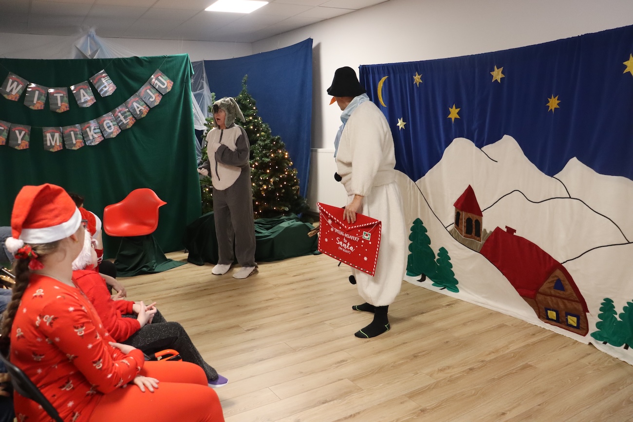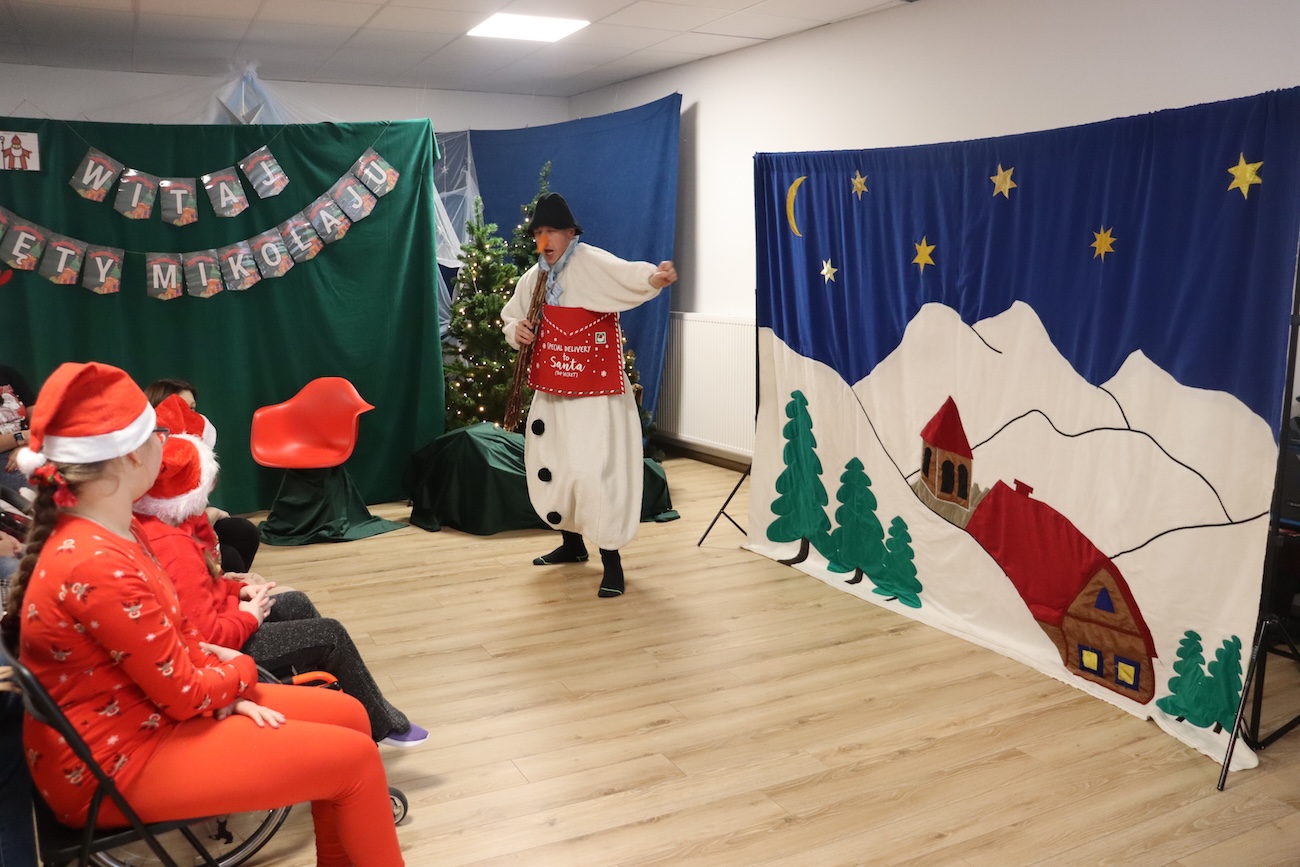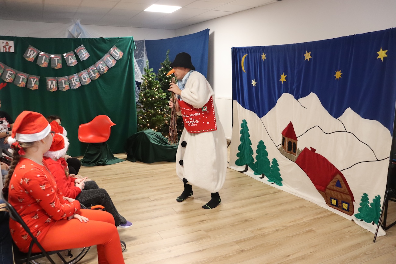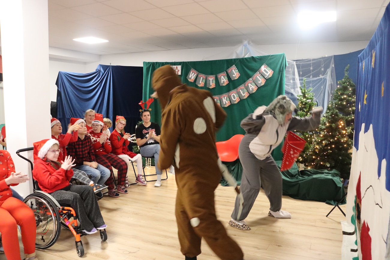 Po raz kolejny odwiedził nas Teatrzyk Skrzat z Krakowa. Uczniowie naszej szkoły specjalnej mieli okazję obejrzeć pełne magii i świątecznego nastroju przedstawienie pt. „List do Mikołaja”. Bohaterowie spektaklu zabrali dzieci w niezwykłą podróż do krainy Świętego Mikołaja, gdzie uczniowie spotkali się z takimi postaciami jak: lalka, pajacyk, bałwan, zajączek, miś, dziewczynka oraz Święty Mikołaj. Czy tylko dzieci piszą listy do Mikołaja? Nic bardziej mylnego! W tym roku swój pierwszy list napisały… zabawki. Uczniowie z dużym zaangażowaniem uczestniczyli w teatrzyku, aktywnie pomagając bohaterom w dostarczeniu listu do Mikołaja. Przedstawienie bardzo spodobało się naszym uczniom – z zainteresowaniem śledzili losy bohaterów, reagowali śmiechem, gestami i spontaniczną radością. Spotkanie z teatrem było nie tylko wspaniałą formą rozrywki, ale także okazją do rozwijania wyobraźni, wrażliwości emocjonalnej oraz umiejętności społecznych. Świąteczna atmosfera i bezpośredni kontakt z aktorami sprawiły, że wydarzenie na długo pozostanie w pamięci naszych uczniów.