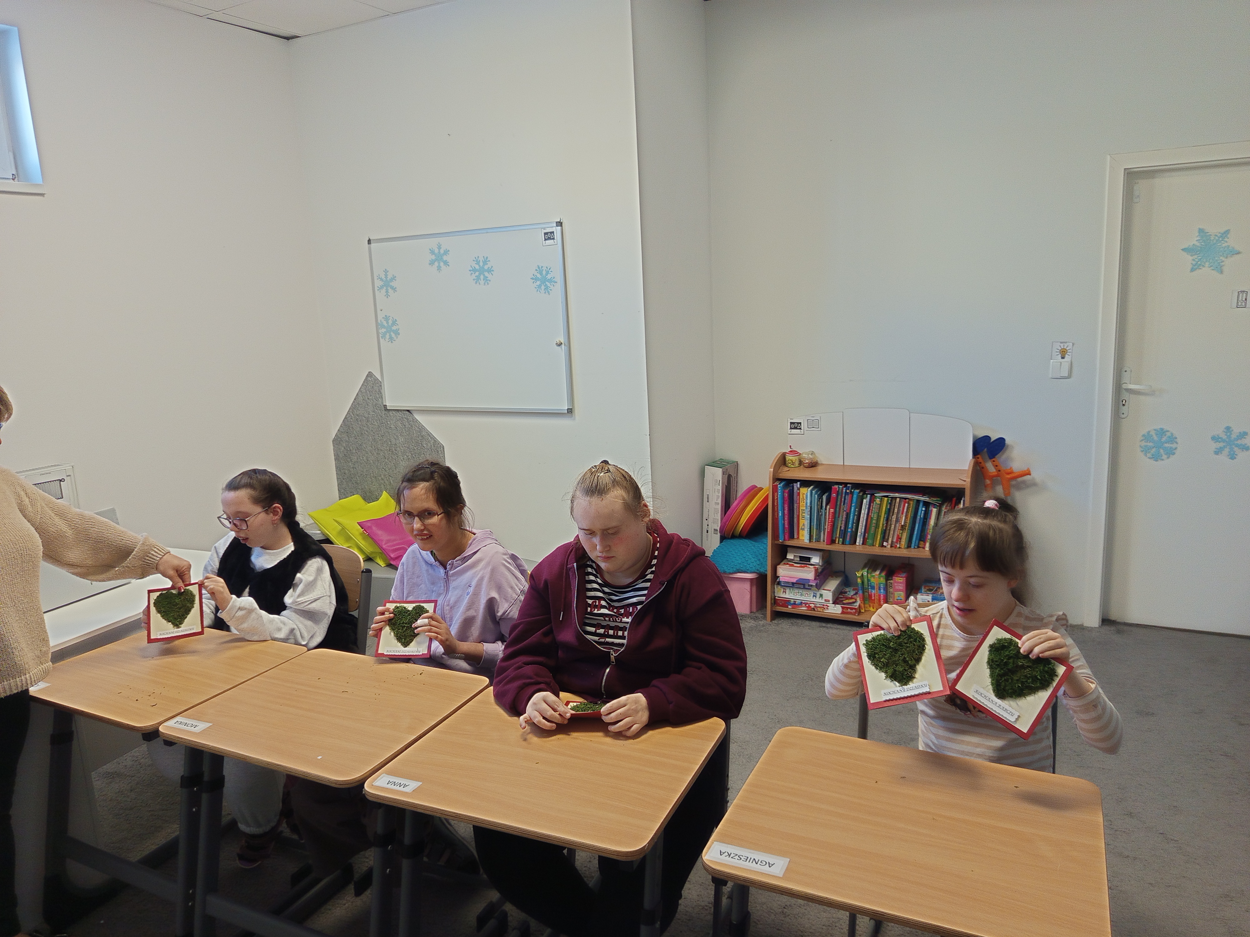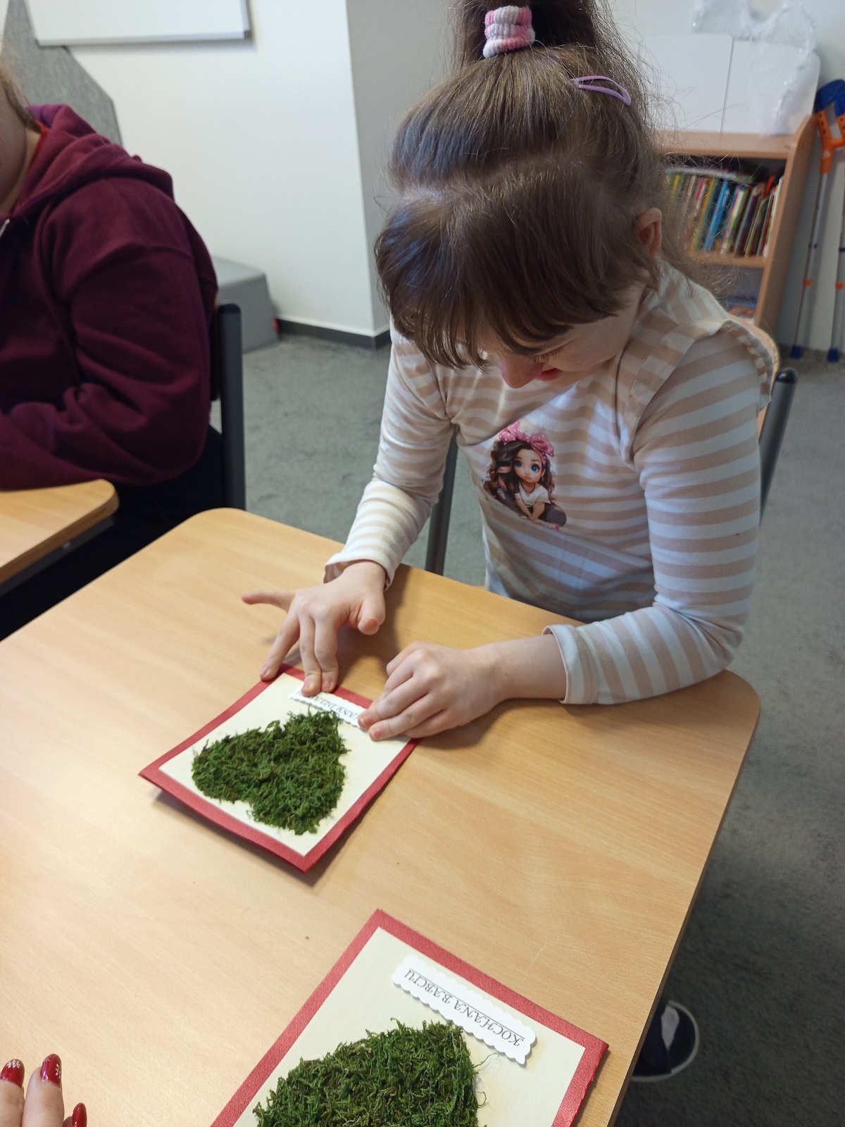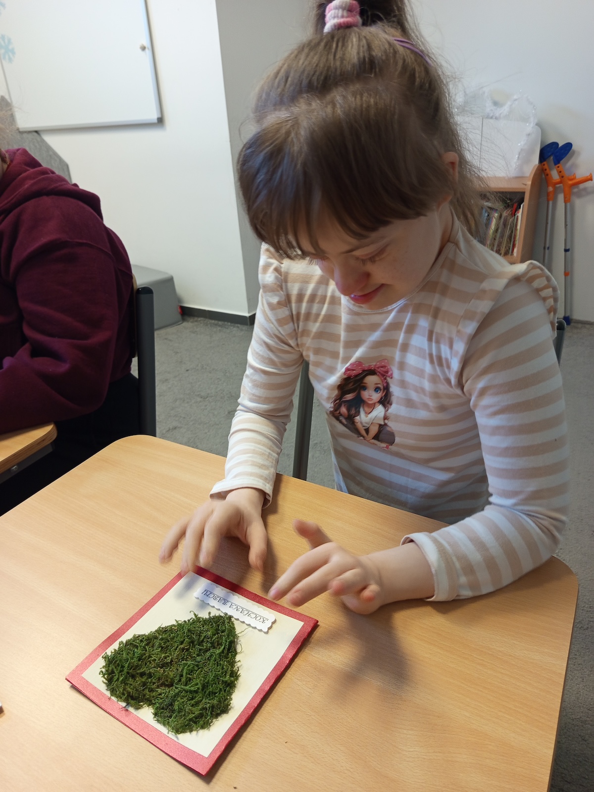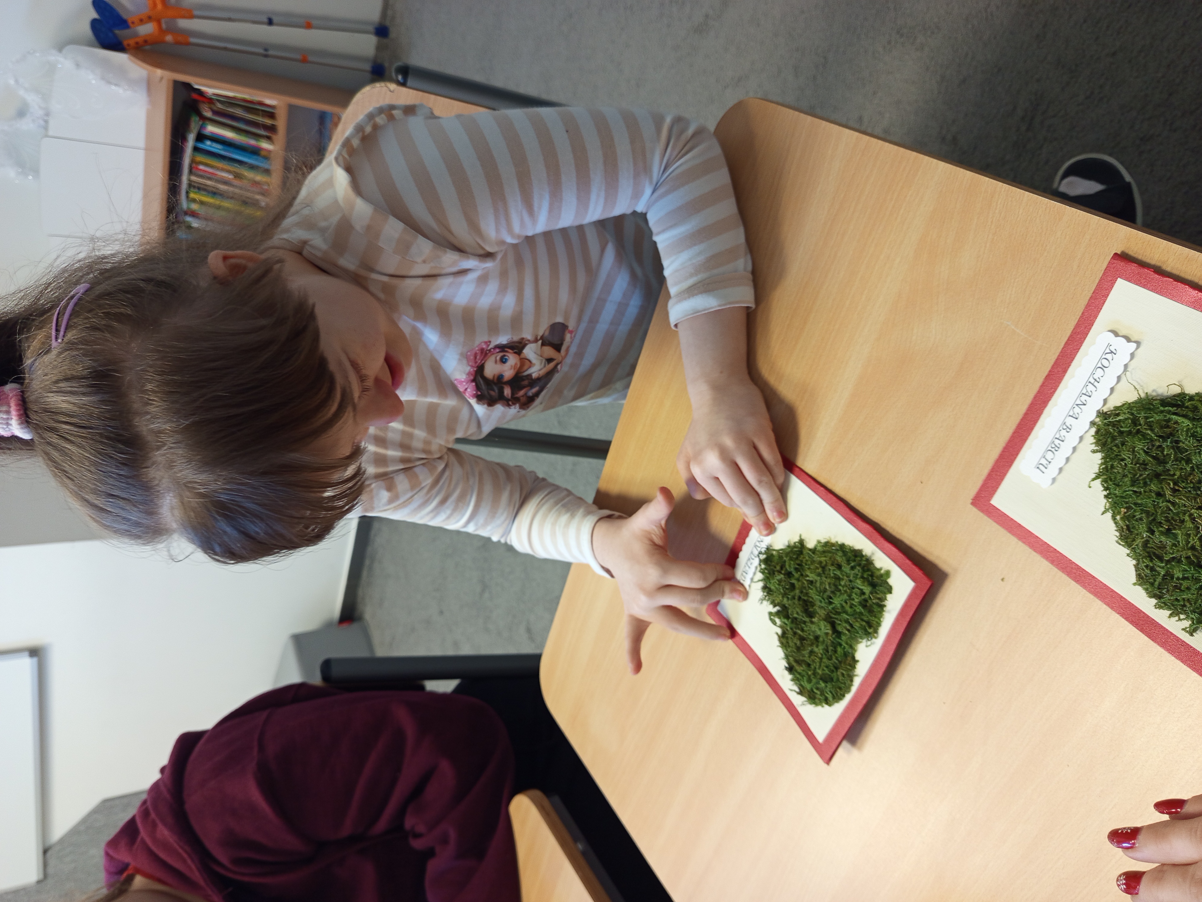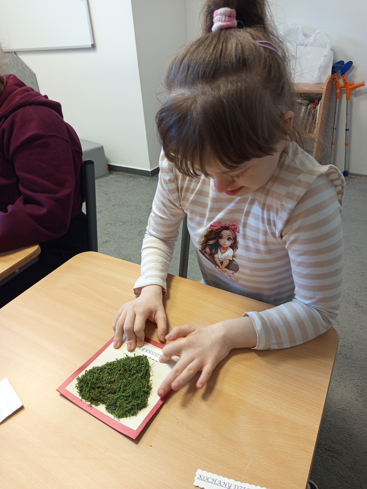 Uczniowie oddziału „II” również wykonali piękne prace. Na ozdobnych kartkach rysowali serce, które następnie wyklejali sztucznym mchem. W centralnym miejscu każdej laurki znalazł się symbol MÓWikowy „KOCHAM CIĘ”, wyrażający uczucia w zrozumiały sposób. Wykonane z ogromnym zaangażowaniem i radością kartki zostały wręczone babciom i dziadkom podczas wspólnych warsztatów florystycznych zorganizowanych z okazji ich święta. Był to piękny czas spotkań, bliskości i wzruszeń.