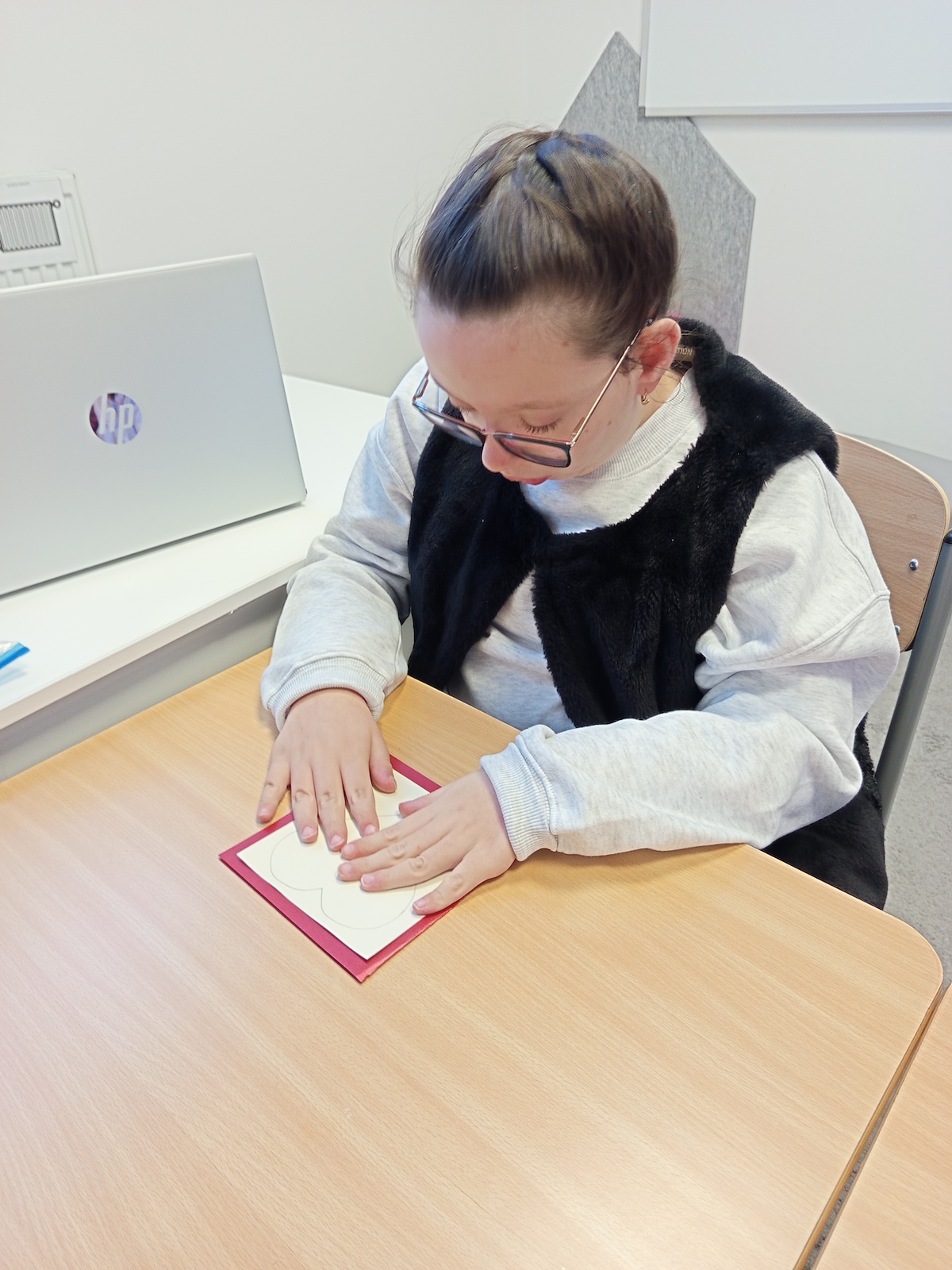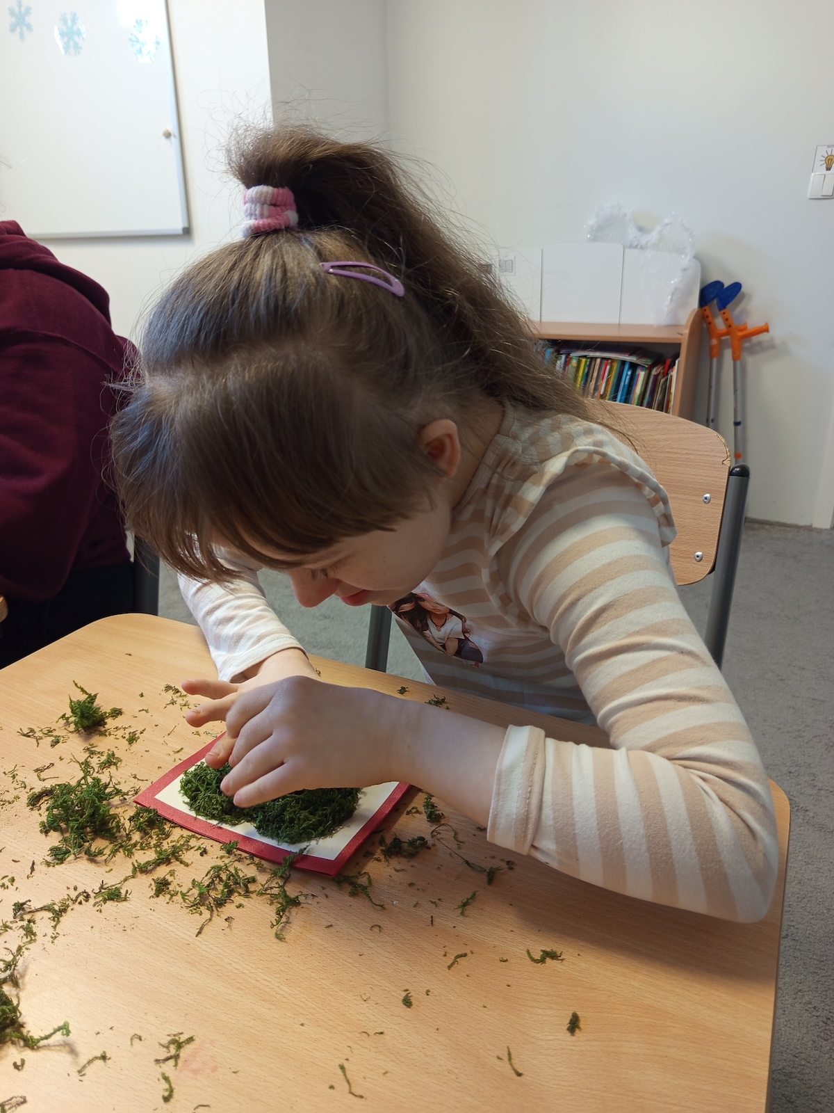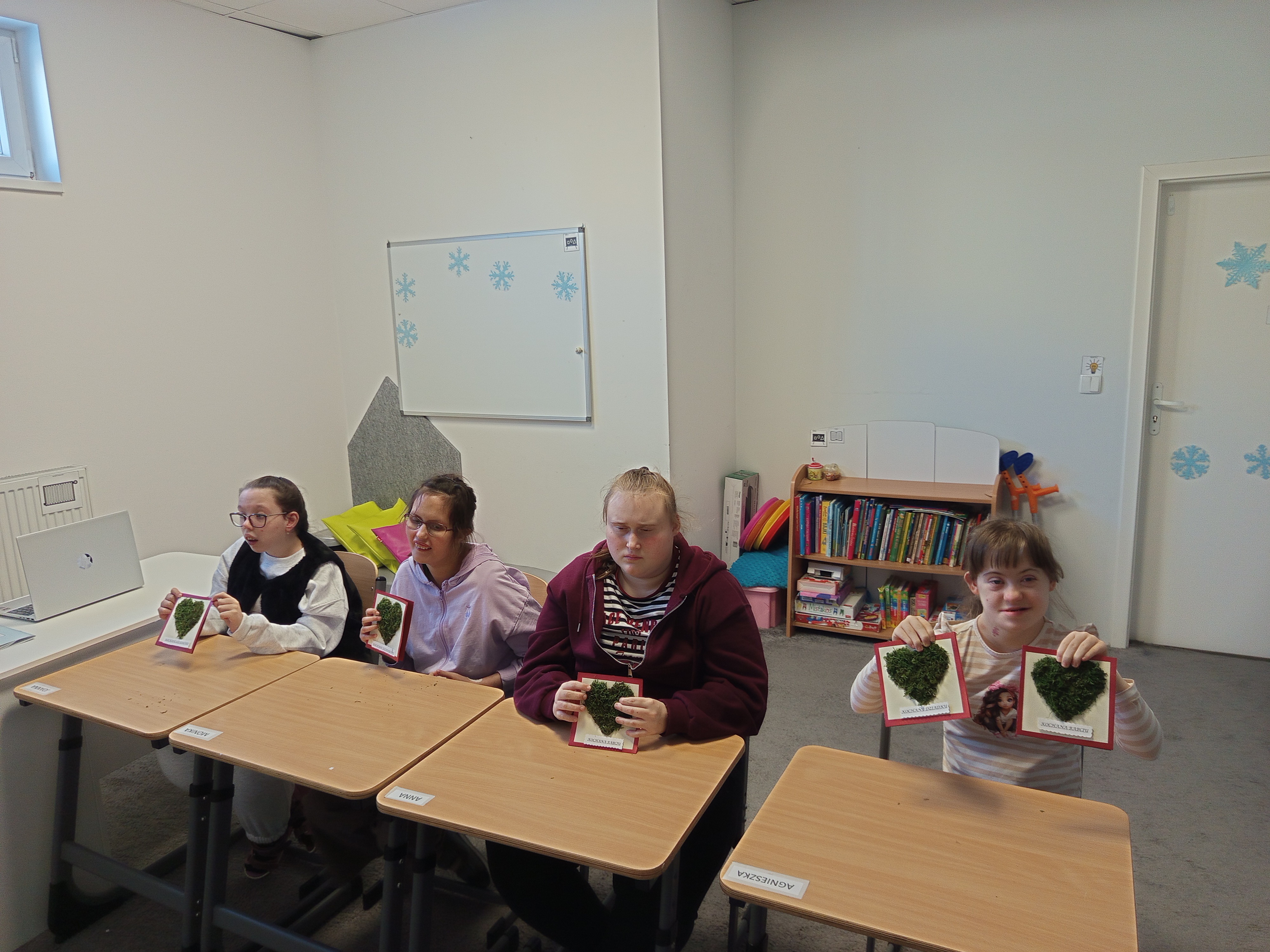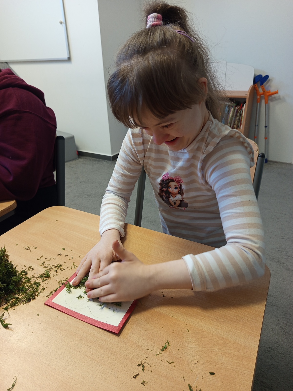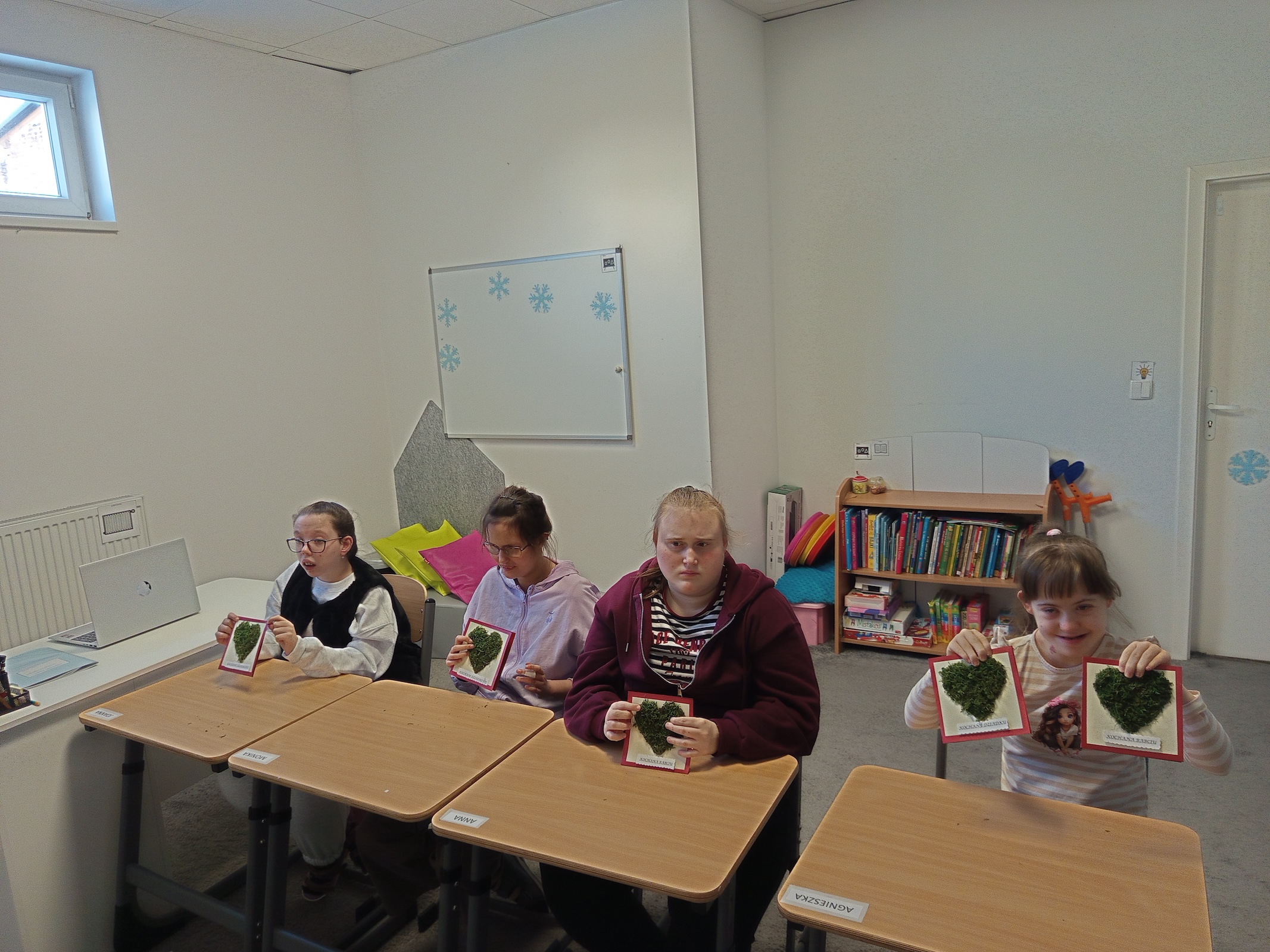 Uczniowie oddziału „II” również wykonali piękne prace. Na ozdobnych kartkach rysowali serce, które następnie wyklejali sztucznym mchem. W centralnym miejscu każdej laurki znalazł się symbol MÓWikowy „KOCHAM CIĘ”, wyrażający uczucia w zrozumiały sposób. Wykonane z ogromnym zaangażowaniem i radością kartki zostały wręczone babciom i dziadkom podczas wspólnych warsztatów florystycznych zorganizowanych z okazji ich święta. Był to piękny czas spotkań, bliskości i wzruszeń.
