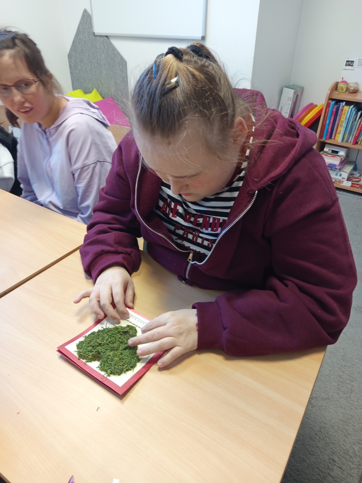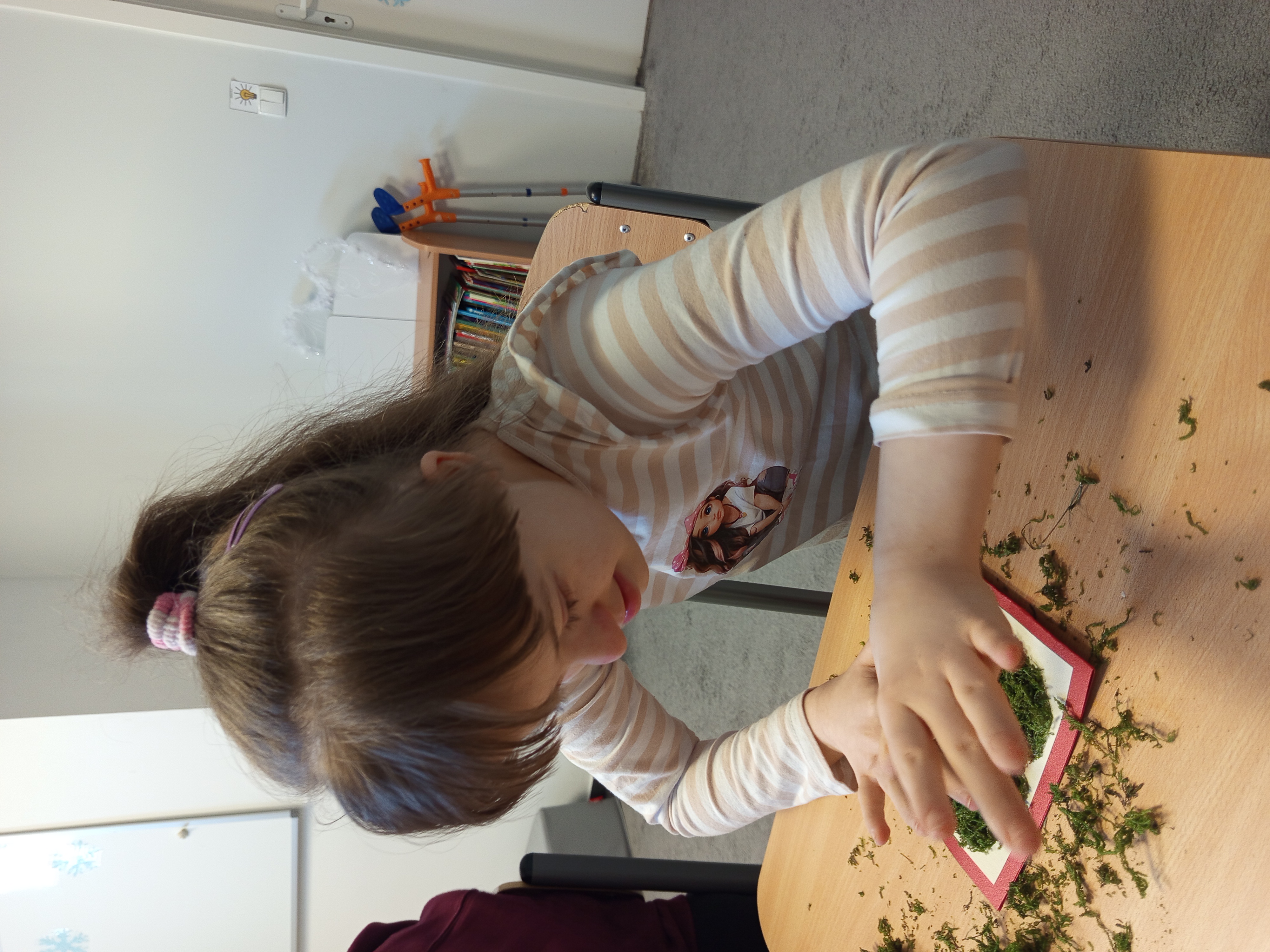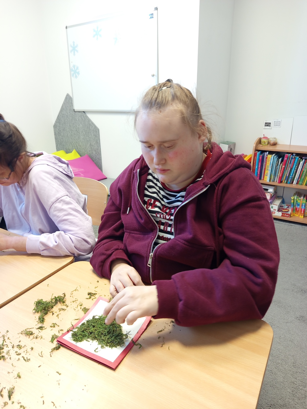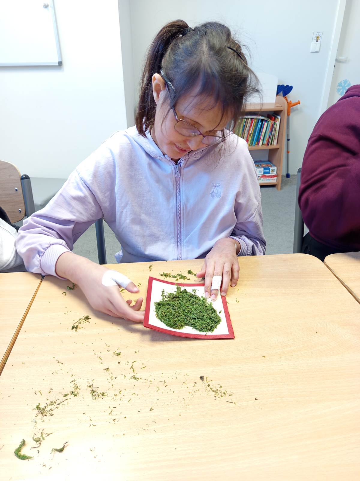 Uczniowie oddziału „II” również wykonali piękne prace. Na ozdobnych kartkach rysowali serce, które następnie wyklejali sztucznym mchem. W centralnym miejscu każdej laurki znalazł się symbol MÓWikowy „KOCHAM CIĘ”, wyrażający uczucia w zrozumiały sposób. Wykonane z ogromnym zaangażowaniem i radością kartki zostały wręczone babciom i dziadkom podczas wspólnych warsztatów florystycznych zorganizowanych z okazji ich święta. Był to piękny czas spotkań, bliskości i wzruszeń.