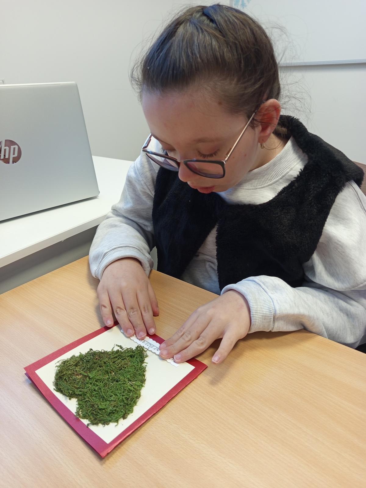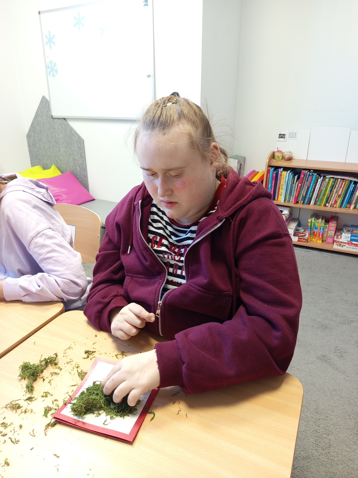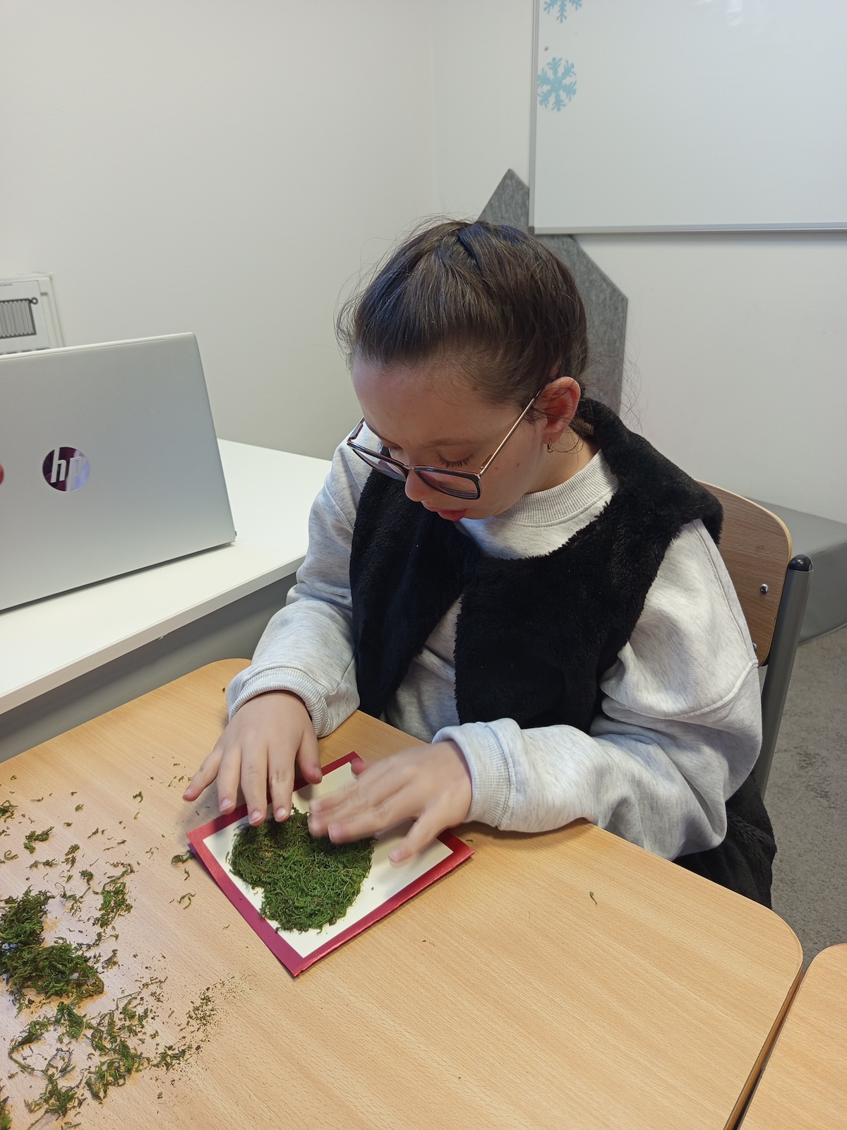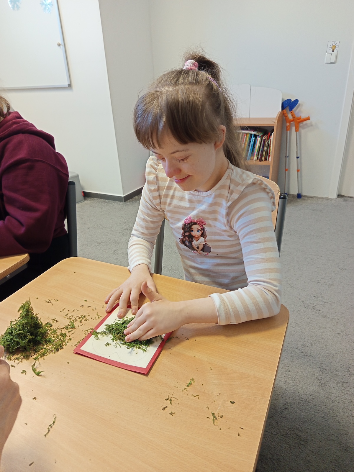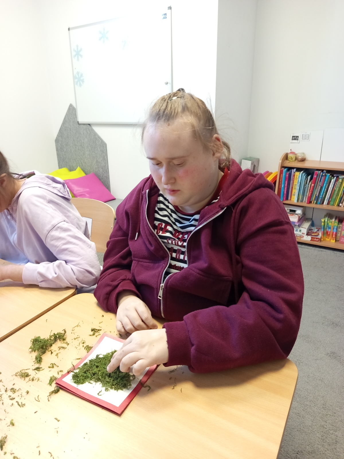 Uczniowie oddziału „II” również wykonali piękne prace. Na ozdobnych kartkach rysowali serce, które następnie wyklejali sztucznym mchem. W centralnym miejscu każdej laurki znalazł się symbol MÓWikowy „KOCHAM CIĘ”, wyrażający uczucia w zrozumiały sposób. Wykonane z ogromnym zaangażowaniem i radością kartki zostały wręczone babciom i dziadkom podczas wspólnych warsztatów florystycznych zorganizowanych z okazji ich święta. Był to piękny czas spotkań, bliskości i wzruszeń.