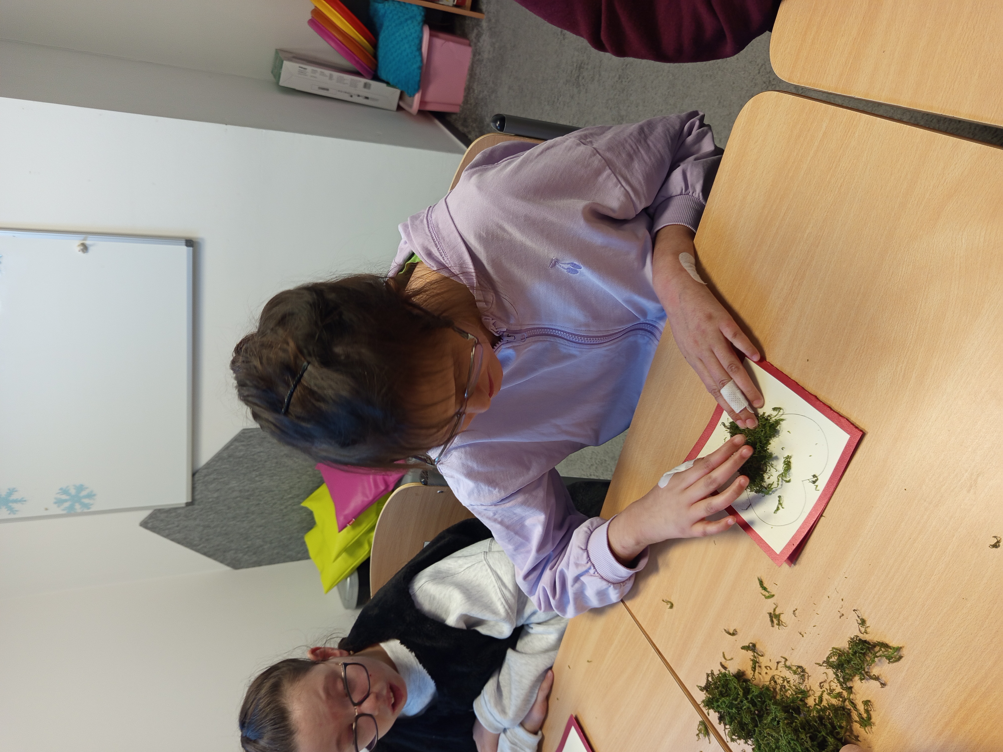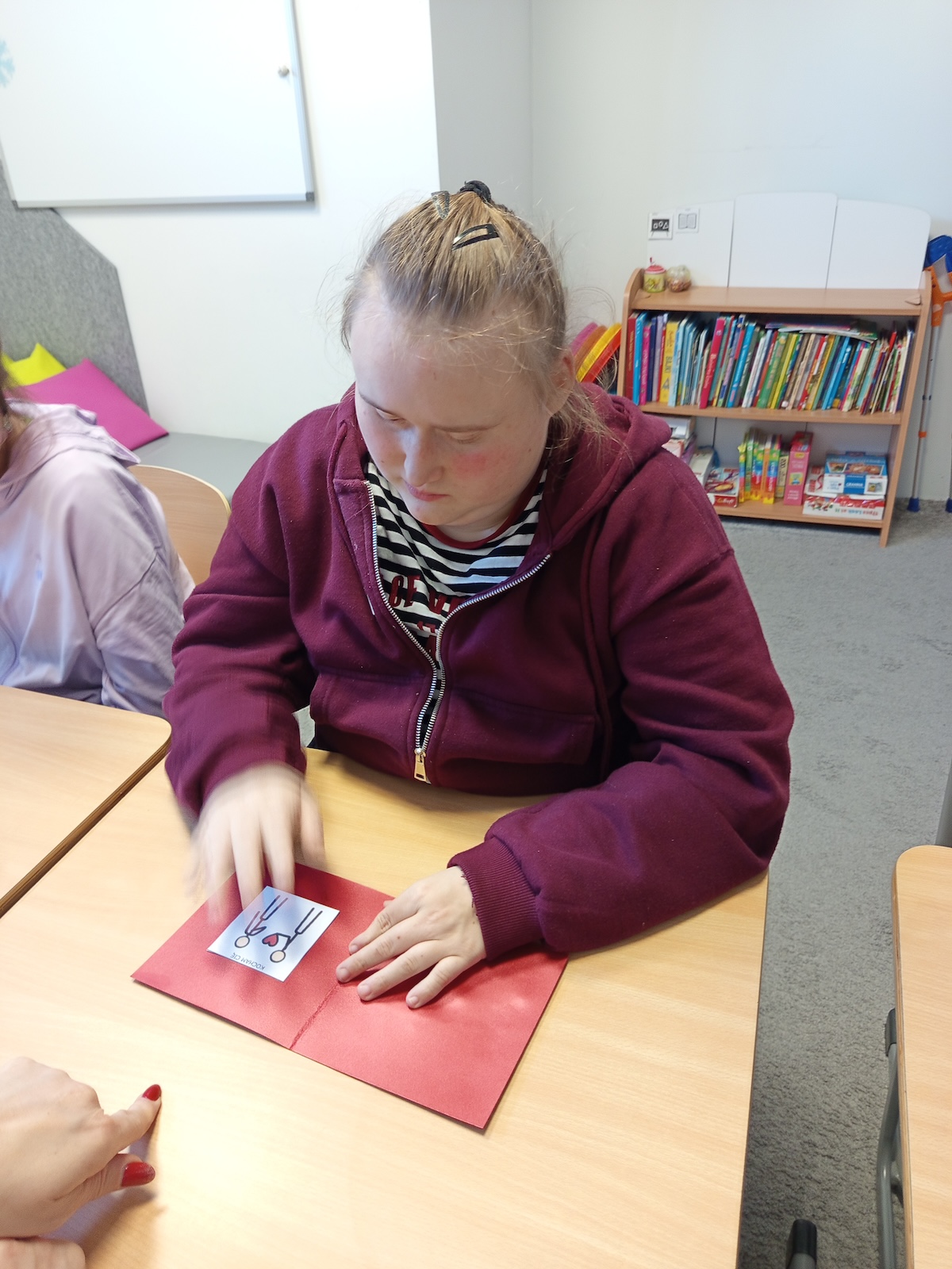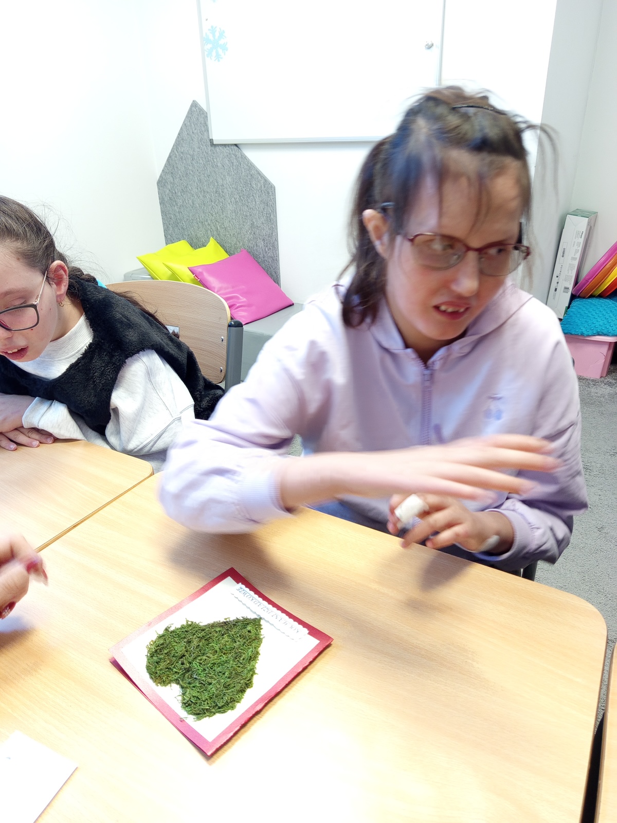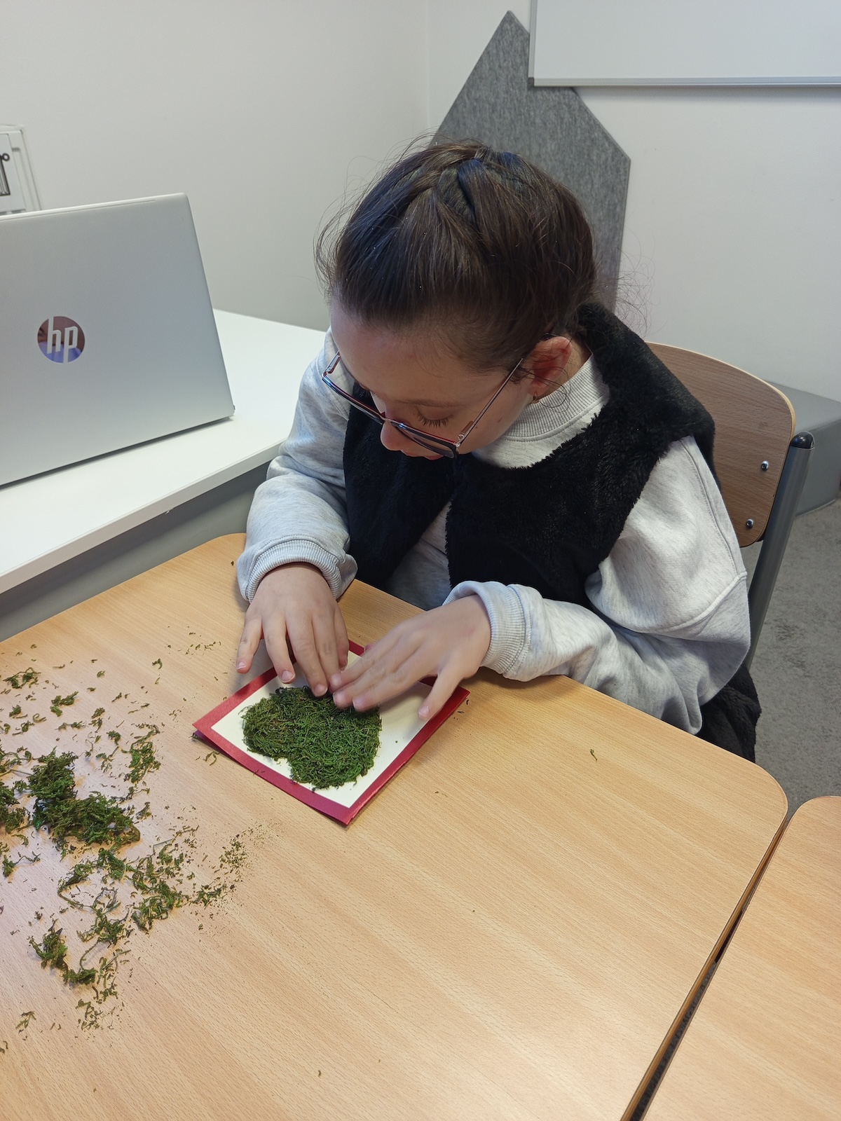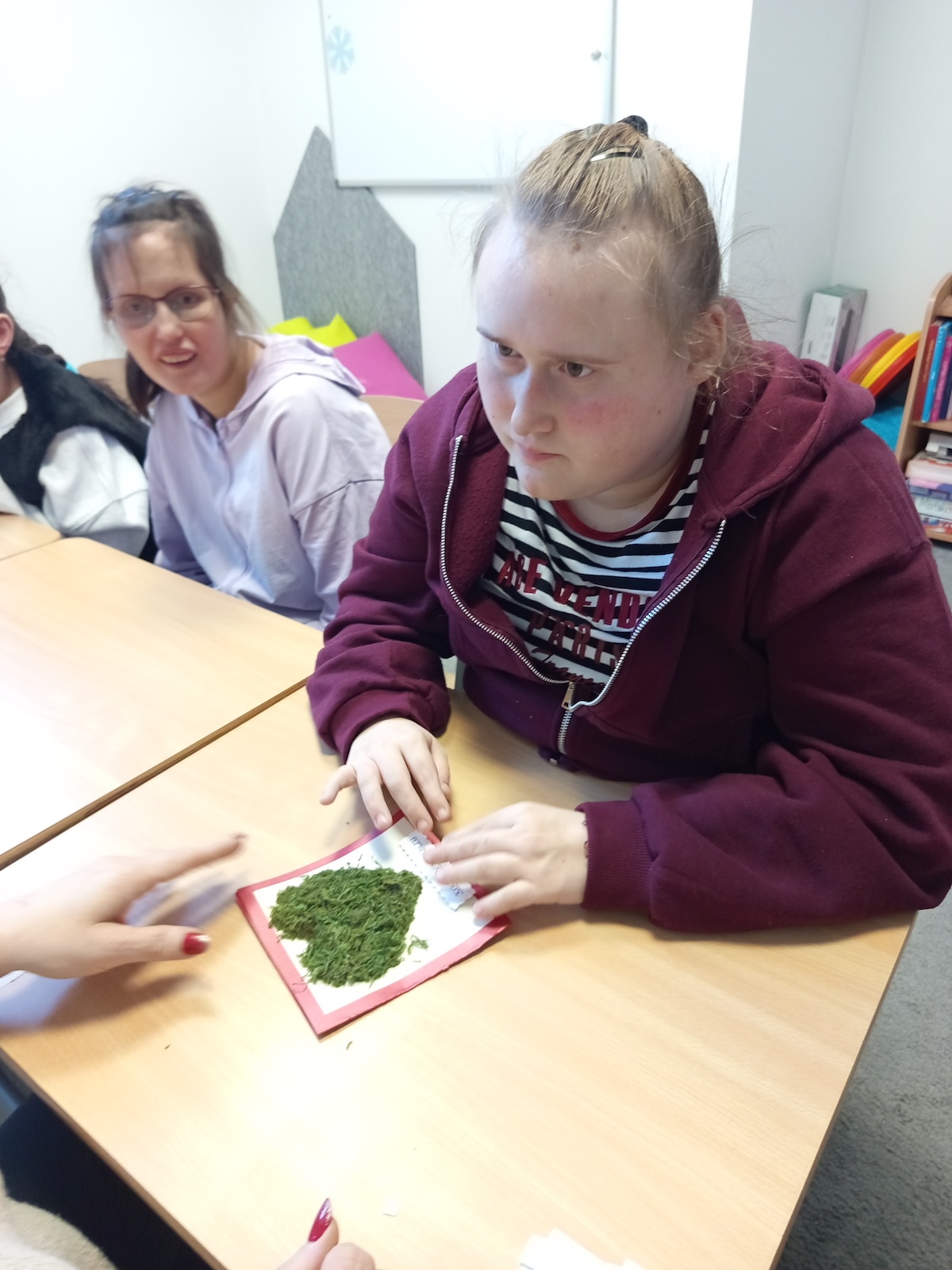 Uczniowie oddziału „II” również wykonali piękne prace. Na ozdobnych kartkach rysowali serce, które następnie wyklejali sztucznym mchem. W centralnym miejscu każdej laurki znalazł się symbol MÓWikowy „KOCHAM CIĘ”, wyrażający uczucia w zrozumiały sposób. Wykonane z ogromnym zaangażowaniem i radością kartki zostały wręczone babciom i dziadkom podczas wspólnych warsztatów florystycznych zorganizowanych z okazji ich święta. Był to piękny czas spotkań, bliskości i wzruszeń.