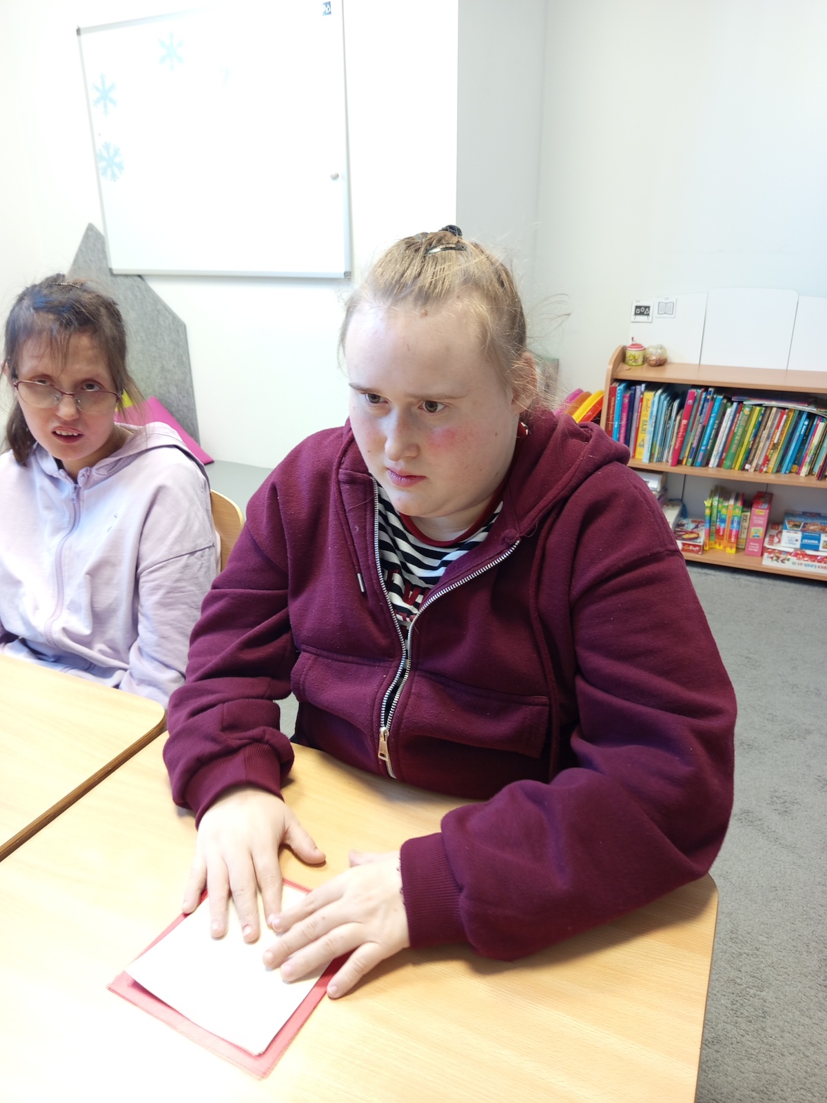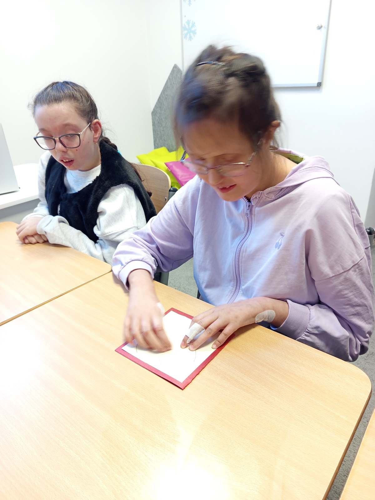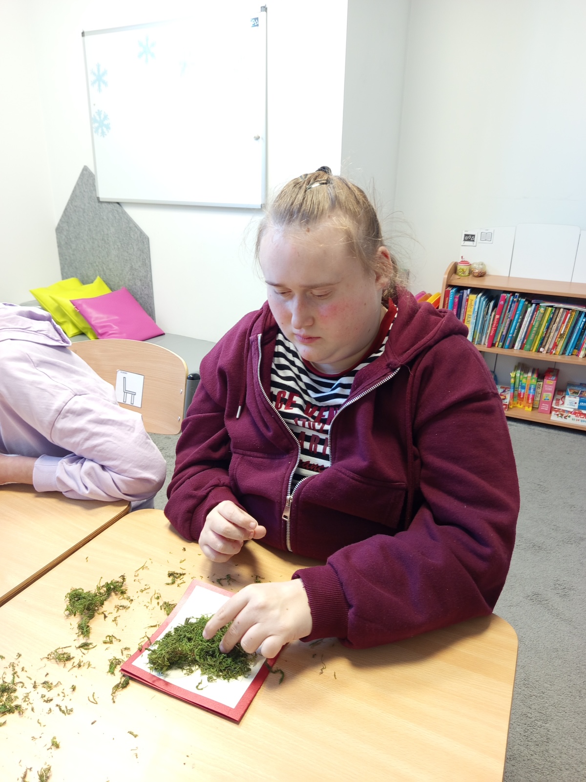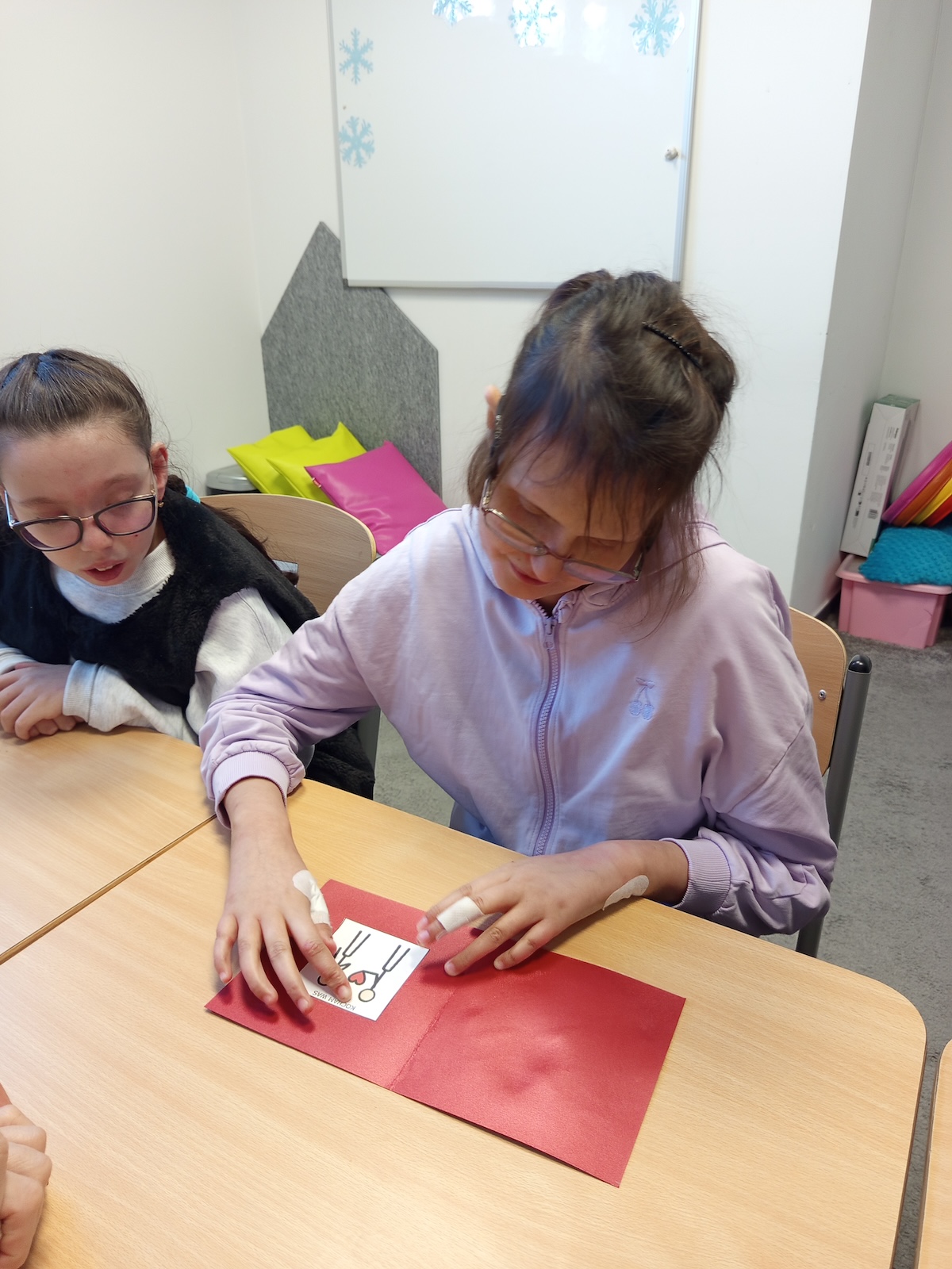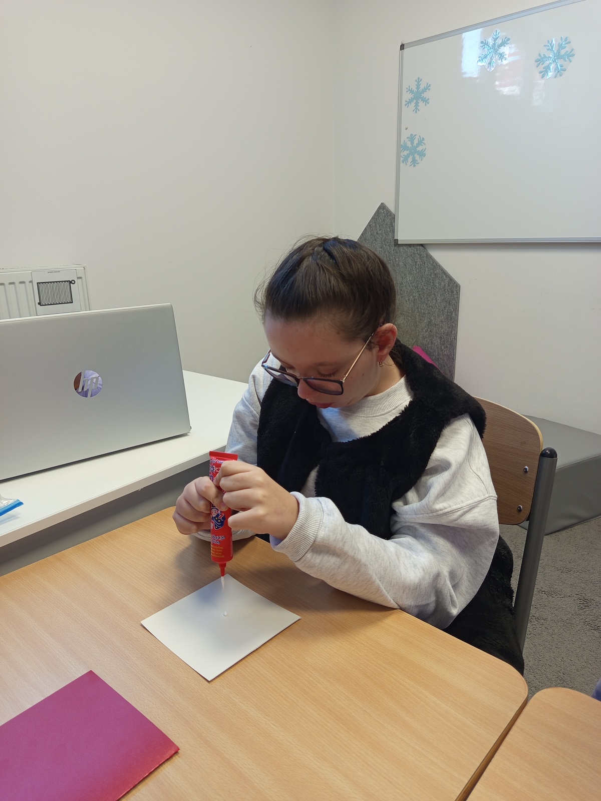 Uczniowie oddziału „II” również wykonali piękne prace. Na ozdobnych kartkach rysowali serce, które następnie wyklejali sztucznym mchem. W centralnym miejscu każdej laurki znalazł się symbol MÓWikowy „KOCHAM CIĘ”, wyrażający uczucia w zrozumiały sposób. Wykonane z ogromnym zaangażowaniem i radością kartki zostały wręczone babciom i dziadkom podczas wspólnych warsztatów florystycznych zorganizowanych z okazji ich święta. Był to piękny czas spotkań, bliskości i wzruszeń.