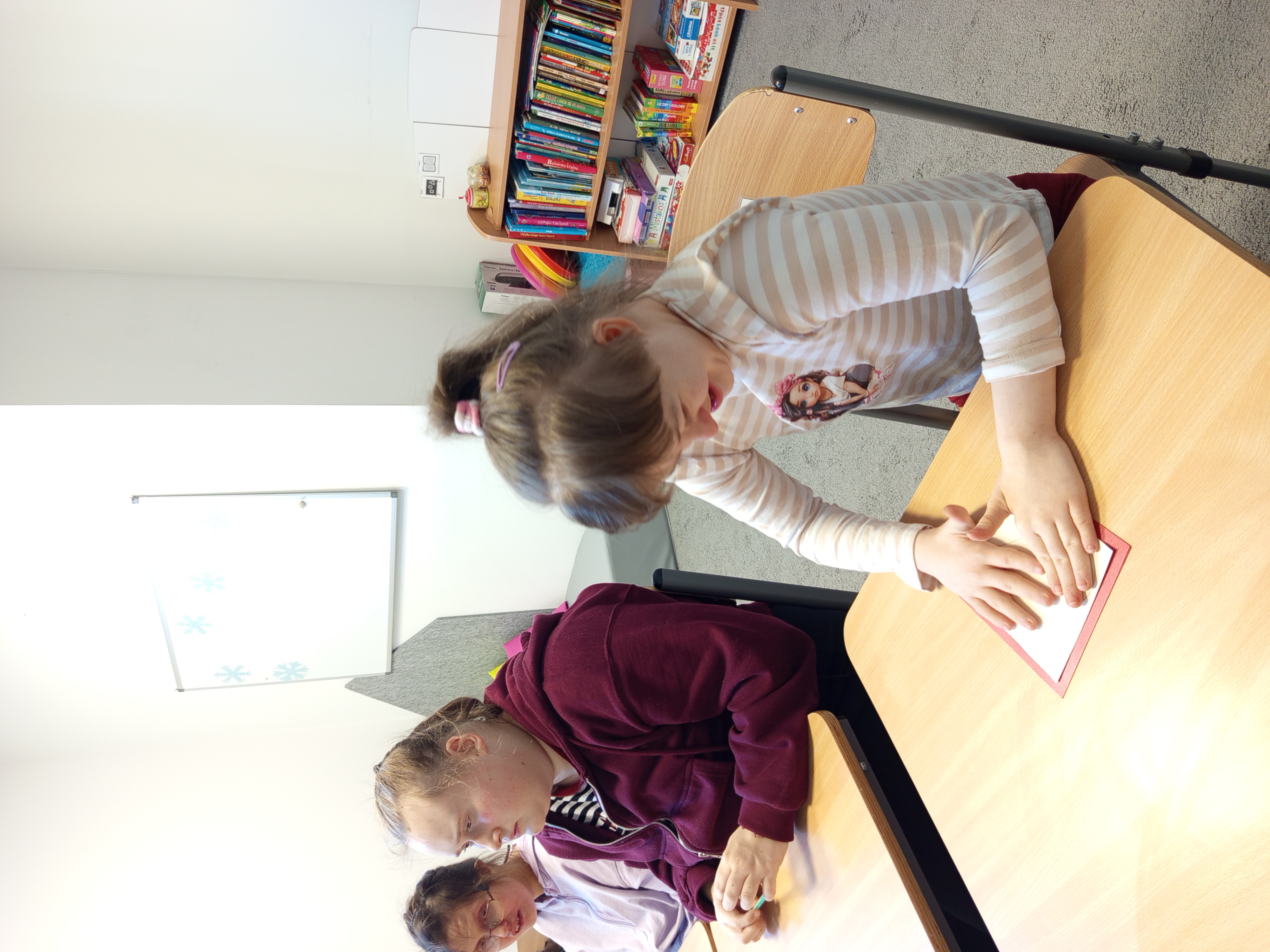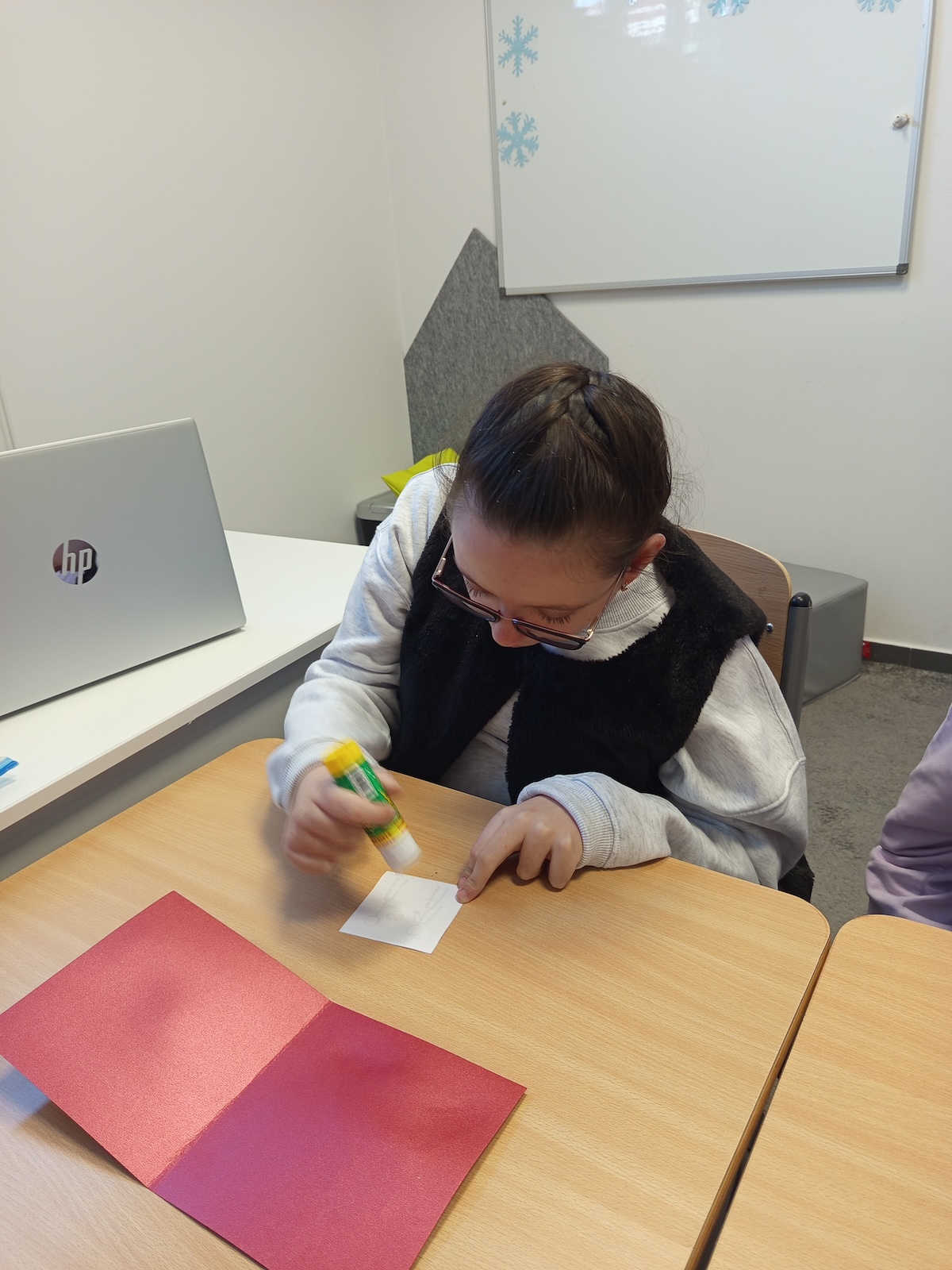 Podczas zajęć rozwijających kreatywność uczniowie oddziału „I” przygotowali wyjątkowe laurki z okazji Dnia Babci i Dziadka. Na początku dzieci wybrały kolorowe kartki (zielone i granatowe), które złożyły na pół, tworząc bazę laurki. Na przedniej stronie przykleiły białą ramkę, a następnie ozdobny papier w różnorodne wzory – kwiaty, kropki czy kratkę. Każde dziecko mogło samodzielnie wybrać motyw według własnego pomysłu. Najważniejszym elementem pracy było serce.