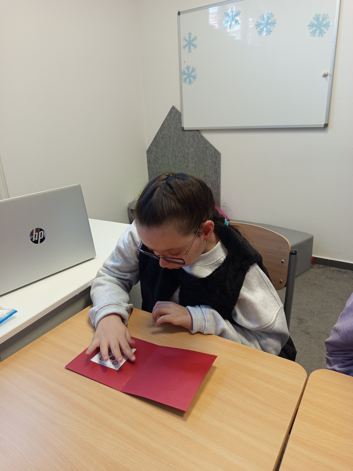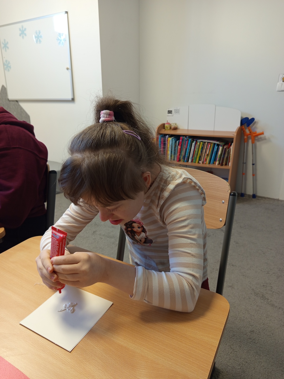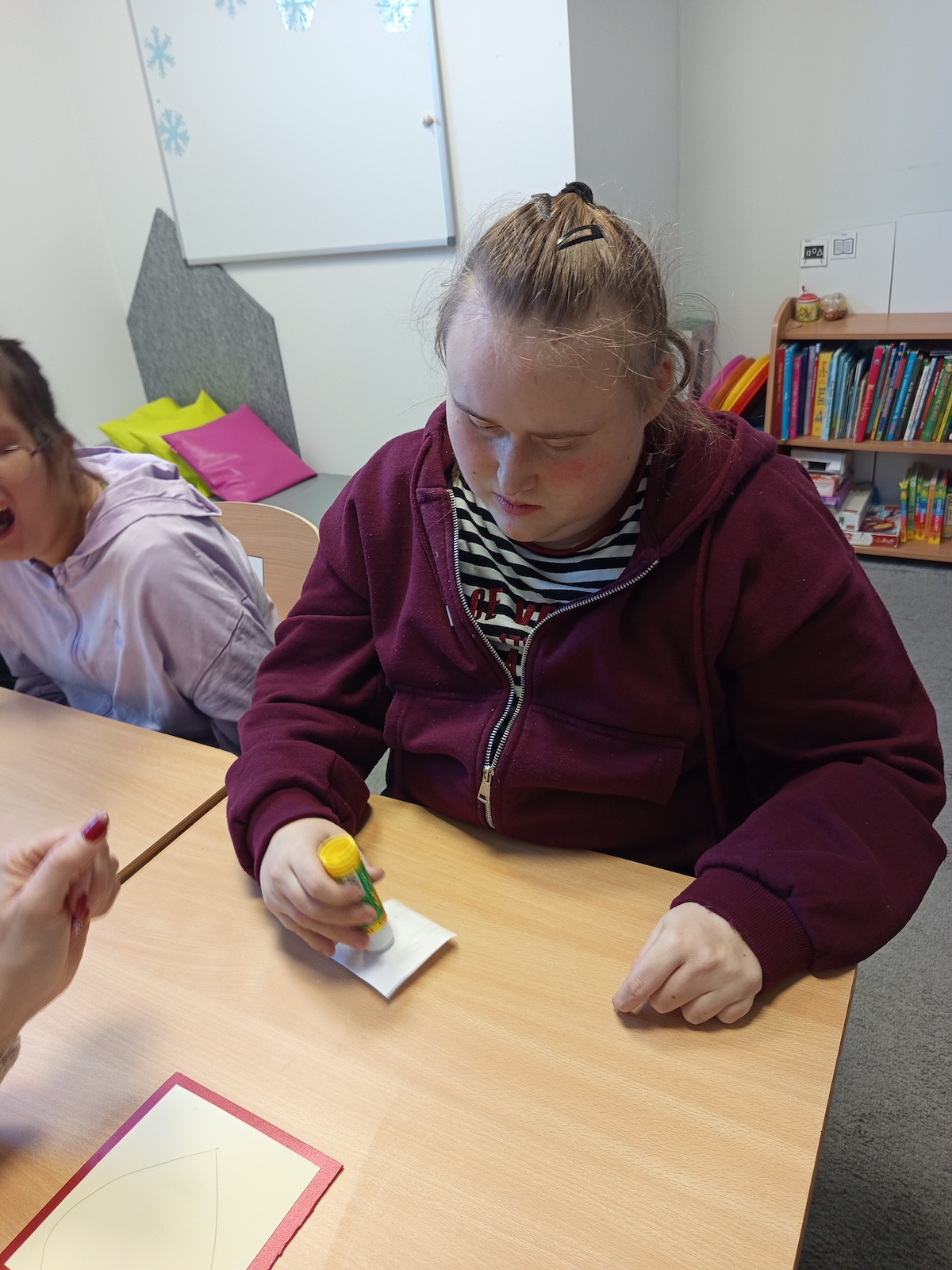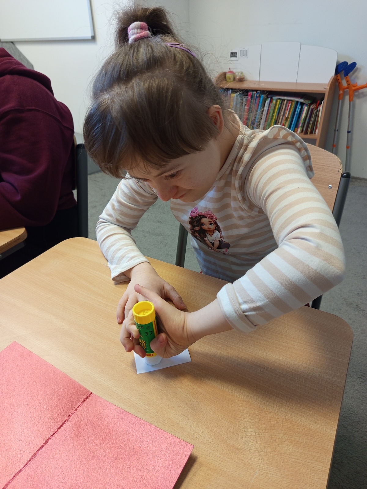 Uczniowie, przy wsparciu nauczycielek, odrysowali jego kształt, a następnie posmarowali powierzchnię klejem i wyklejali ją drobnymi, kolorowymi kółeczkami z papieru (konfetti). Z dużą cierpliwością i starannością przyklejali kolejne elementy, tworząc efekt przestrzennej, puszystej dekoracji. Na dole kartek umieścili wcześniej przygotowane napisy: „Dla Babci i Dziadka”, „Kochanej Babci” lub „Kochani Dziadkowie”, naklejone na ozdobnych paskach papieru.