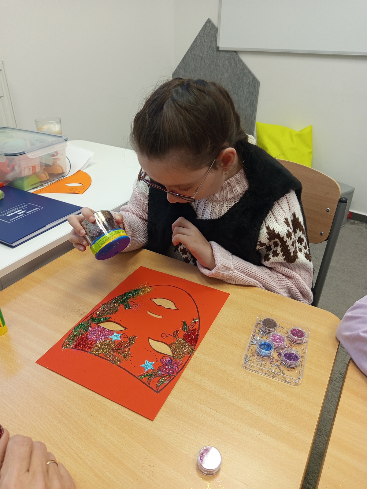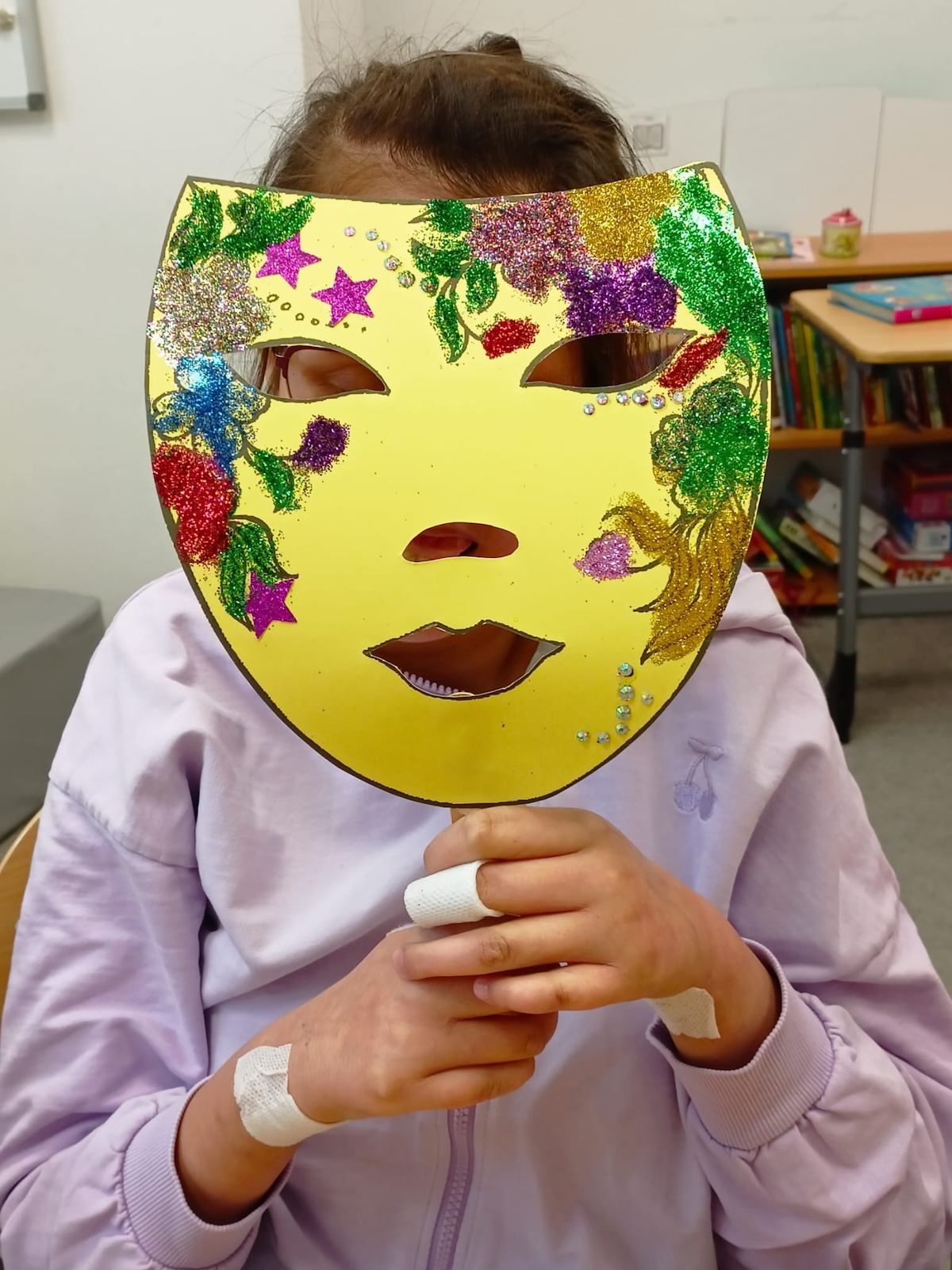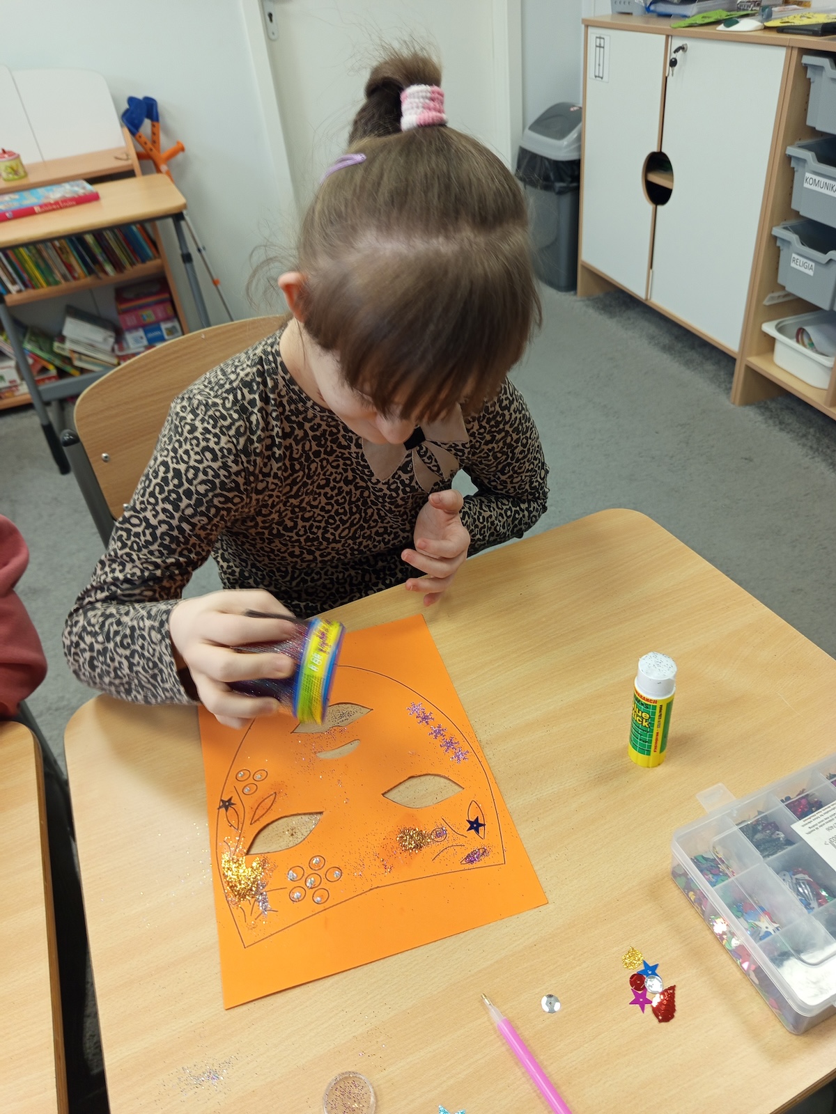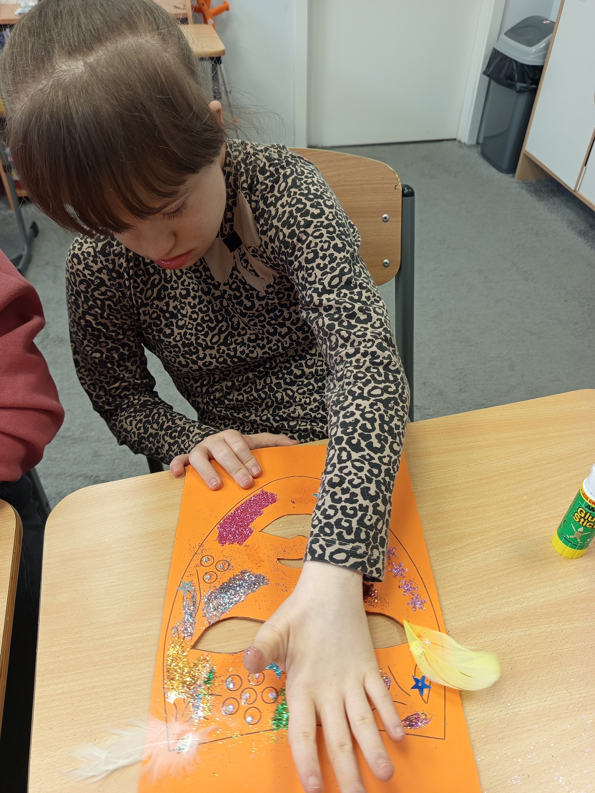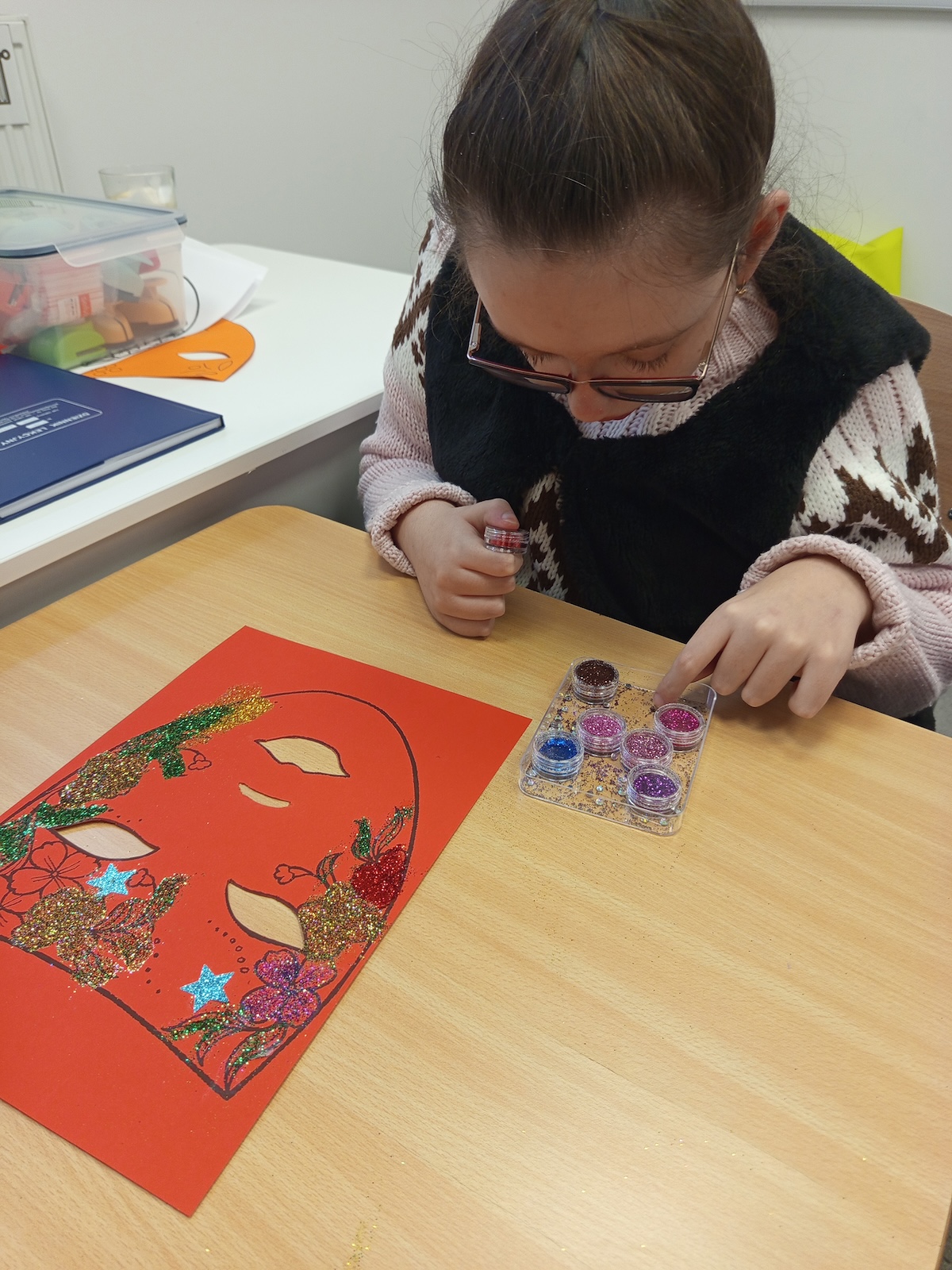 W ramach zajęć plastycznych uczniowie wykonali kolorowe maski karnawałowe. Dzieci z dużym zaangażowaniem wycinały kształty masek, a następnie ozdabiały je według własnych pomysłów. Podczas pracy nie zabrakło brokatu, piórek oraz różnorodnych dekoracji, które uczniowie starannie przyklejali, rozwijając przy tym sprawność manualną, kreatywność i wyobraźnię. Każda maska była wyjątkowa i odzwierciedlała indywidualny styl jej autora. Zajęcia dostarczyły dzieciom wiele radości i były doskonałą okazją do twórczej zabawy oraz wspólnego świętowania karnawału.