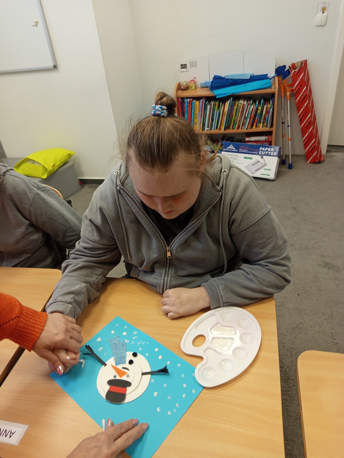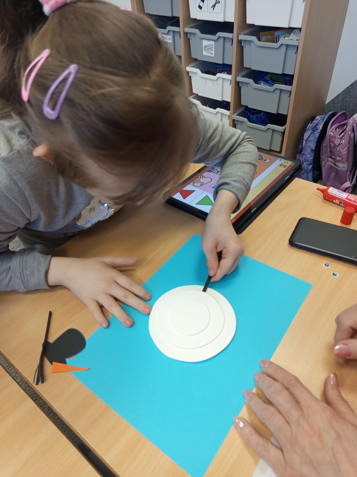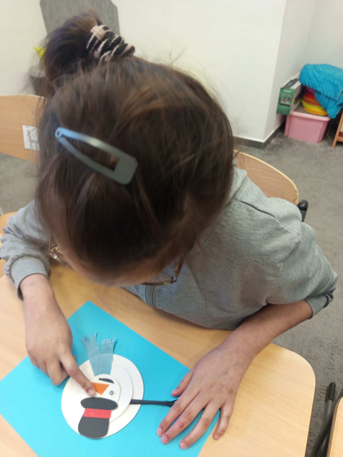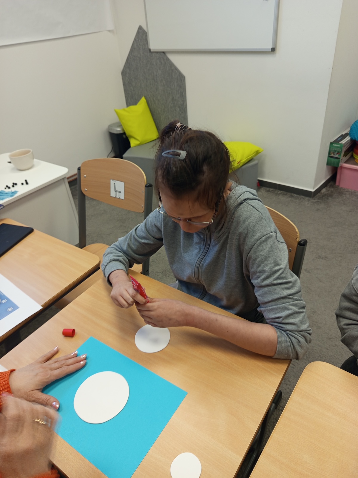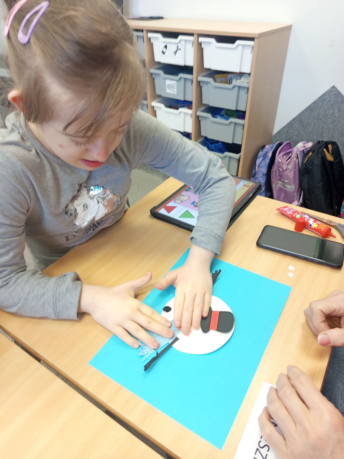 Podczas zajęć uczniowie rozwijali swoje zdolności manualne oraz percepcję wzrokową, wykonując zimowe prace plastyczne. Tworzyli bałwany z kół o różnej wielkości, wyciętych z białej pianki, ucząc się przy tym rozróżniania rozmiarów oraz utrwalając pojęcia związane z wielkością. Następnie, pracując na niebieskim tle, ozdabiali swoje prace płatkami śniegu, które powstawały przy użyciu patyczków kosmetycznych zanurzonych w farbie. Zajęcia sprzyjały rozwijaniu kreatywności, koordynacji wzrokowo-ruchowej oraz koncentracji uwagi, a także były okazją do utrwalania nazw kolorów i doskonalenia sprawności manualnej w przyjaznej, twórczej atmosferze.