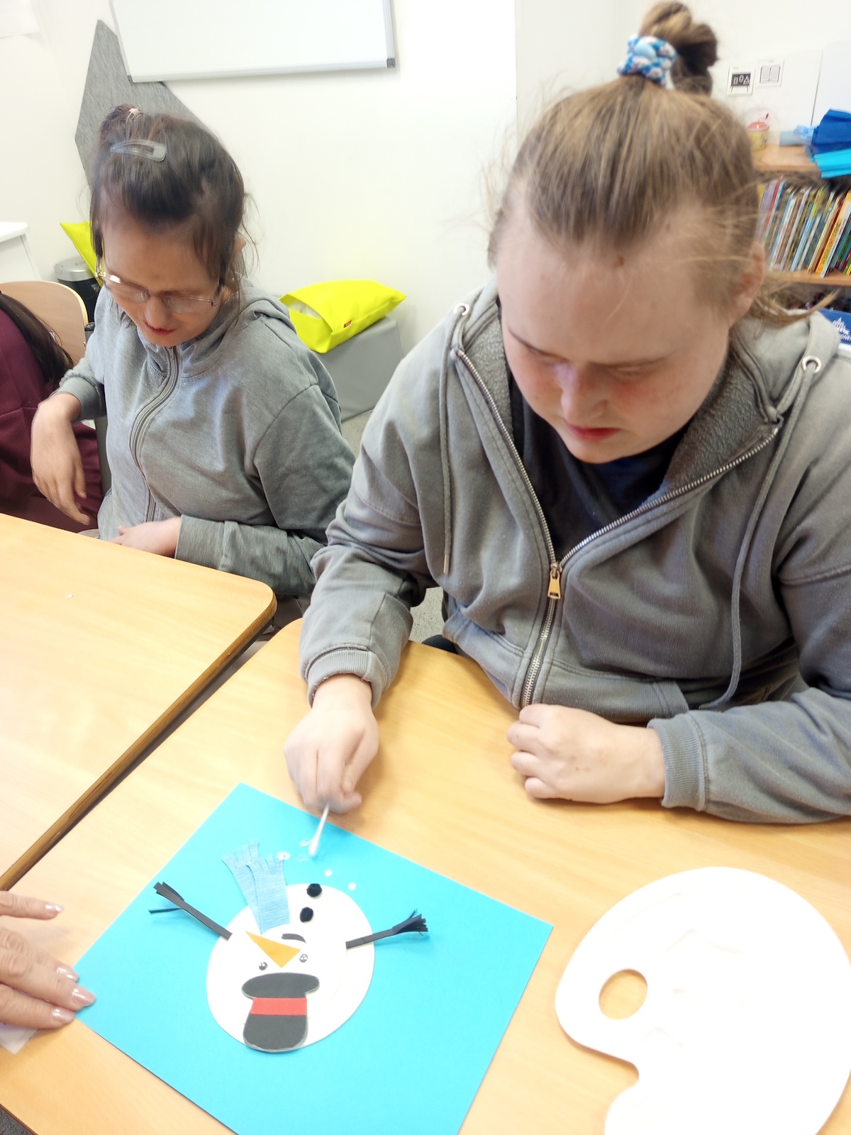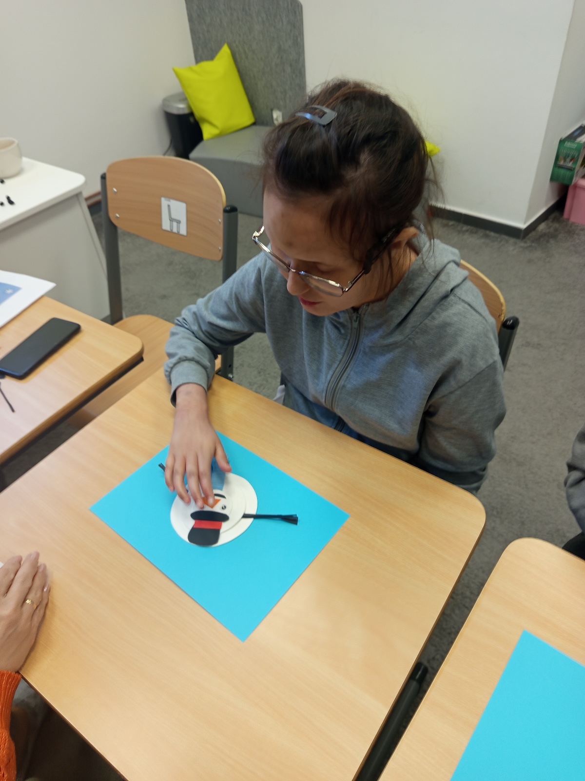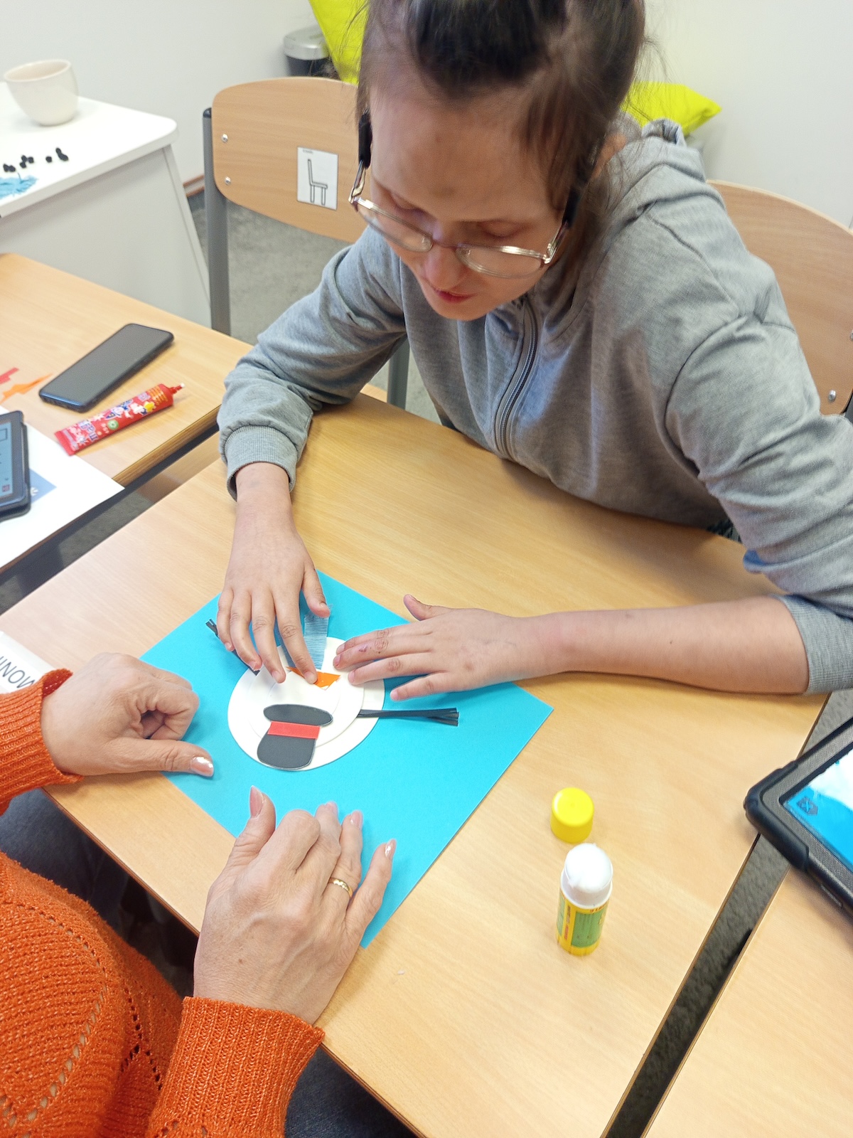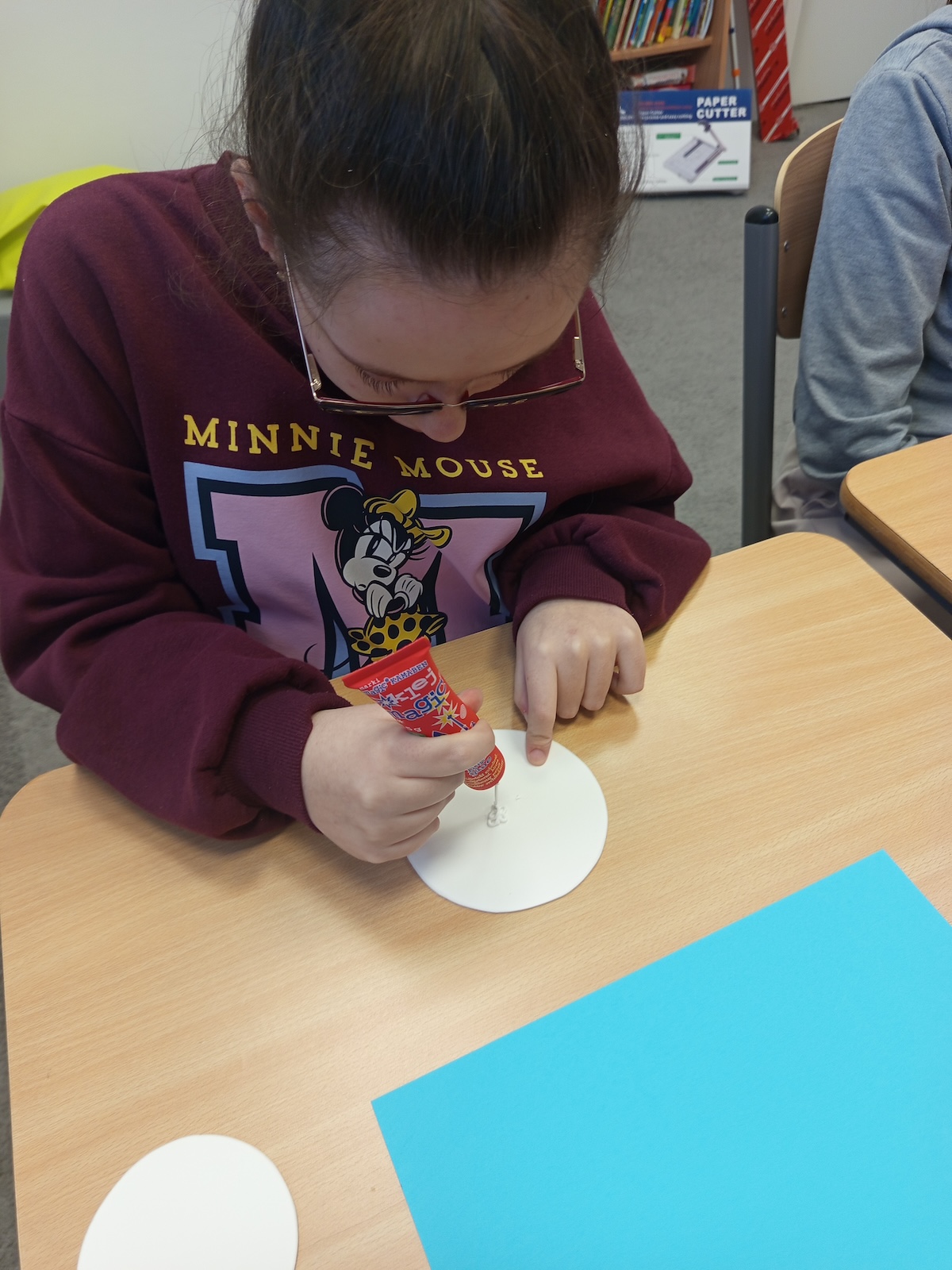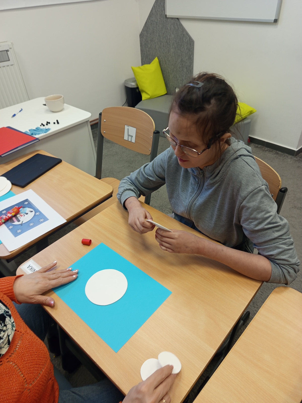 Podczas zajęć uczniowie rozwijali swoje zdolności manualne oraz percepcję wzrokową, wykonując zimowe prace plastyczne. Tworzyli bałwany z kół o różnej wielkości, wyciętych z białej pianki, ucząc się przy tym rozróżniania rozmiarów oraz utrwalając pojęcia związane z wielkością. Następnie, pracując na niebieskim tle, ozdabiali swoje prace płatkami śniegu, które powstawały przy użyciu patyczków kosmetycznych zanurzonych w farbie. Zajęcia sprzyjały rozwijaniu kreatywności, koordynacji wzrokowo-ruchowej oraz koncentracji uwagi, a także były okazją do utrwalania nazw kolorów i doskonalenia sprawności manualnej w przyjaznej, twórczej atmosferze.