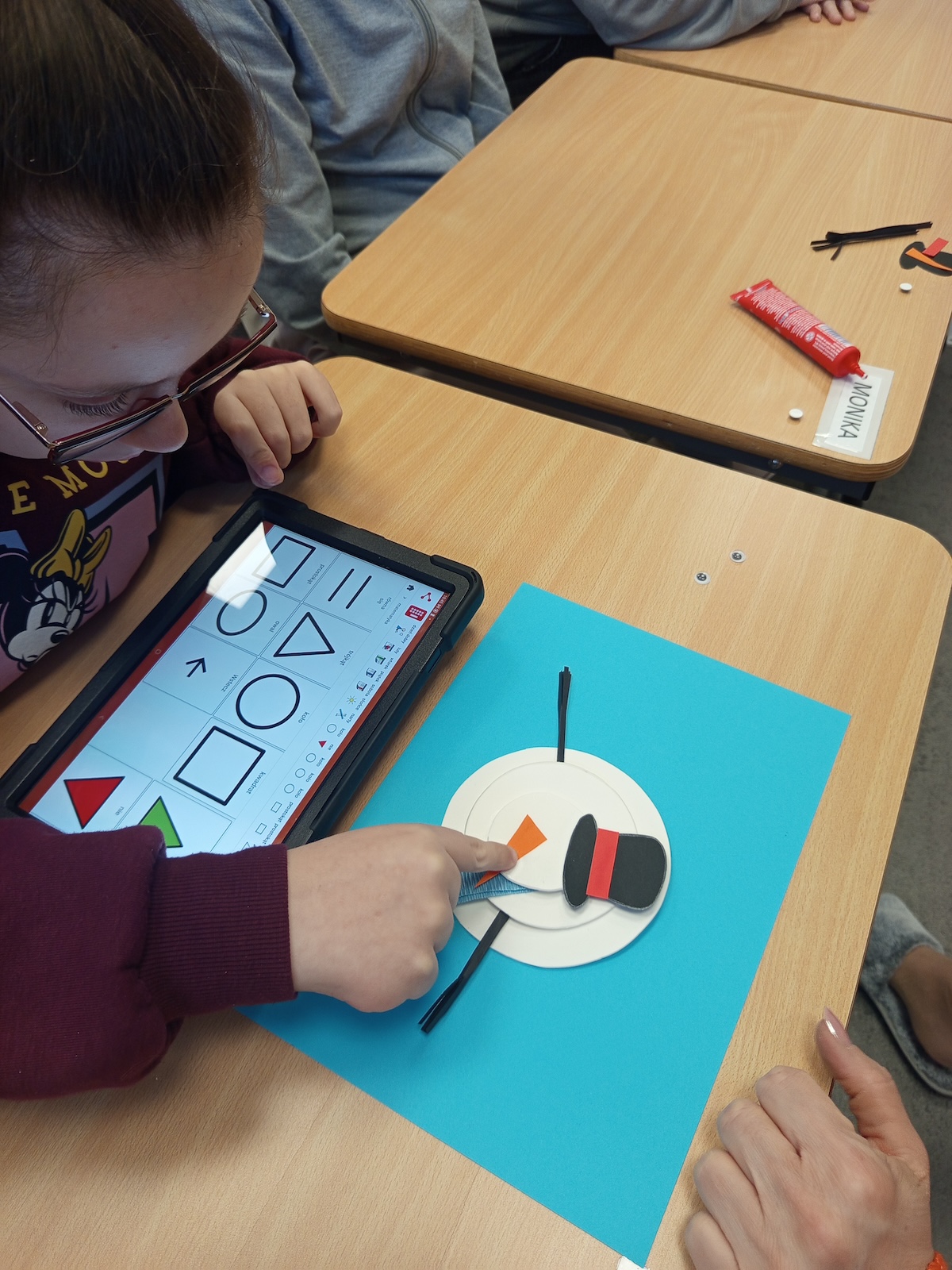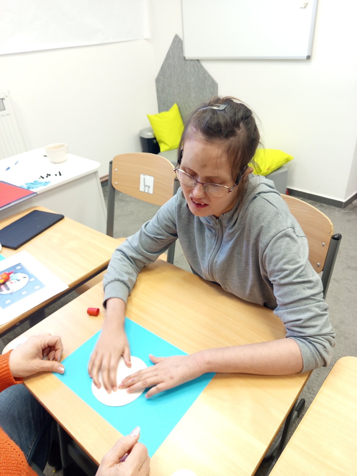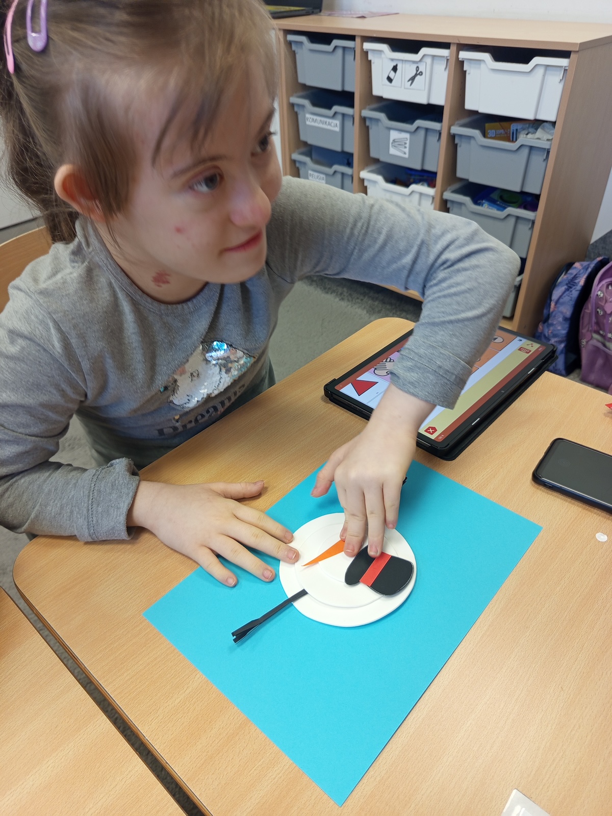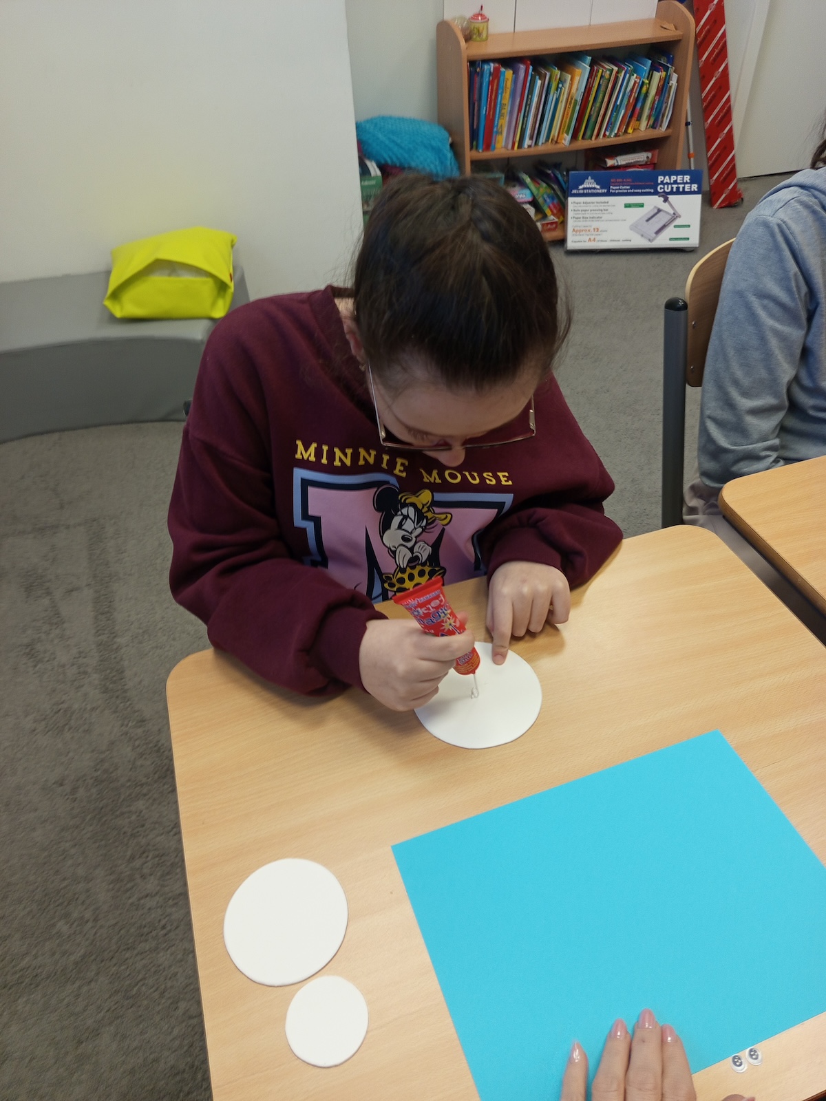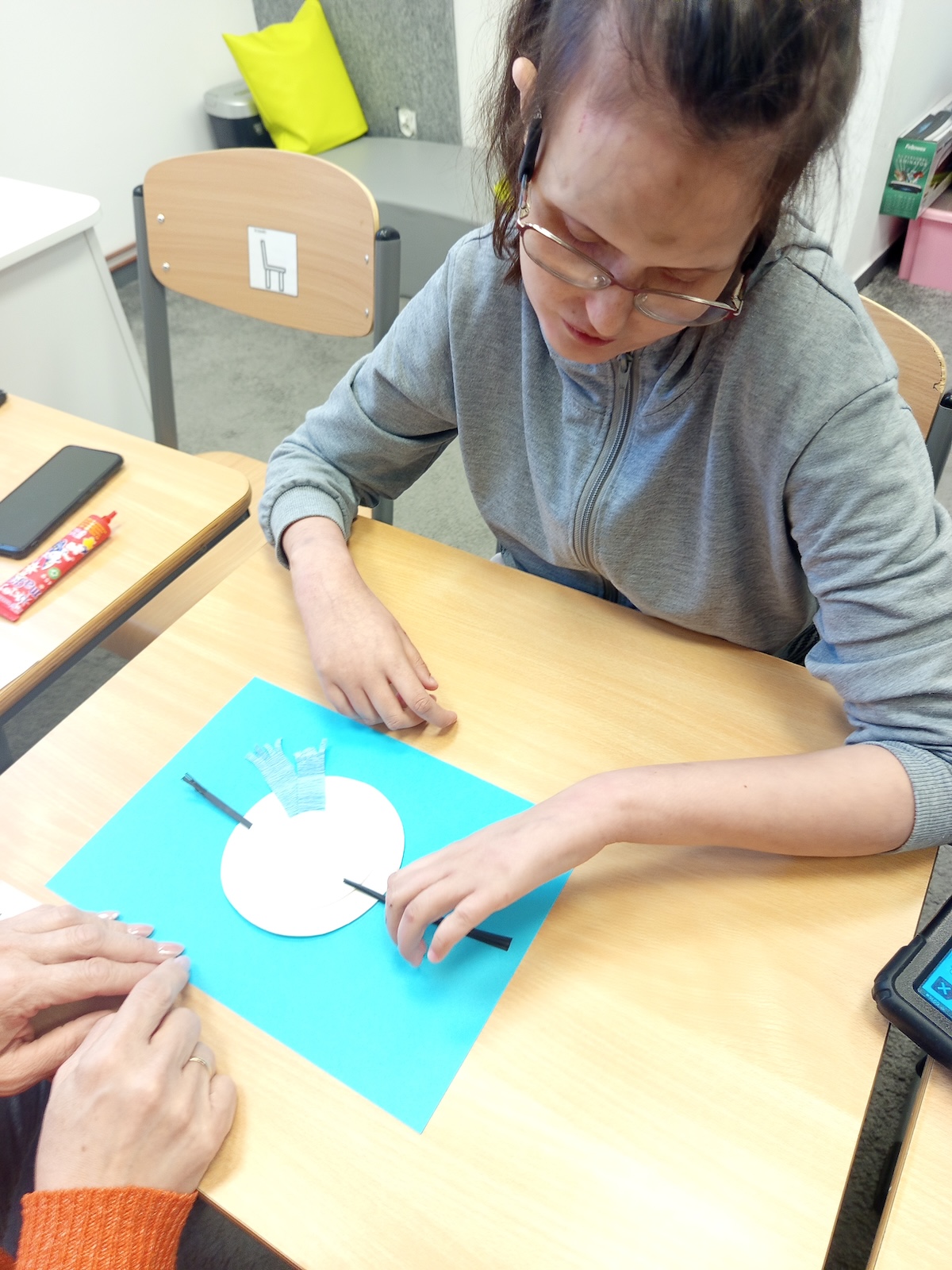 Podczas zajęć uczniowie rozwijali swoje zdolności manualne oraz percepcję wzrokową, wykonując zimowe prace plastyczne. Tworzyli bałwany z kół o różnej wielkości, wyciętych z białej pianki, ucząc się przy tym rozróżniania rozmiarów oraz utrwalając pojęcia związane z wielkością. Następnie, pracując na niebieskim tle, ozdabiali swoje prace płatkami śniegu, które powstawały przy użyciu patyczków kosmetycznych zanurzonych w farbie. Zajęcia sprzyjały rozwijaniu kreatywności, koordynacji wzrokowo-ruchowej oraz koncentracji uwagi, a także były okazją do utrwalania nazw kolorów i doskonalenia sprawności manualnej w przyjaznej, twórczej atmosferze.