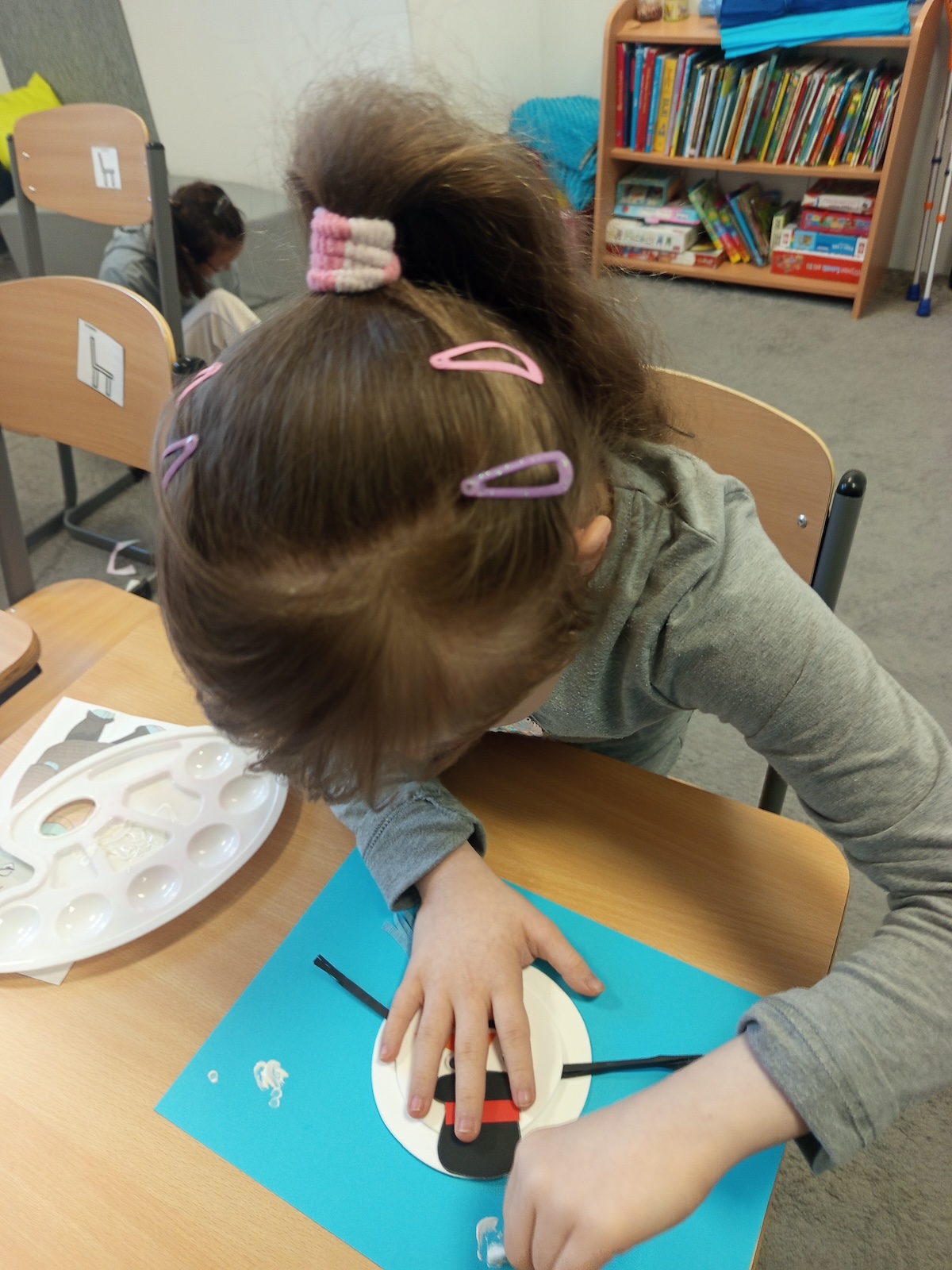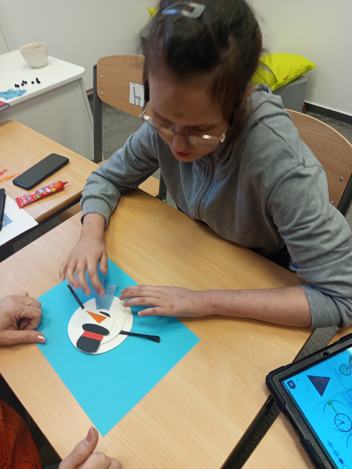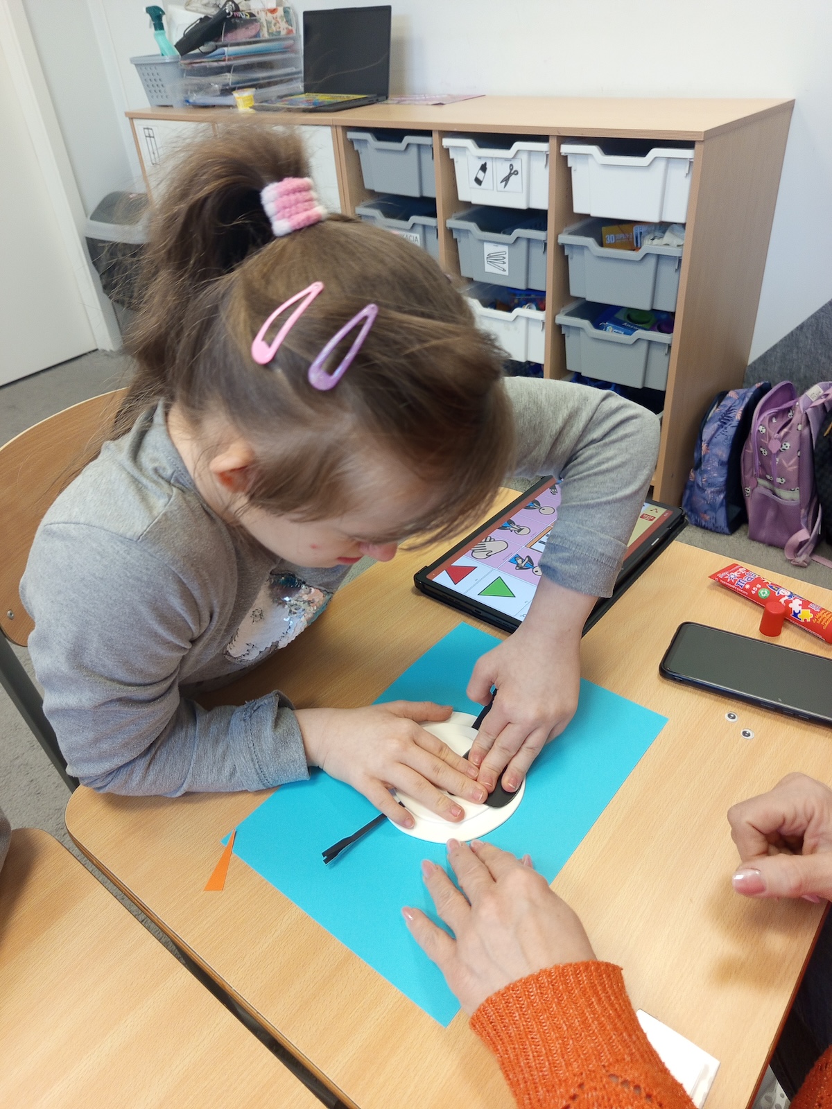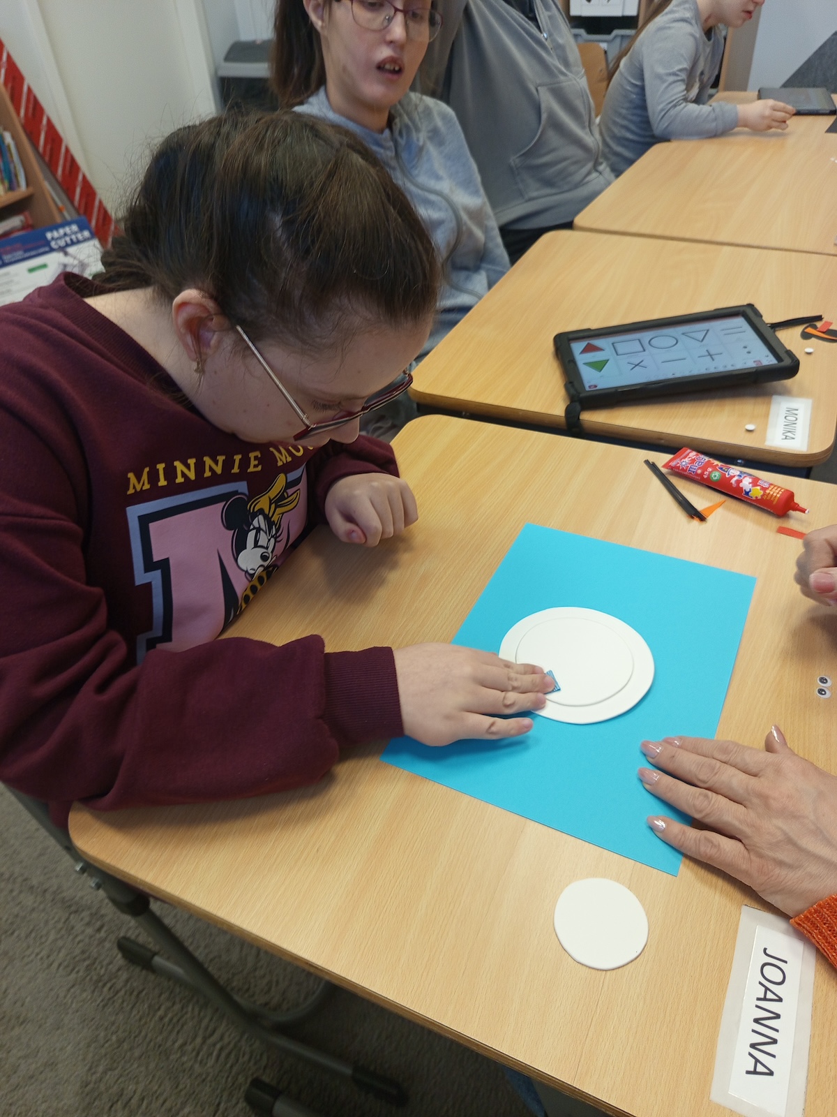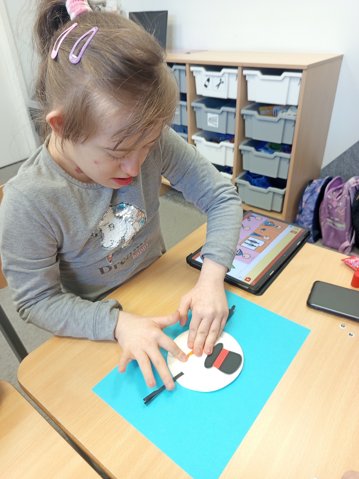 Podczas zajęć uczniowie rozwijali swoje zdolności manualne oraz percepcję wzrokową, wykonując zimowe prace plastyczne. Tworzyli bałwany z kół o różnej wielkości, wyciętych z białej pianki, ucząc się przy tym rozróżniania rozmiarów oraz utrwalając pojęcia związane z wielkością. Następnie, pracując na niebieskim tle, ozdabiali swoje prace płatkami śniegu, które powstawały przy użyciu patyczków kosmetycznych zanurzonych w farbie. Zajęcia sprzyjały rozwijaniu kreatywności, koordynacji wzrokowo-ruchowej oraz koncentracji uwagi, a także były okazją do utrwalania nazw kolorów i doskonalenia sprawności manualnej w przyjaznej, twórczej atmosferze.