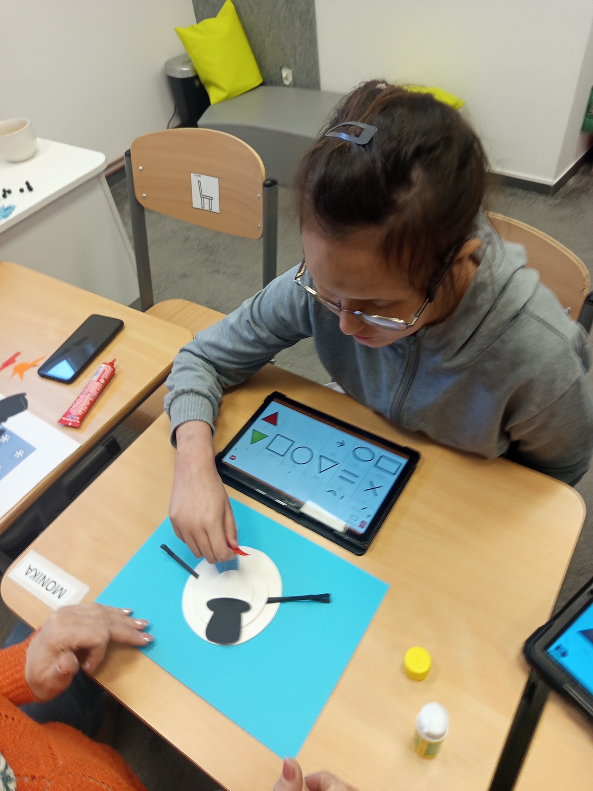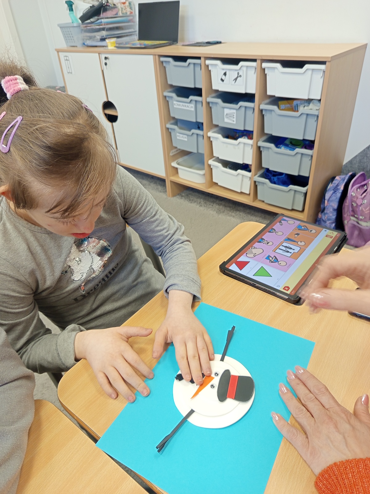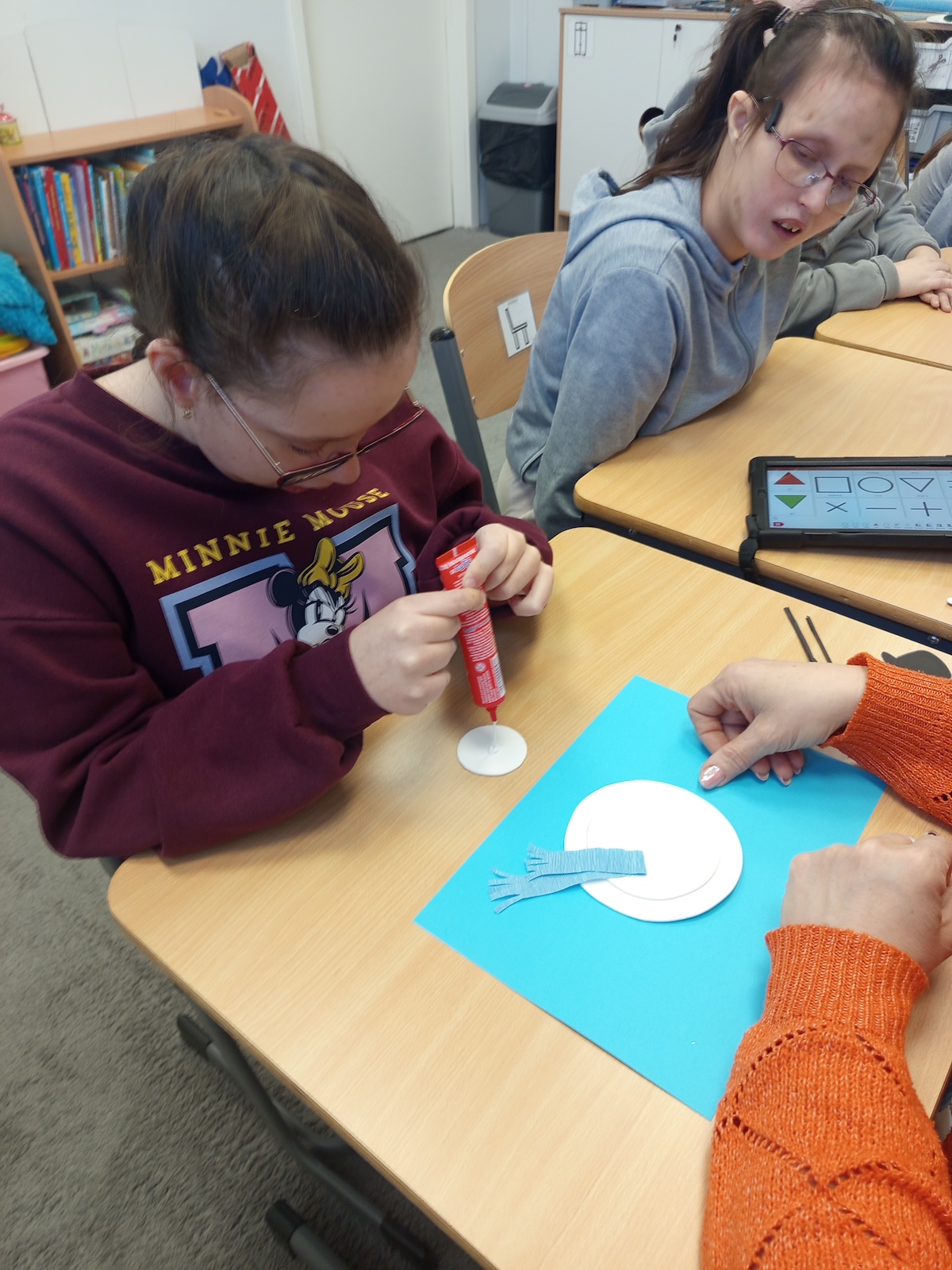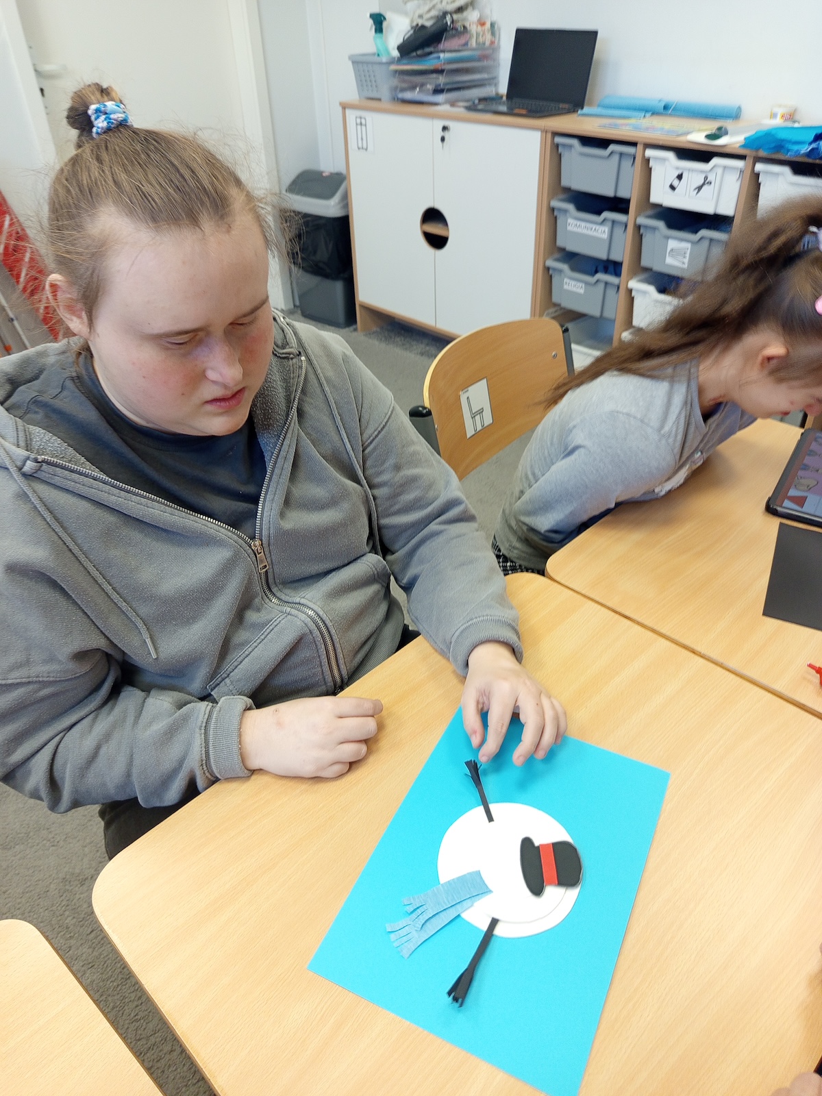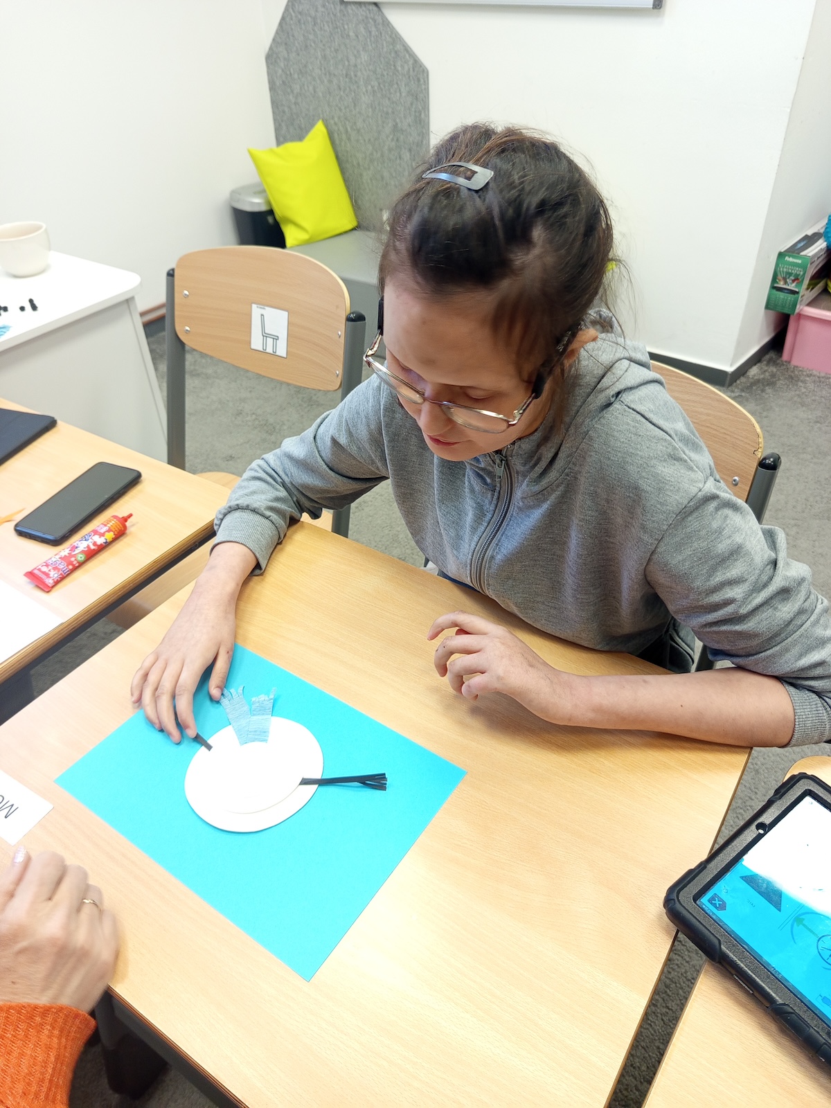 Podczas zajęć uczniowie rozwijali swoje zdolności manualne oraz percepcję wzrokową, wykonując zimowe prace plastyczne. Tworzyli bałwany z kół o różnej wielkości, wyciętych z białej pianki, ucząc się przy tym rozróżniania rozmiarów oraz utrwalając pojęcia związane z wielkością. Następnie, pracując na niebieskim tle, ozdabiali swoje prace płatkami śniegu, które powstawały przy użyciu patyczków kosmetycznych zanurzonych w farbie. Zajęcia sprzyjały rozwijaniu kreatywności, koordynacji wzrokowo-ruchowej oraz koncentracji uwagi, a także były okazją do utrwalania nazw kolorów i doskonalenia sprawności manualnej w przyjaznej, twórczej atmosferze.