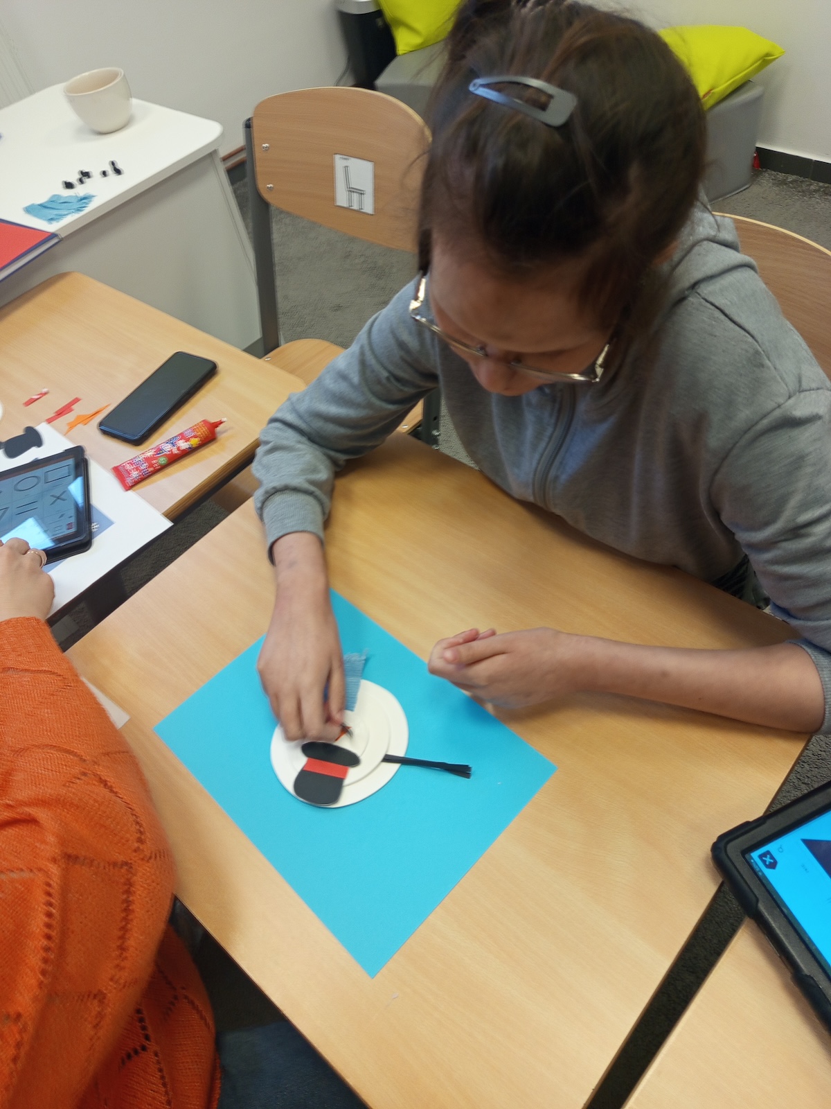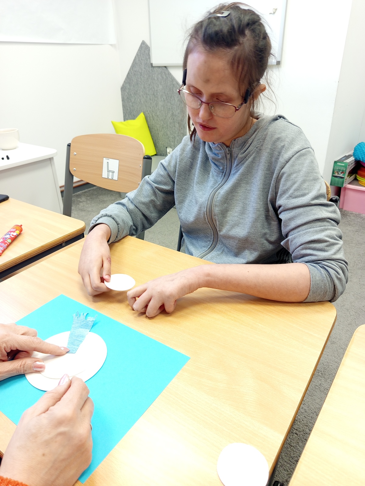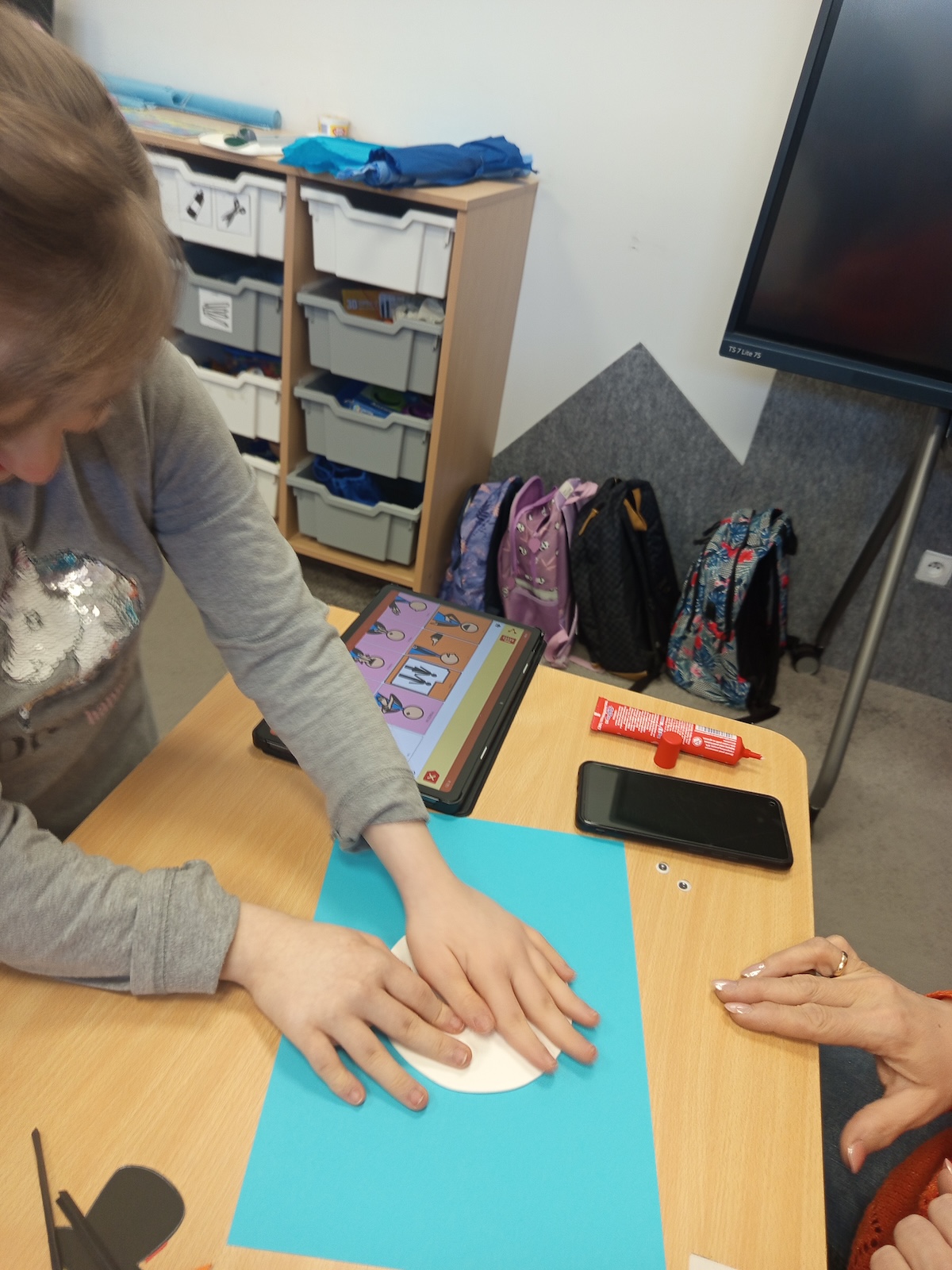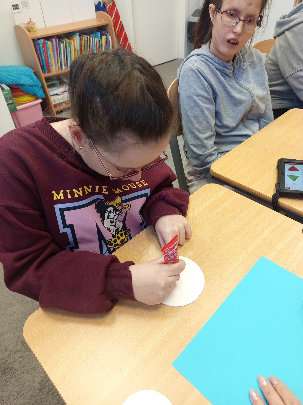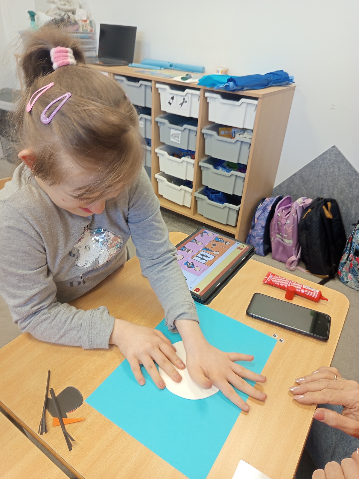 Podczas zajęć uczniowie rozwijali swoje zdolności manualne oraz percepcję wzrokową, wykonując zimowe prace plastyczne. Tworzyli bałwany z kół o różnej wielkości, wyciętych z białej pianki, ucząc się przy tym rozróżniania rozmiarów oraz utrwalając pojęcia związane z wielkością. Następnie, pracując na niebieskim tle, ozdabiali swoje prace płatkami śniegu, które powstawały przy użyciu patyczków kosmetycznych zanurzonych w farbie. Zajęcia sprzyjały rozwijaniu kreatywności, koordynacji wzrokowo-ruchowej oraz koncentracji uwagi, a także były okazją do utrwalania nazw kolorów i doskonalenia sprawności manualnej w przyjaznej, twórczej atmosferze.
