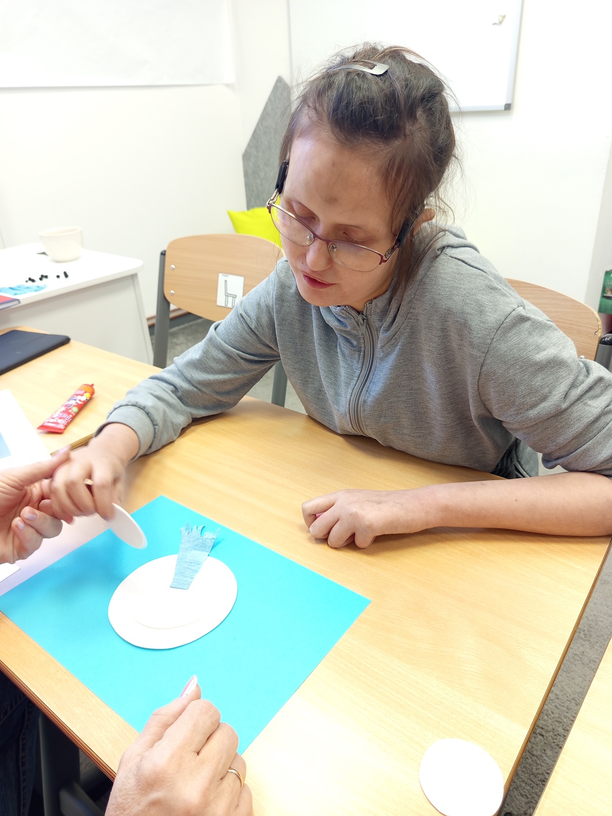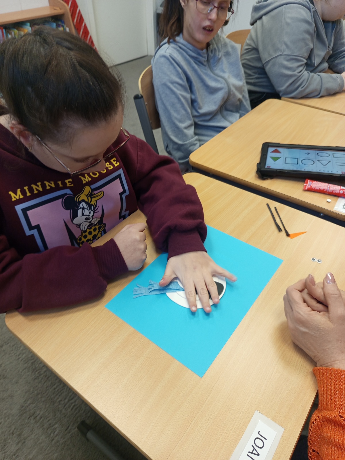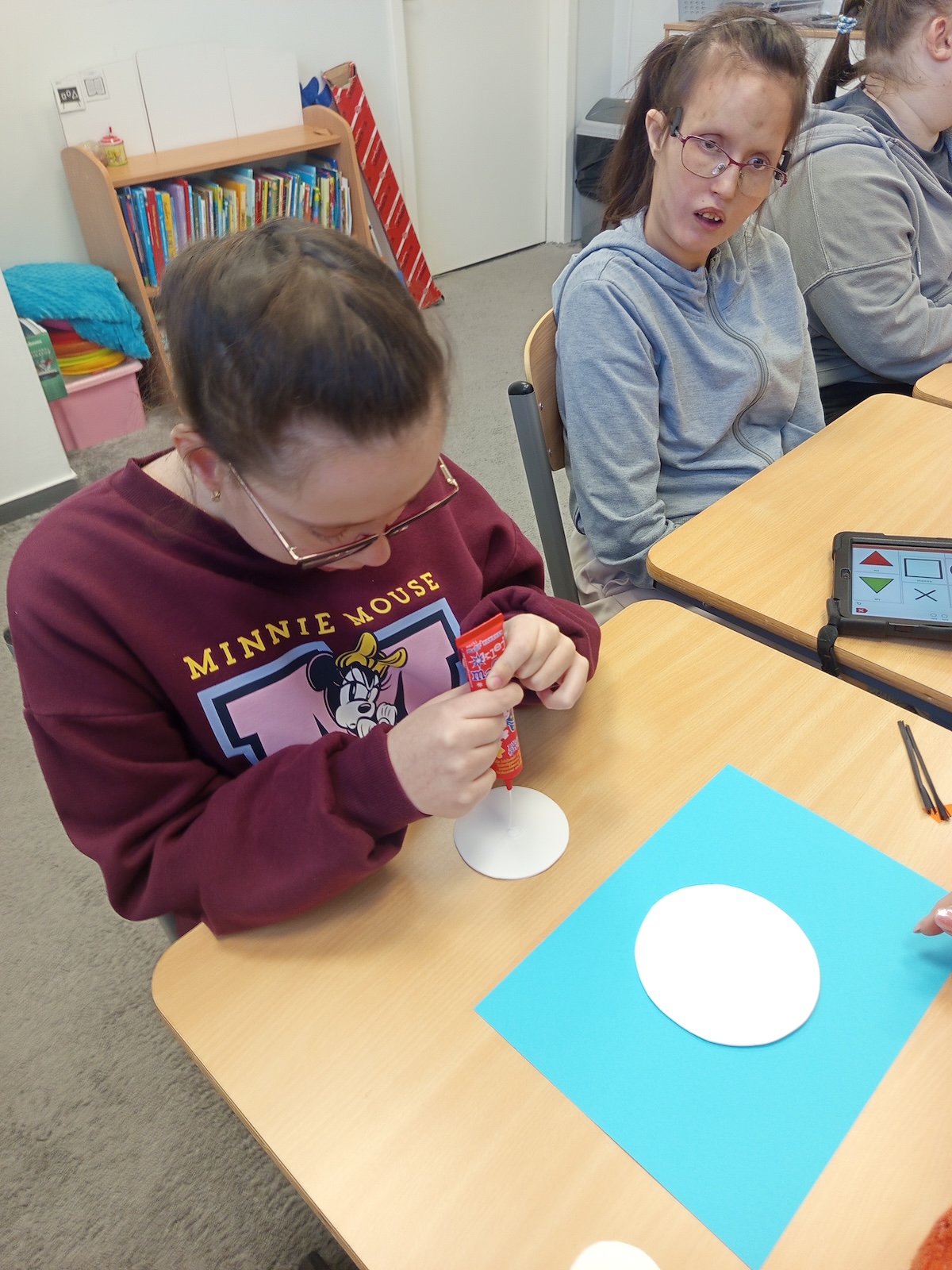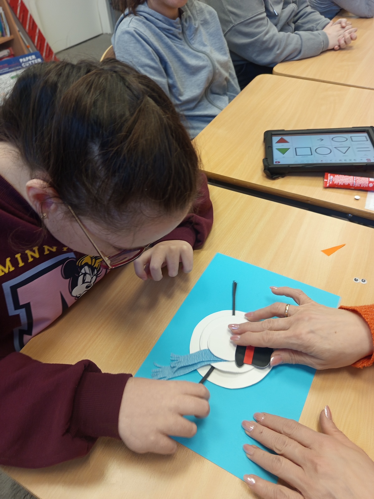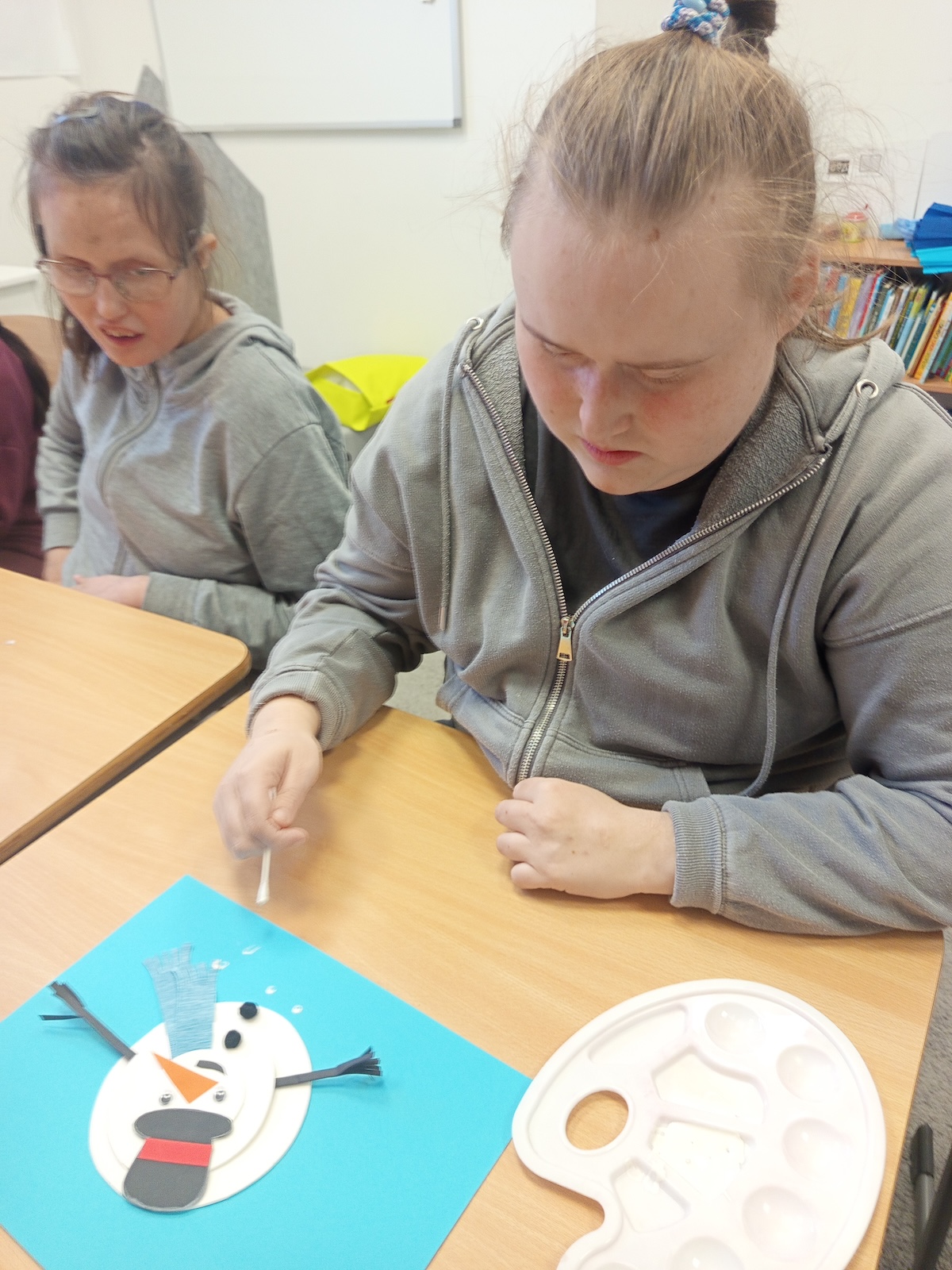 Podczas zajęć uczniowie rozwijali swoje zdolności manualne oraz percepcję wzrokową, wykonując zimowe prace plastyczne. Tworzyli bałwany z kół o różnej wielkości, wyciętych z białej pianki, ucząc się przy tym rozróżniania rozmiarów oraz utrwalając pojęcia związane z wielkością. Następnie, pracując na niebieskim tle, ozdabiali swoje prace płatkami śniegu, które powstawały przy użyciu patyczków kosmetycznych zanurzonych w farbie. Zajęcia sprzyjały rozwijaniu kreatywności, koordynacji wzrokowo-ruchowej oraz koncentracji uwagi, a także były okazją do utrwalania nazw kolorów i doskonalenia sprawności manualnej w przyjaznej, twórczej atmosferze.