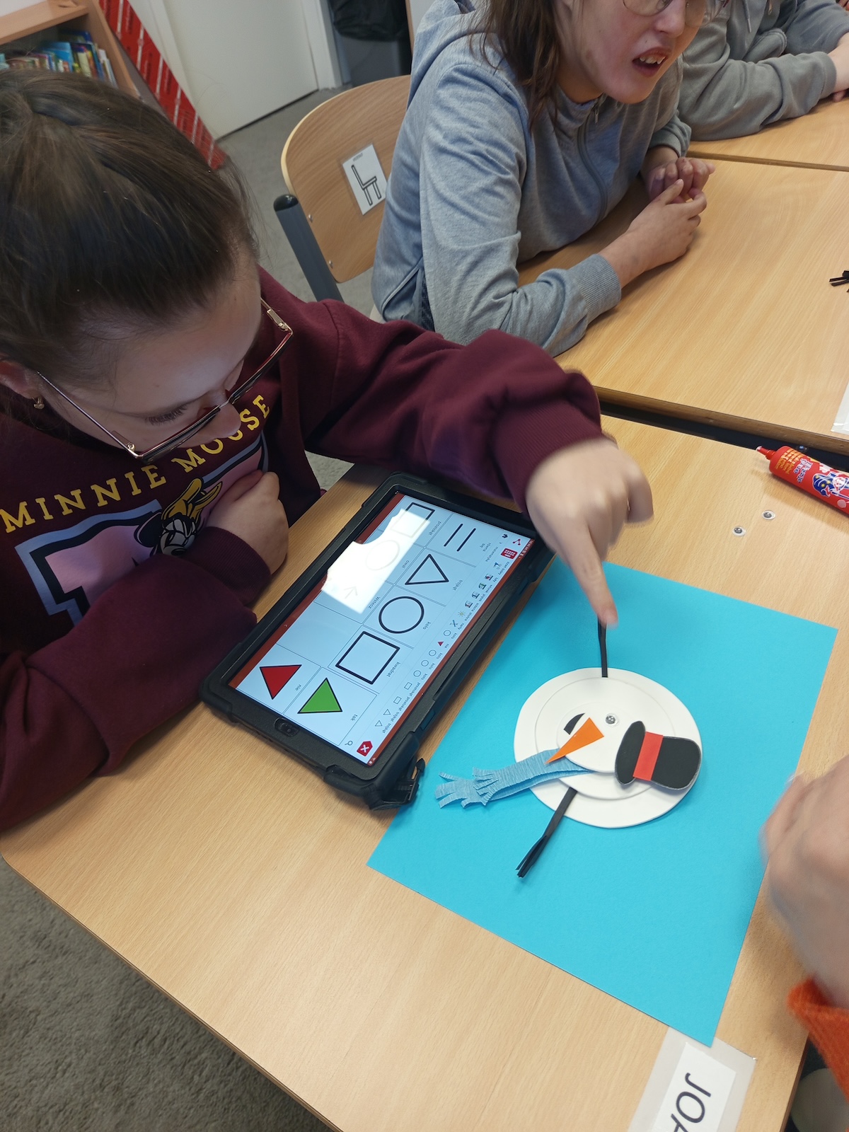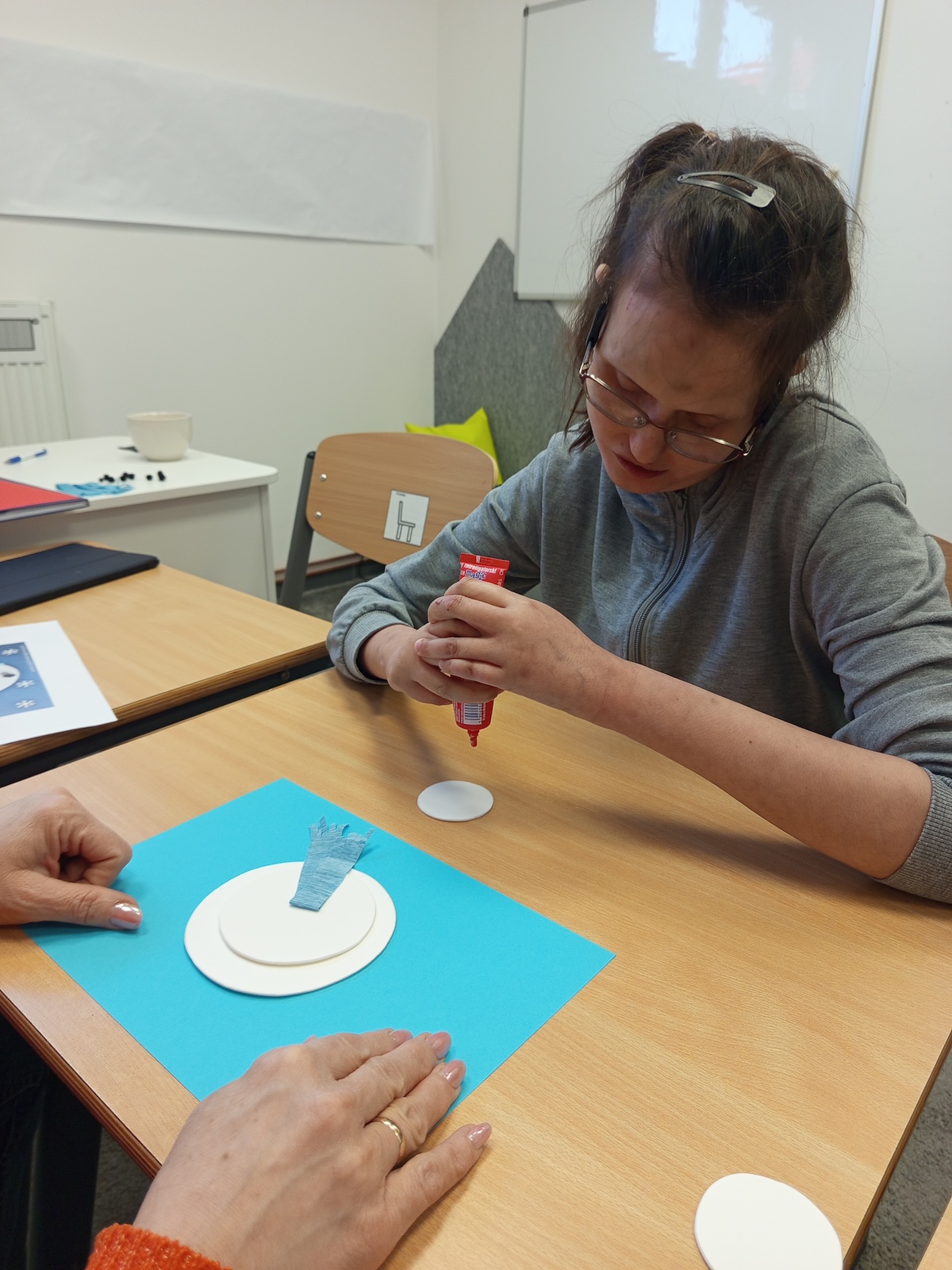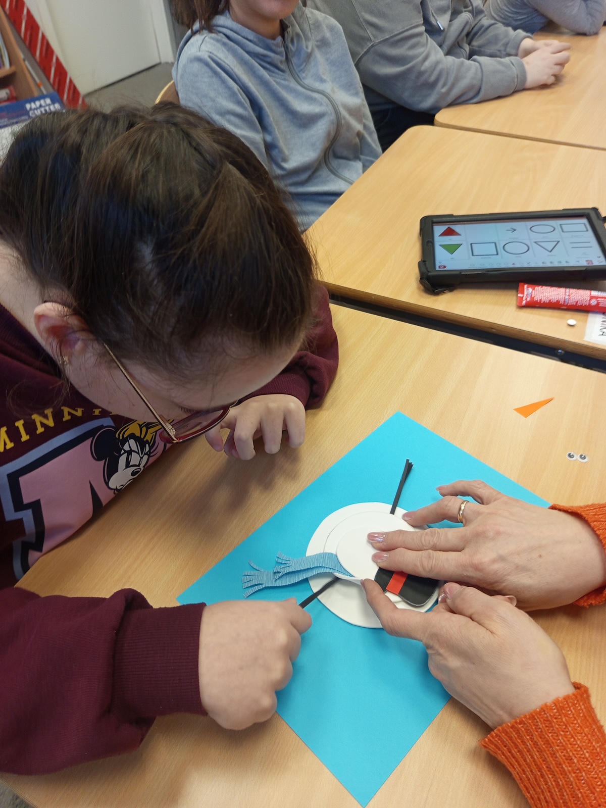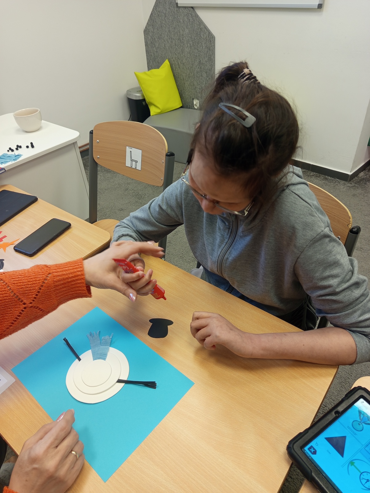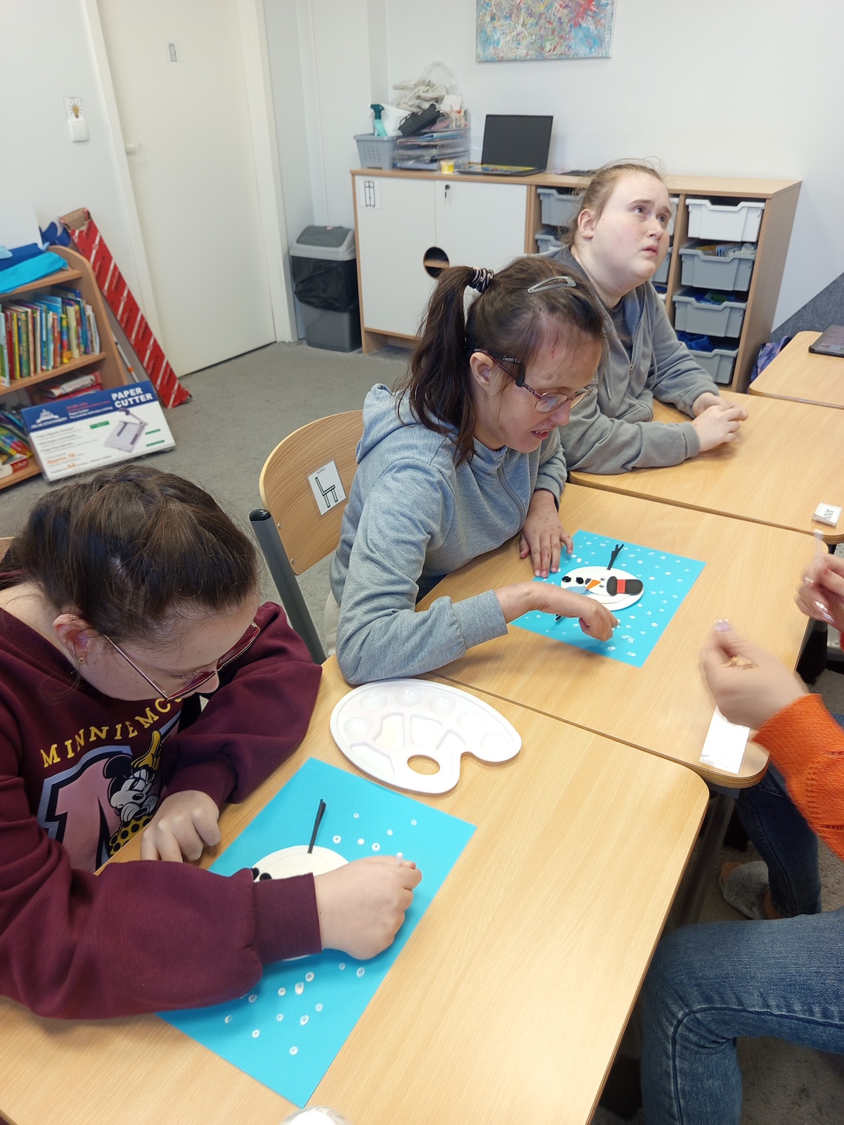 Podczas zajęć uczniowie rozwijali swoje zdolności manualne oraz percepcję wzrokową, wykonując zimowe prace plastyczne. Tworzyli bałwany z kół o różnej wielkości, wyciętych z białej pianki, ucząc się przy tym rozróżniania rozmiarów oraz utrwalając pojęcia związane z wielkością. Następnie, pracując na niebieskim tle, ozdabiali swoje prace płatkami śniegu, które powstawały przy użyciu patyczków kosmetycznych zanurzonych w farbie. Zajęcia sprzyjały rozwijaniu kreatywności, koordynacji wzrokowo-ruchowej oraz koncentracji uwagi, a także były okazją do utrwalania nazw kolorów i doskonalenia sprawności manualnej w przyjaznej, twórczej atmosferze.