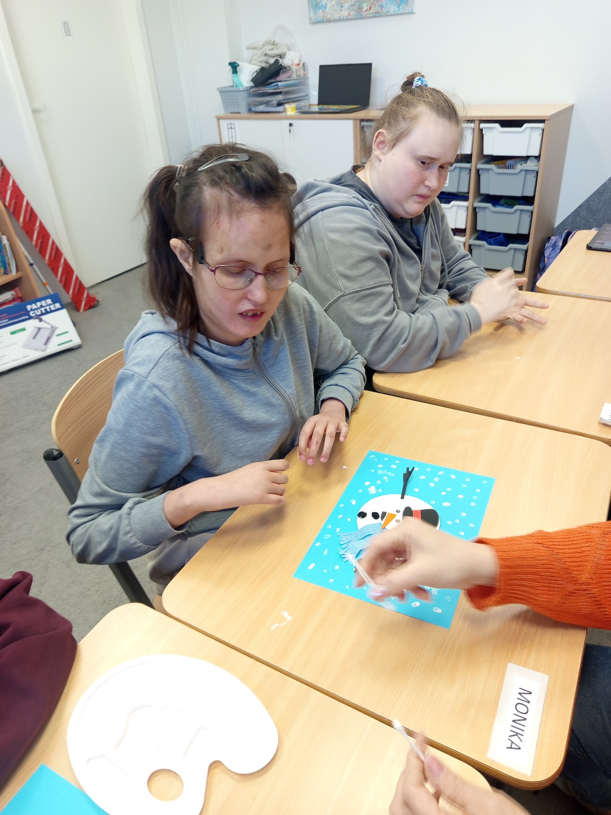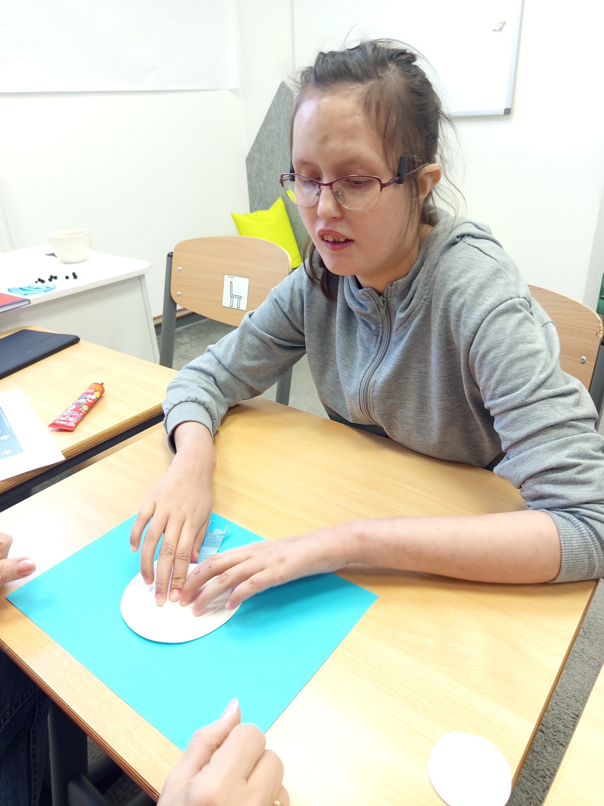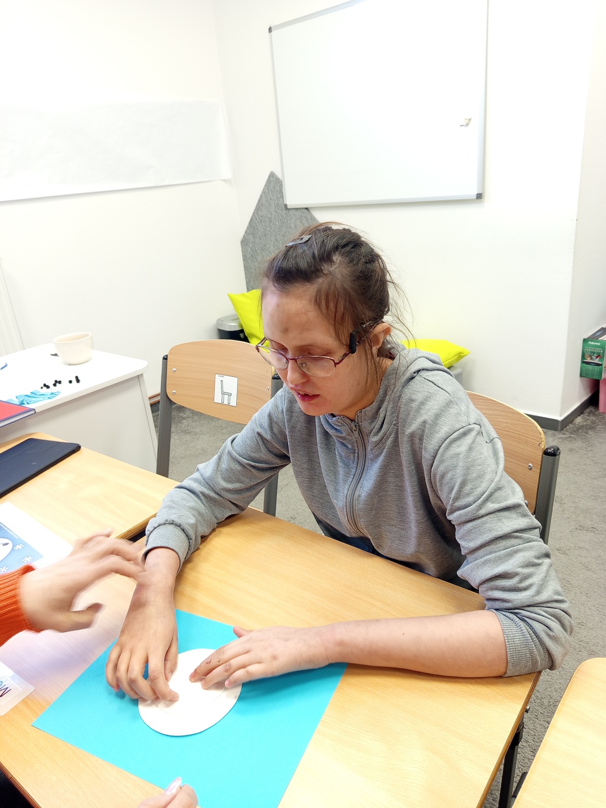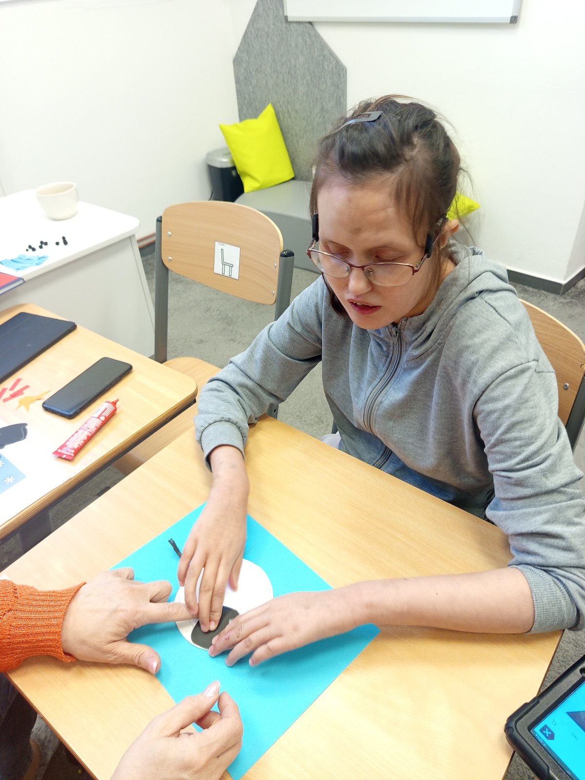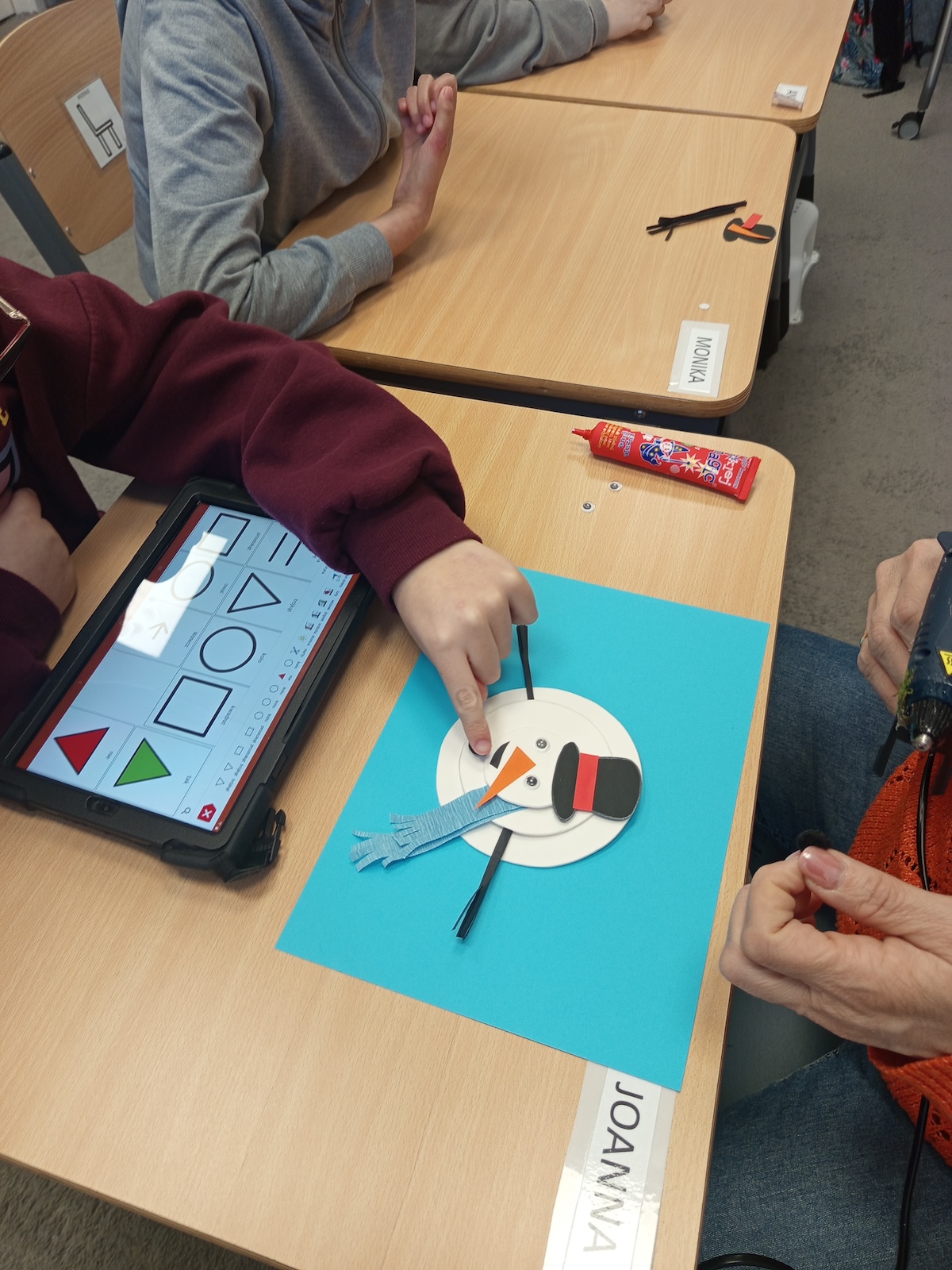 Podczas zajęć uczniowie rozwijali swoje zdolności manualne oraz percepcję wzrokową, wykonując zimowe prace plastyczne. Tworzyli bałwany z kół o różnej wielkości, wyciętych z białej pianki, ucząc się przy tym rozróżniania rozmiarów oraz utrwalając pojęcia związane z wielkością. Następnie, pracując na niebieskim tle, ozdabiali swoje prace płatkami śniegu, które powstawały przy użyciu patyczków kosmetycznych zanurzonych w farbie. Zajęcia sprzyjały rozwijaniu kreatywności, koordynacji wzrokowo-ruchowej oraz koncentracji uwagi, a także były okazją do utrwalania nazw kolorów i doskonalenia sprawności manualnej w przyjaznej, twórczej atmosferze.
