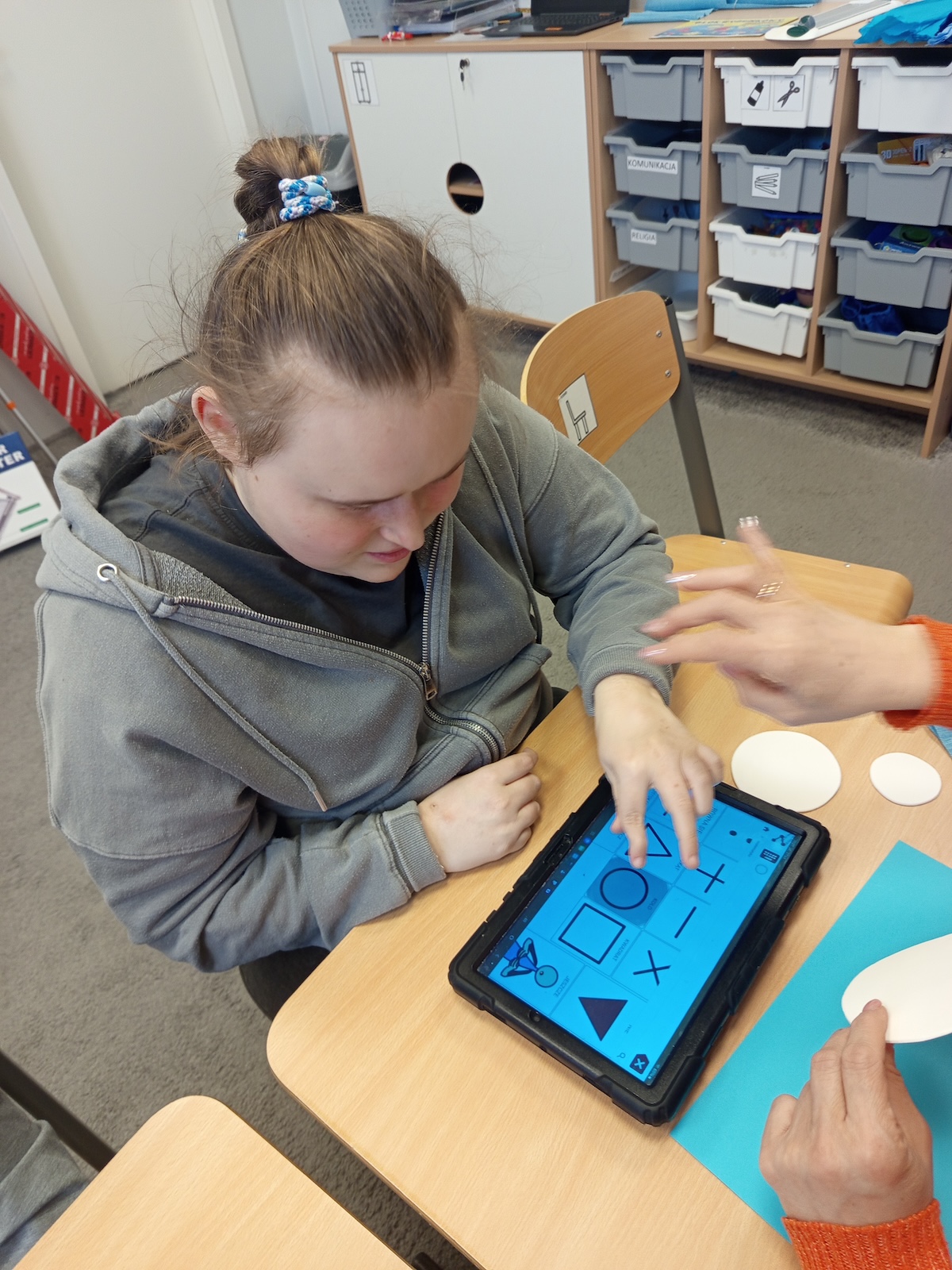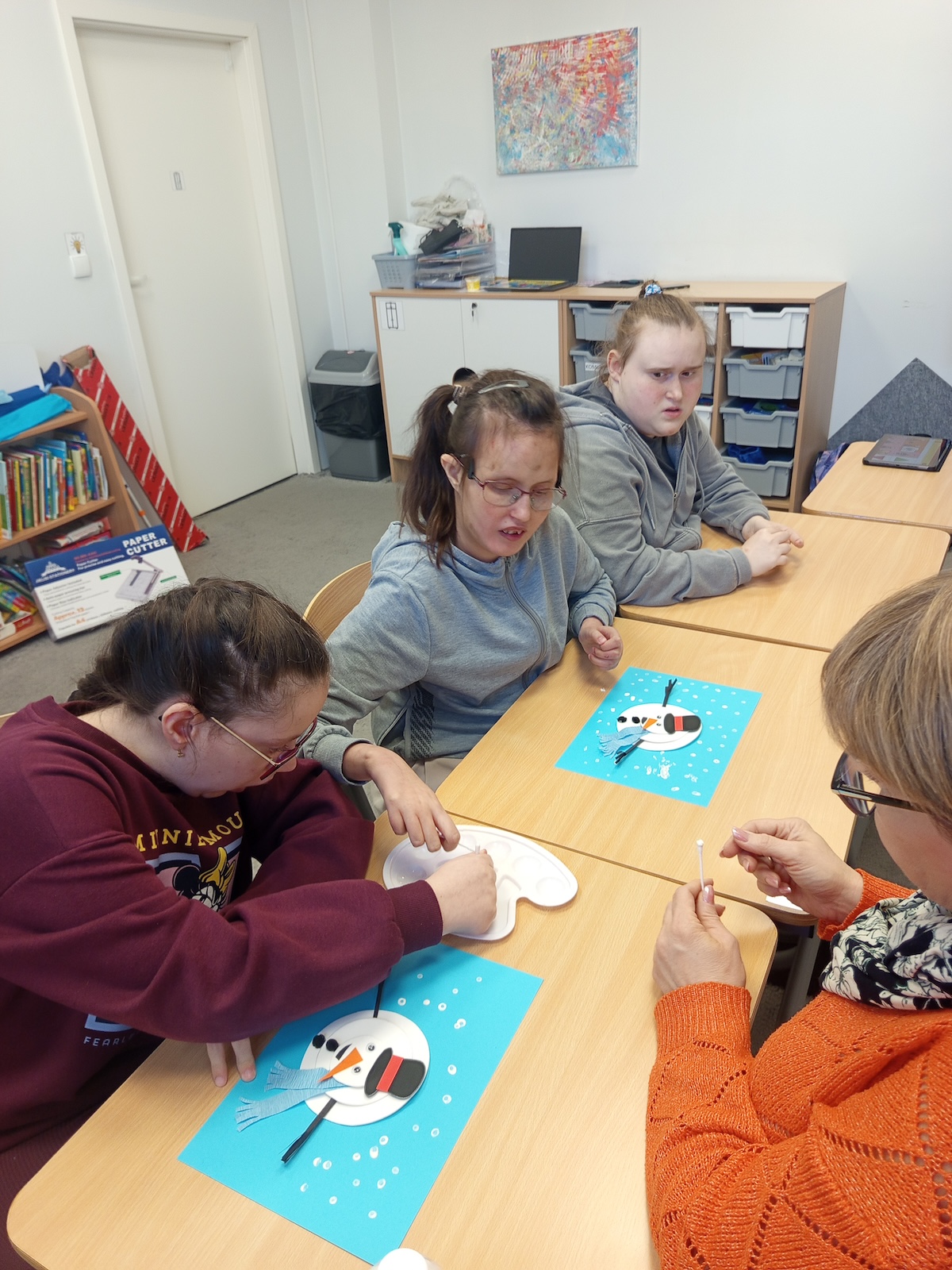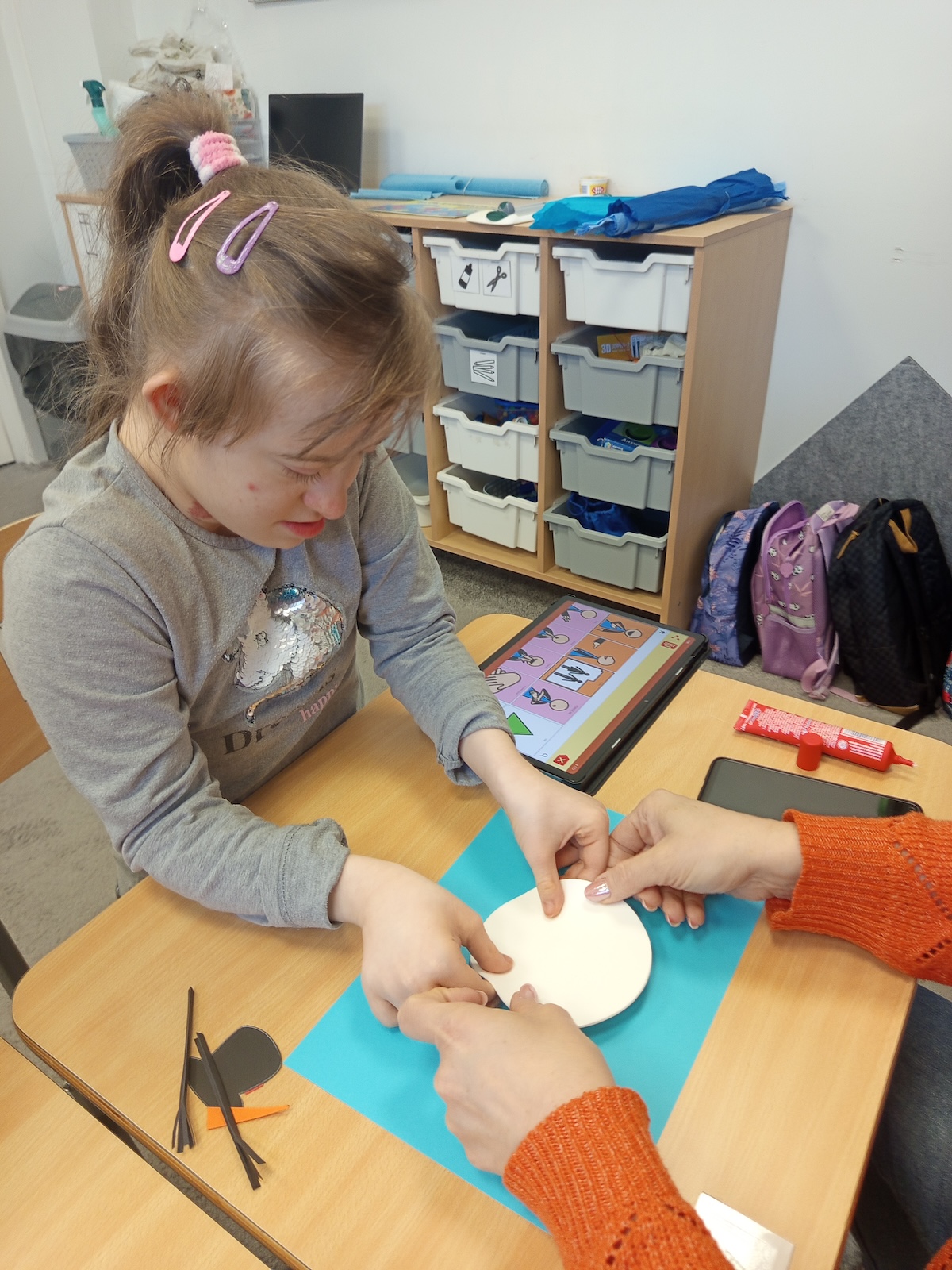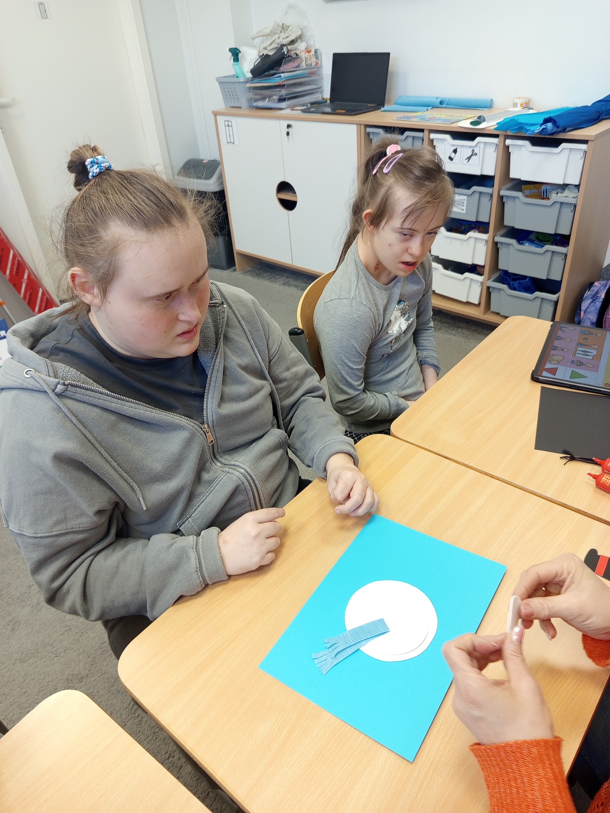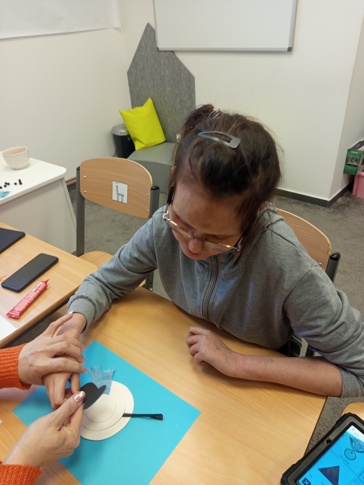 Podczas zajęć uczniowie rozwijali swoje zdolności manualne oraz percepcję wzrokową, wykonując zimowe prace plastyczne. Tworzyli bałwany z kół o różnej wielkości, wyciętych z białej pianki, ucząc się przy tym rozróżniania rozmiarów oraz utrwalając pojęcia związane z wielkością. Następnie, pracując na niebieskim tle, ozdabiali swoje prace płatkami śniegu, które powstawały przy użyciu patyczków kosmetycznych zanurzonych w farbie. Zajęcia sprzyjały rozwijaniu kreatywności, koordynacji wzrokowo-ruchowej oraz koncentracji uwagi, a także były okazją do utrwalania nazw kolorów i doskonalenia sprawności manualnej w przyjaznej, twórczej atmosferze.