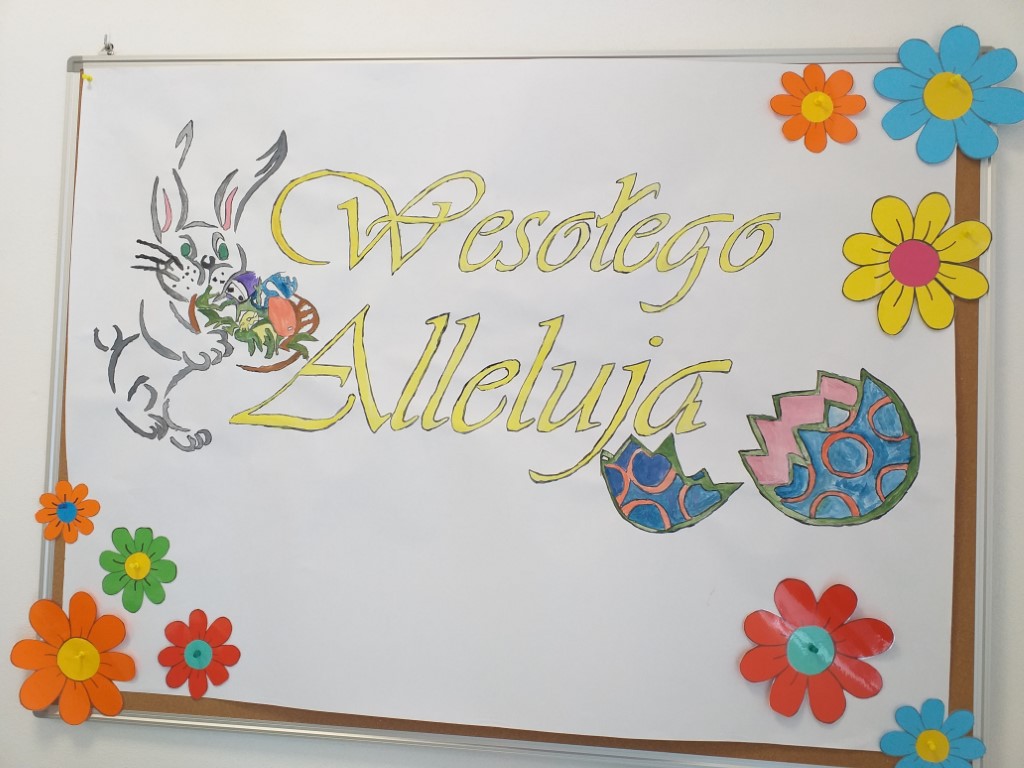 z dziećmi, przystroiły świątecznie jadalnię, w której wspólnie zasiedli do wielkanocnego szkolnego śniadania. Na stole były: sałatki, kiełbaska, wędliny, chrzanik, babki wielkanocne i jajeczka. Dzieci wszystkiego ze smakiem próbowały. Potem, wraz z Paniami, szukały w klasach czekoladowych jajeczek, które zostawił zajączek wielkanocny. Oglądały też „Przygody Wielkanocne Kota Filemona i Bonifacego”, poznając i utrwalając sobie przy tym polskie tradycje wielkanocne.
