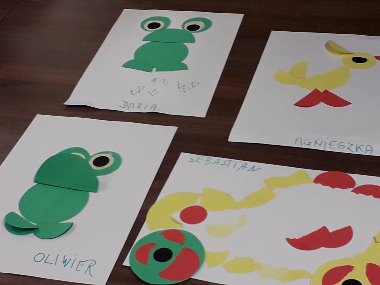 Tematem październikowego spotkania z książką były kolory i kształty. Nasi uczniowie wysłuchali krótkiego opowiadania o kształtach. Podczas czytania go, ich zadaniem było znalezienie wyczytywanych kształtów w otoczeniu i wskazanie ich. Potem dzieci wspólnie szukały właściwej drogi do krainy kształtów. Następnie wspólnie ułożyliśmy geometrycznego ludka i zbudowaliśmy kolorową wieże z klocków. Na koniec uczniowie wykonali pracę plastyczną „Żaba i kaczka”.