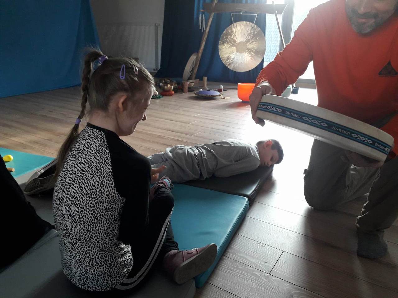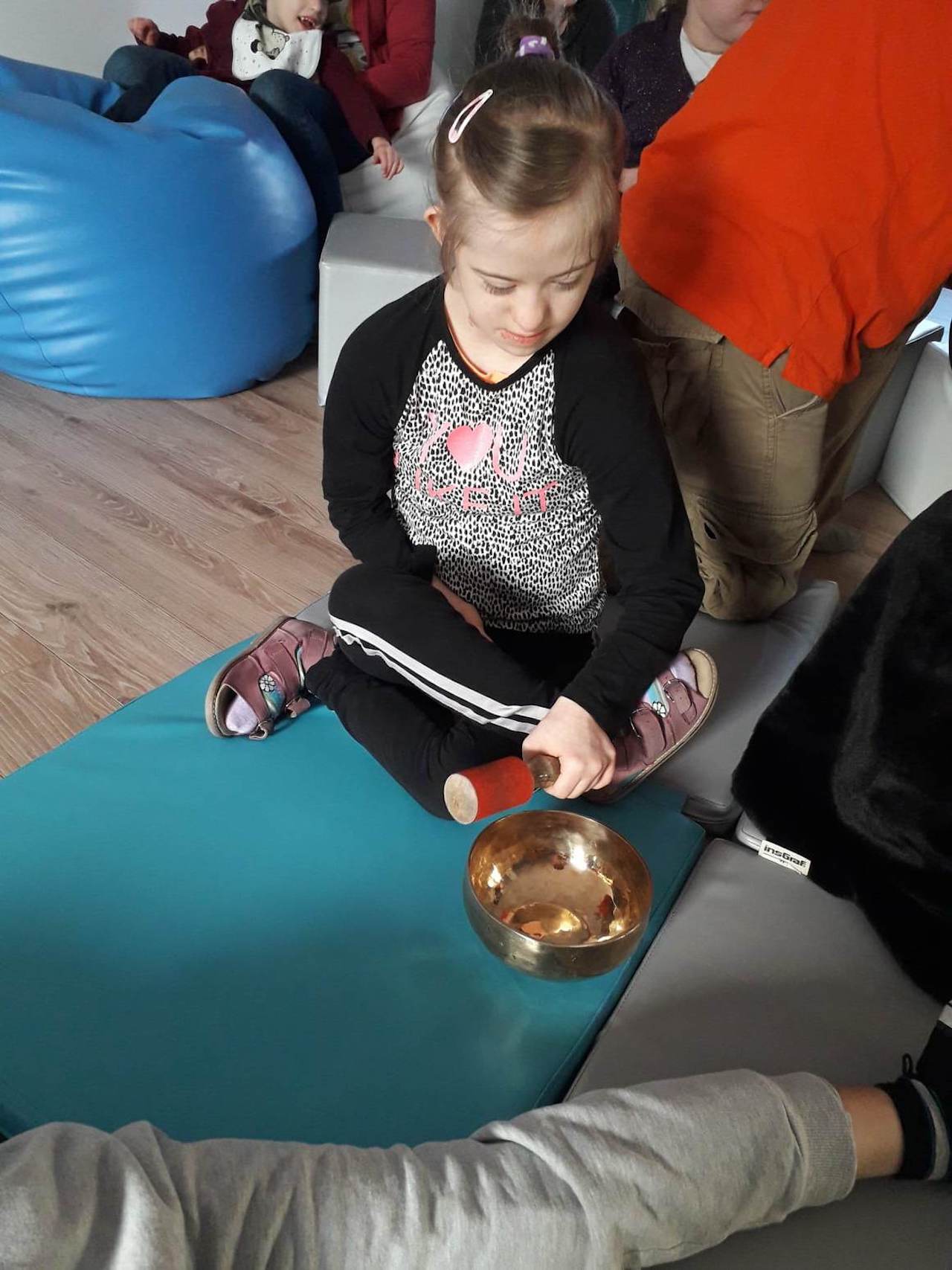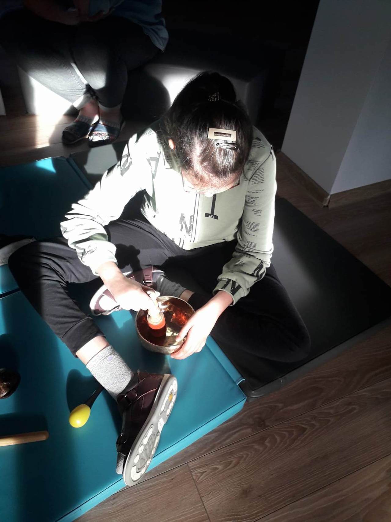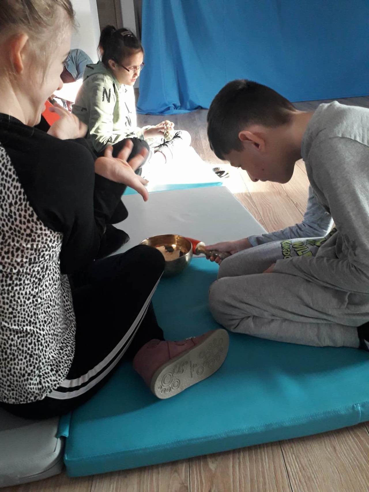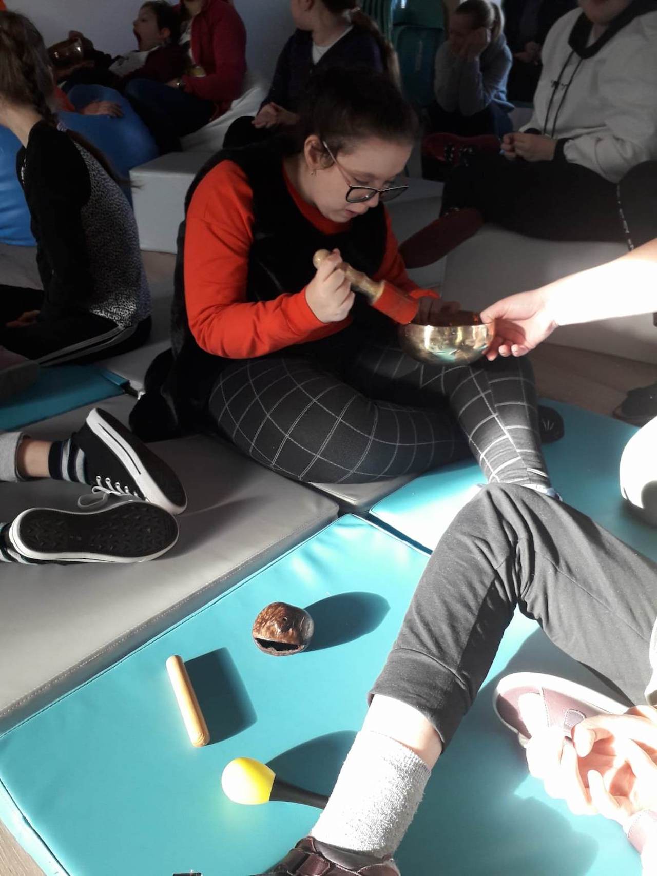Podczas grudniowych zajęć z terapii dźwiękiem uczniowie nie tylko się relaksowali, ale mogli także sami doświadczyć gry na misach, grzechotkach i dzwonkach, co sprawiało im dużo radości i frajdy.