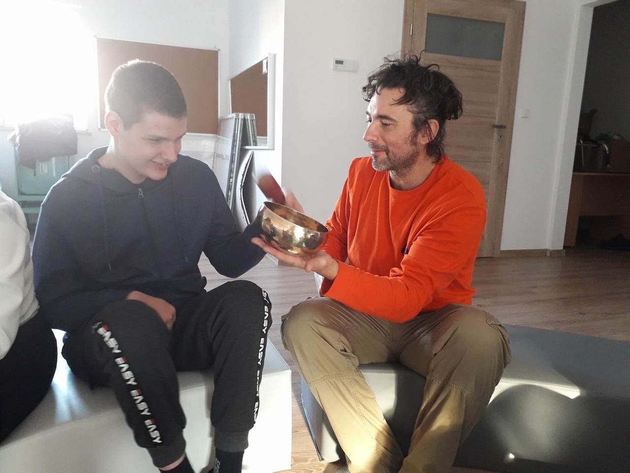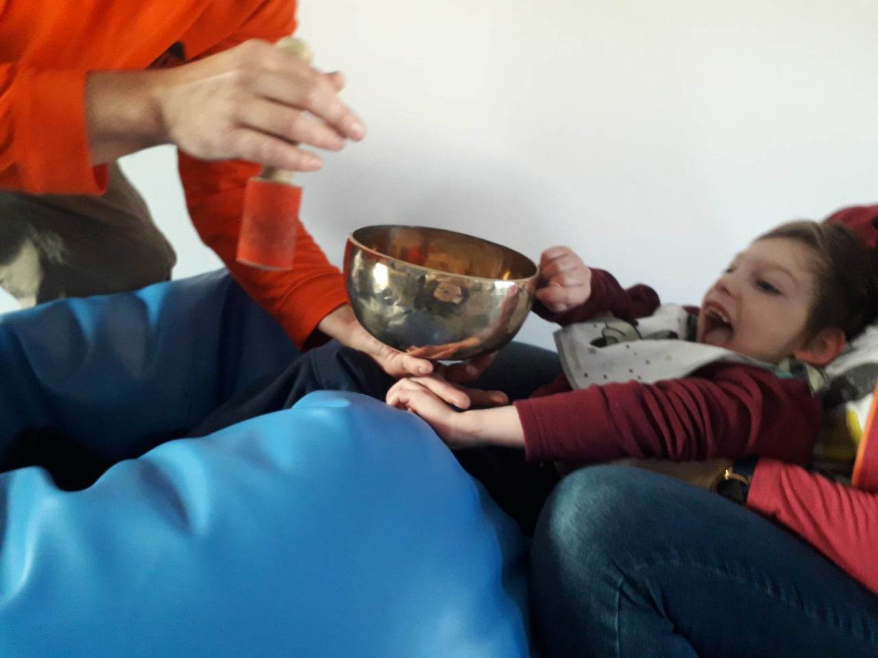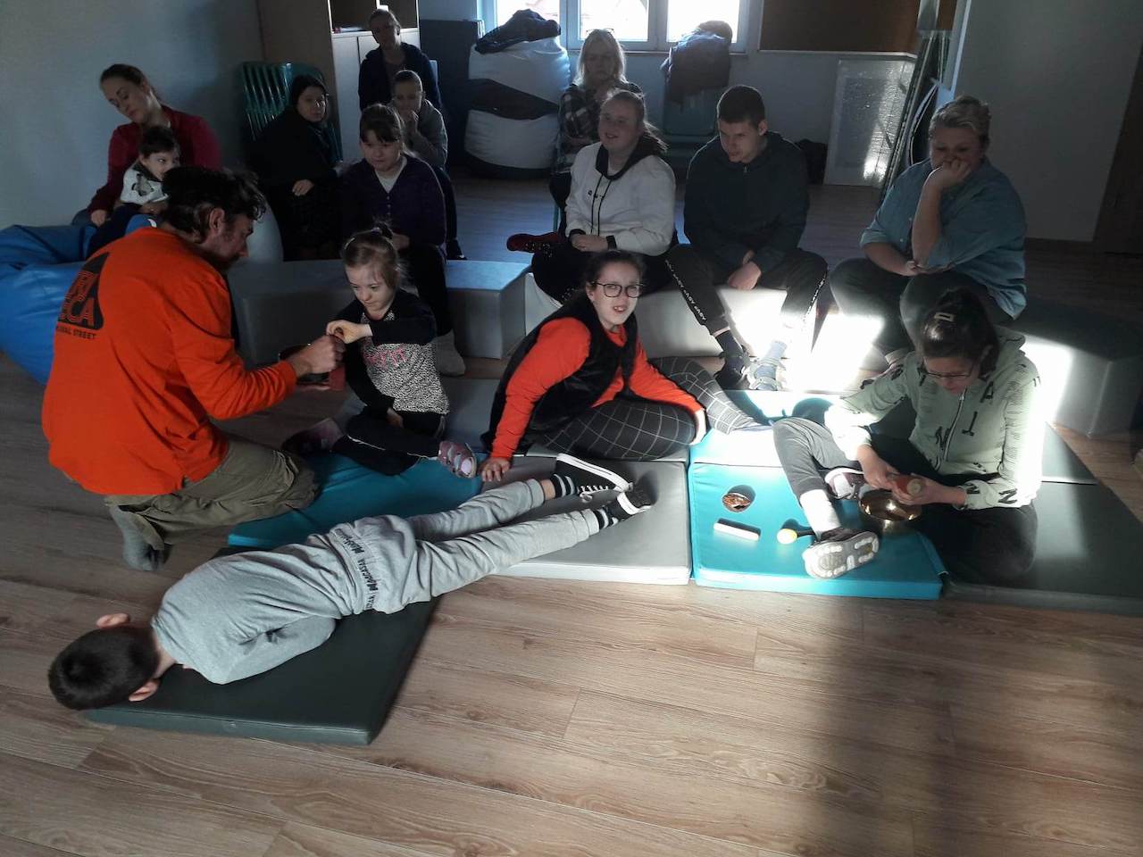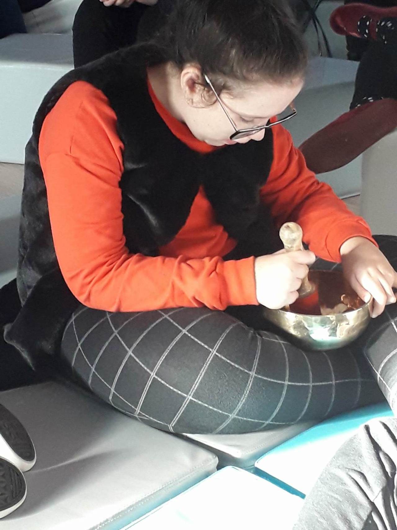 Podczas grudniowych zajęć z terapii dźwiękiem uczniowie nie tylko się relaksowali, ale mogli także sami doświadczyć gry na misach, grzechotkach i dzwonkach, co sprawiało im dużo radości i frajdy.