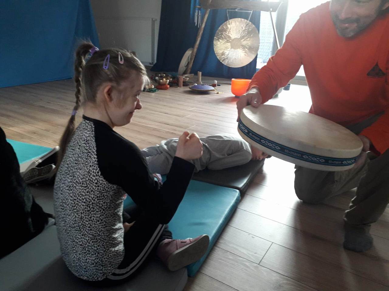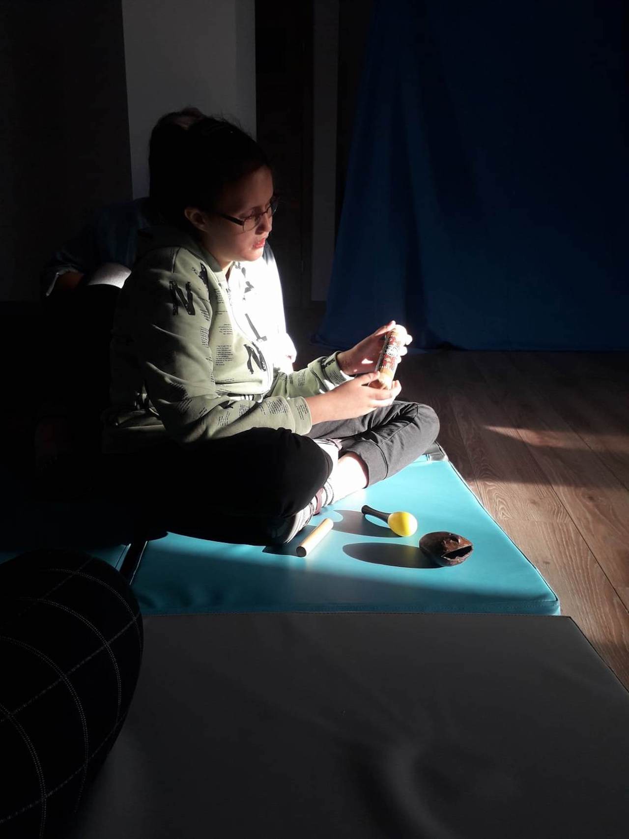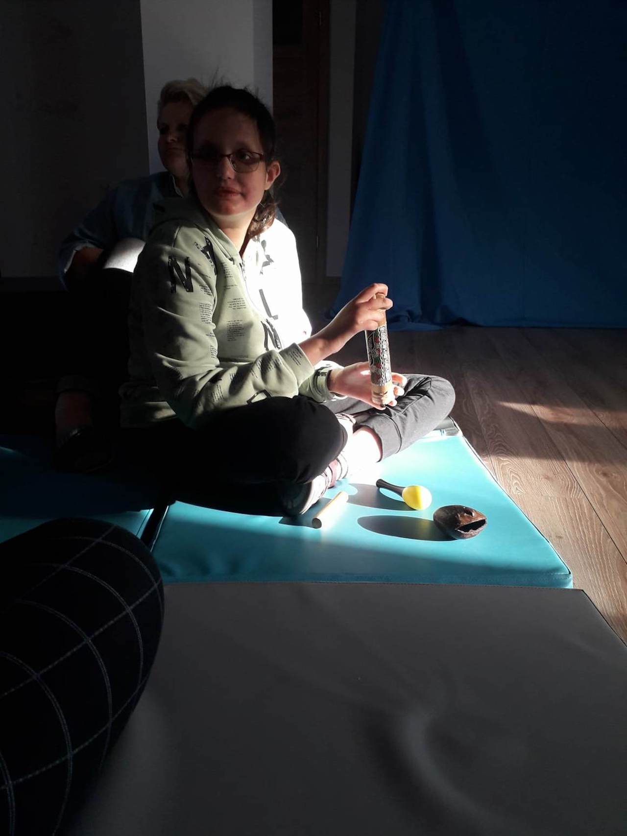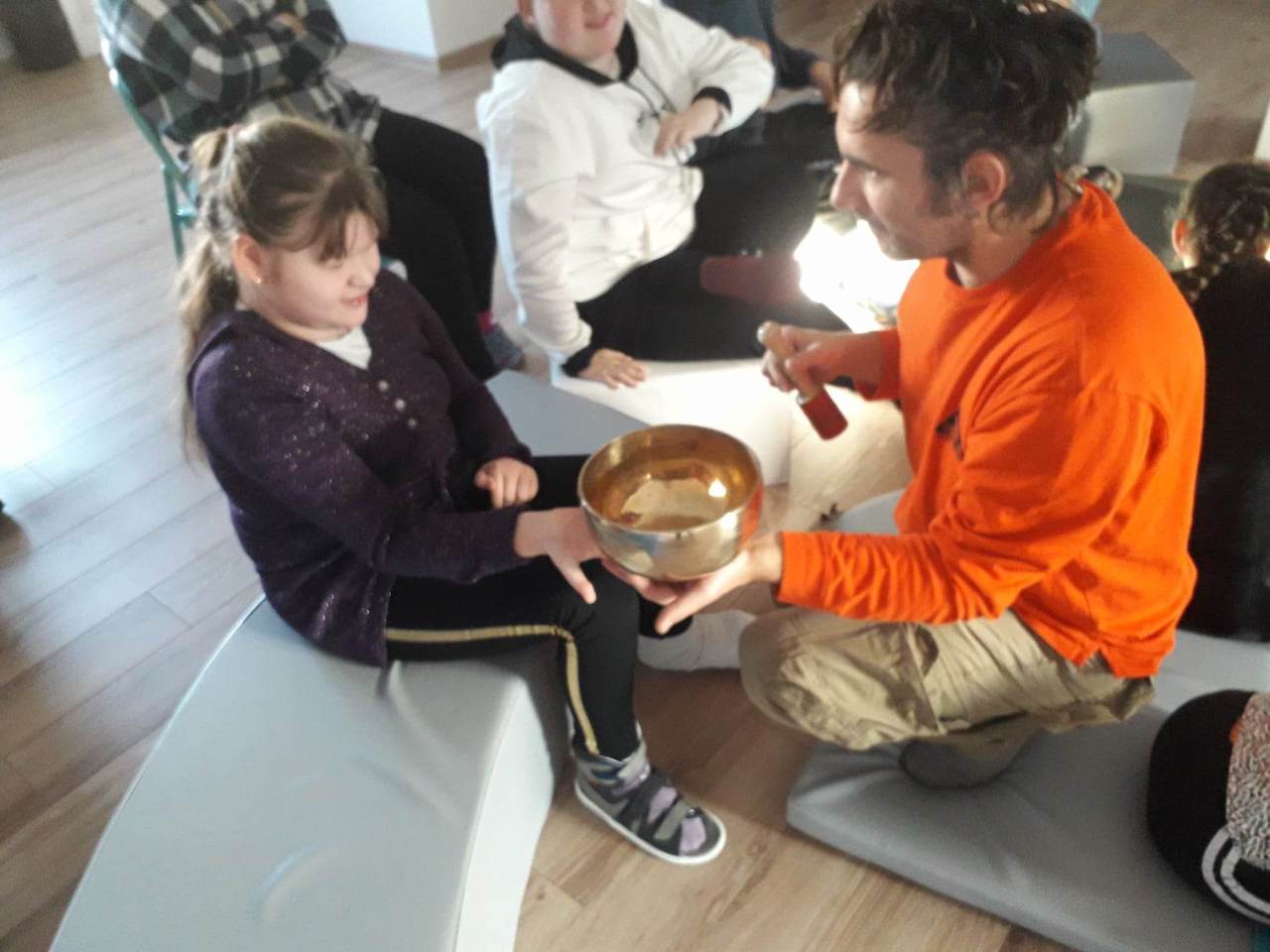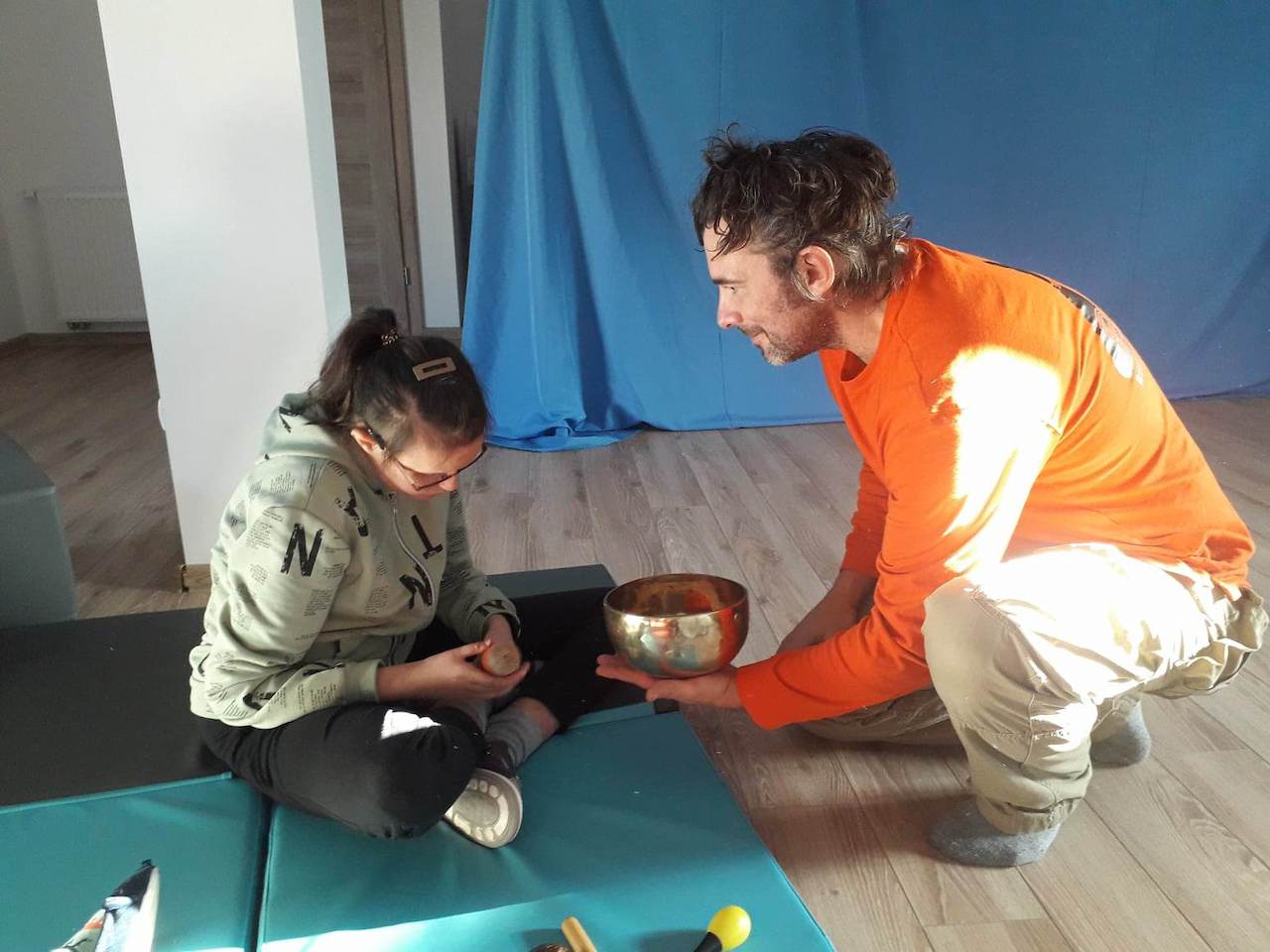 Podczas grudniowych zajęć z terapii dźwiękiem uczniowie nie tylko się relaksowali, ale mogli także sami doświadczyć gry na misach, grzechotkach i dzwonkach, co sprawiało im dużo radości i frajdy.