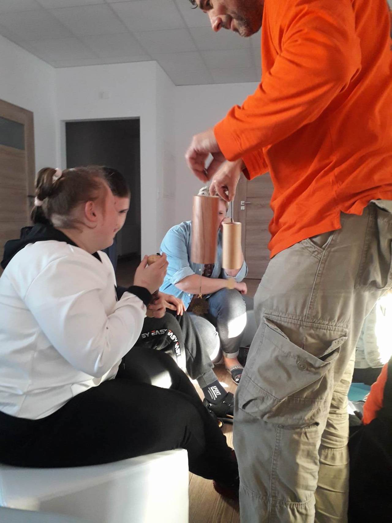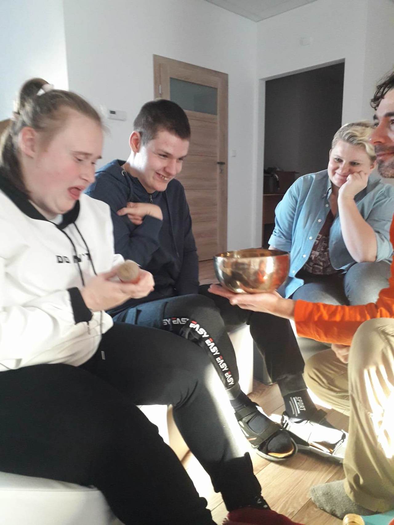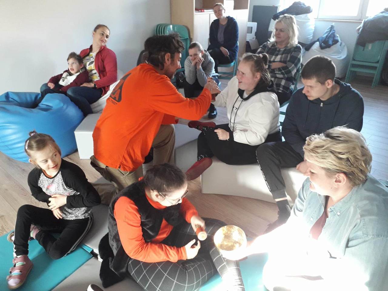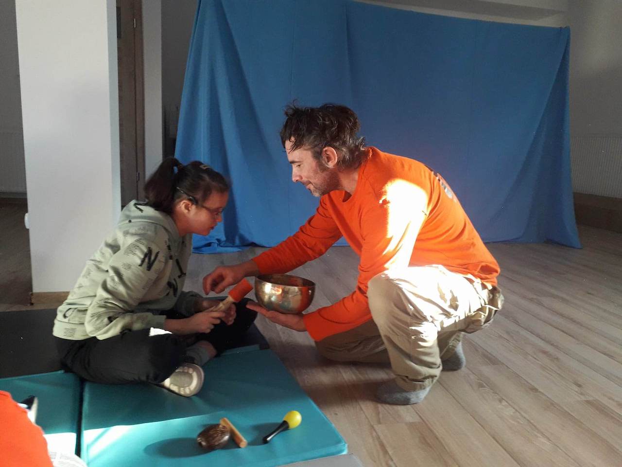 Podczas grudniowych zajęć z terapii dźwiękiem uczniowie nie tylko się relaksowali, ale mogli także sami doświadczyć gry na misach, grzechotkach i dzwonkach, co sprawiało im dużo radości i frajdy.