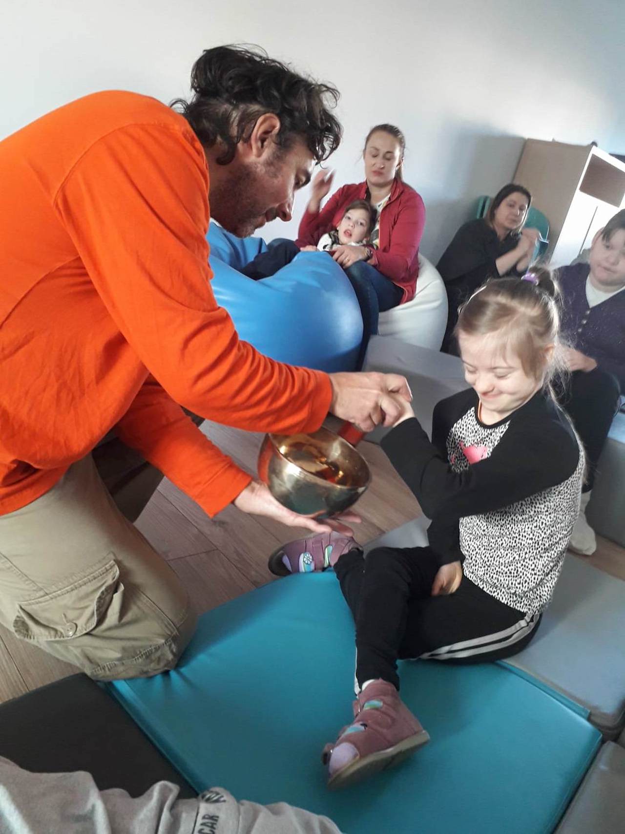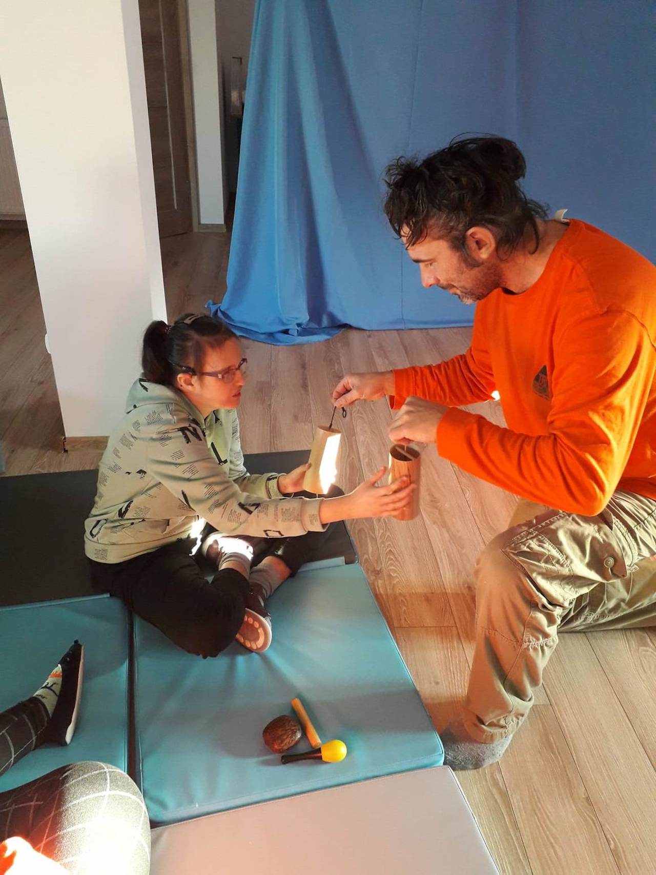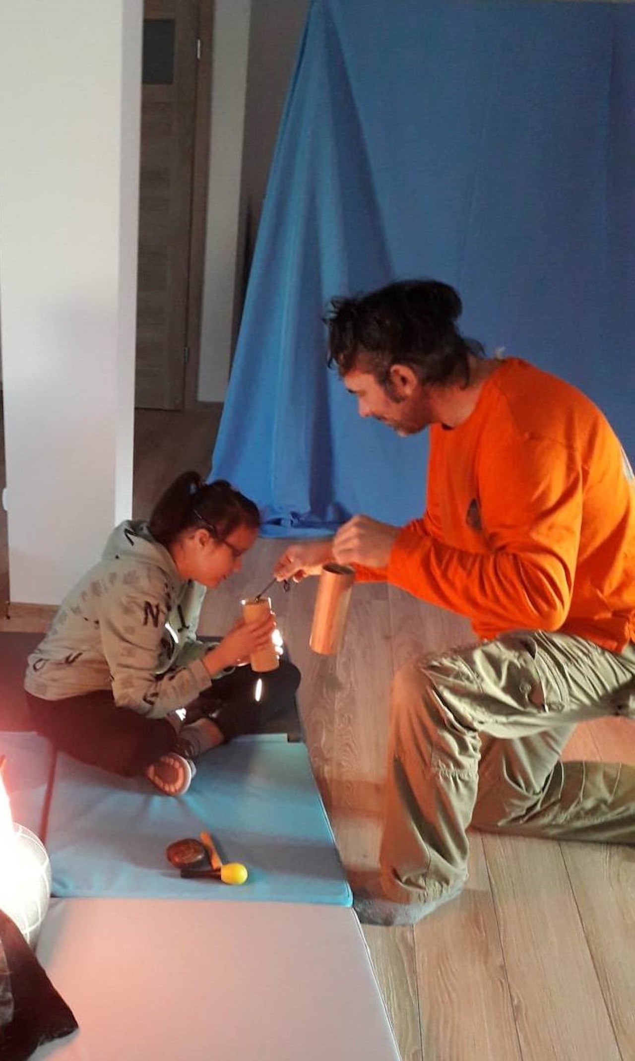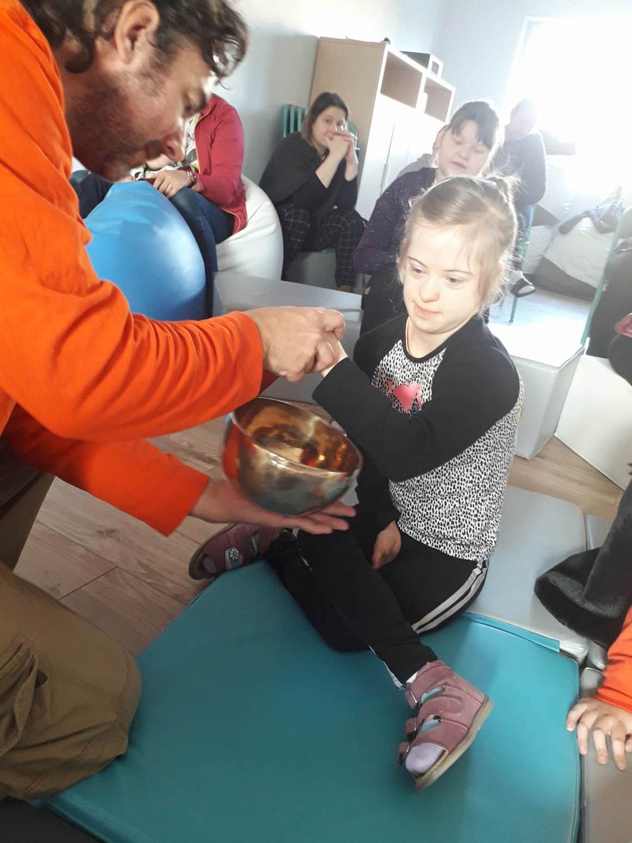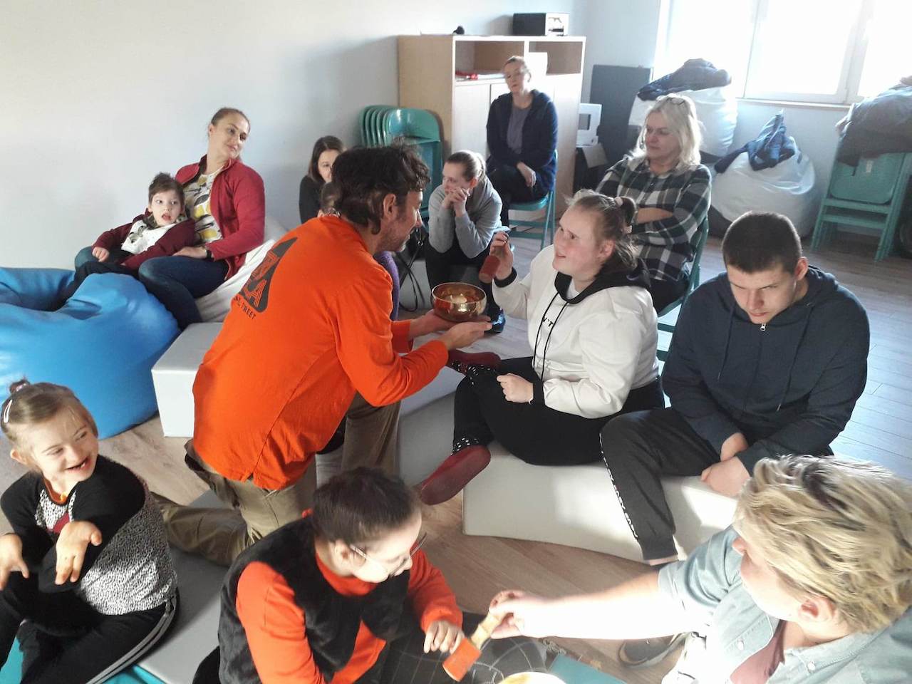 Podczas grudniowych zajęć z terapii dźwiękiem uczniowie nie tylko się relaksowali, ale mogli także sami doświadczyć gry na misach, grzechotkach i dzwonkach, co sprawiało im dużo radości i frajdy.