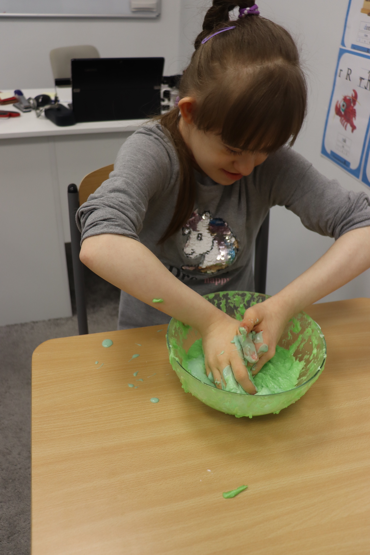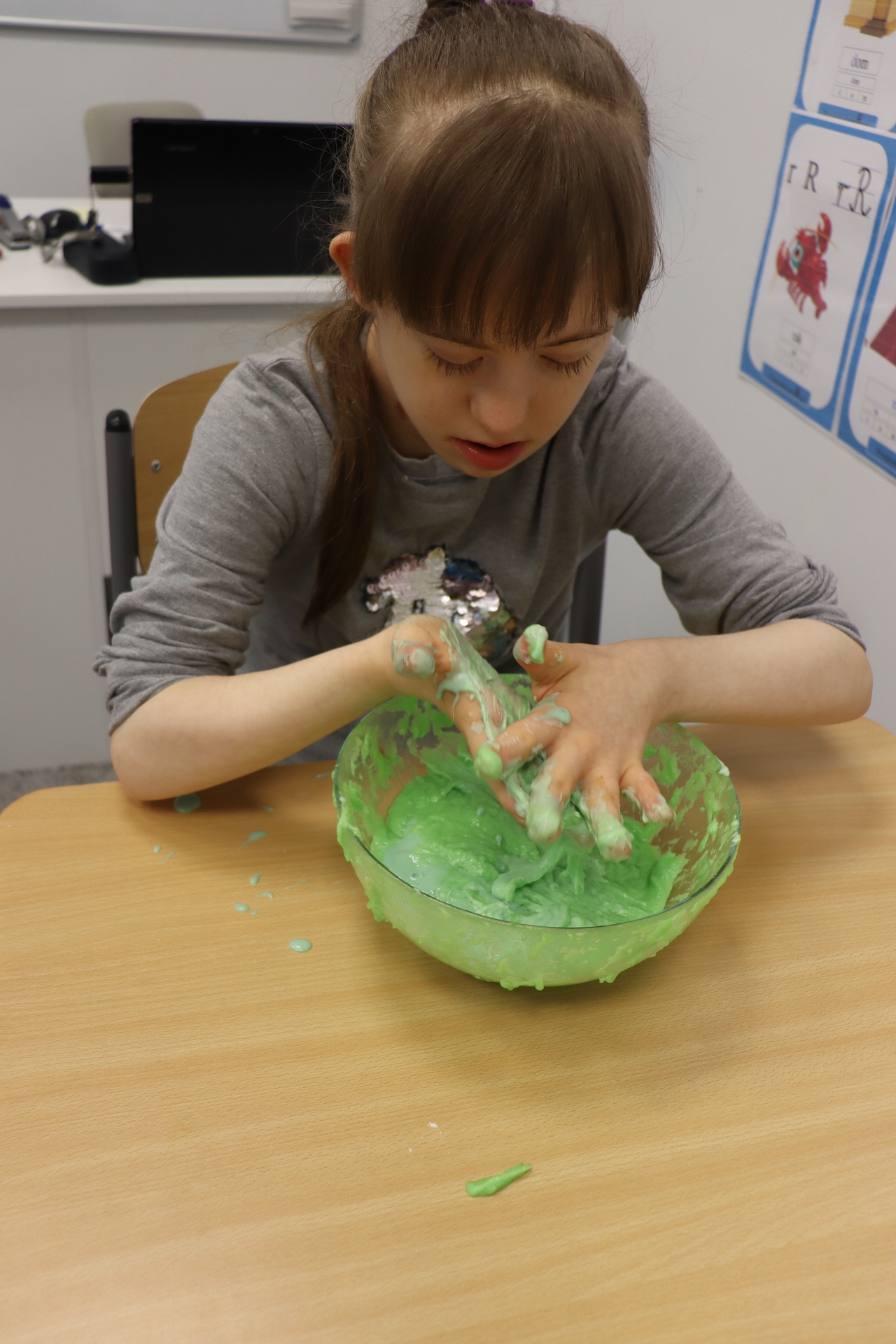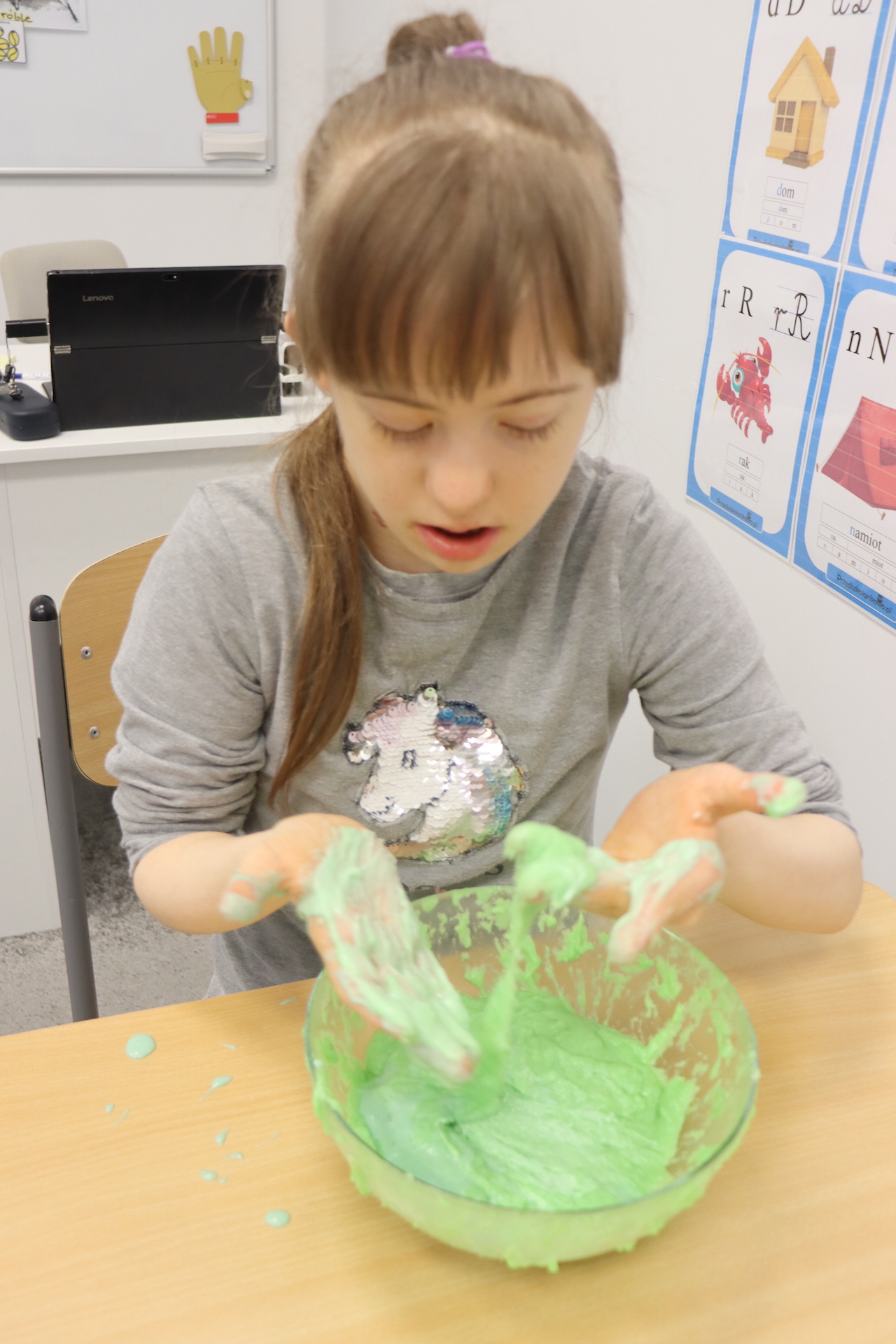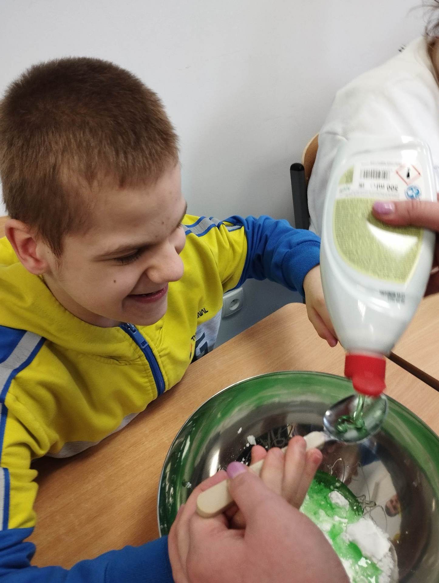Lutowym zadaniem w ogólnopolskim projekcie edukacyjnym „Gramy zmysłami”- było wykonanie slime. Slime to niezwykła masa plastyczna, uwielbiana przez dzieci. Służy do zabawy sensorycznej oraz rozwija percepcję zmysłową. Zabawa przy użyciu slime stymuluje przede wszystkim rozwój zmysłu dotyku oraz wspomaga rozwój motoryki małej. Podczas zajęć edukacyjnych uczniowie samodzielnie przygotowali kolorowe i bardzo rozciągliwe slime, co dało im wiele zaciekawienia i radości.