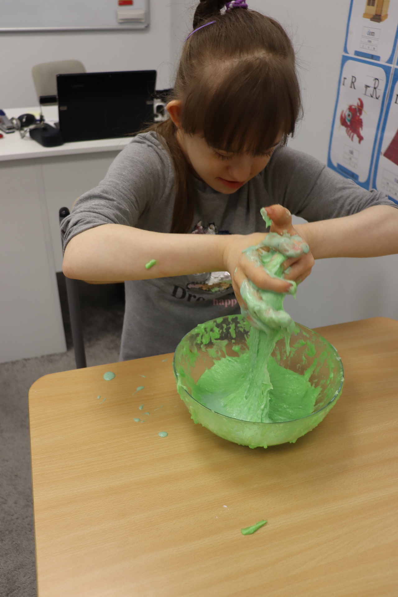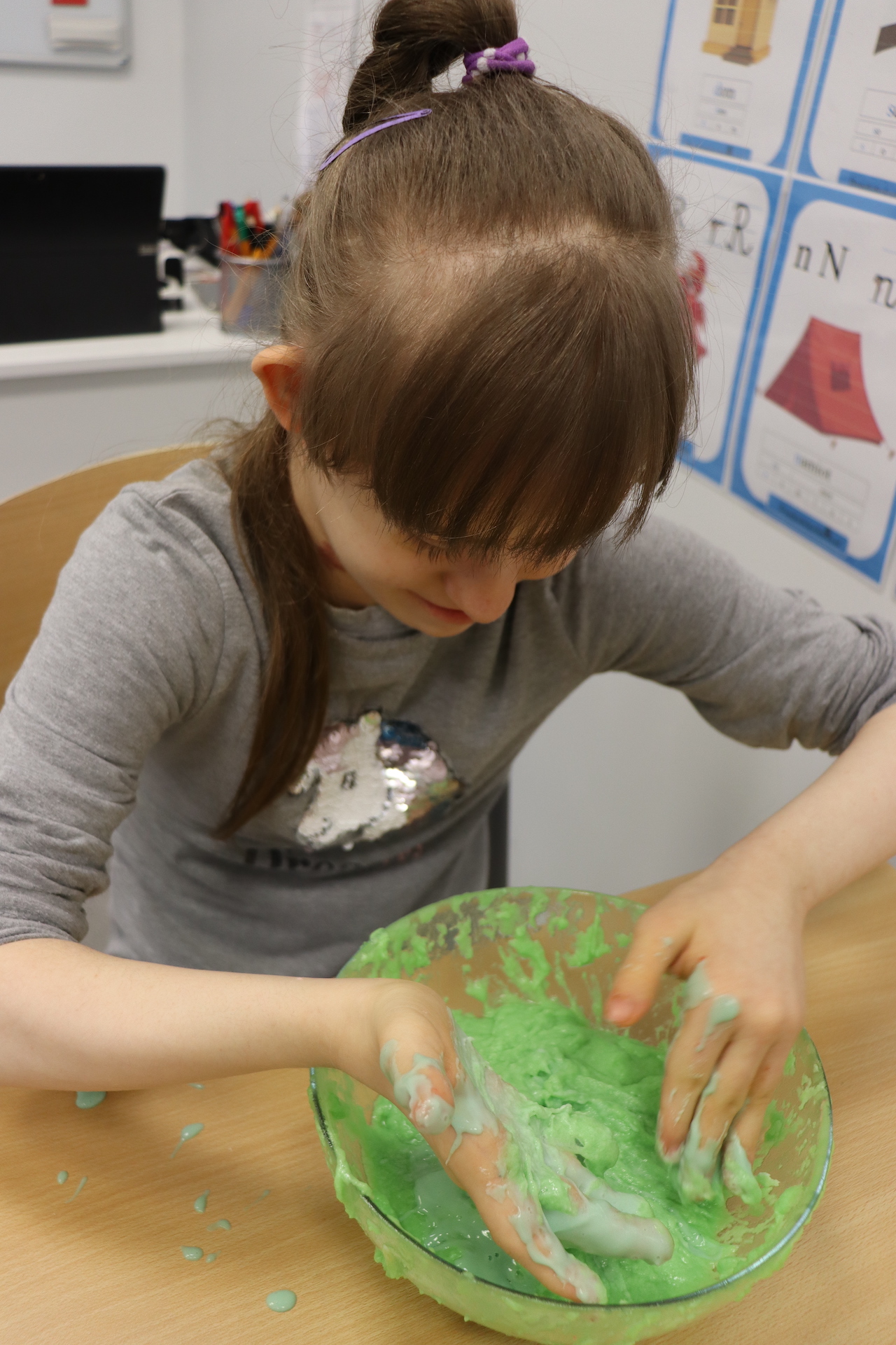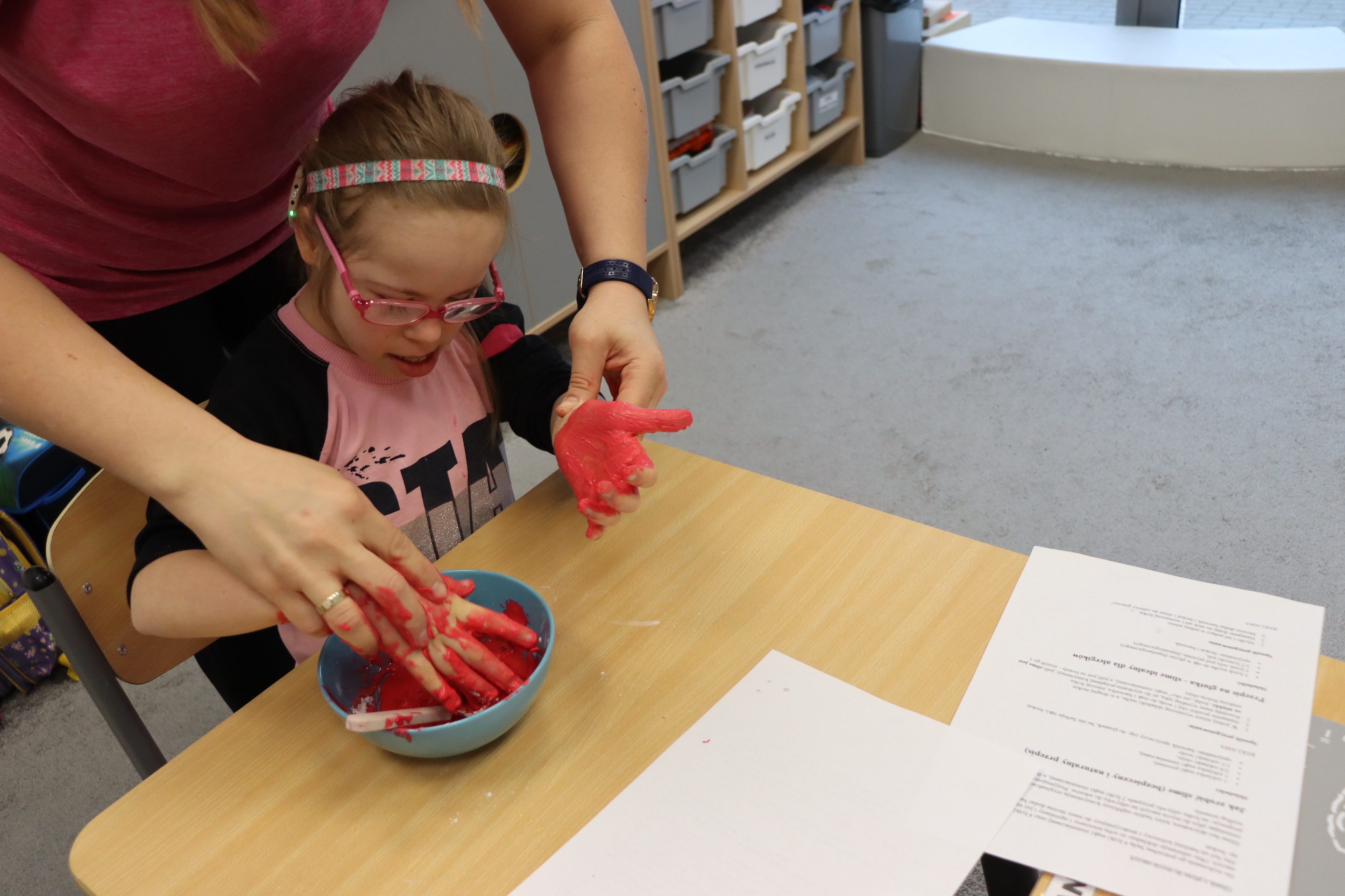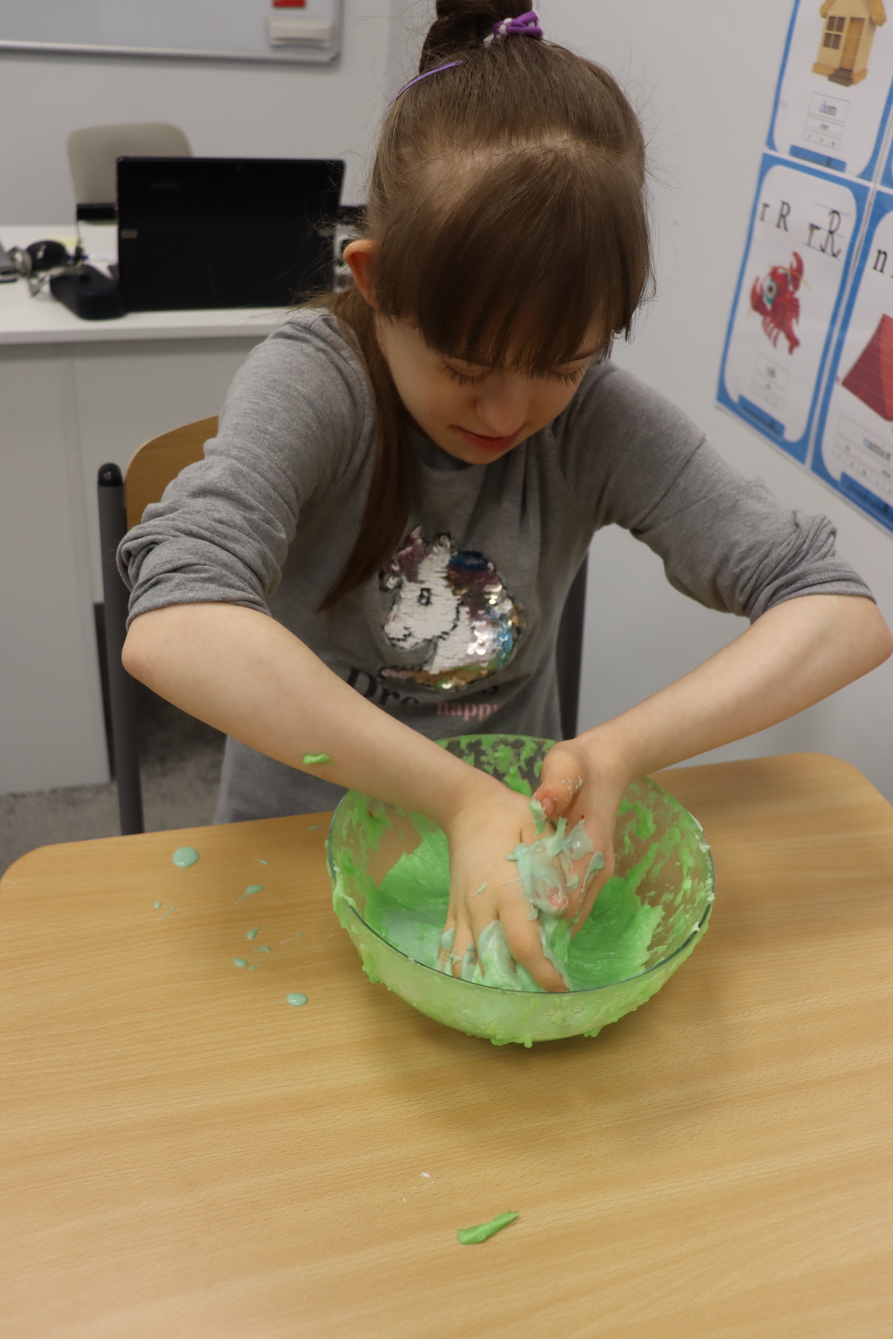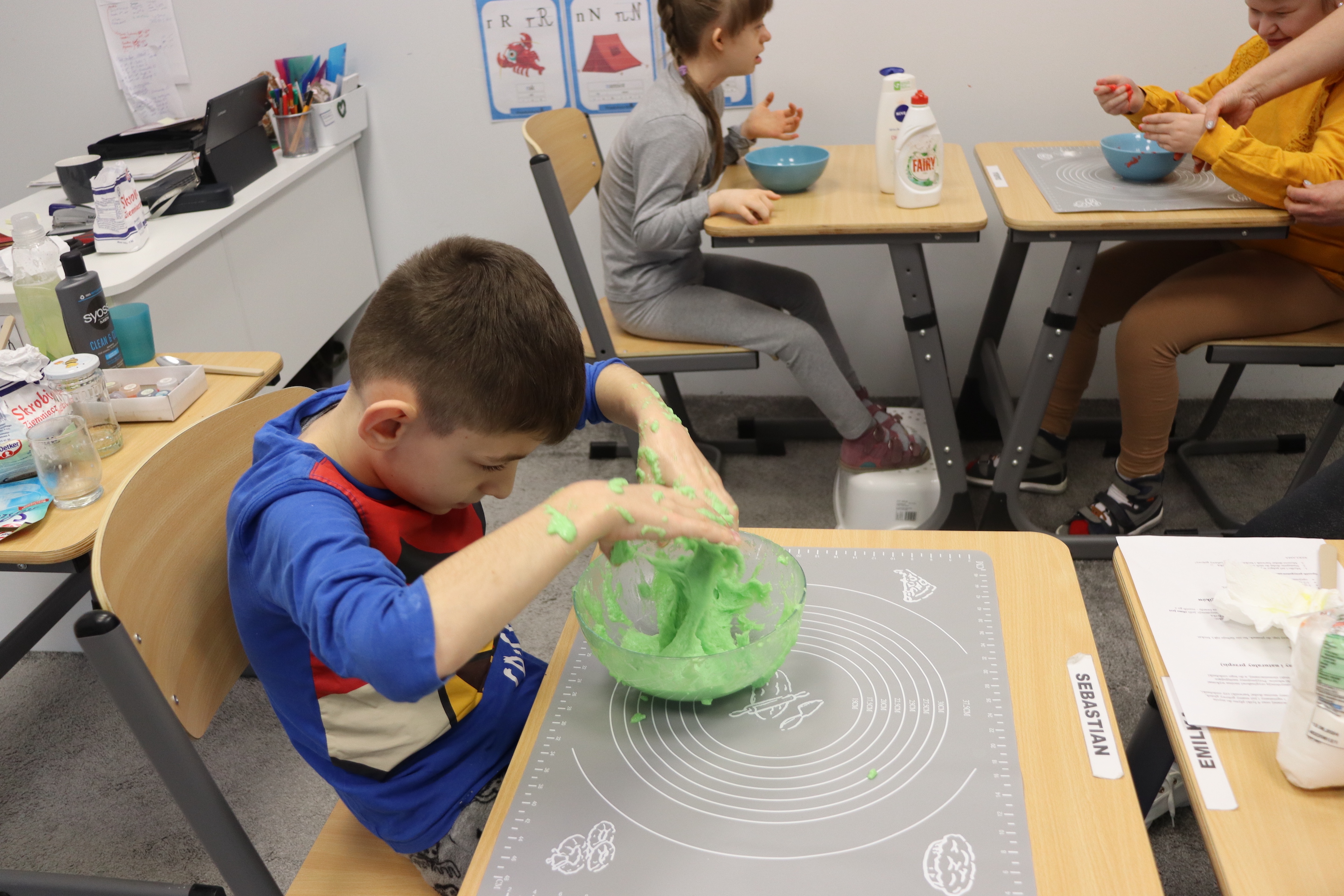 Lutowym zadaniem w ogólnopolskim projekcie edukacyjnym „Gramy zmysłami”- było wykonanie slime. Slime to niezwykła masa plastyczna, uwielbiana przez dzieci. Służy do zabawy sensorycznej oraz rozwija percepcję zmysłową. Zabawa przy użyciu slime stymuluje przede wszystkim rozwój zmysłu dotyku oraz wspomaga rozwój motoryki małej. Podczas zajęć edukacyjnych uczniowie samodzielnie przygotowali kolorowe i bardzo rozciągliwe slime, co dało im wiele zaciekawienia i radości.