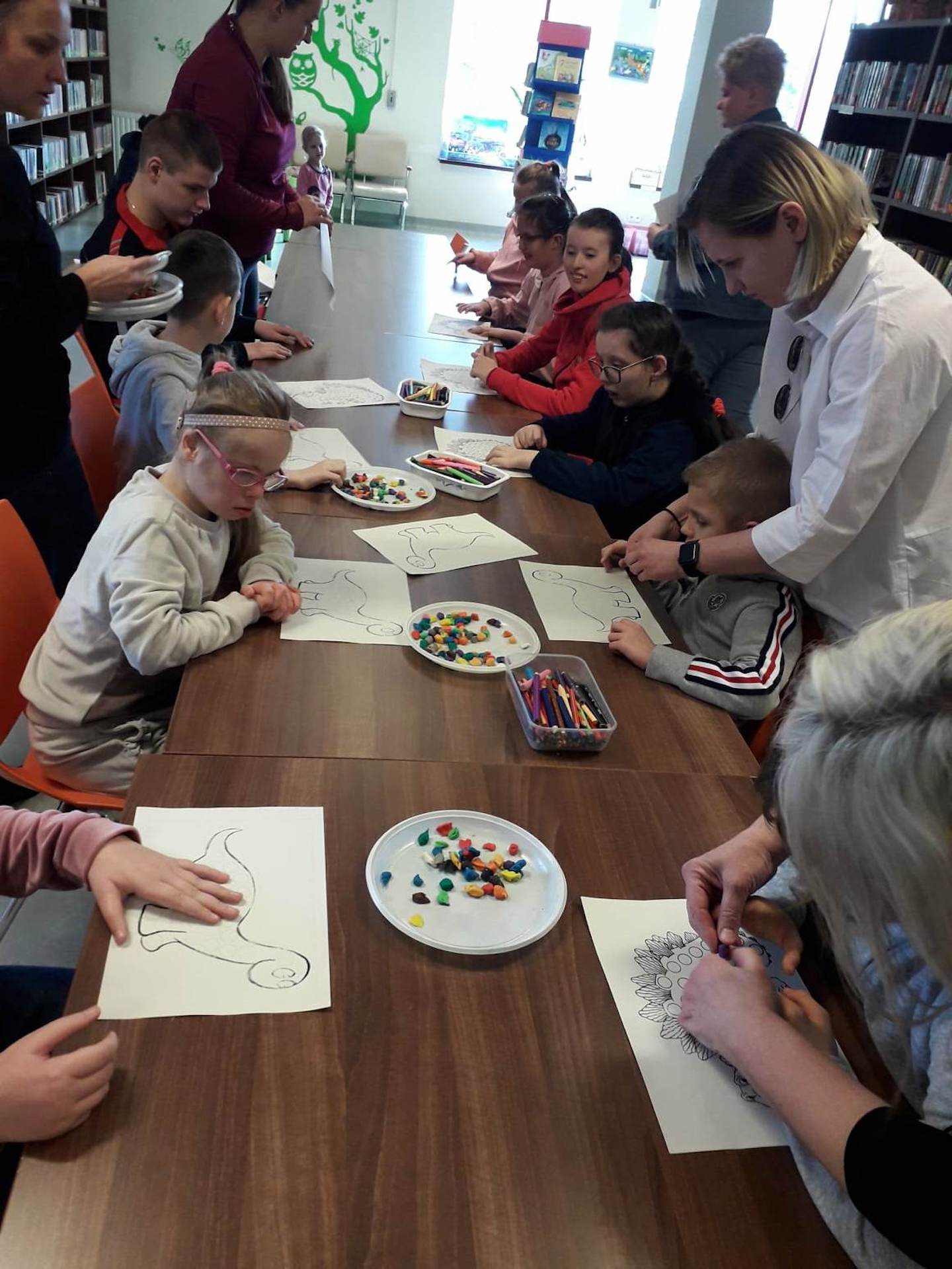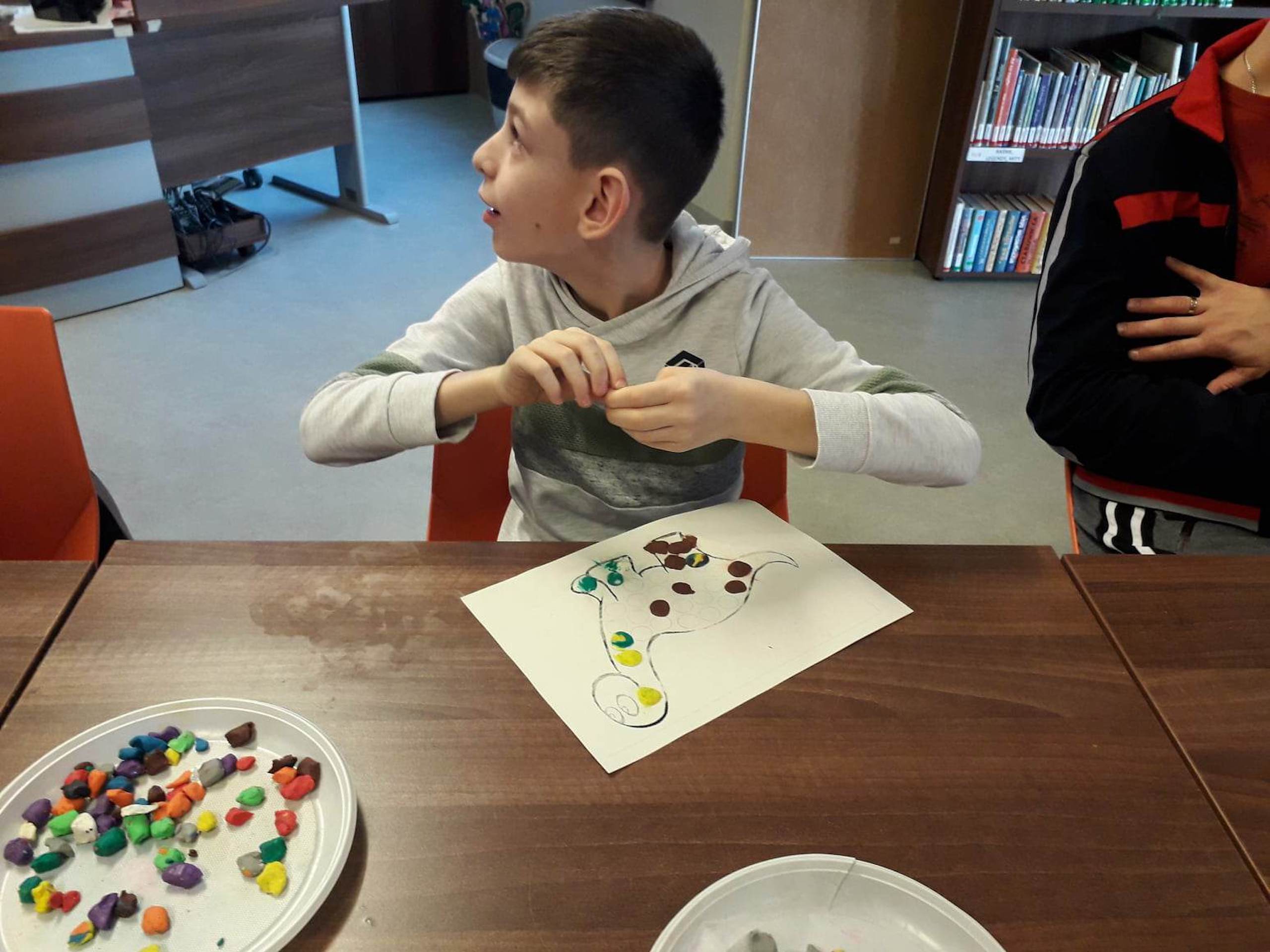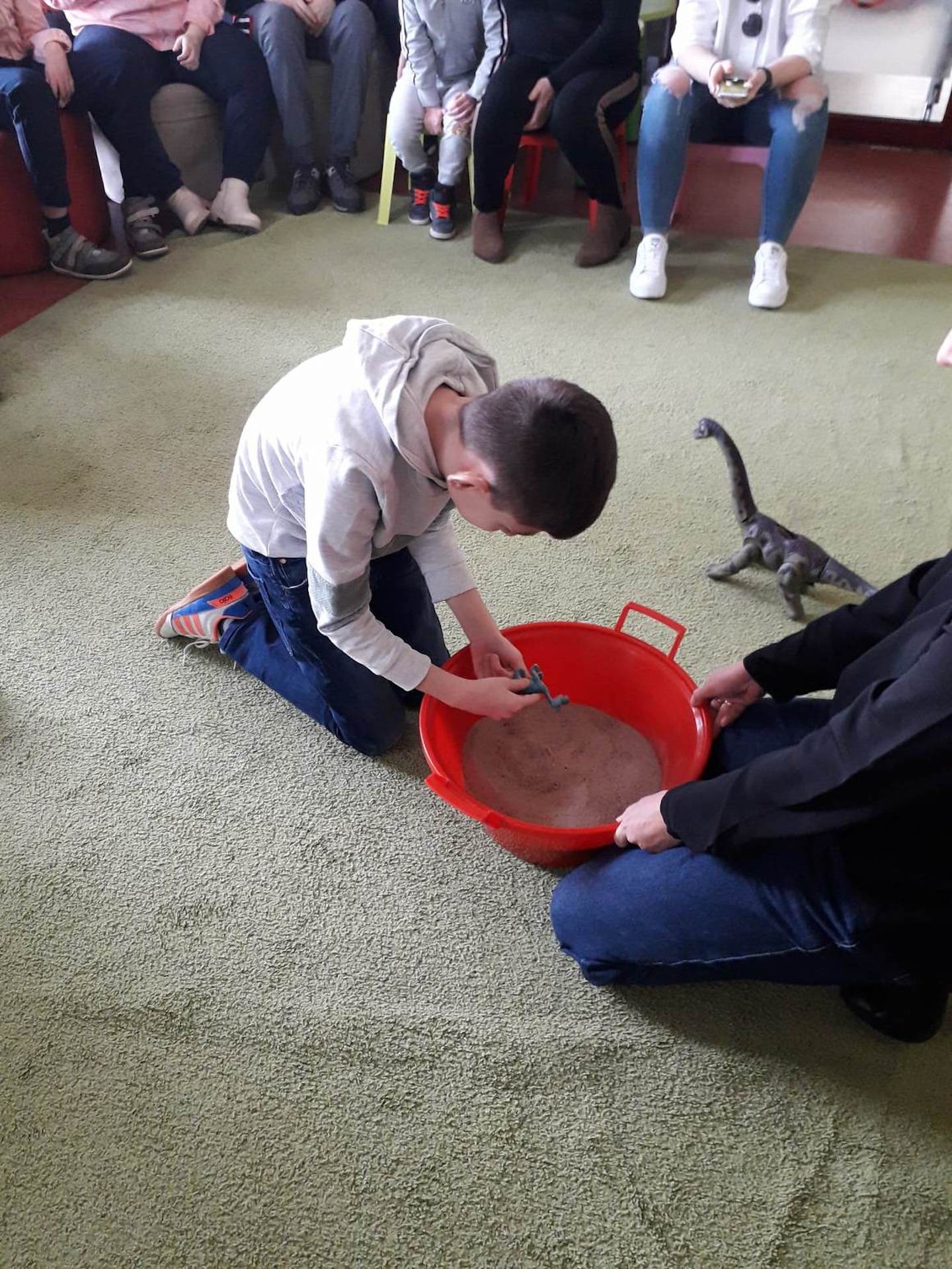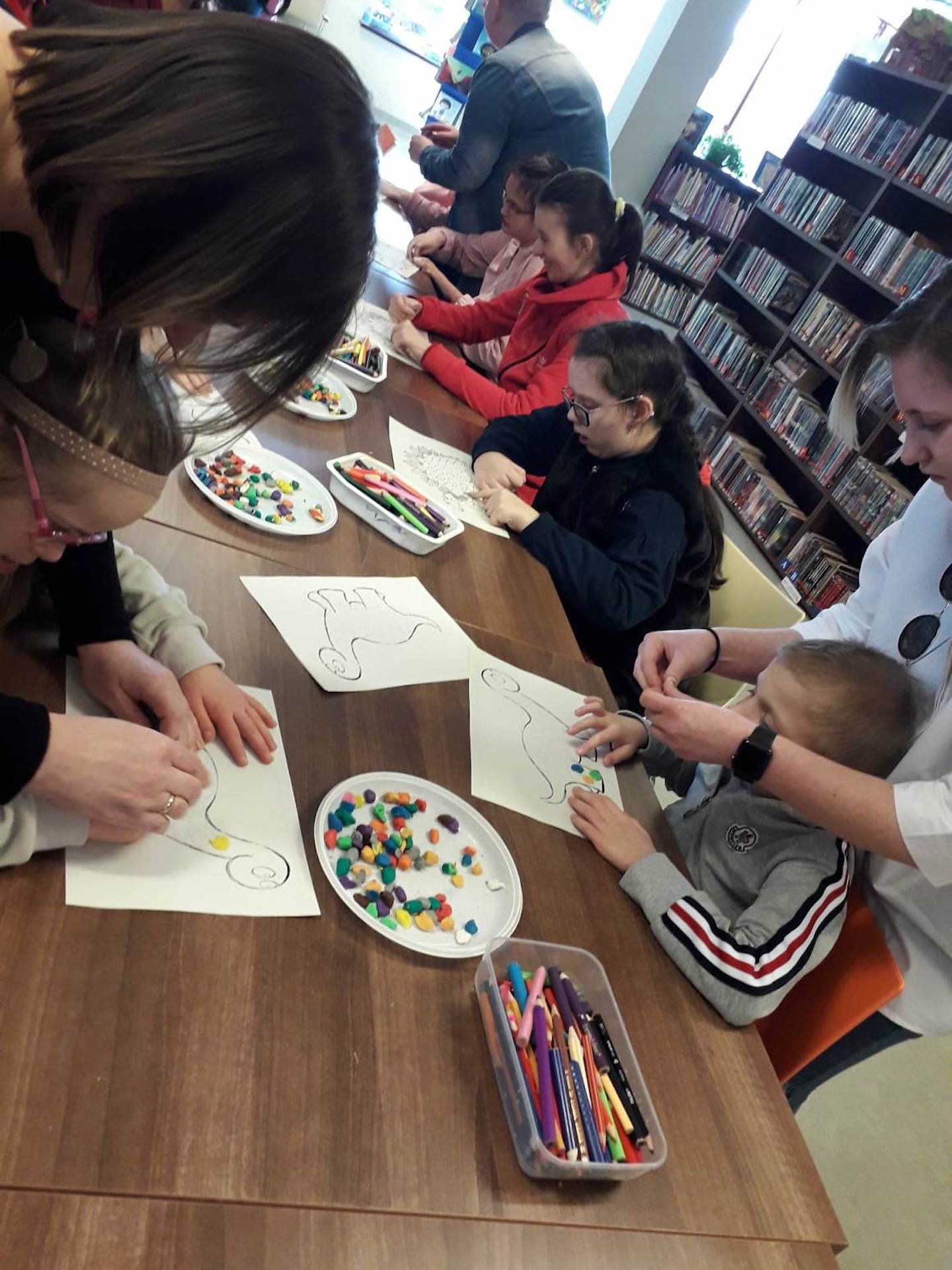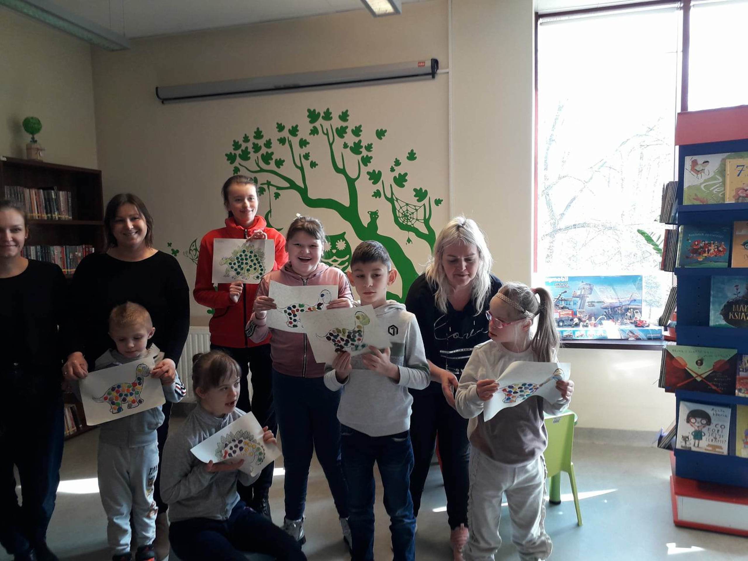 Podczas lutowego „Spotkania z książką” uczniowie zapoznali się z pozycjami książkowymi opowiadającymi o życiu dinozaurów. Najpierw zamienili się w archeologów i wykopywali z piasku dinozaury, poznając ich trudne nazwy. Potem odgadywali zagadki o dinozaurach, naśladując ich charakterystyczne cechy, a następnie wykonywali ćwiczenia logopedyczne podane przez dinozaury oraz zrobili masażyk dinozaura. Na koniec wszyscy uczniowie wykonali pracę plastyczną „Kropkowy dinozaur”