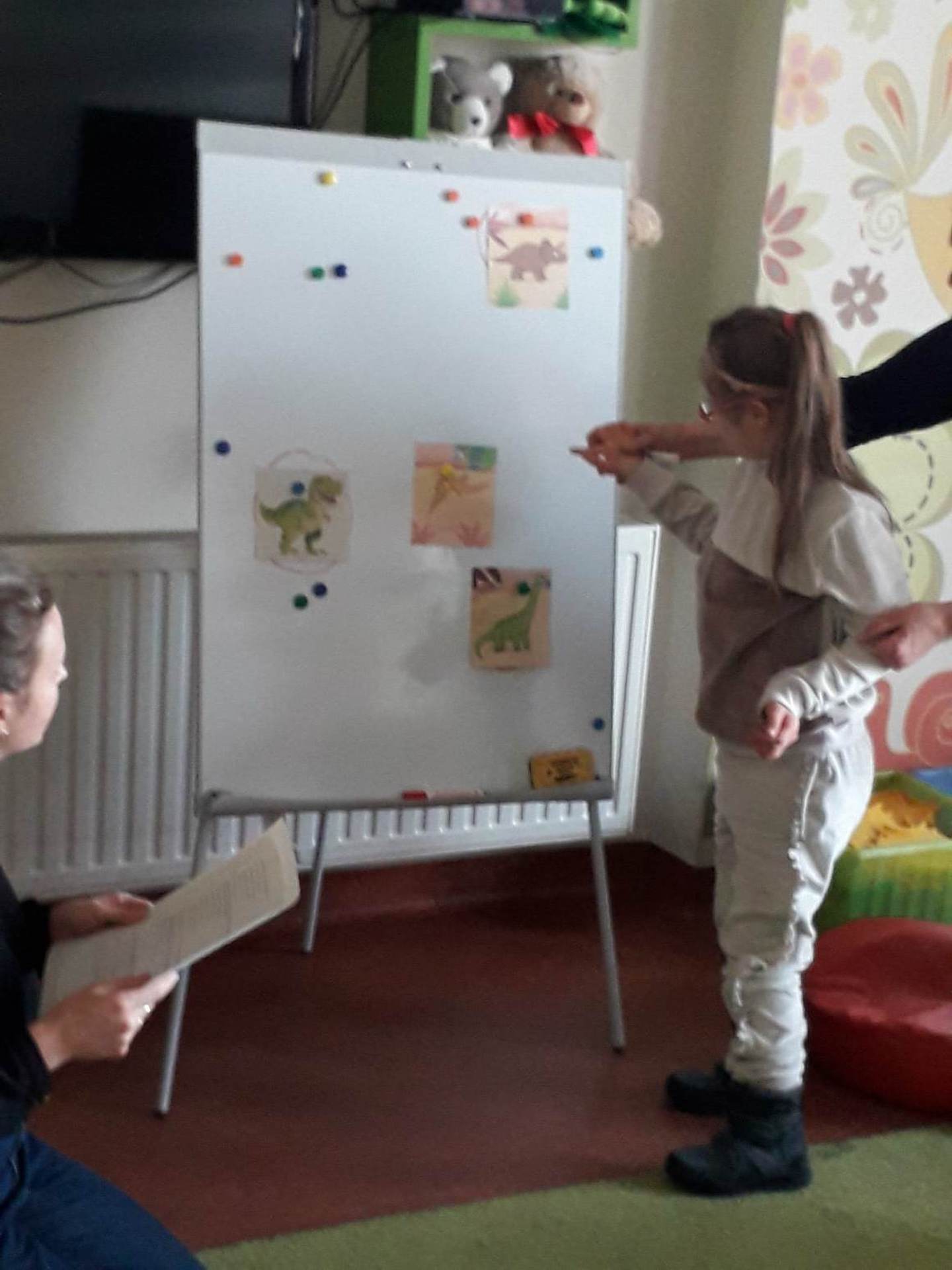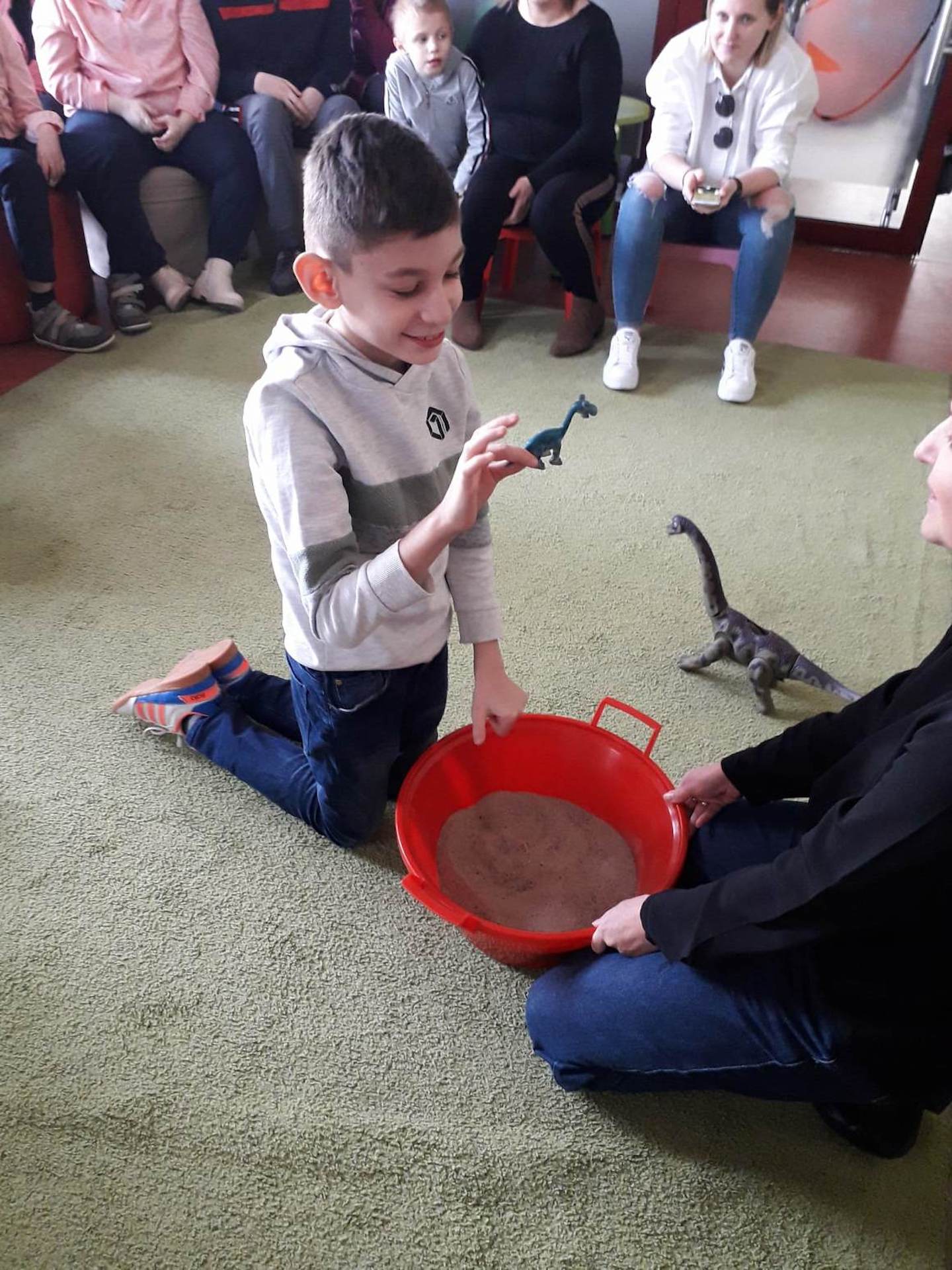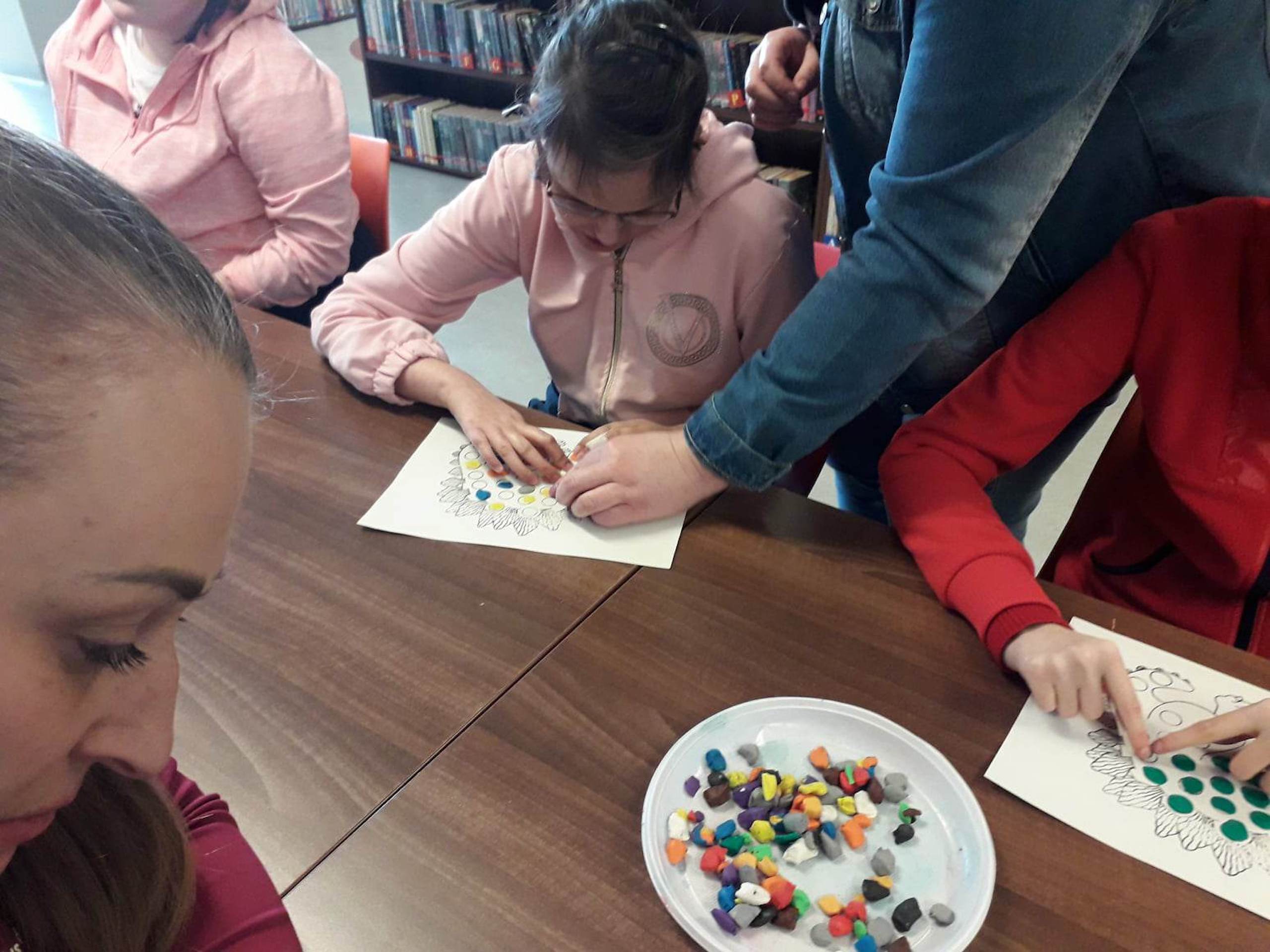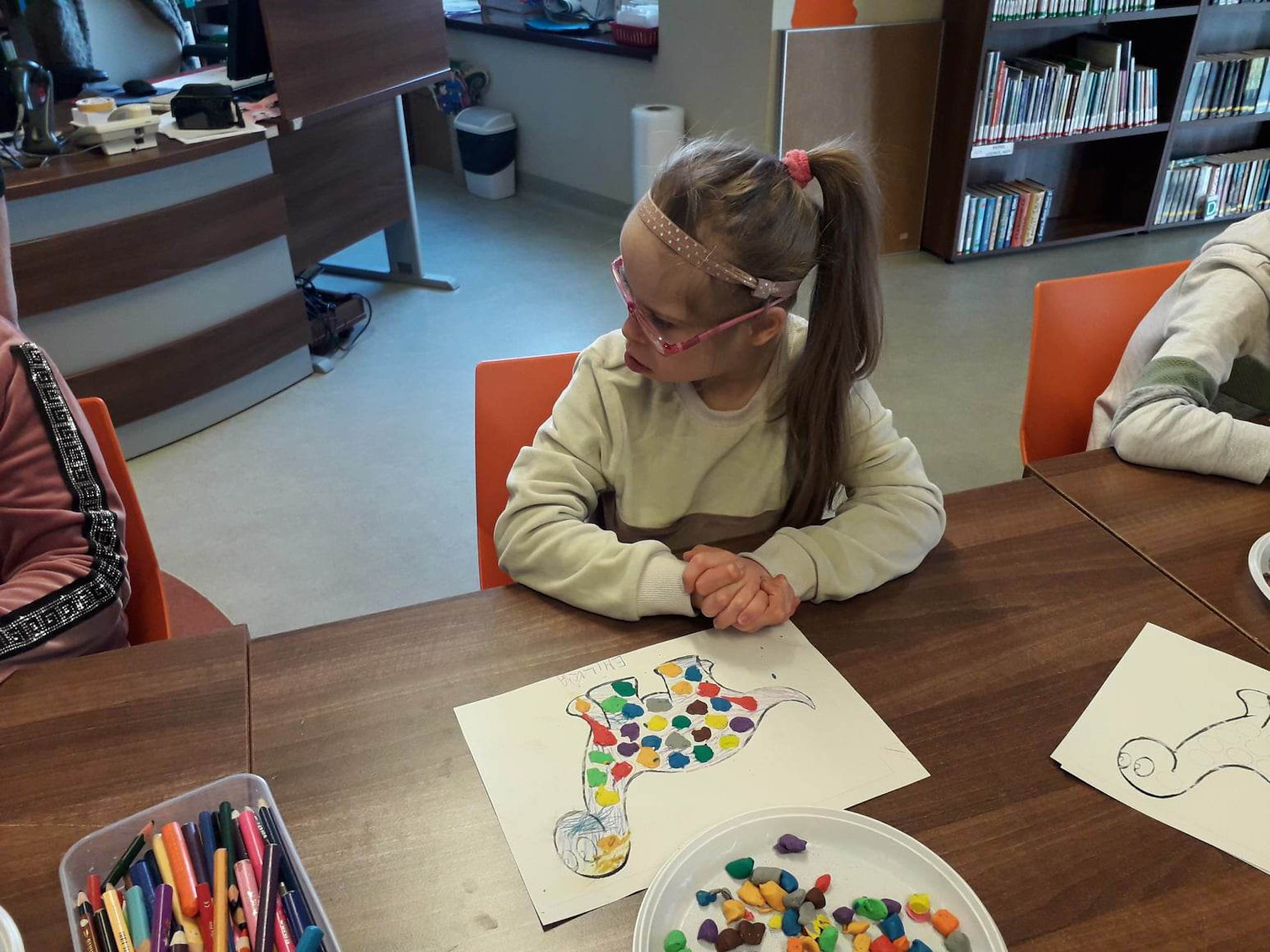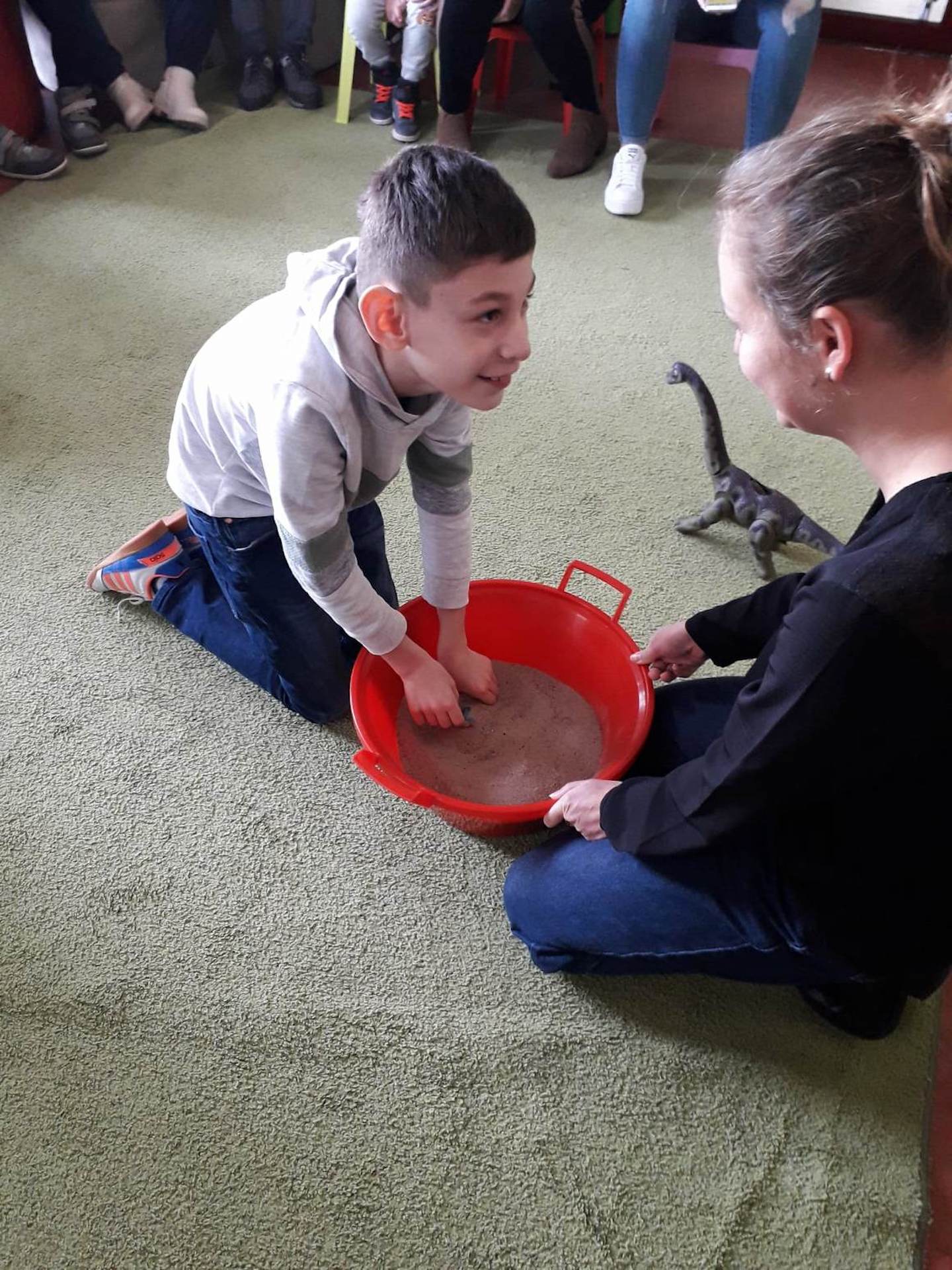 Podczas lutowego „Spotkania z książką” uczniowie zapoznali się z pozycjami książkowymi opowiadającymi o życiu dinozaurów. Najpierw zamienili się w archeologów i wykopywali z piasku dinozaury, poznając ich trudne nazwy. Potem odgadywali zagadki o dinozaurach, naśladując ich charakterystyczne cechy, a następnie wykonywali ćwiczenia logopedyczne podane przez dinozaury oraz zrobili masażyk dinozaura. Na koniec wszyscy uczniowie wykonali pracę plastyczną „Kropkowy dinozaur”