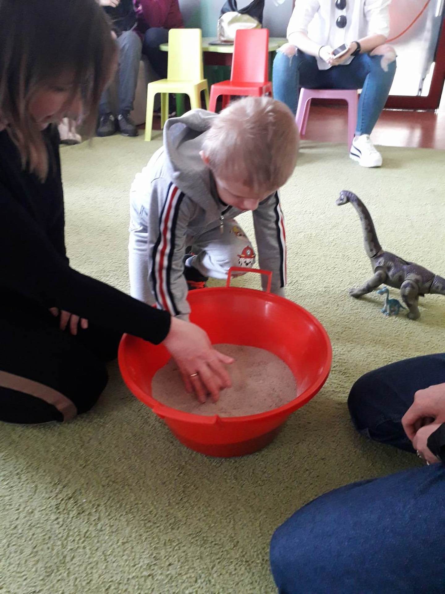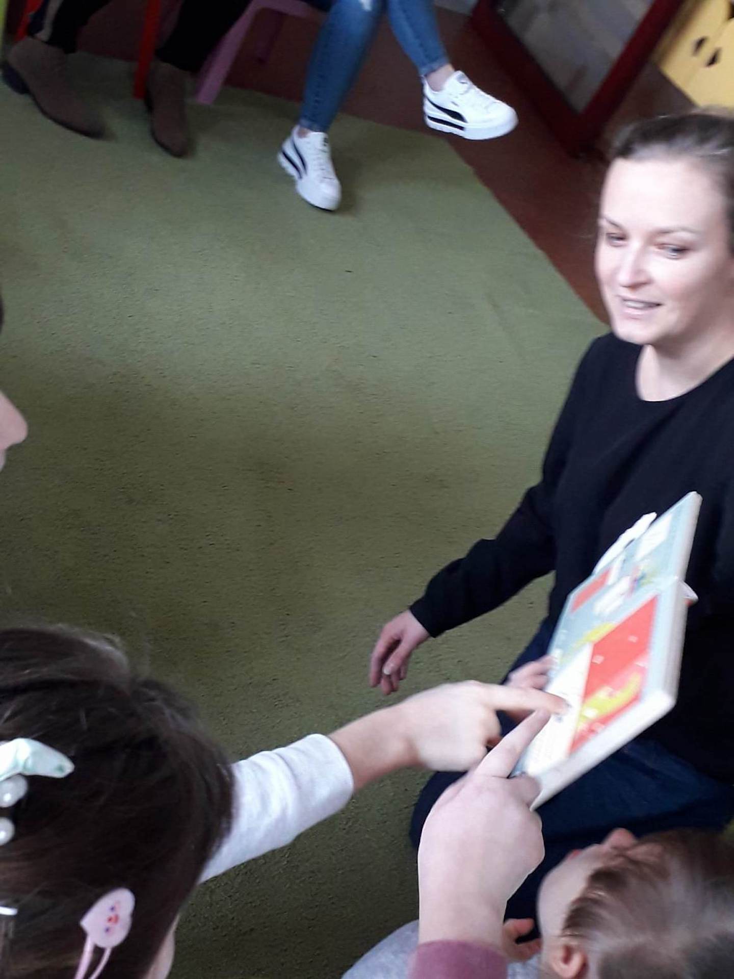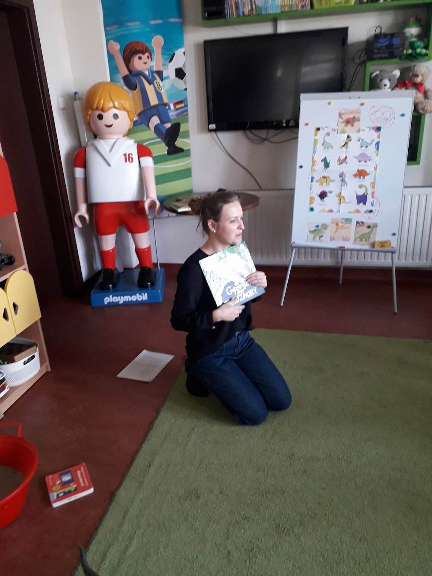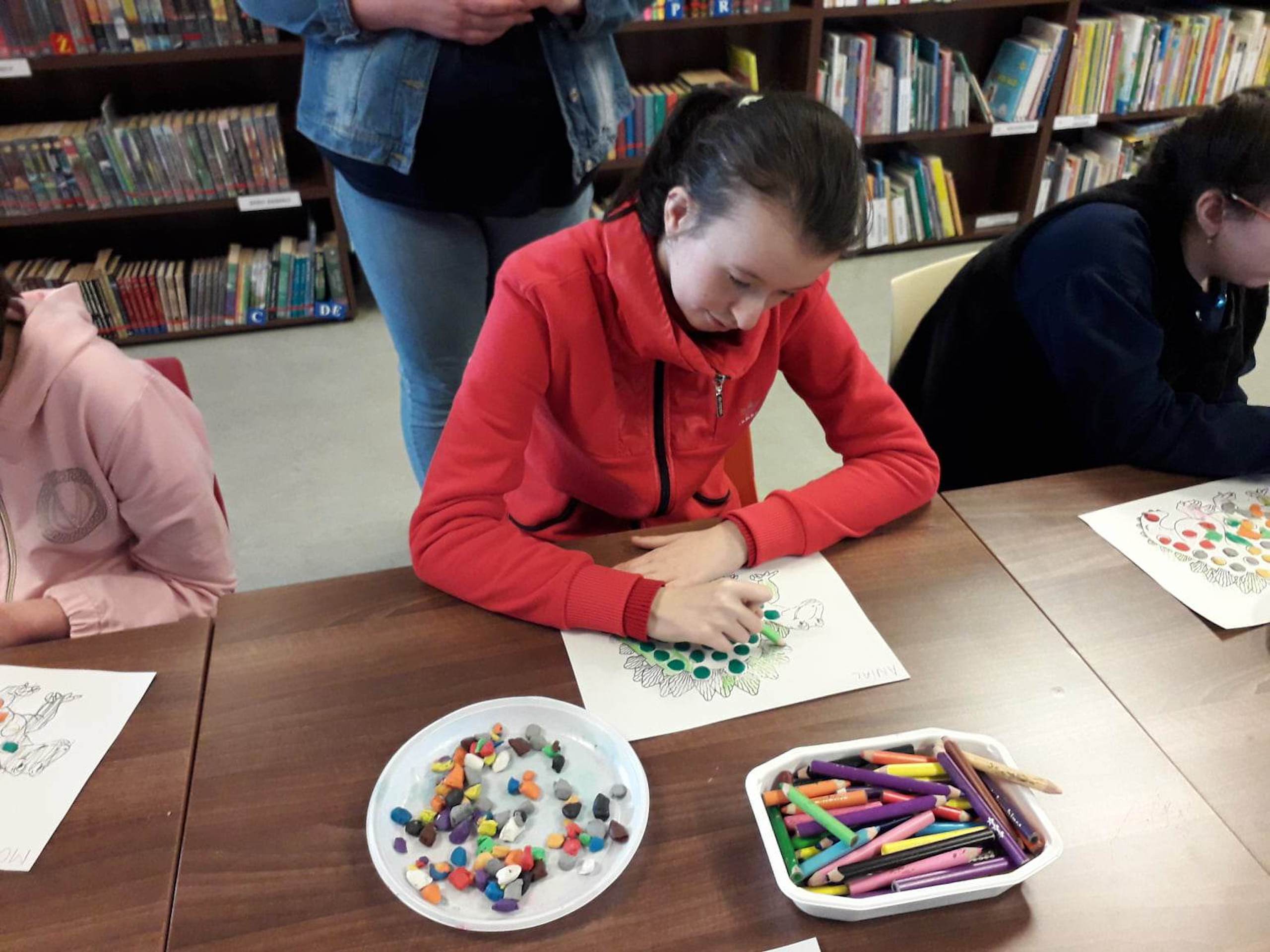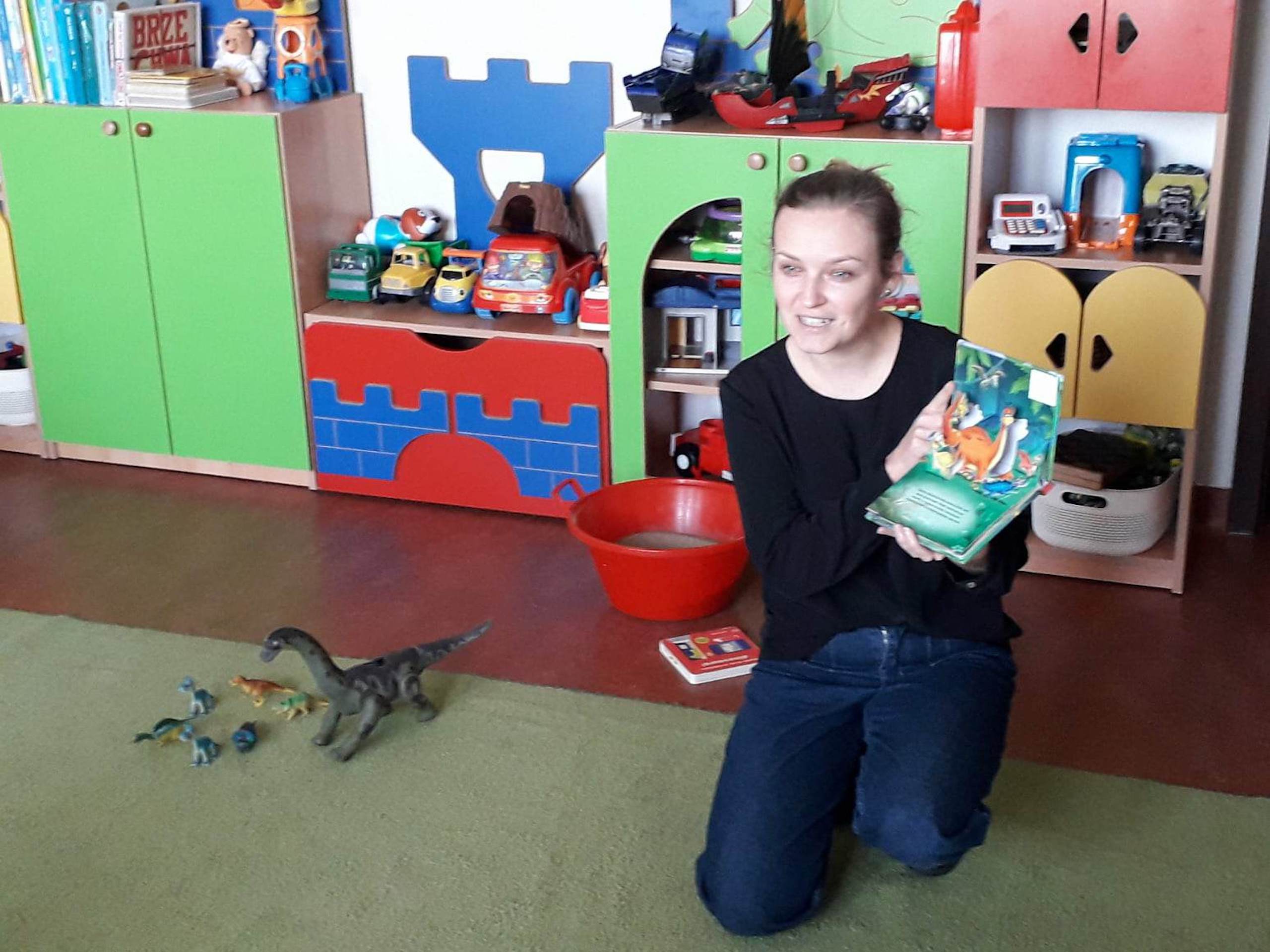 Podczas lutowego „Spotkania z książką” uczniowie zapoznali się z pozycjami książkowymi opowiadającymi o życiu dinozaurów. Najpierw zamienili się w archeologów i wykopywali z piasku dinozaury, poznając ich trudne nazwy. Potem odgadywali zagadki o dinozaurach, naśladując ich charakterystyczne cechy, a następnie wykonywali ćwiczenia logopedyczne podane przez dinozaury oraz zrobili masażyk dinozaura. Na koniec wszyscy uczniowie wykonali pracę plastyczną „Kropkowy dinozaur”