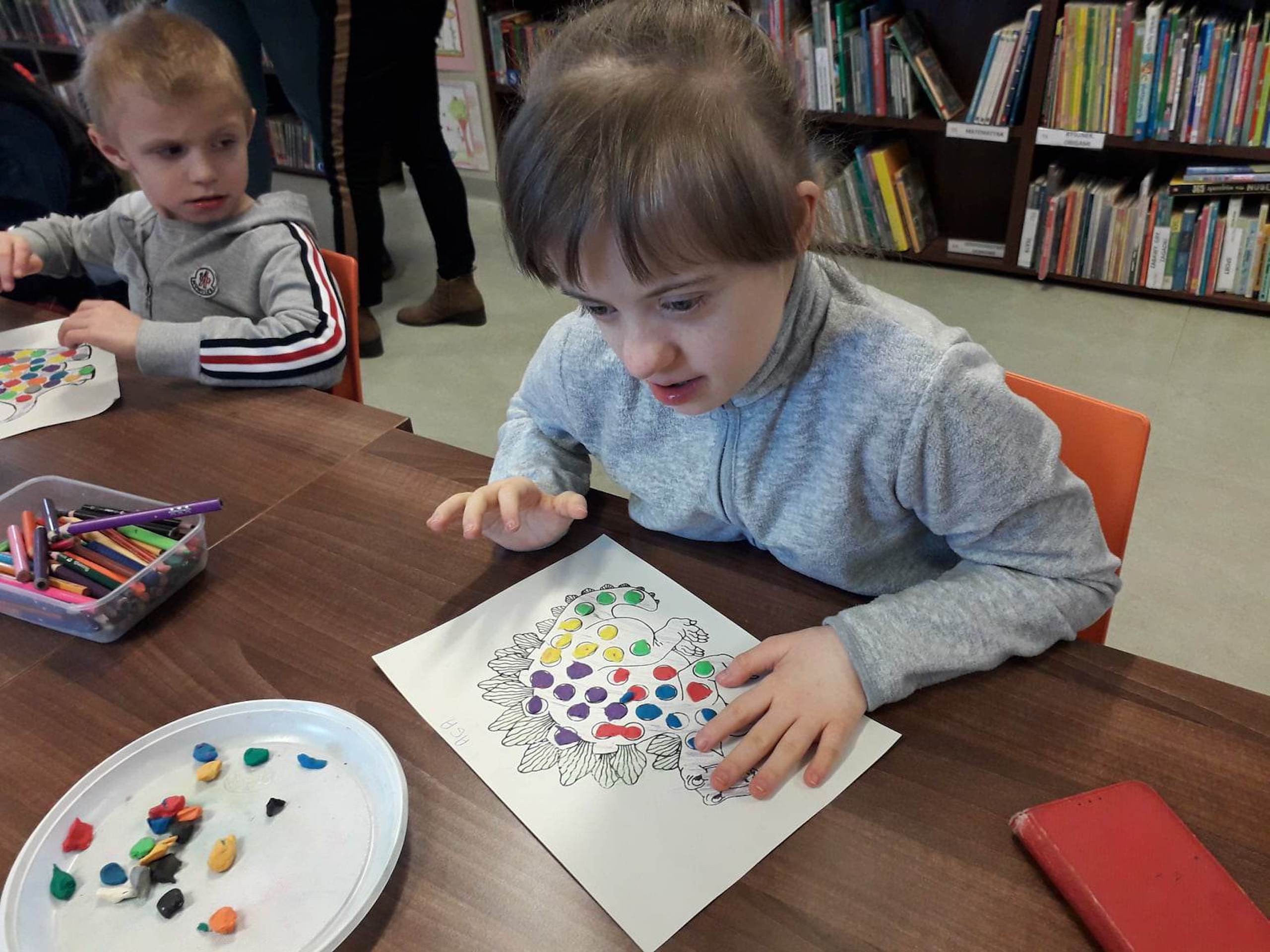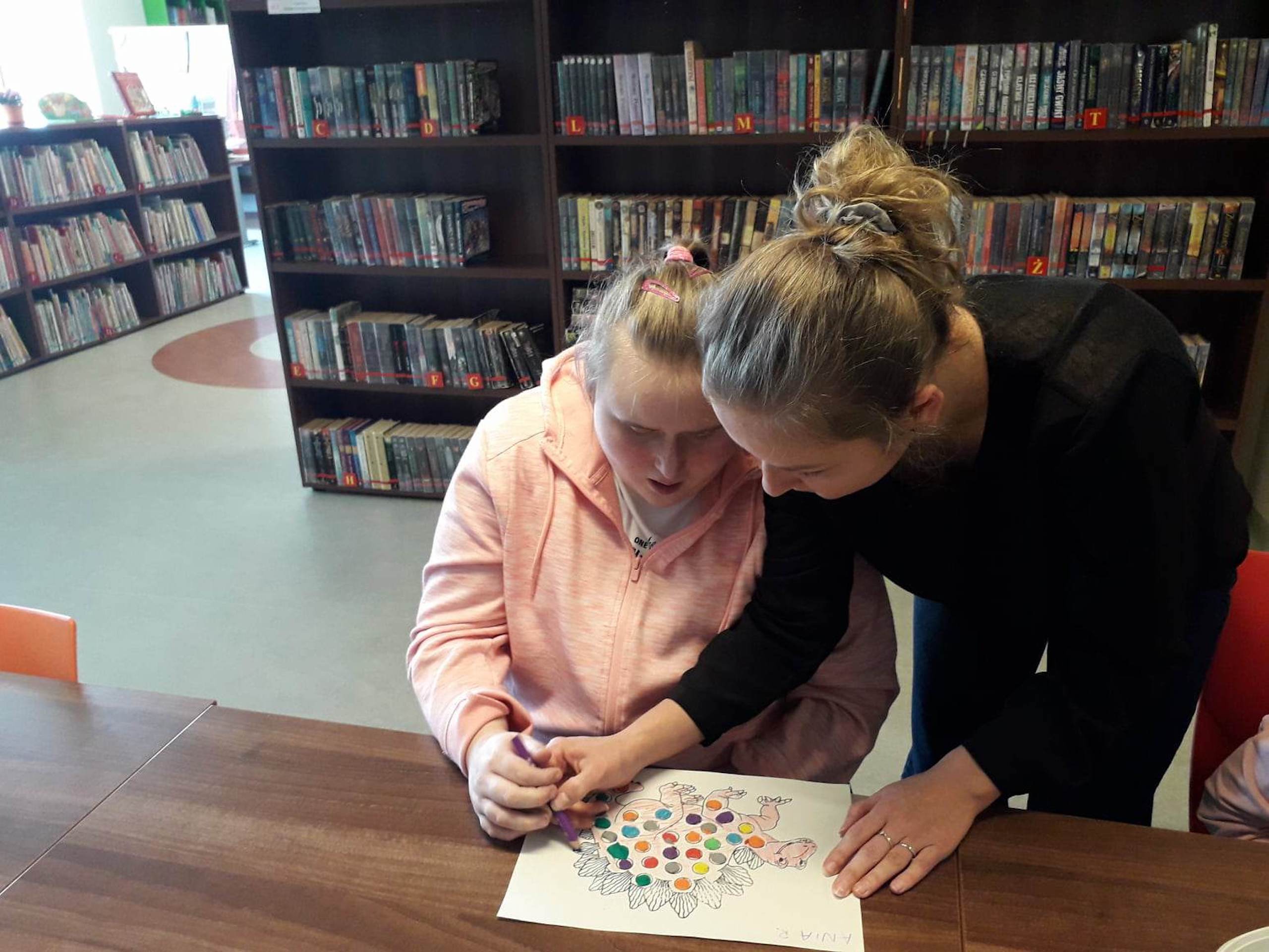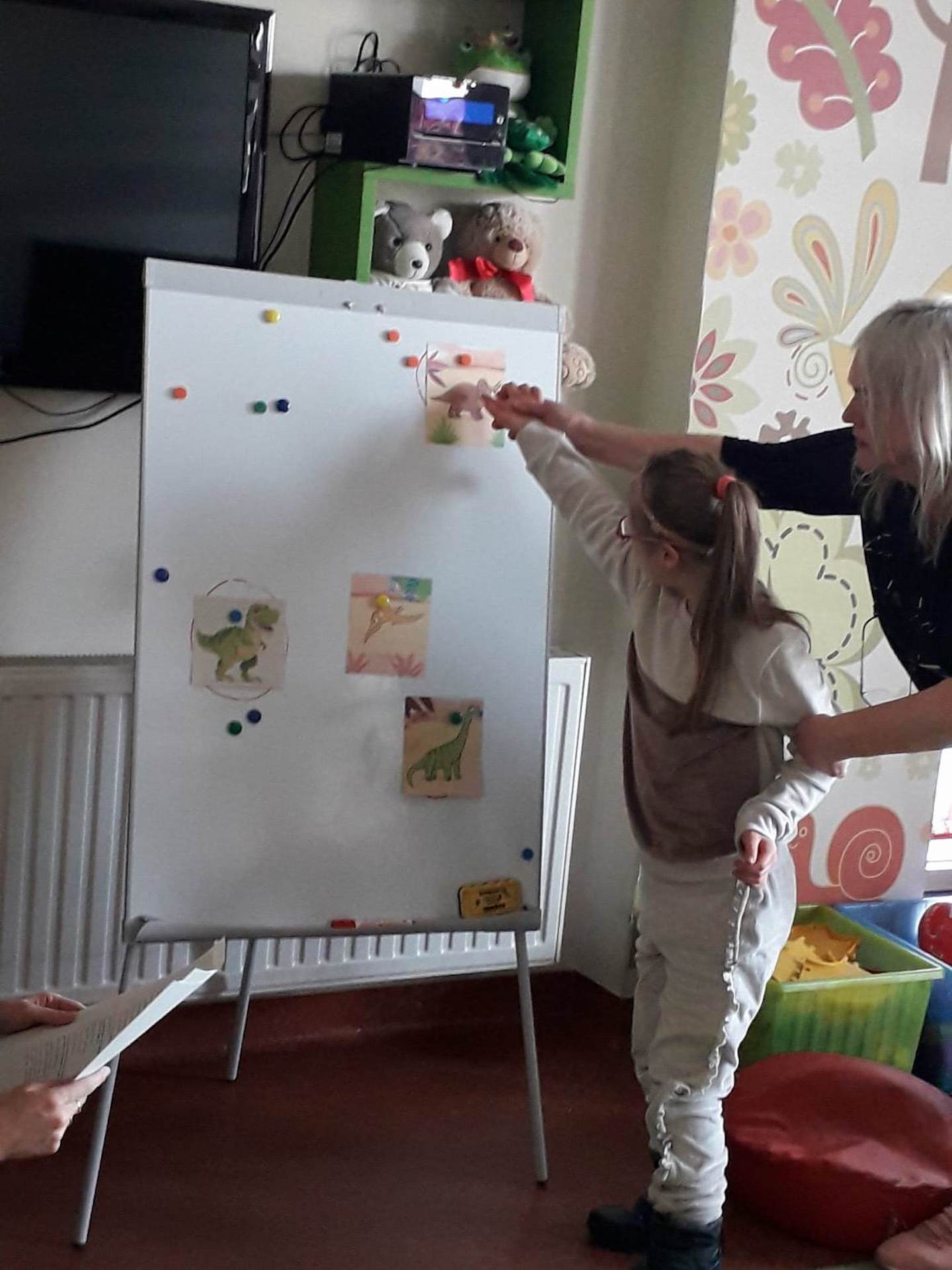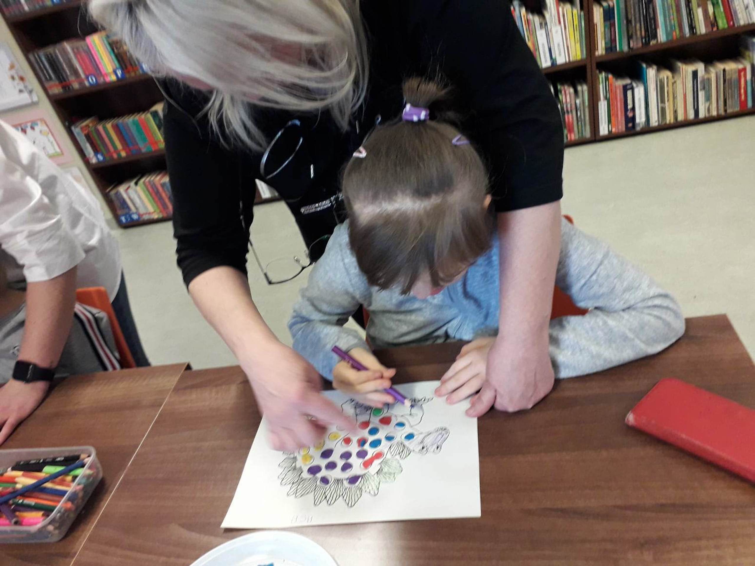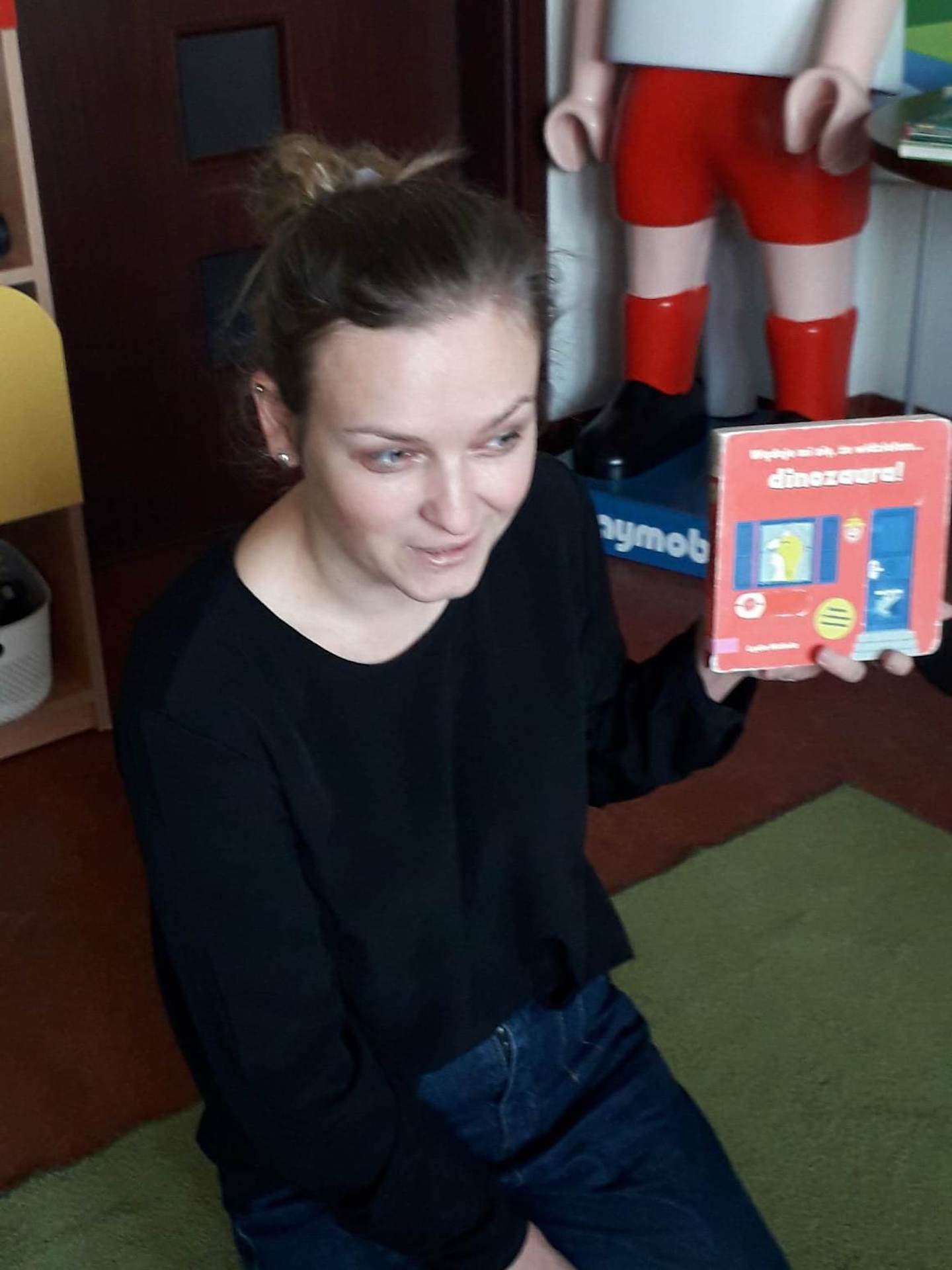 Podczas lutowego „Spotkania z książką” uczniowie zapoznali się z pozycjami książkowymi opowiadającymi o życiu dinozaurów. Najpierw zamienili się w archeologów i wykopywali z piasku dinozaury, poznając ich trudne nazwy. Potem odgadywali zagadki o dinozaurach, naśladując ich charakterystyczne cechy, a następnie wykonywali ćwiczenia logopedyczne podane przez dinozaury oraz zrobili masażyk dinozaura. Na koniec wszyscy uczniowie wykonali pracę plastyczną „Kropkowy dinozaur”