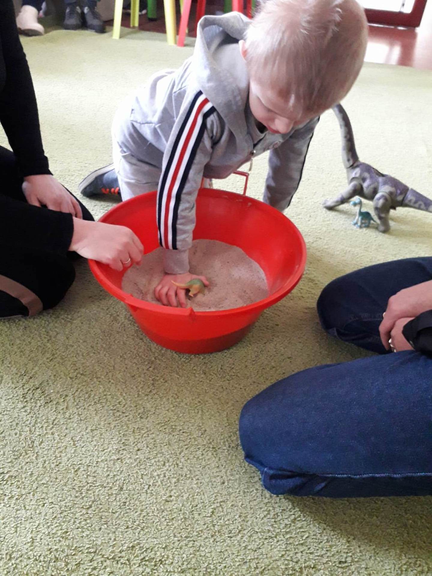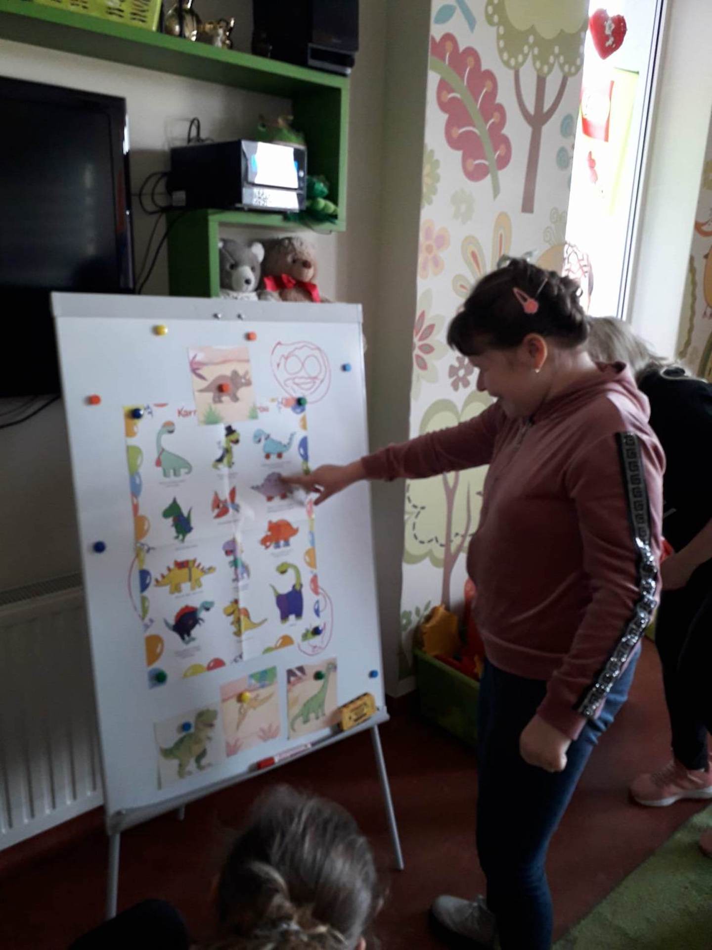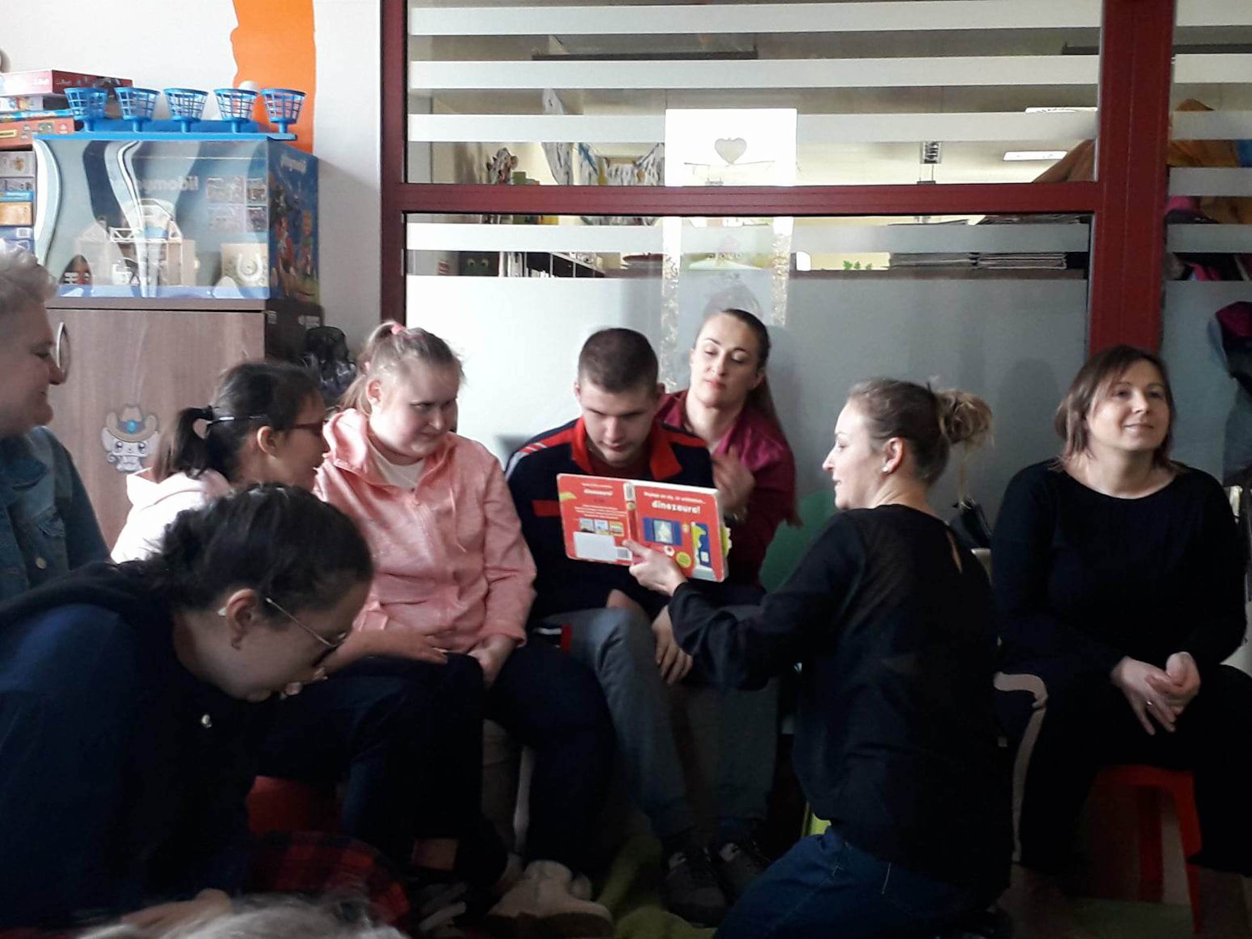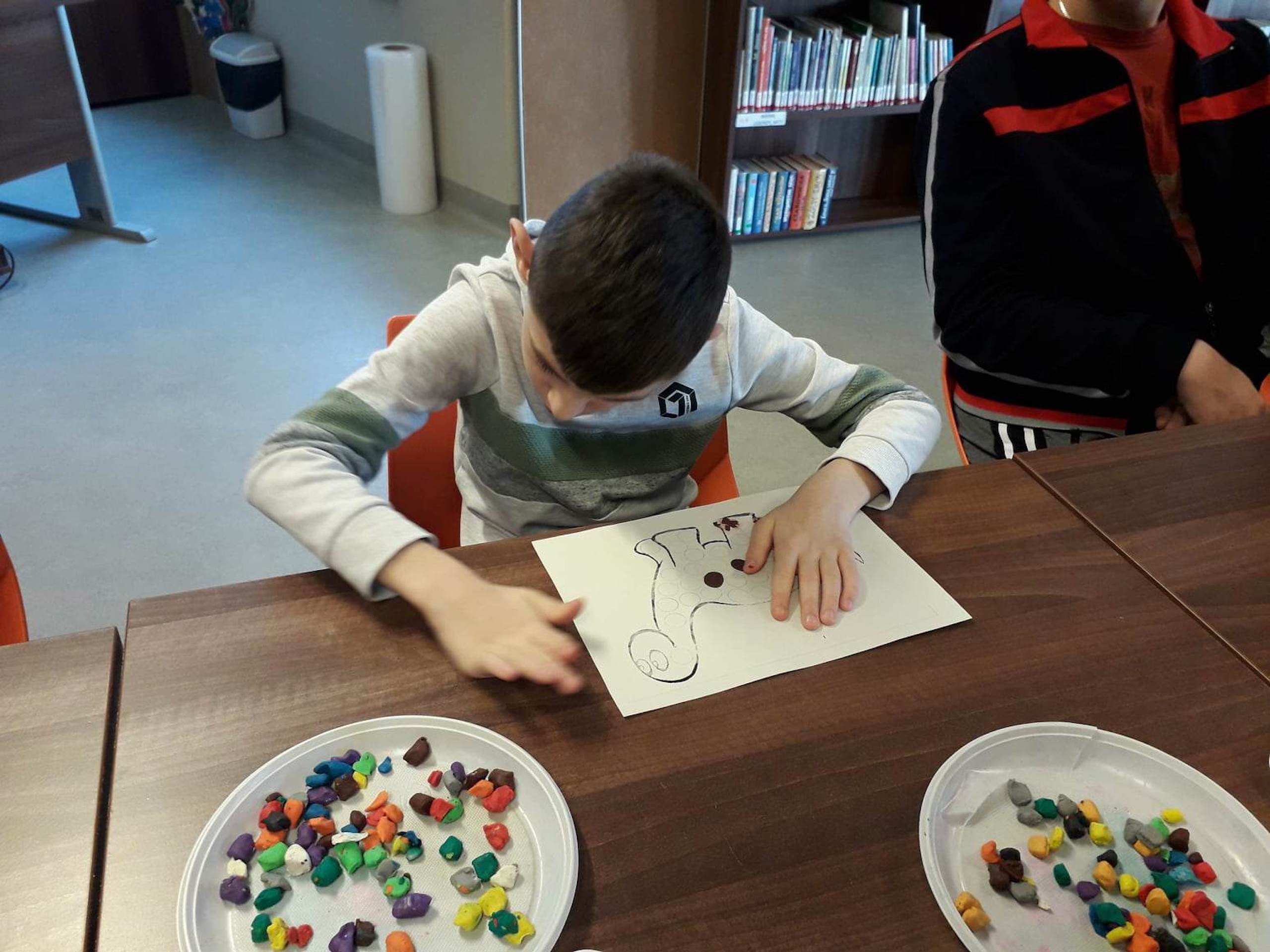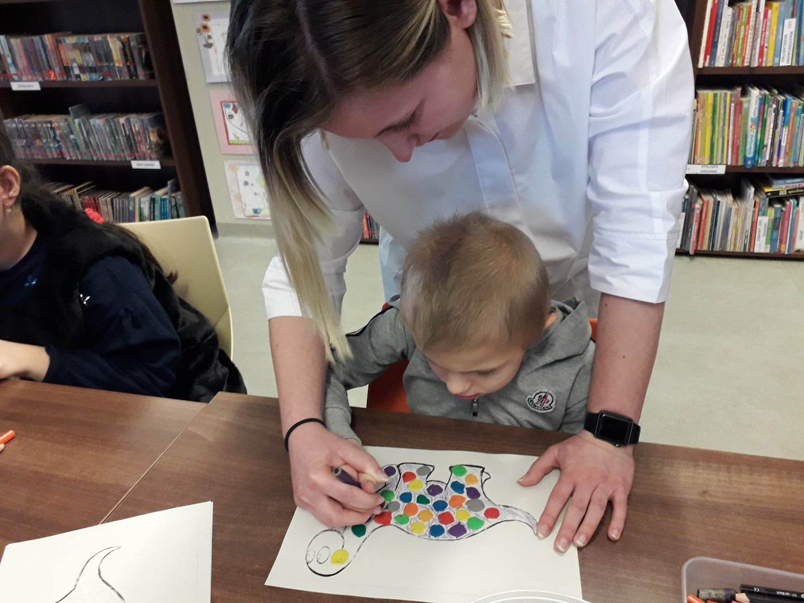 Podczas lutowego „Spotkania z książką” uczniowie zapoznali się z pozycjami książkowymi opowiadającymi o życiu dinozaurów. Najpierw zamienili się w archeologów i wykopywali z piasku dinozaury, poznając ich trudne nazwy. Potem odgadywali zagadki o dinozaurach, naśladując ich charakterystyczne cechy, a następnie wykonywali ćwiczenia logopedyczne podane przez dinozaury oraz zrobili masażyk dinozaura. Na koniec wszyscy uczniowie wykonali pracę plastyczną „Kropkowy dinozaur”