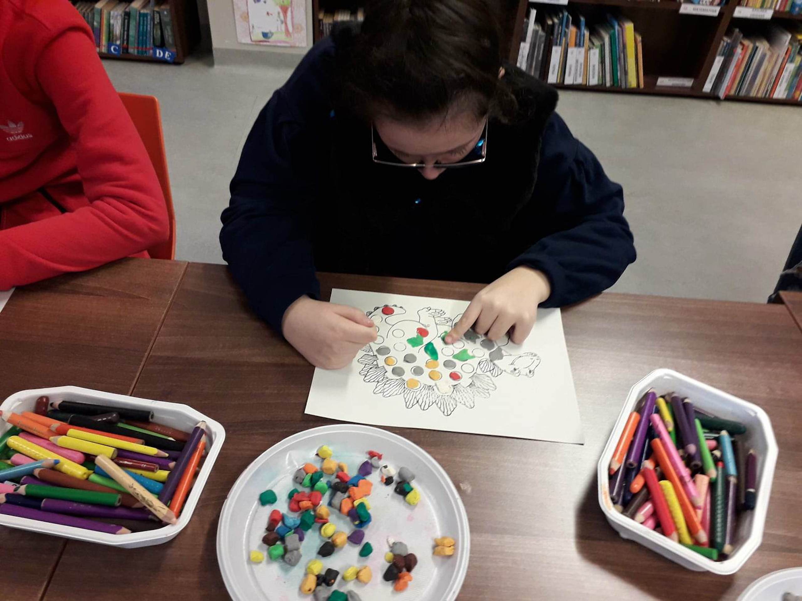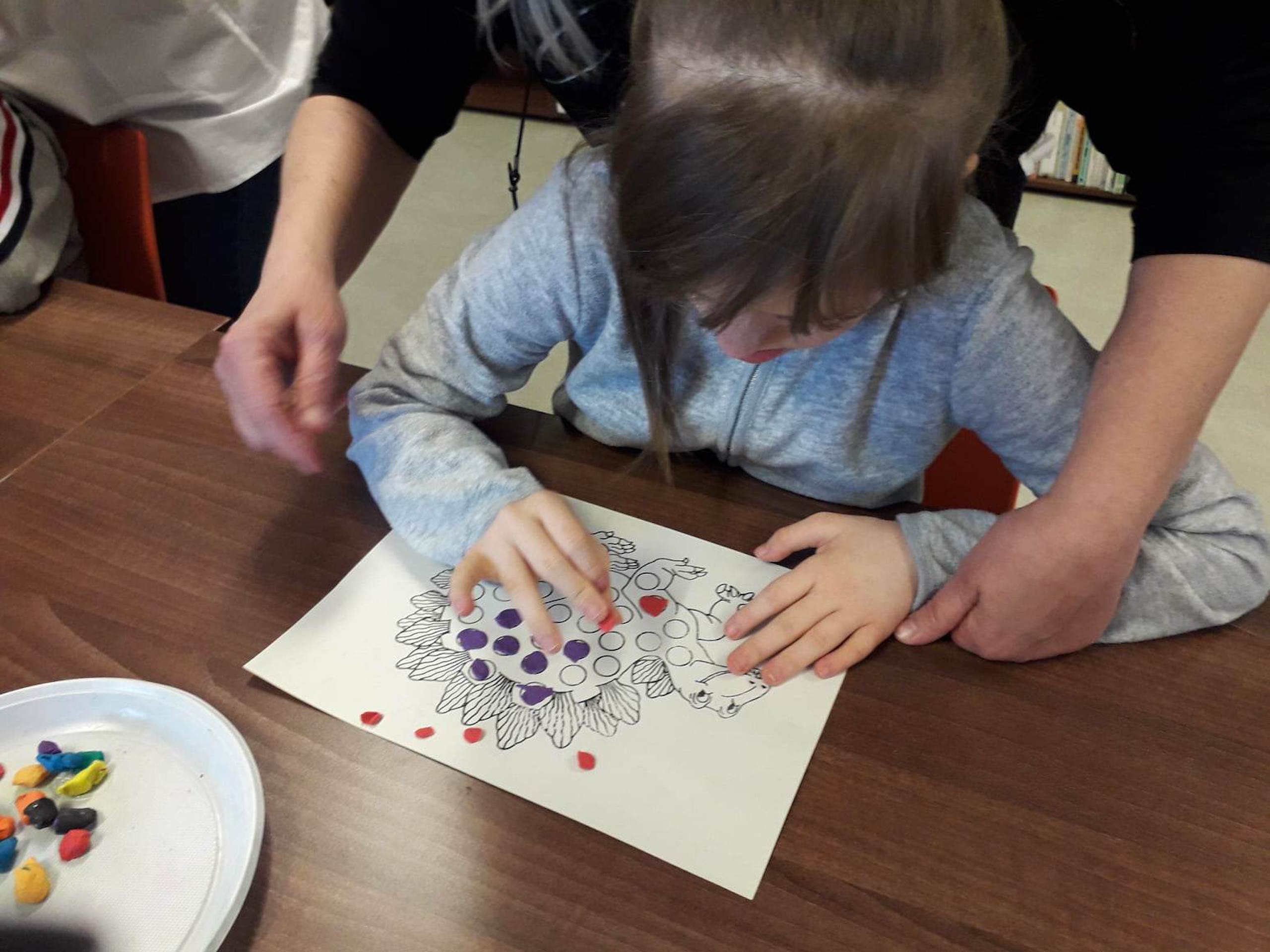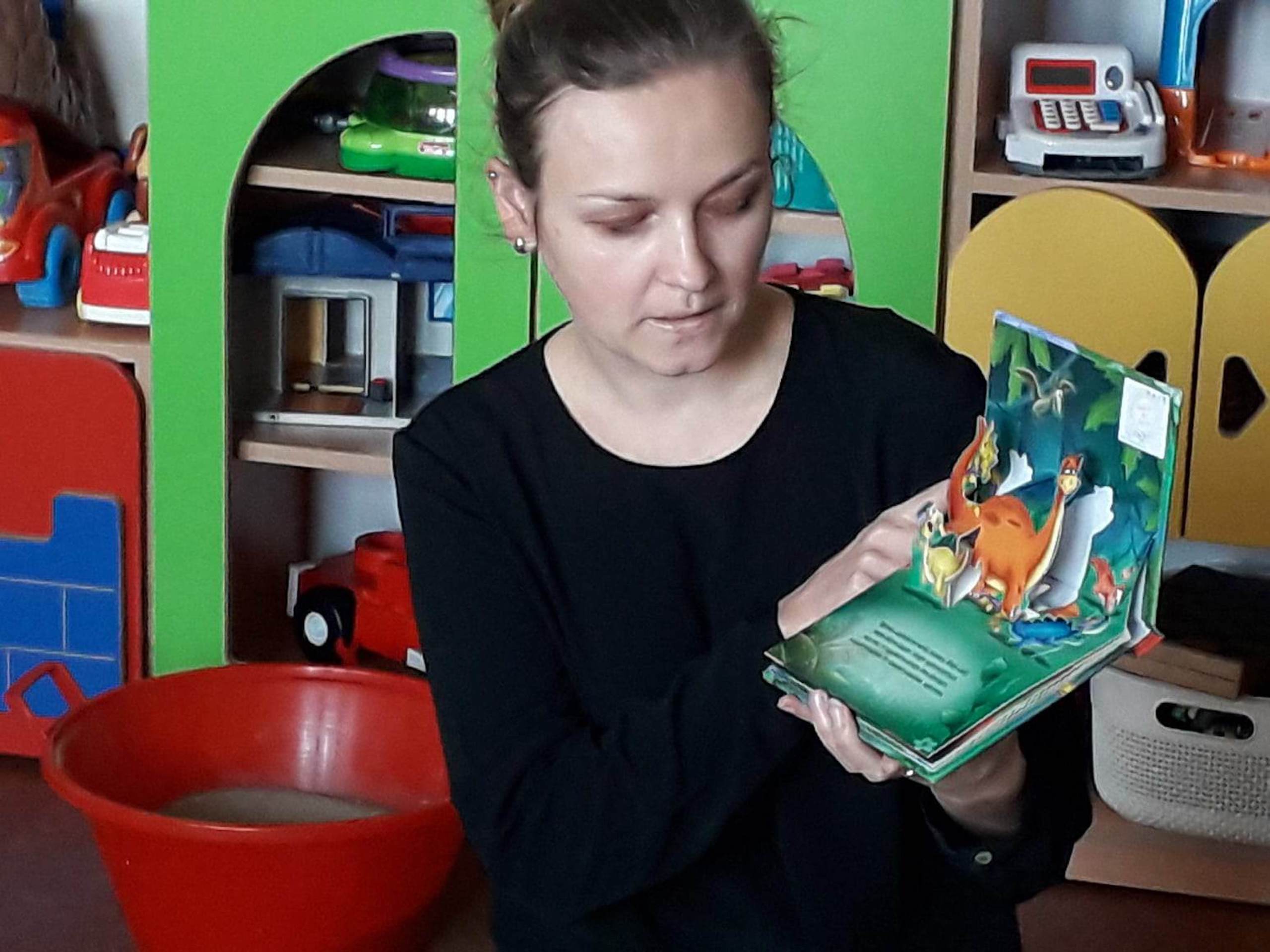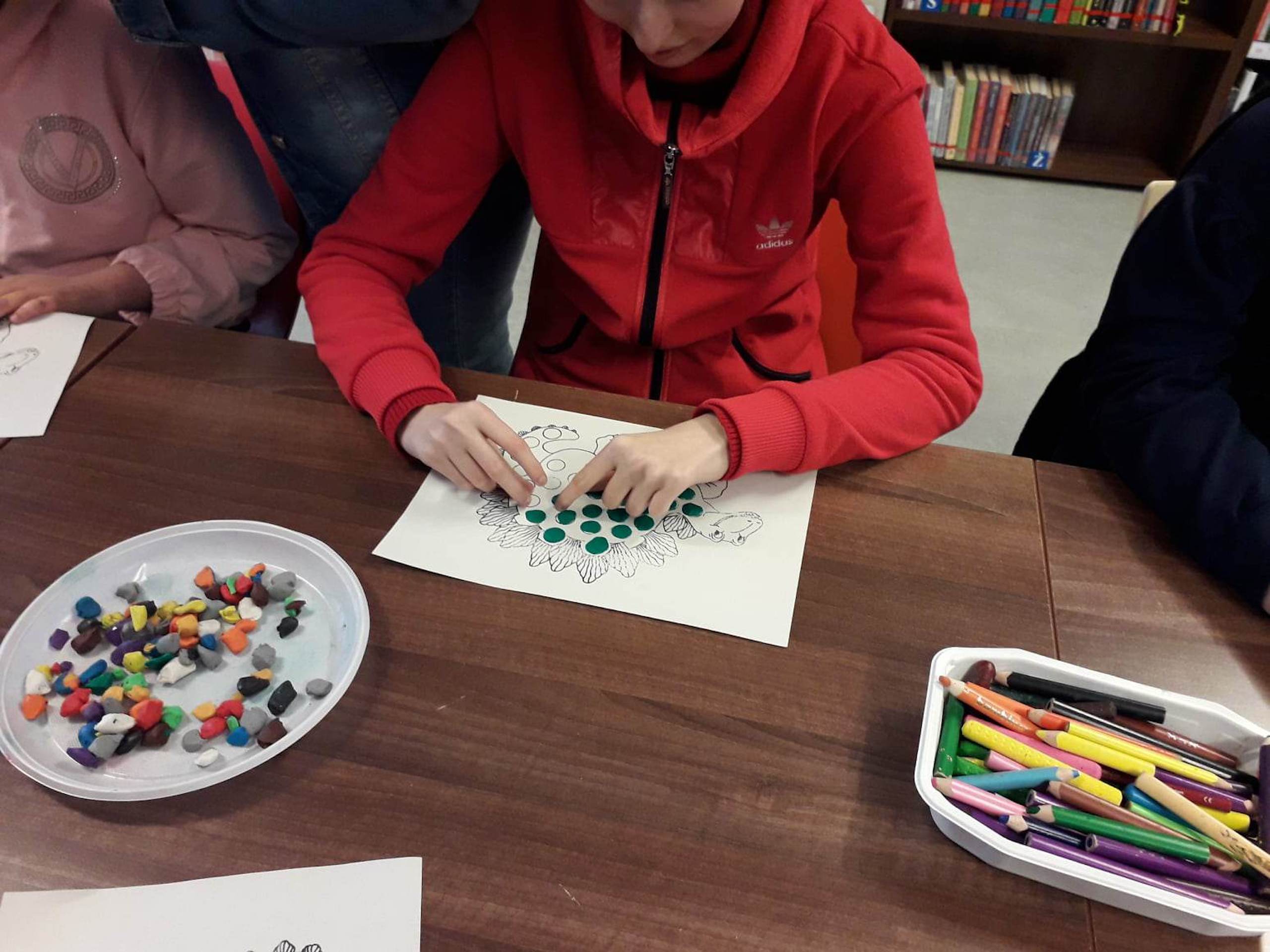 Podczas lutowego „Spotkania z książką” uczniowie zapoznali się z pozycjami książkowymi opowiadającymi o życiu dinozaurów. Najpierw zamienili się w archeologów i wykopywali z piasku dinozaury, poznając ich trudne nazwy. Potem odgadywali zagadki o dinozaurach, naśladując ich charakterystyczne cechy, a następnie wykonywali ćwiczenia logopedyczne podane przez dinozaury oraz zrobili masażyk dinozaura. Na koniec wszyscy uczniowie wykonali pracę plastyczną „Kropkowy dinozaur”