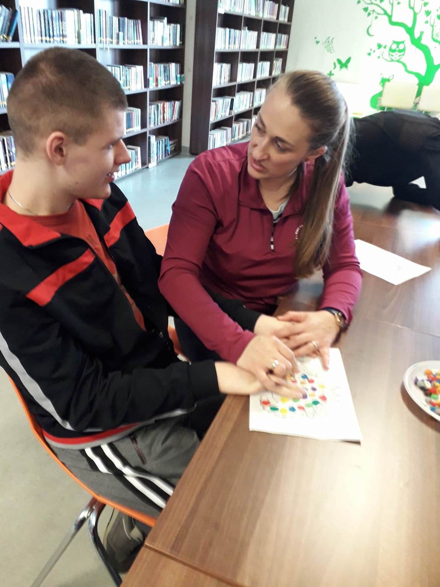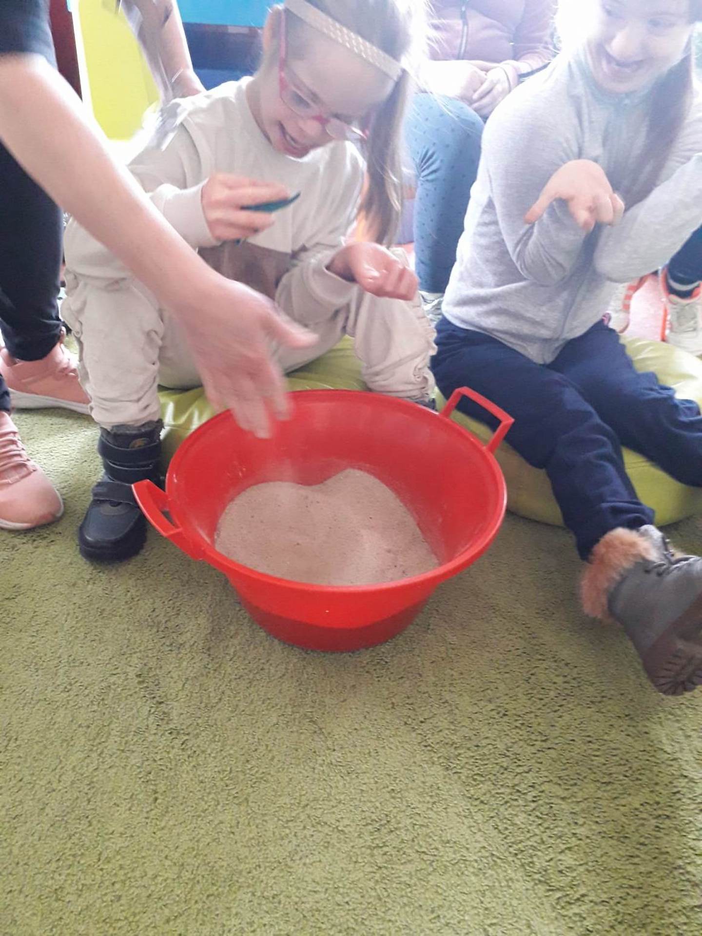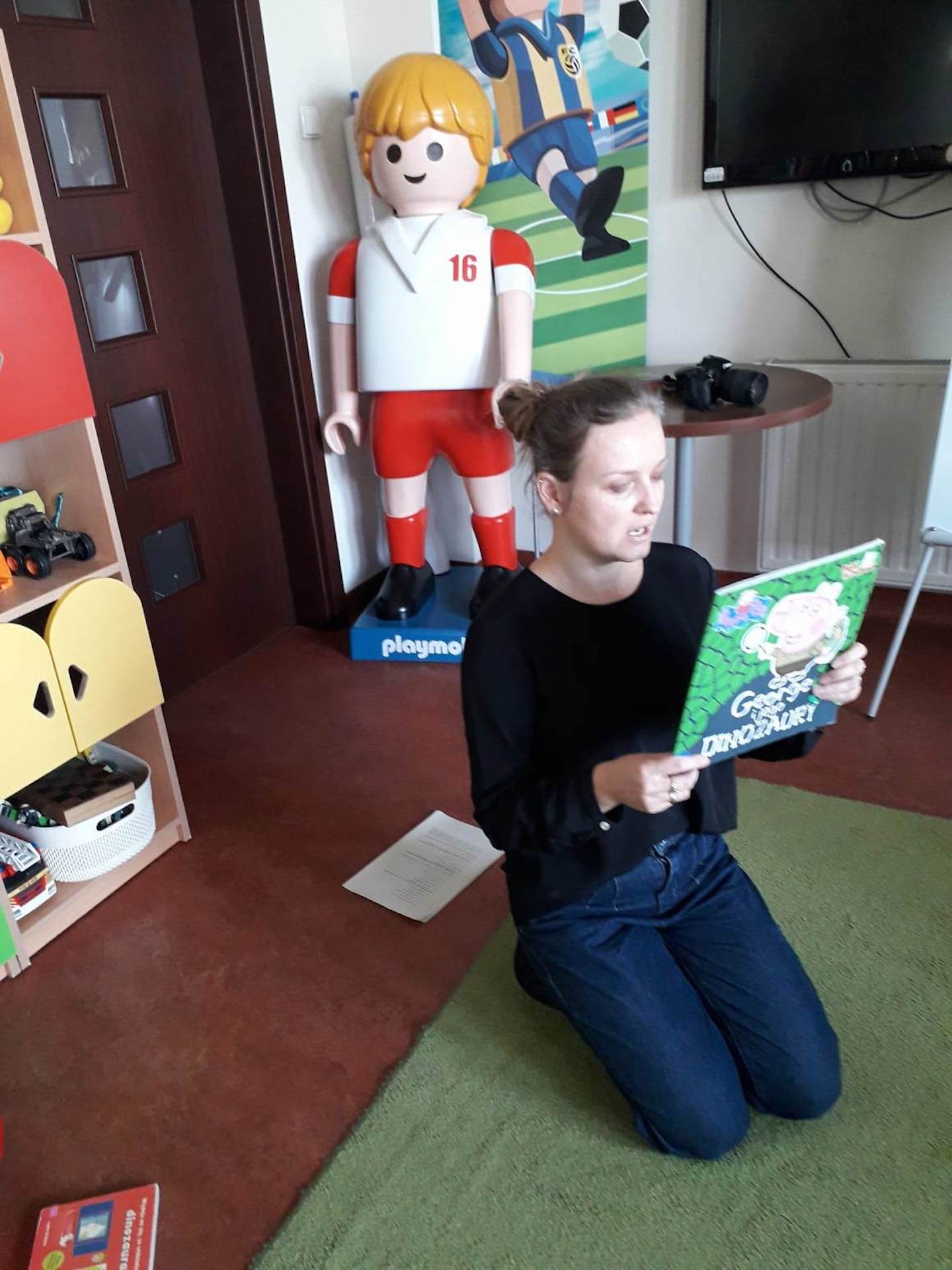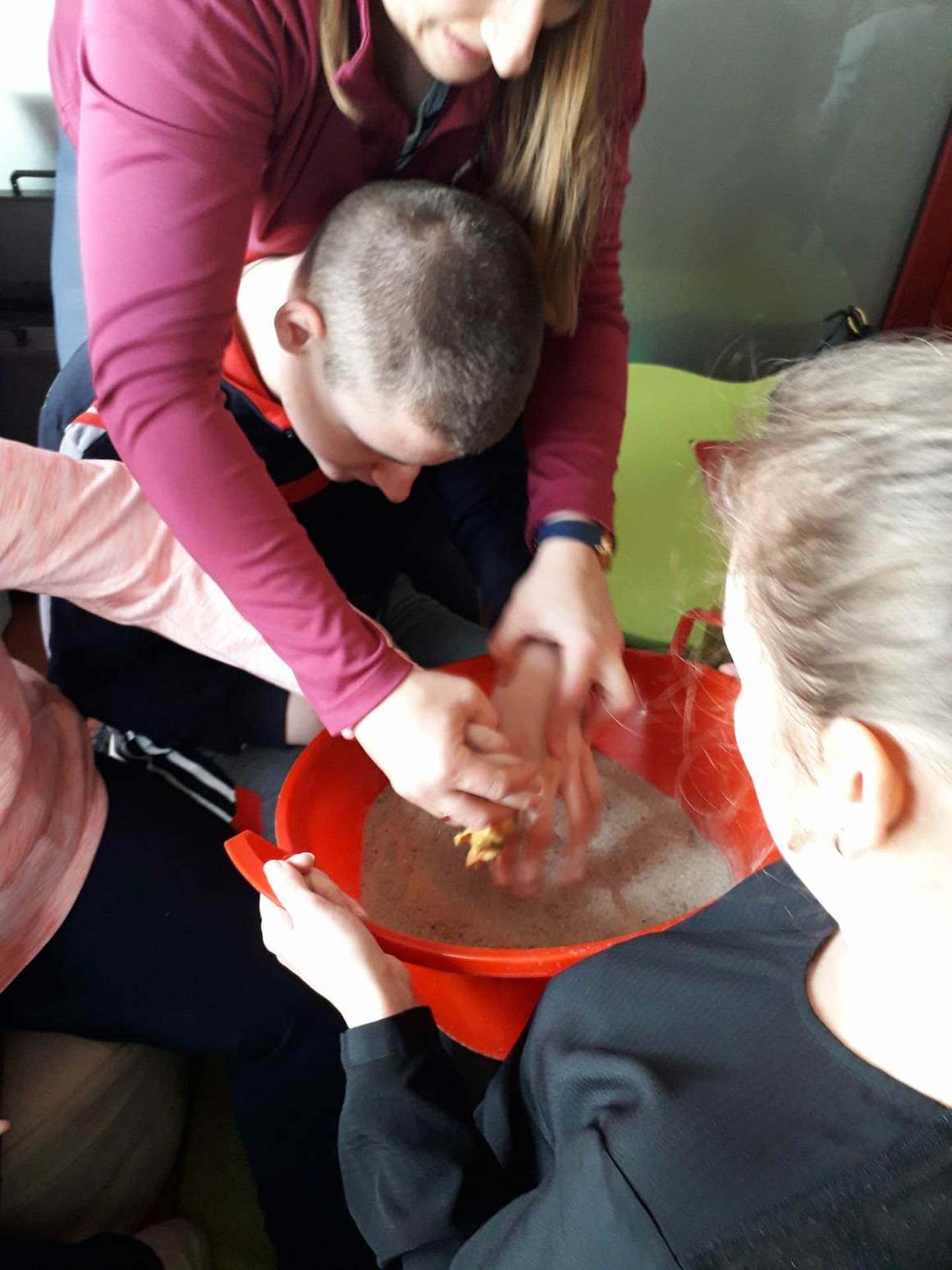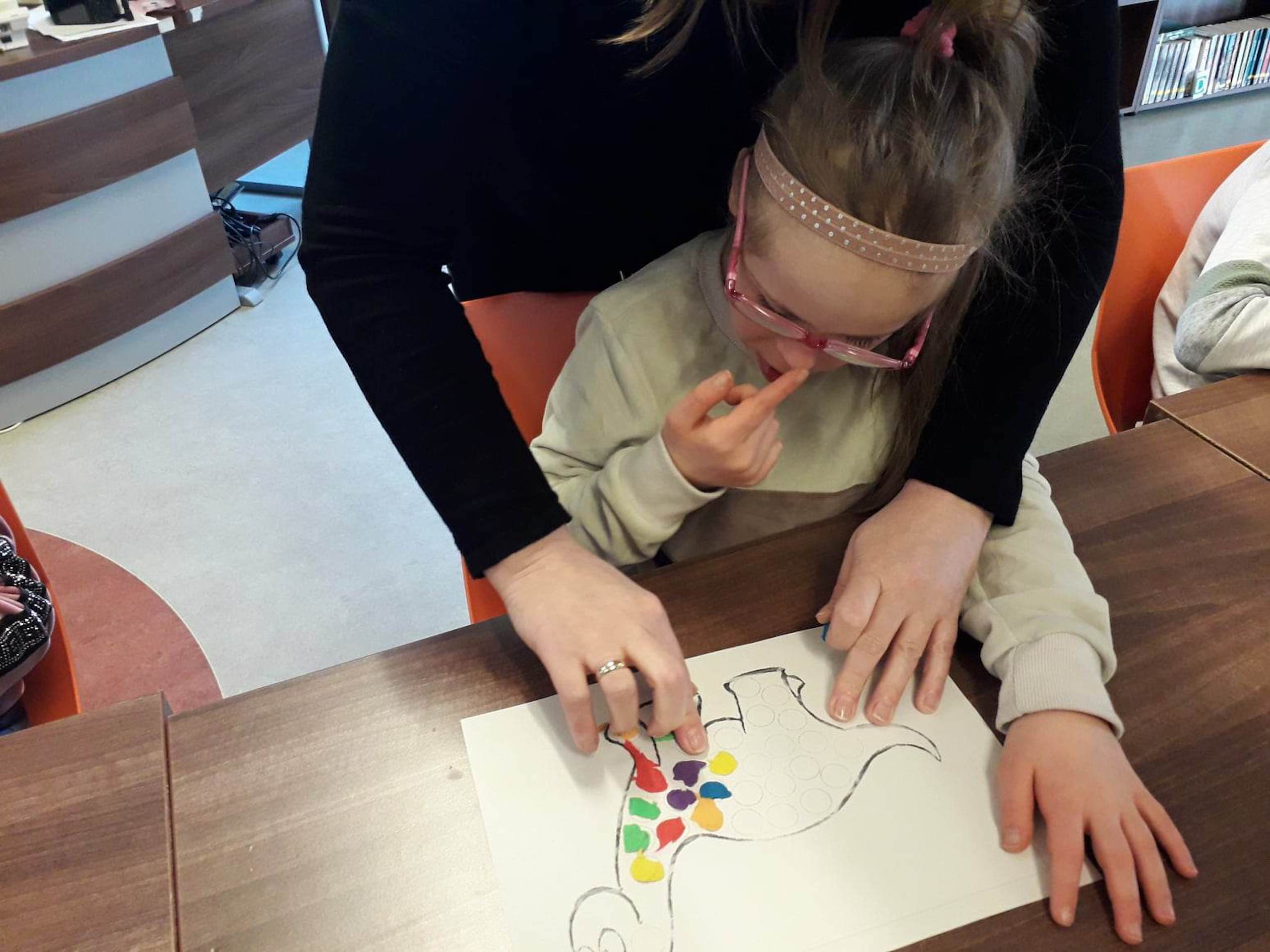 Podczas lutowego „Spotkania z książką” uczniowie zapoznali się z pozycjami książkowymi opowiadającymi o życiu dinozaurów. Najpierw zamienili się w archeologów i wykopywali z piasku dinozaury, poznając ich trudne nazwy. Potem odgadywali zagadki o dinozaurach, naśladując ich charakterystyczne cechy, a następnie wykonywali ćwiczenia logopedyczne podane przez dinozaury oraz zrobili masażyk dinozaura. Na koniec wszyscy uczniowie wykonali pracę plastyczną „Kropkowy dinozaur”