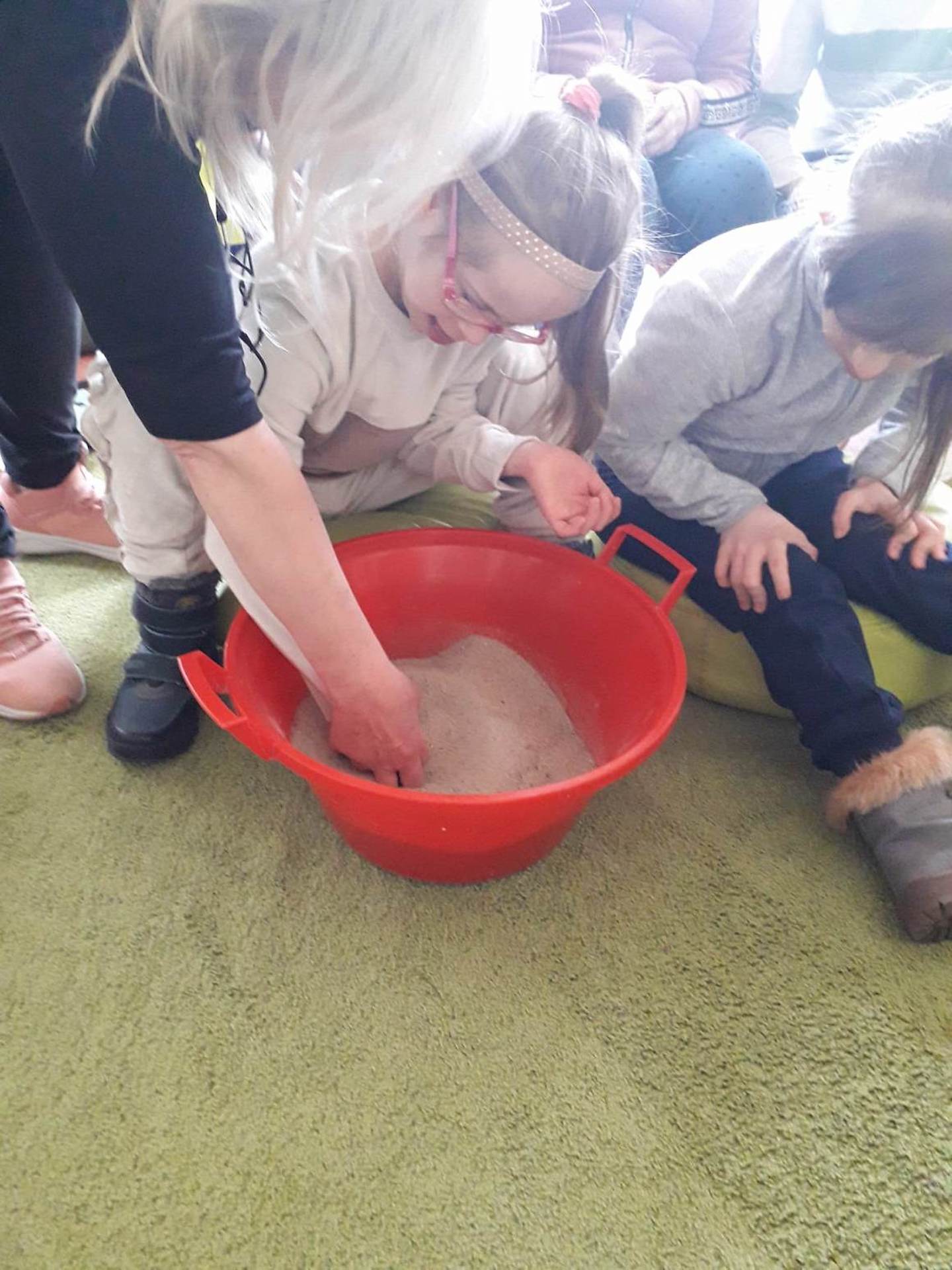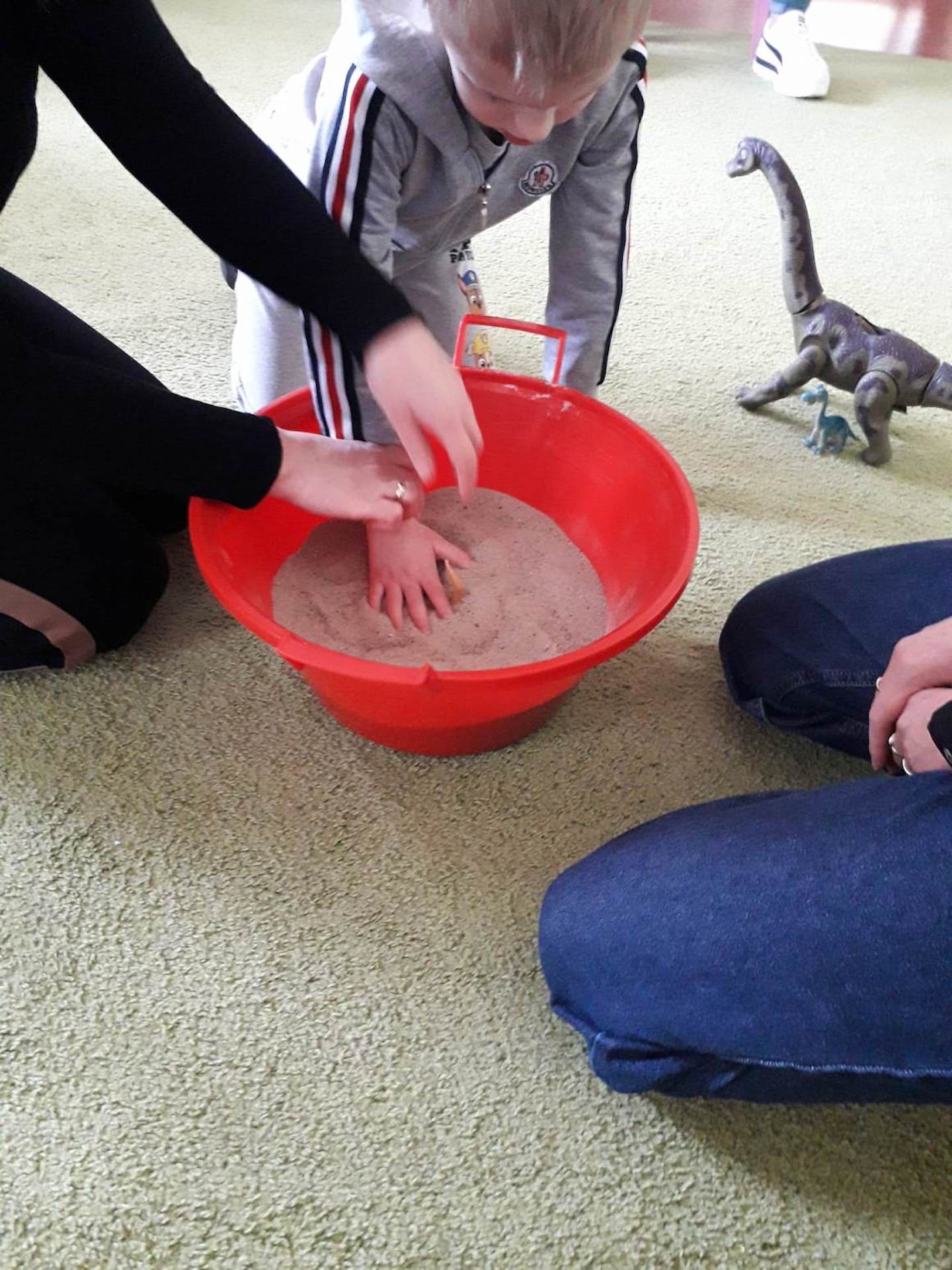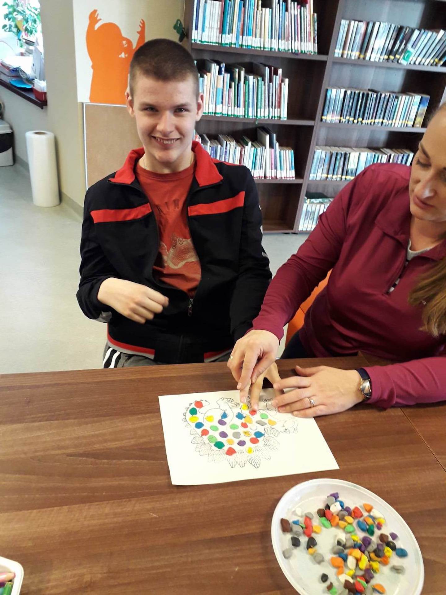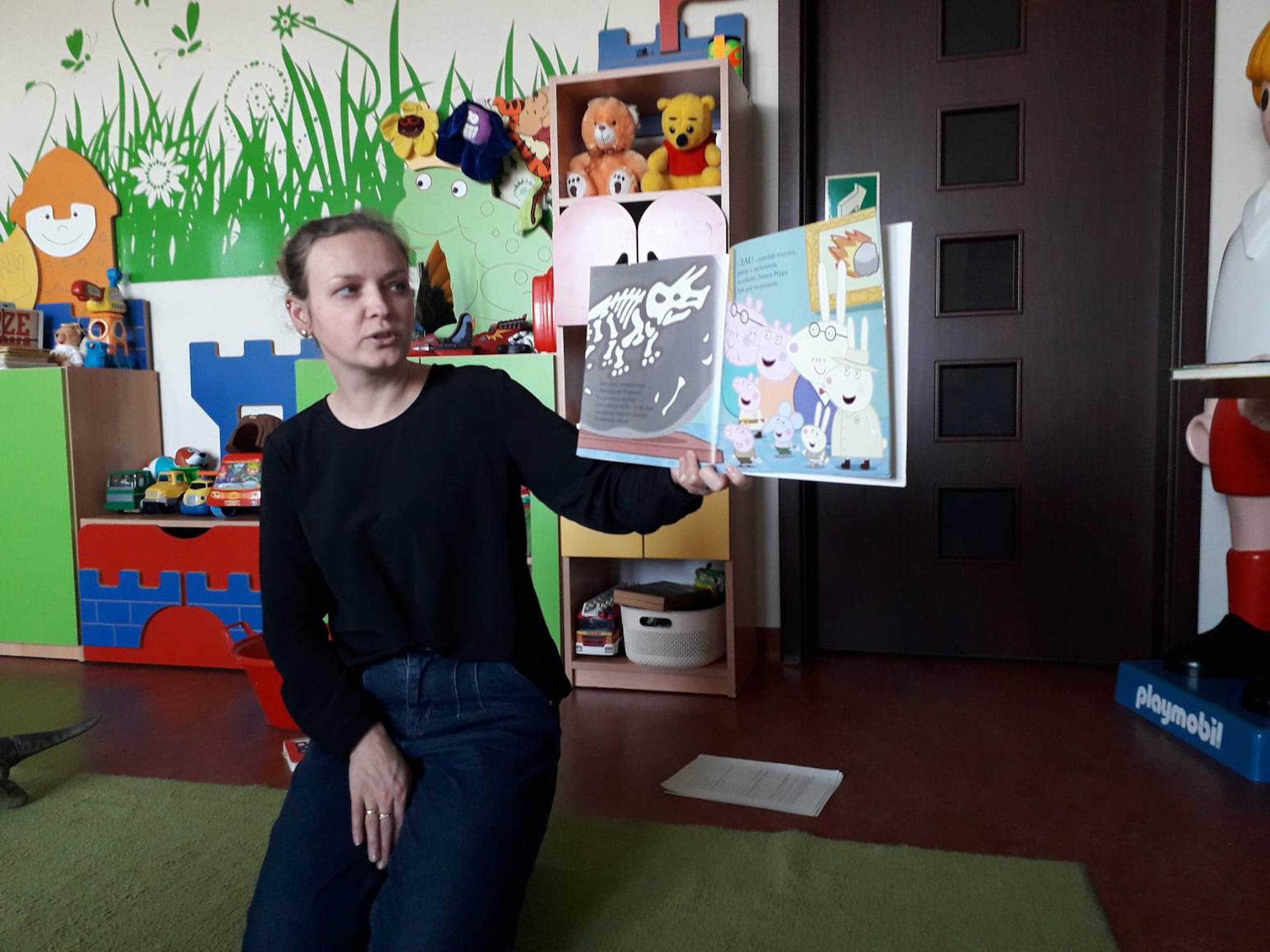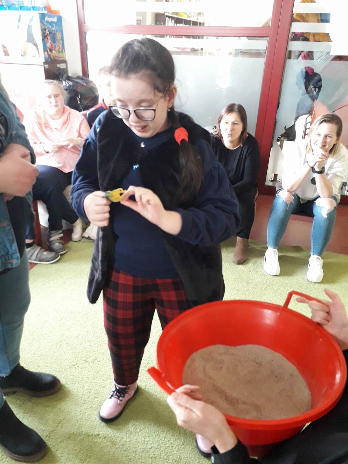 Podczas lutowego „Spotkania z książką” uczniowie zapoznali się z pozycjami książkowymi opowiadającymi o życiu dinozaurów. Najpierw zamienili się w archeologów i wykopywali z piasku dinozaury, poznając ich trudne nazwy. Potem odgadywali zagadki o dinozaurach, naśladując ich charakterystyczne cechy, a następnie wykonywali ćwiczenia logopedyczne podane przez dinozaury oraz zrobili masażyk dinozaura. Na koniec wszyscy uczniowie wykonali pracę plastyczną „Kropkowy dinozaur”