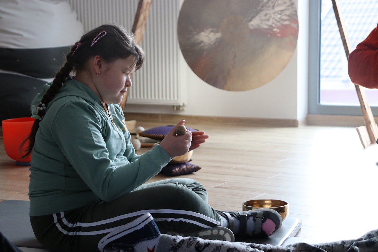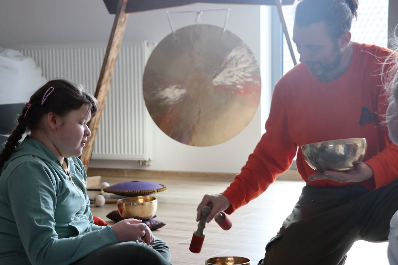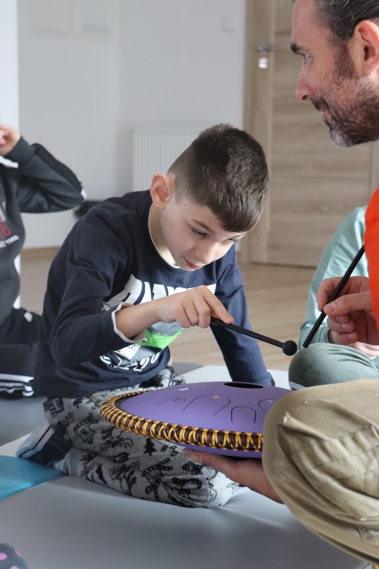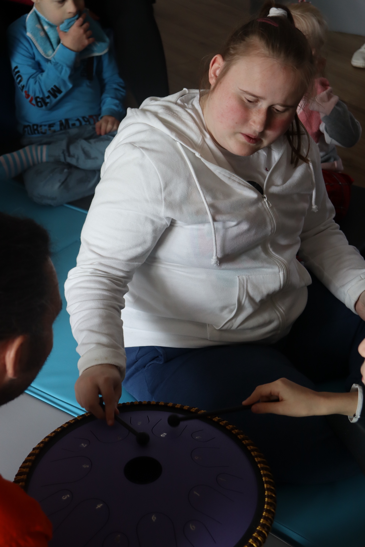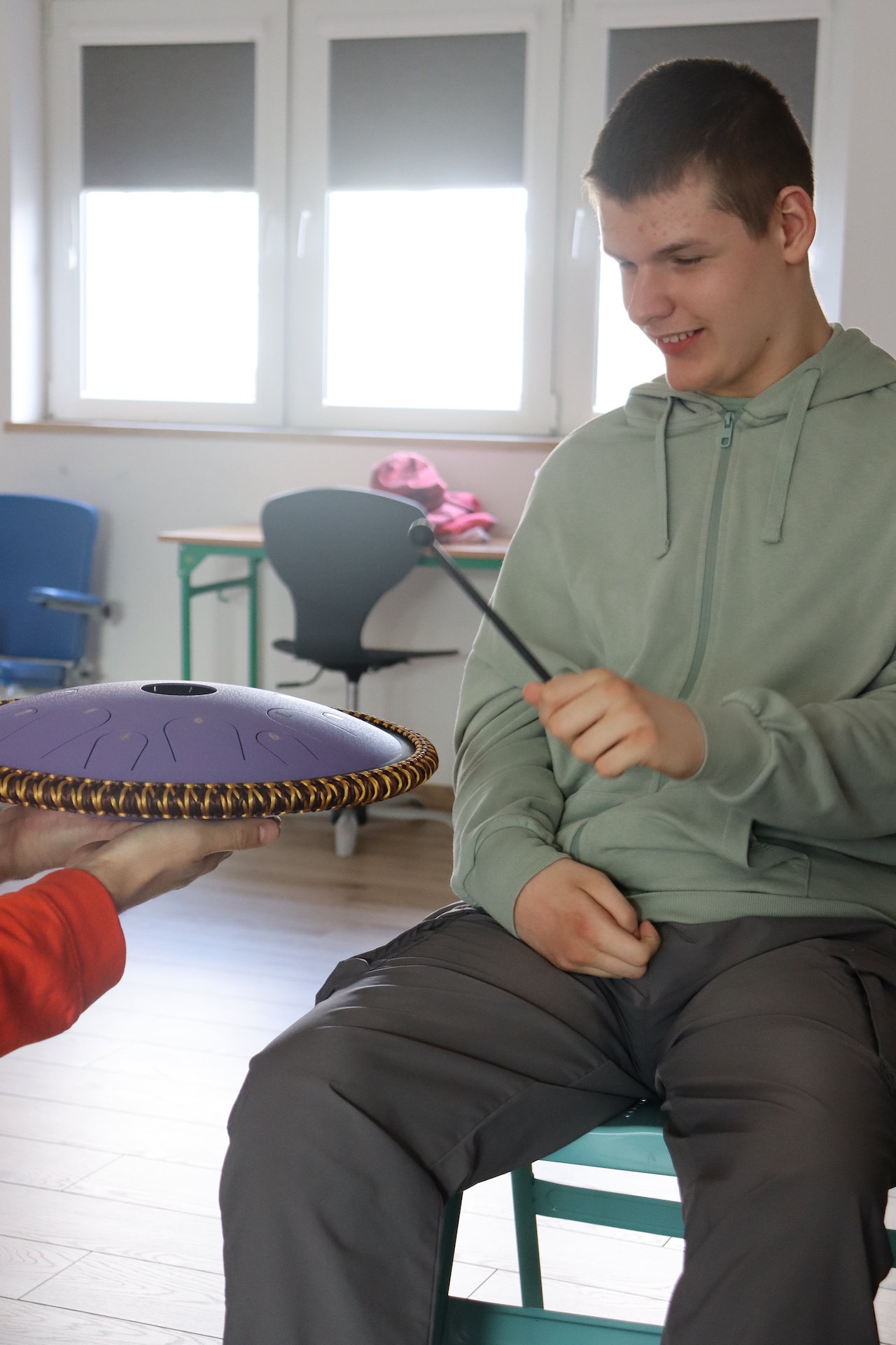 Podczas kwietniowych zajęć terapii dźwiękiem uczniowie naszej szkoły grali na misach tybetańskich i cymbałach. Praca z misami wyrabia zdolności manualne, poprawia koncentrację, uczy spokoju i opanowania, a także kształtuje systematyczność zachowań.