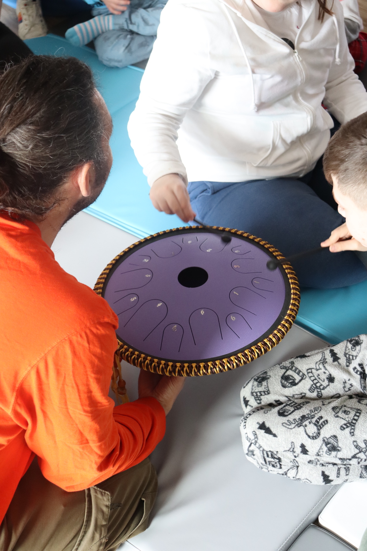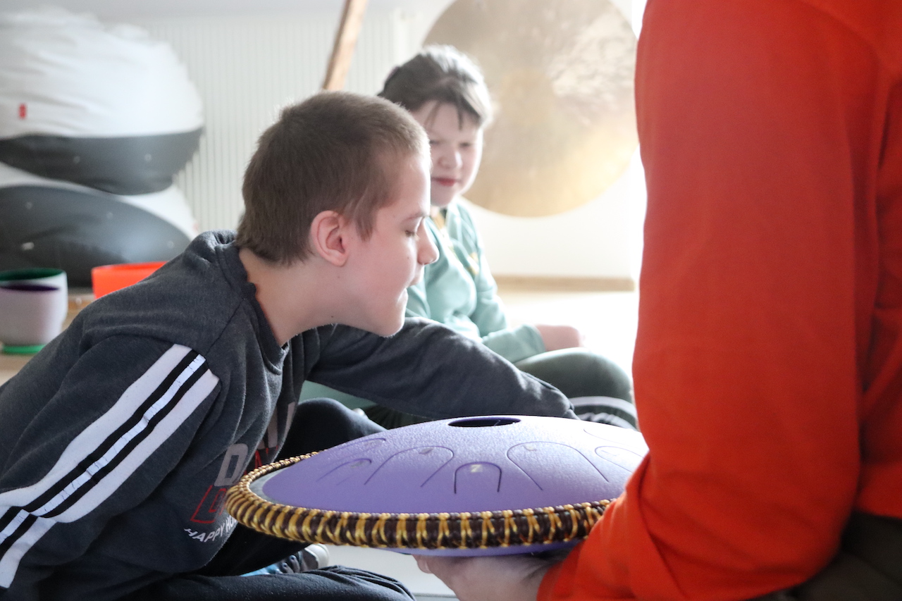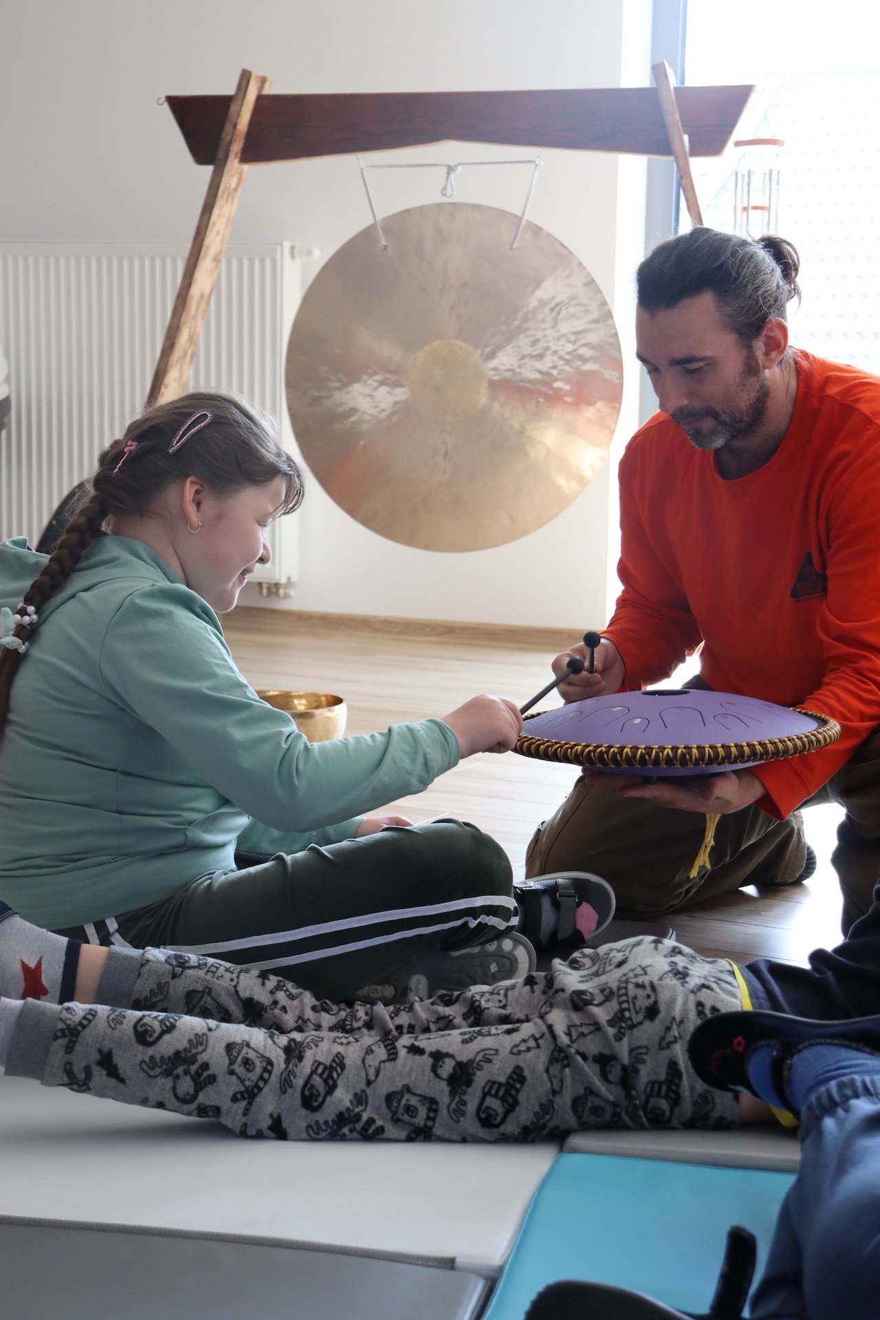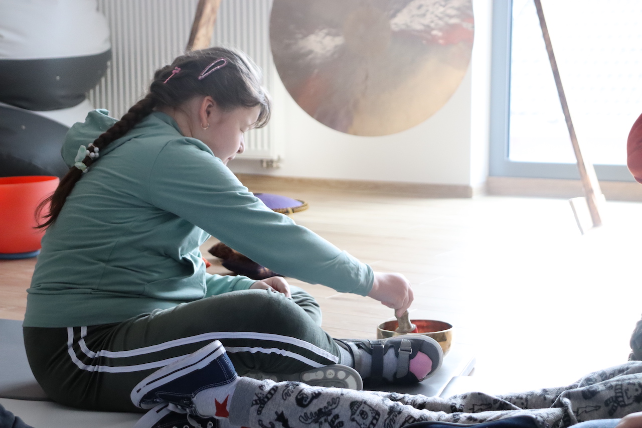Podczas kwietniowych zajęć terapii dźwiękiem uczniowie naszej szkoły grali na misach tybetańskich i cymbałach. Praca z misami wyrabia zdolności manualne, poprawia koncentrację, uczy spokoju i opanowania, a także kształtuje systematyczność zachowań.