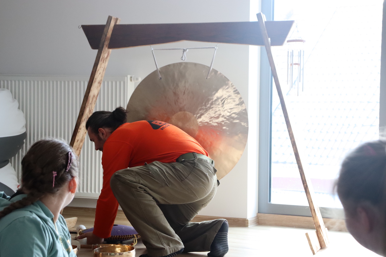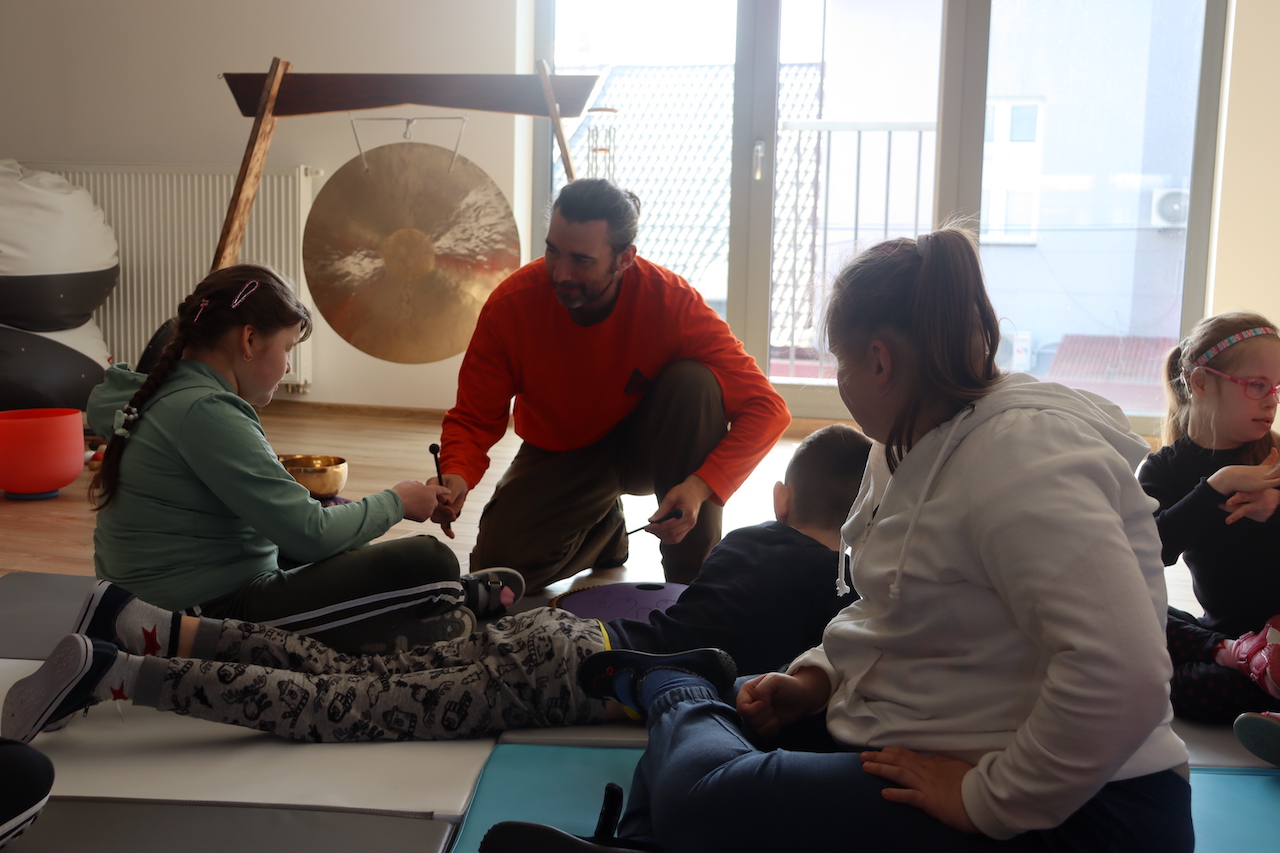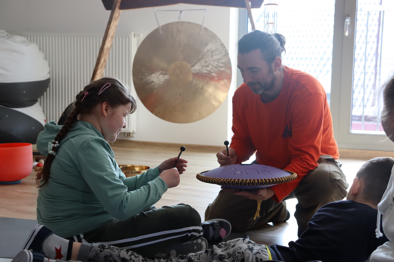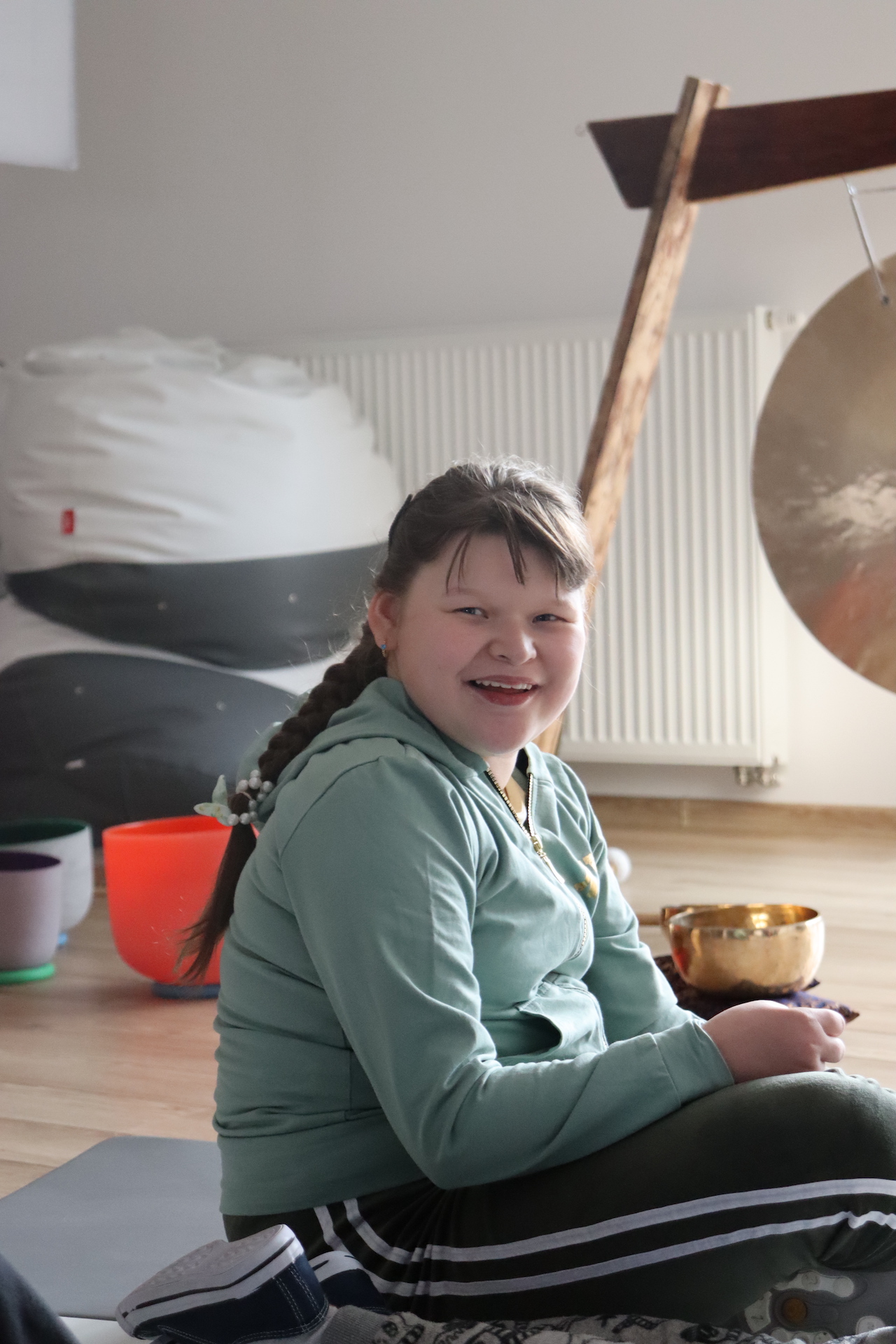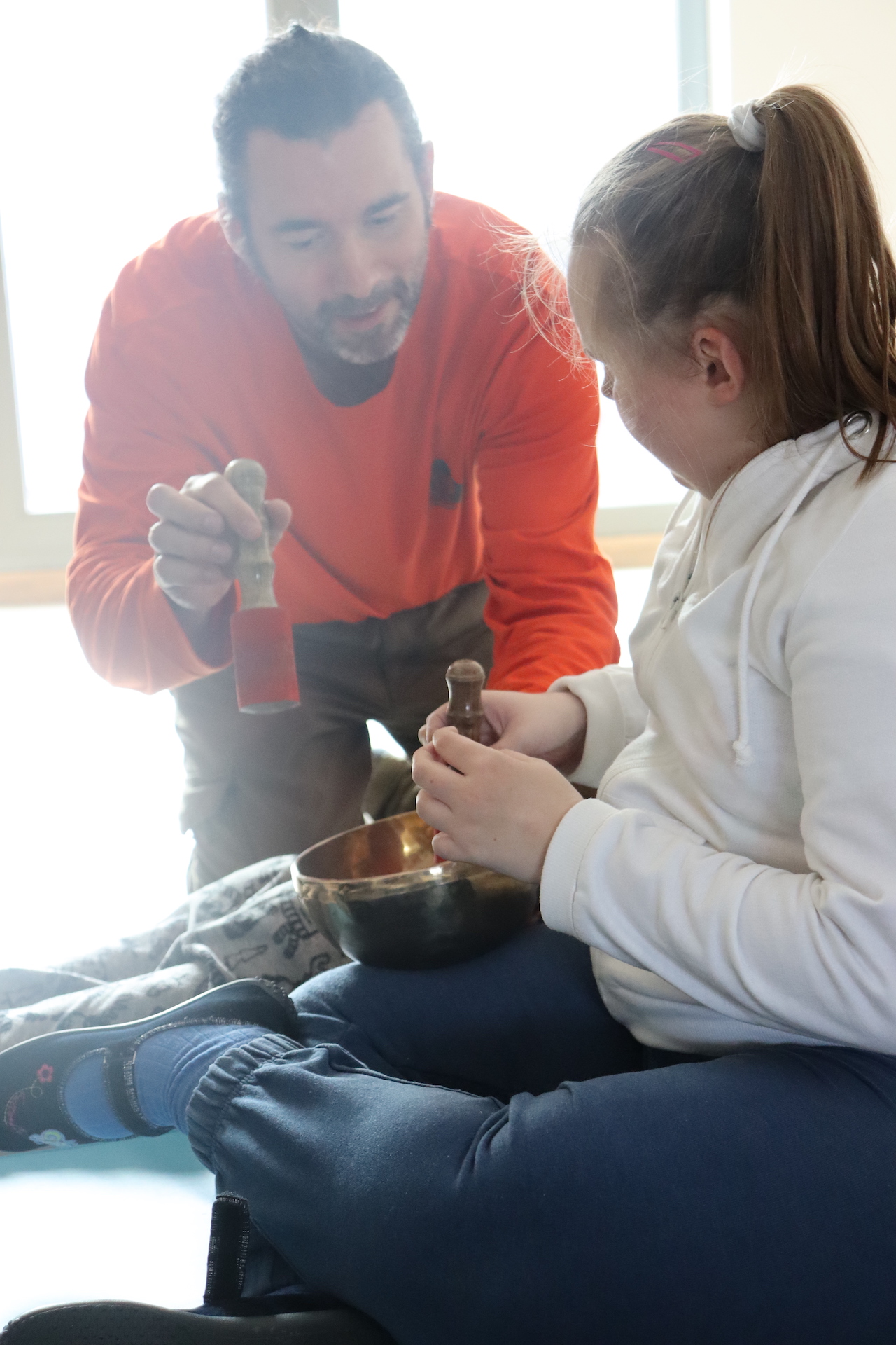 Podczas kwietniowych zajęć terapii dźwiękiem uczniowie naszej szkoły grali na misach tybetańskich i cymbałach. Praca z misami wyrabia zdolności manualne, poprawia koncentrację, uczy spokoju i opanowania, a także kształtuje systematyczność zachowań.