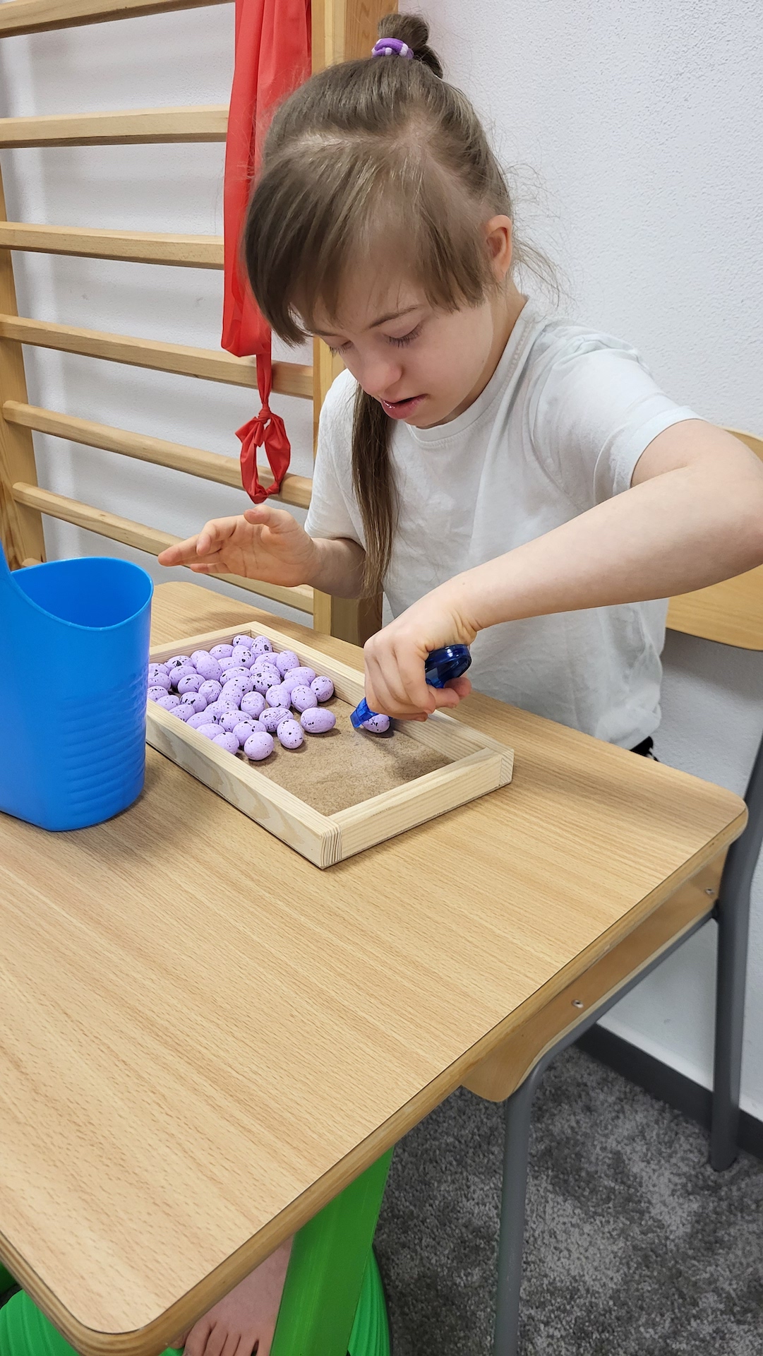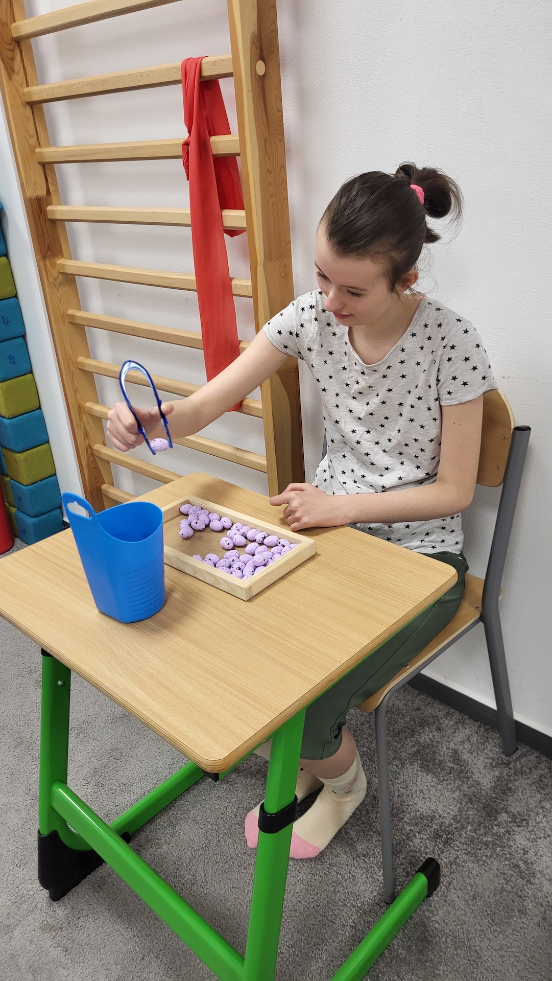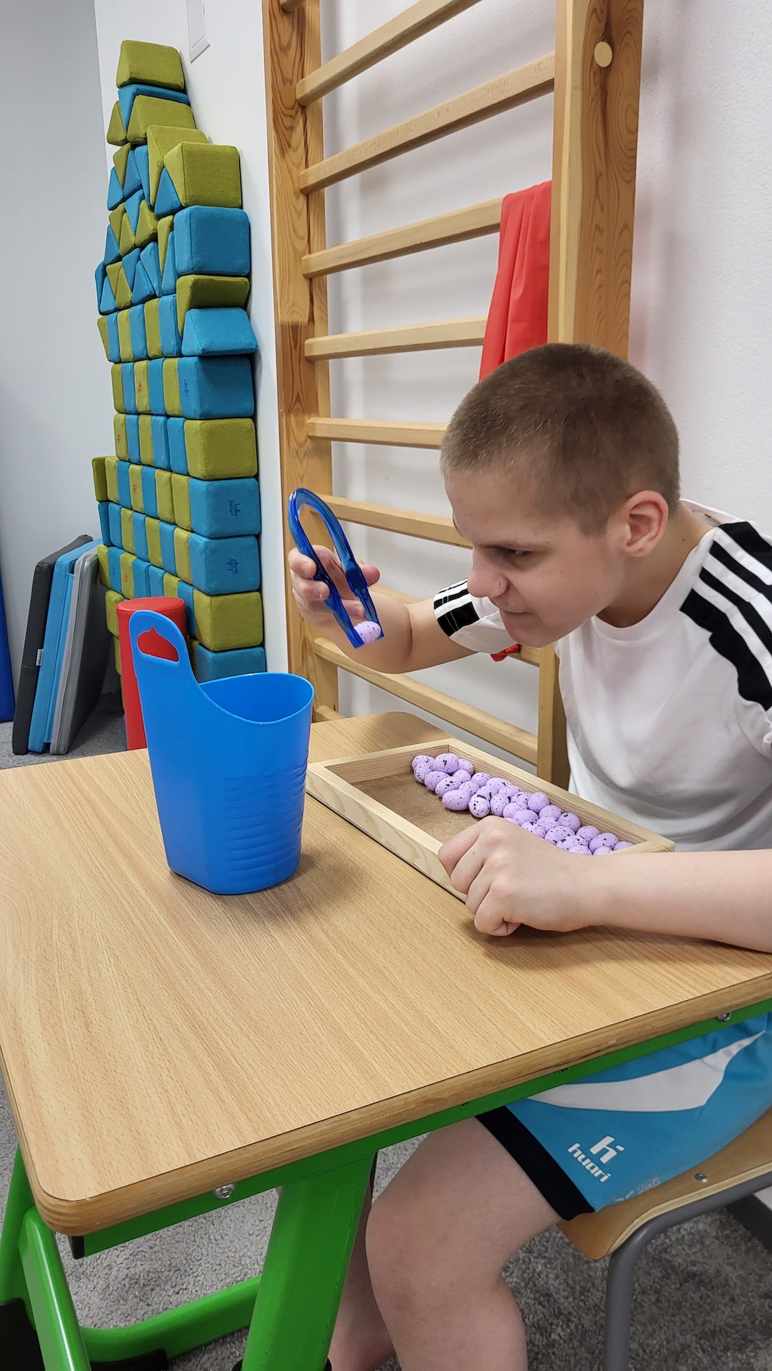 Doskonalenie motoryki małej - chwyt pensetowy jako formy usprawniania ruchowego z wykorzystaniem różnych przedmiotów takich jak: guzki, spinacze do odzieży, jajeczka styropianowe.