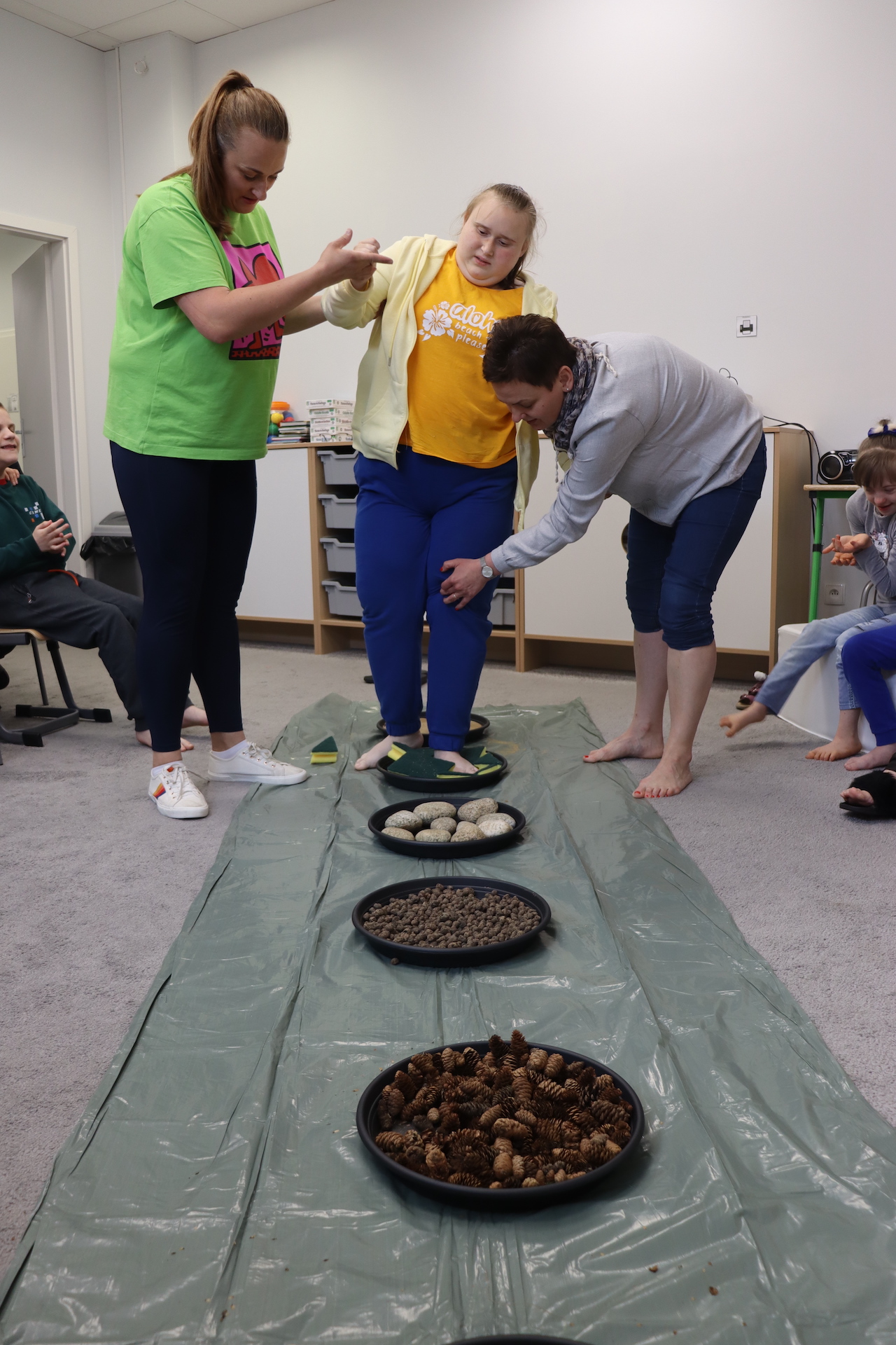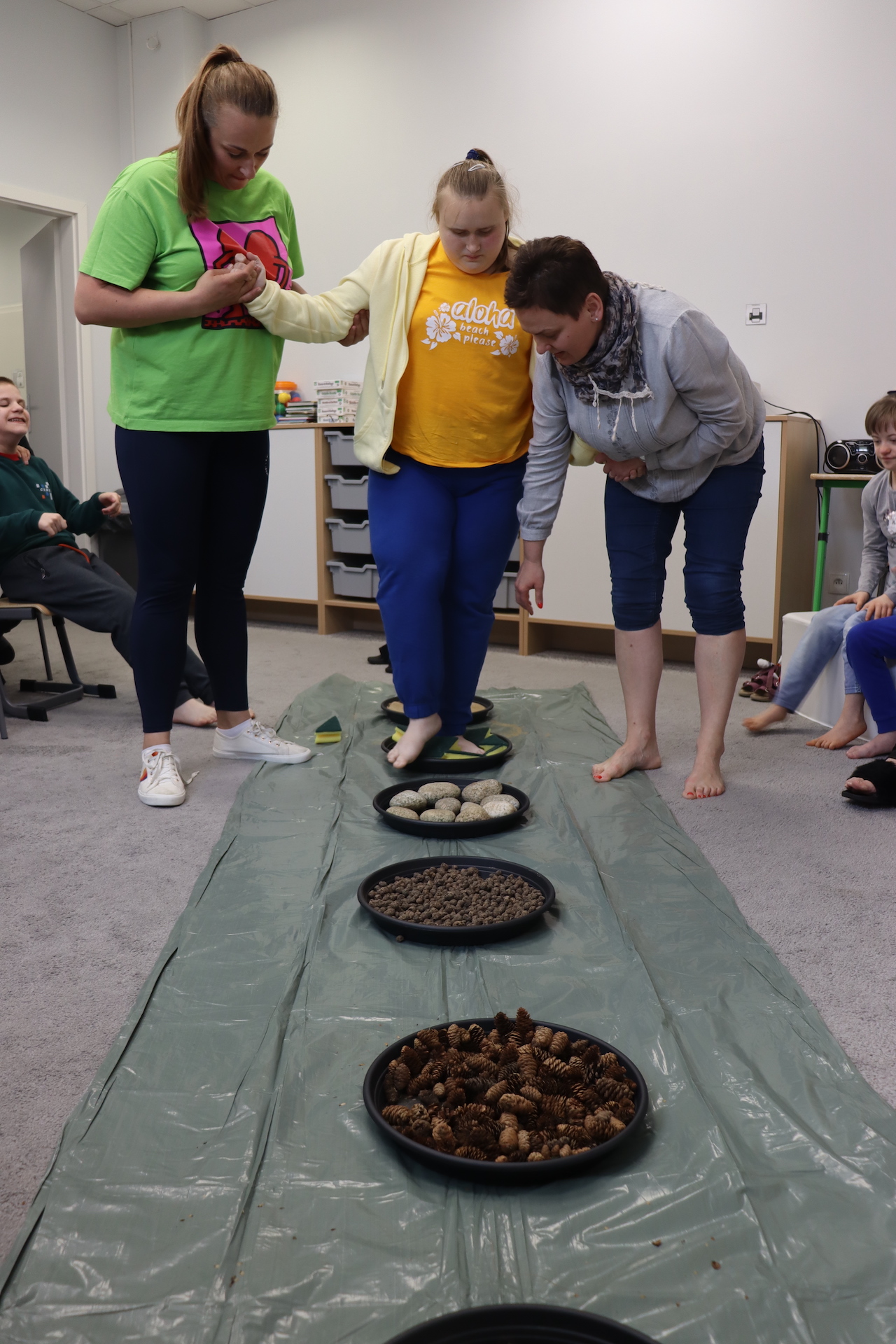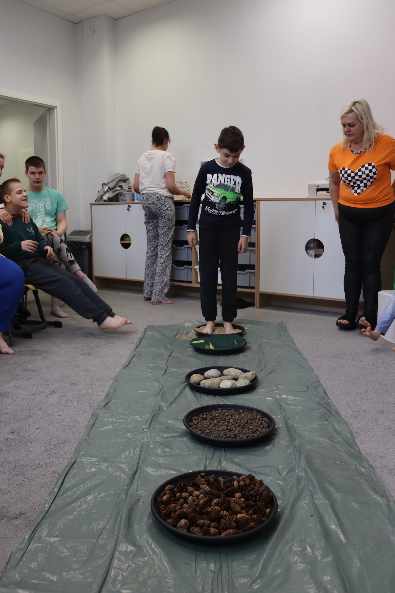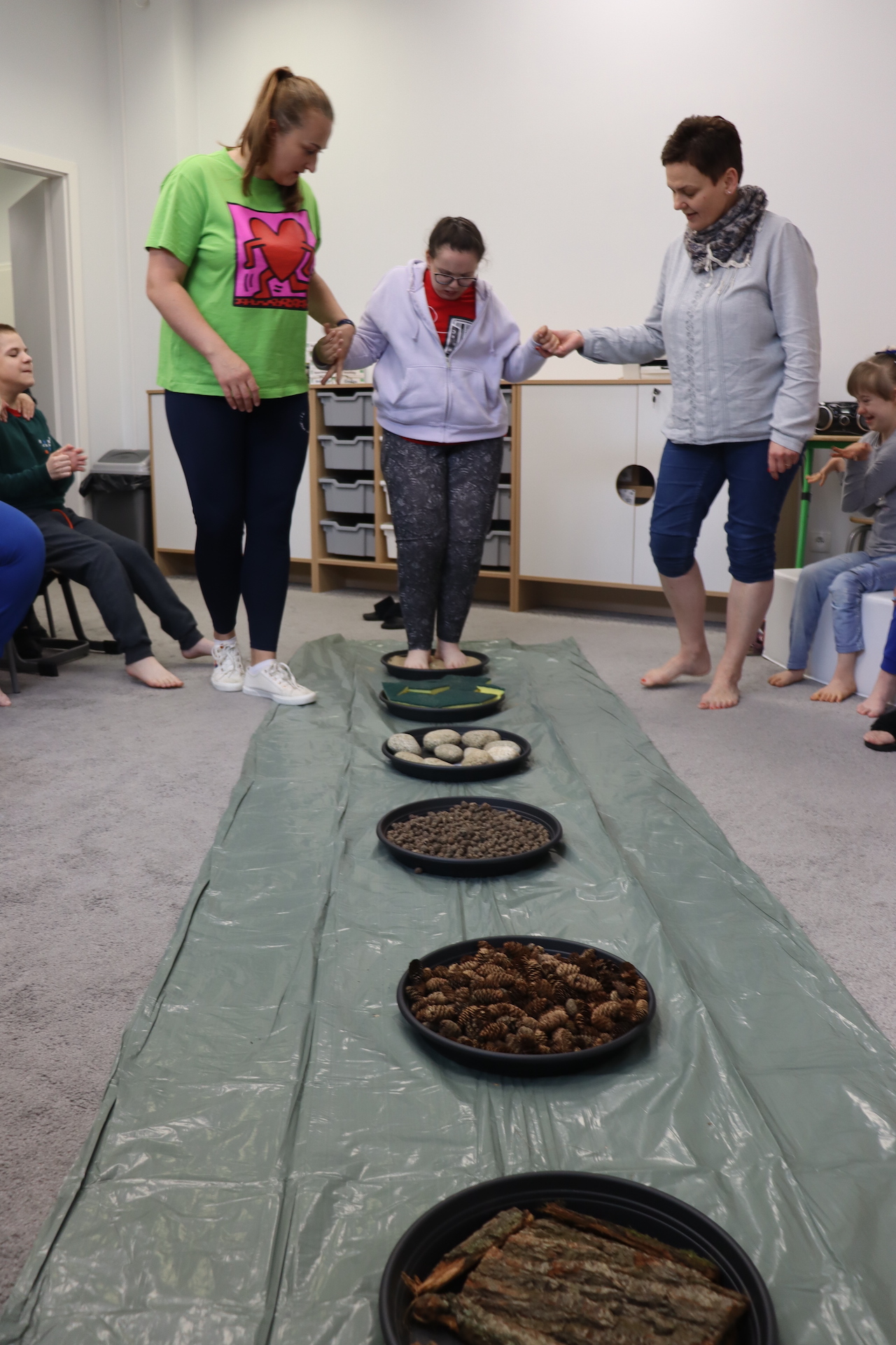 Ostanie zadanie z Ogólnopolskiego Projektu Edukacyjnego „Gramy Zmysłami” brzmiało: „ścieżka sensoryczna”. Uczniowie naszej szkoły wspólnie z nauczycielami wykonali wspomnianą ścieżkę z kamieni, piasku, szyszek, drenażu do kwiatków, gąbki i kory. Potem każdy odważnie przeszedł bosymi stopami przez przygotowaną ścieżkę, która dostarczyła nam różnorodnych bodźców, jak również pobudziła percepcję wzrokowo–ruchową, i kształtując właściwą reakcję na dotyk. Ćwiczyliśmy dzięki temu sprawność motoryczną, równowagę, koordynację ruchową, percepcję wzrokową oraz planowanie ruchu.