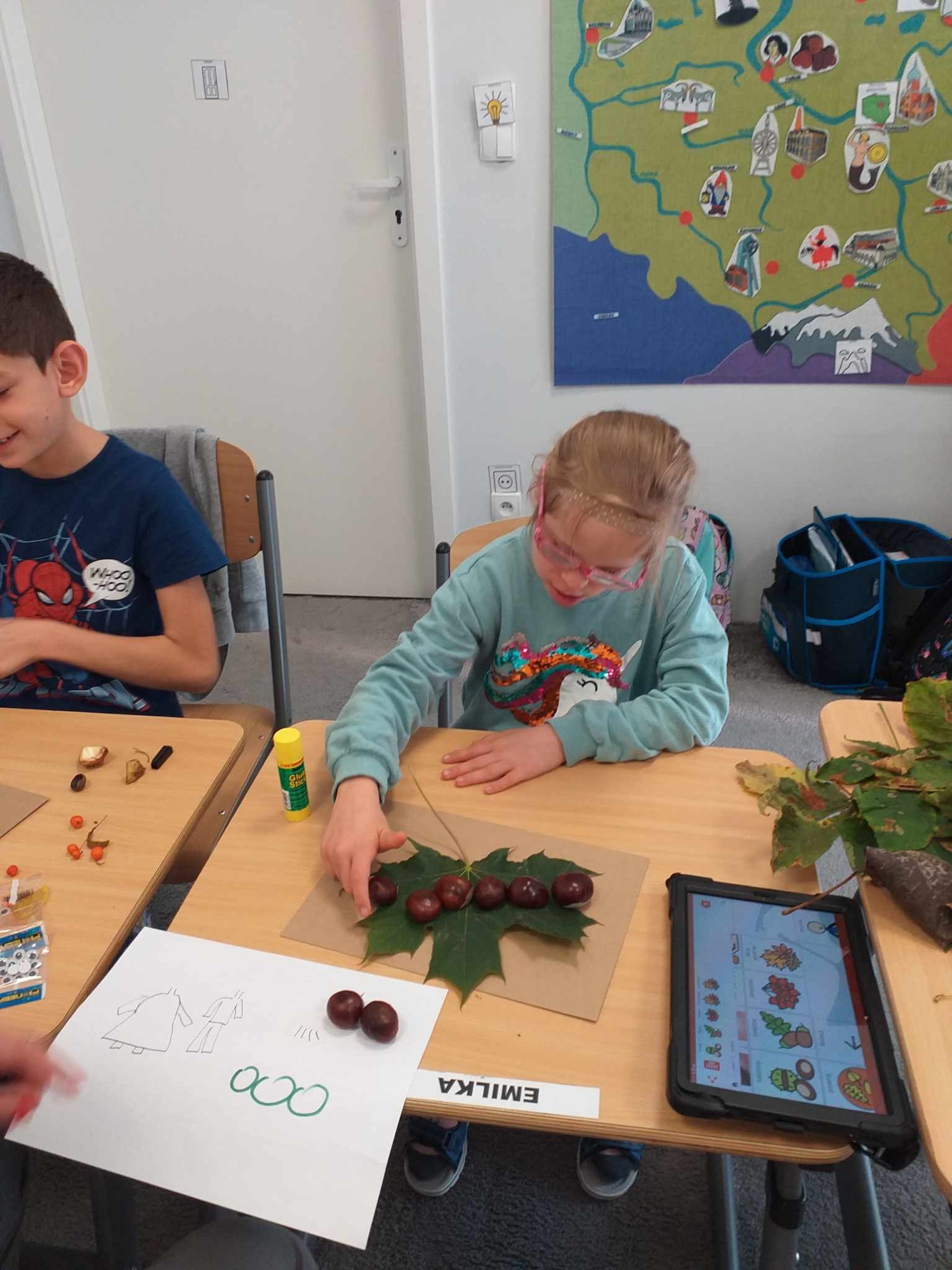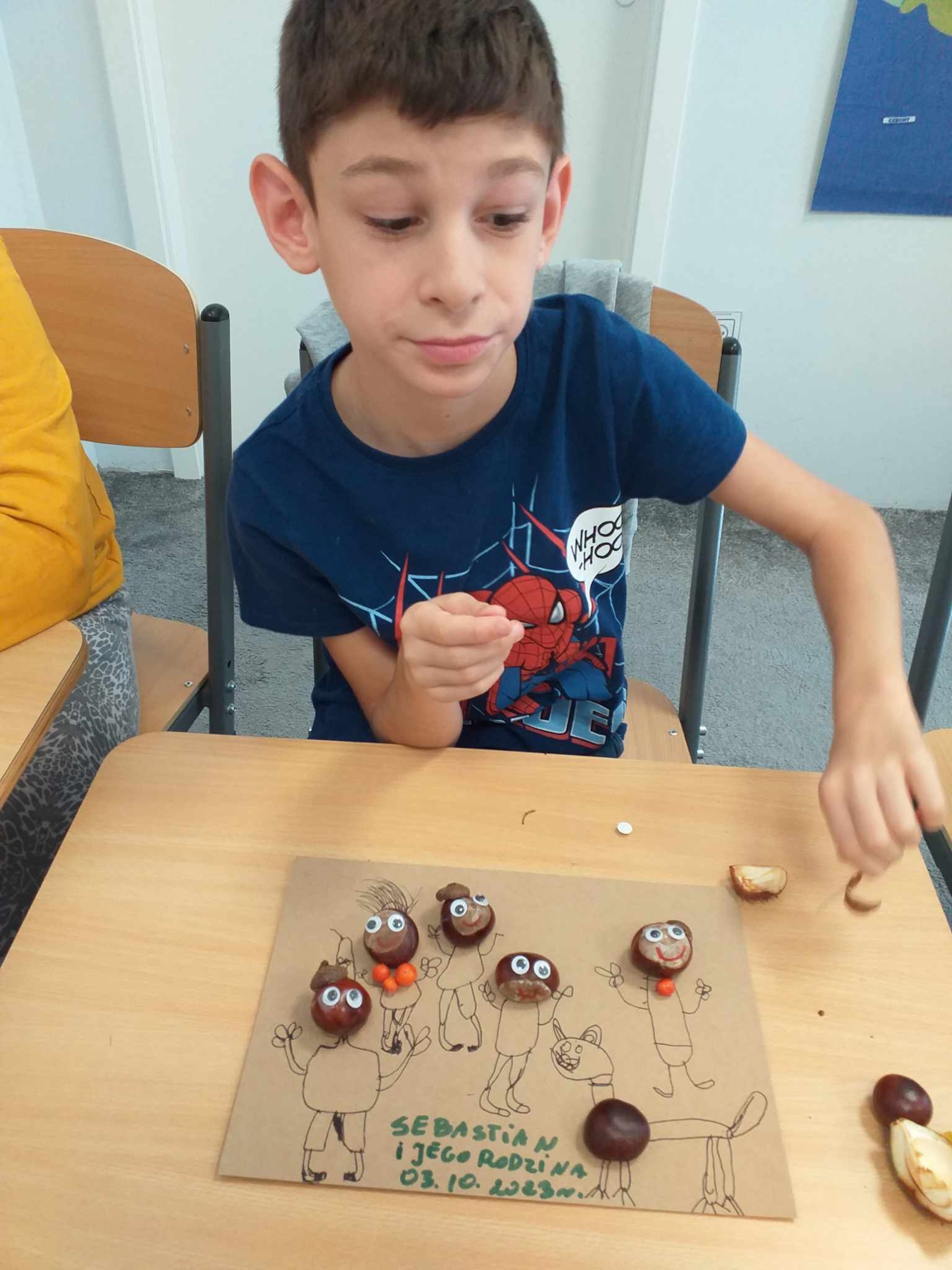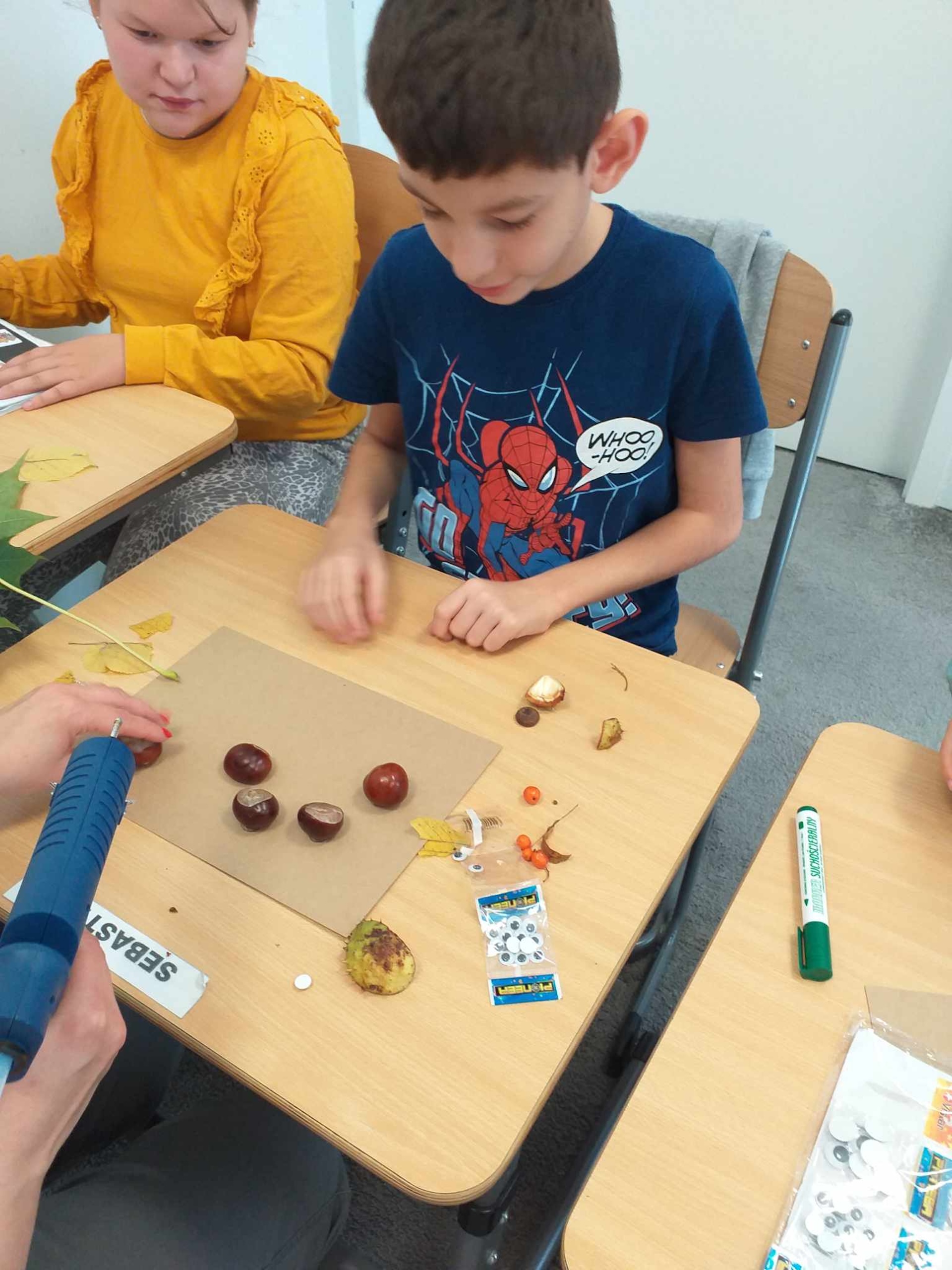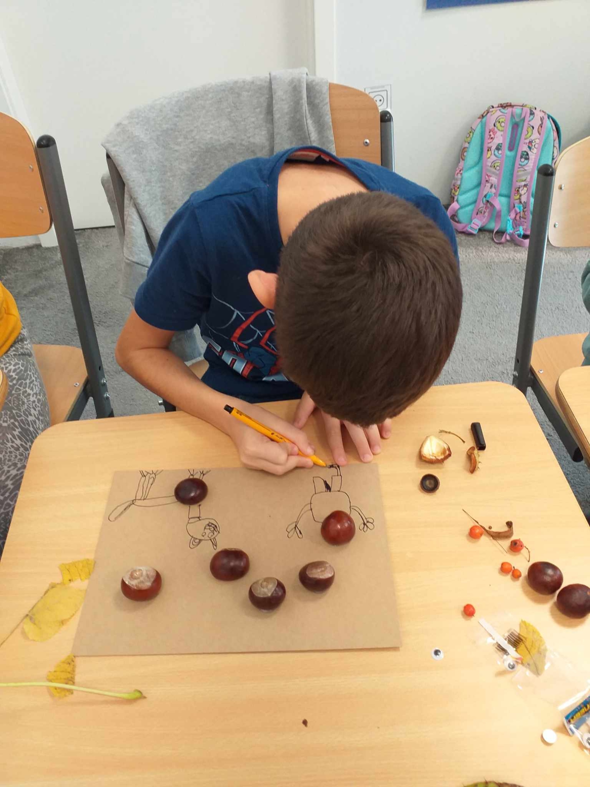 Omawiając temat tygodnia „Jesień w parku” uczniowie oddziału „I”, podczas spaceru po parku, zbierali dary jesieni – kolorowe liście, kasztany, jarzębinę i żołędzie. Na zajęciach z kreatywności wykonali z nich ciekawe prace plastyczne. Rozwijali przy tym wyobraźnię i kreatywność. Oto fotorelacja z ich pracy.