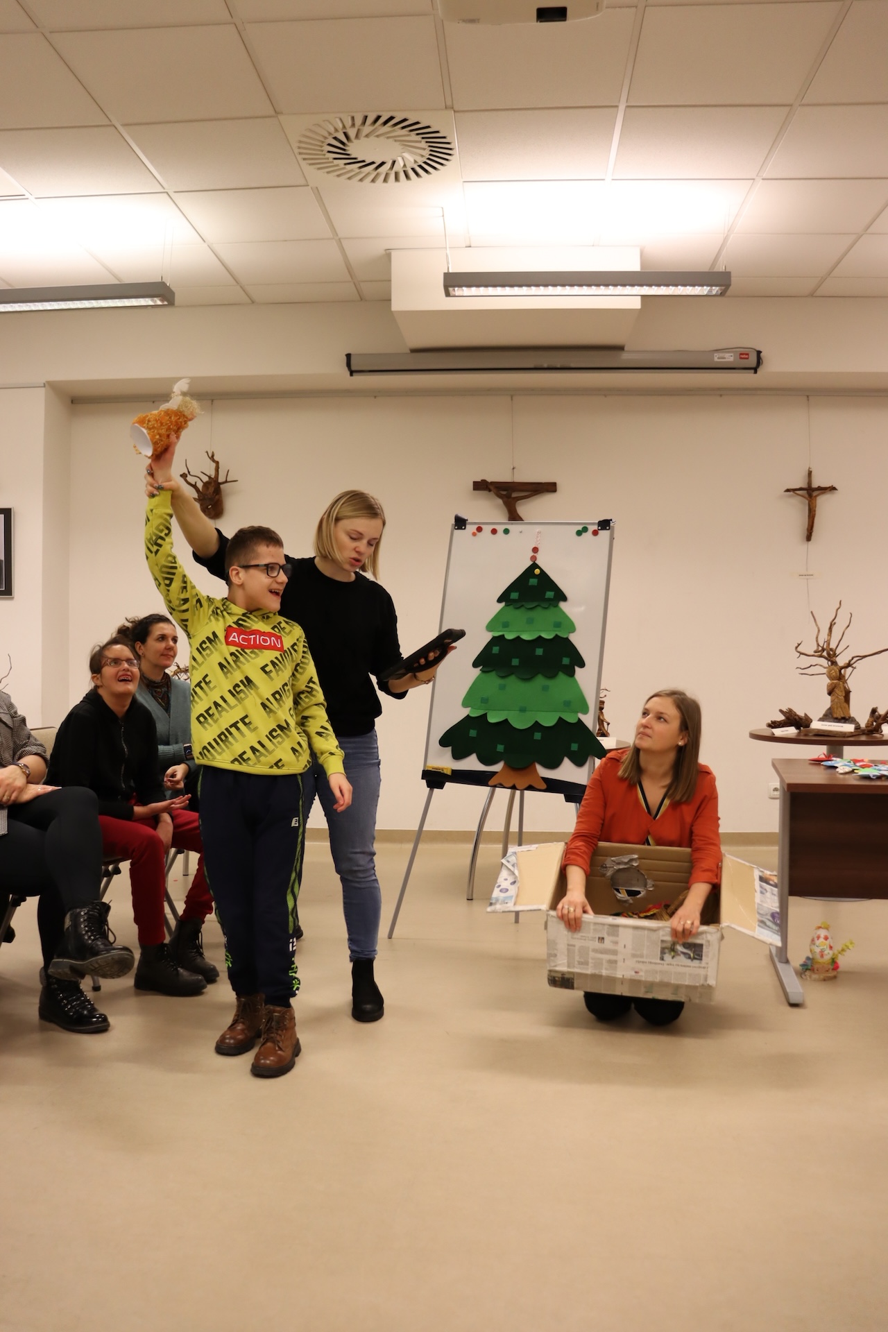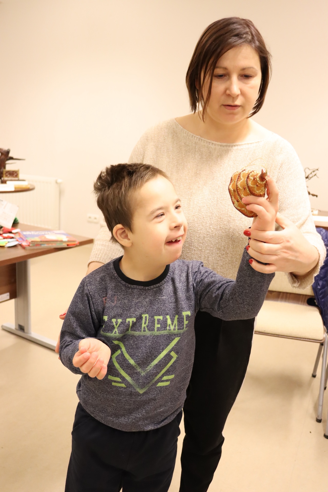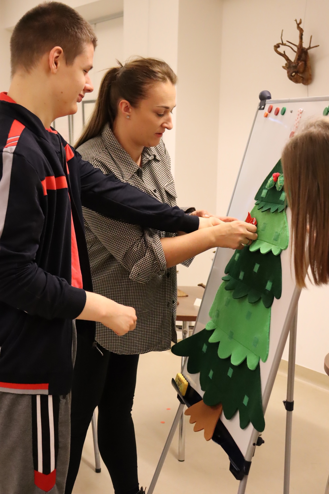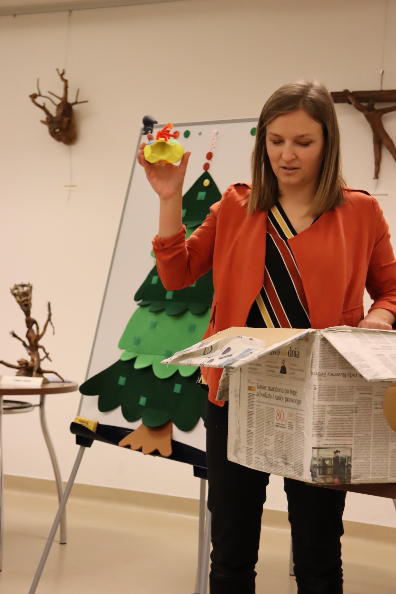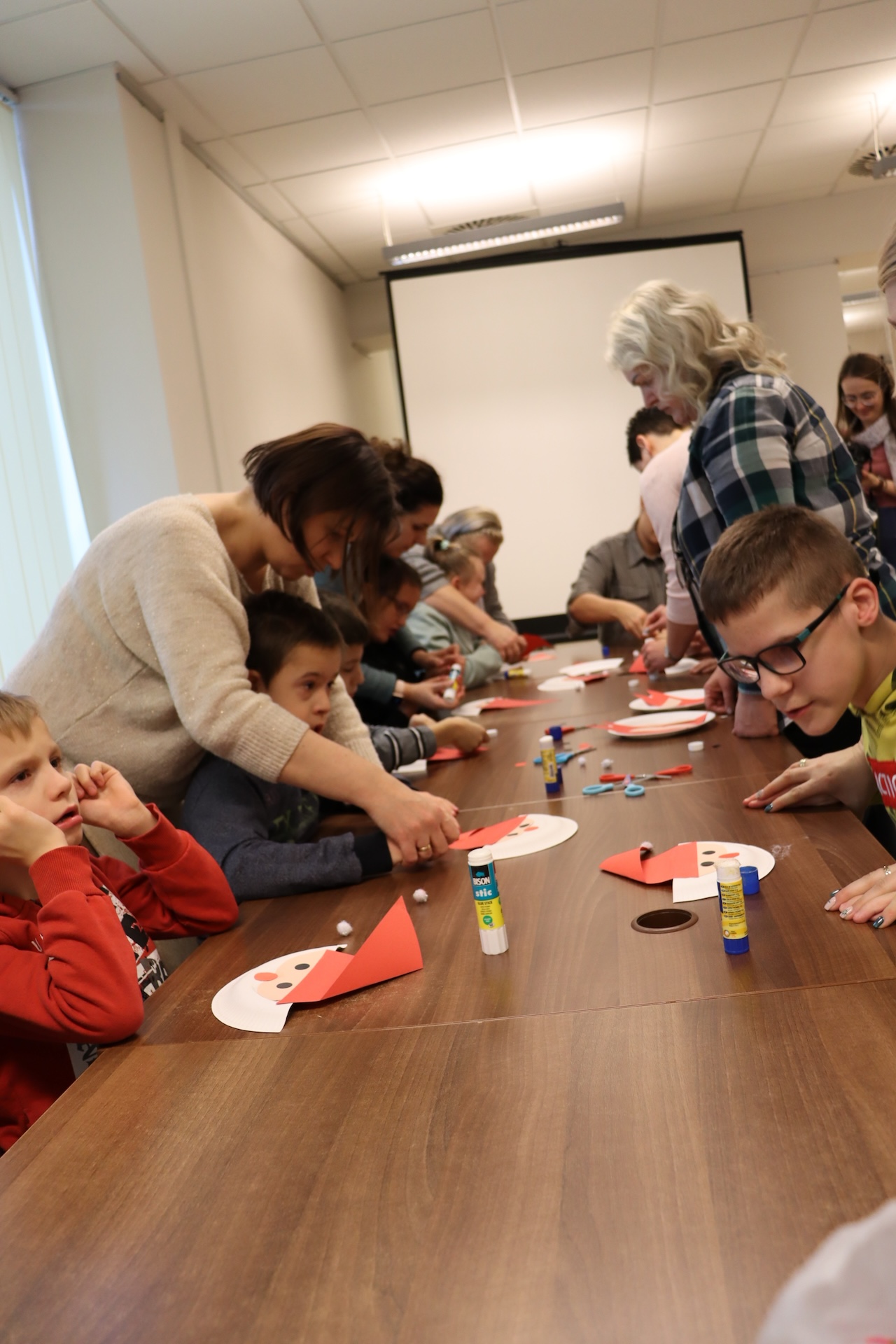Podczas grudniowego spotkania poznaliśmy ciekawe pozycje książkowe o Mikołaju. Rozmawialiśmy o tradycji ubierania choinki na święta. Nazywaliśmy ozdoby świąteczne. Wspólnie, według przepisu Pani Karoliny, „piekliśmy pierniki”. A na koniec spotkania z gotowych elementów wykonaliśmy świąteczny portret Mikołaja.
