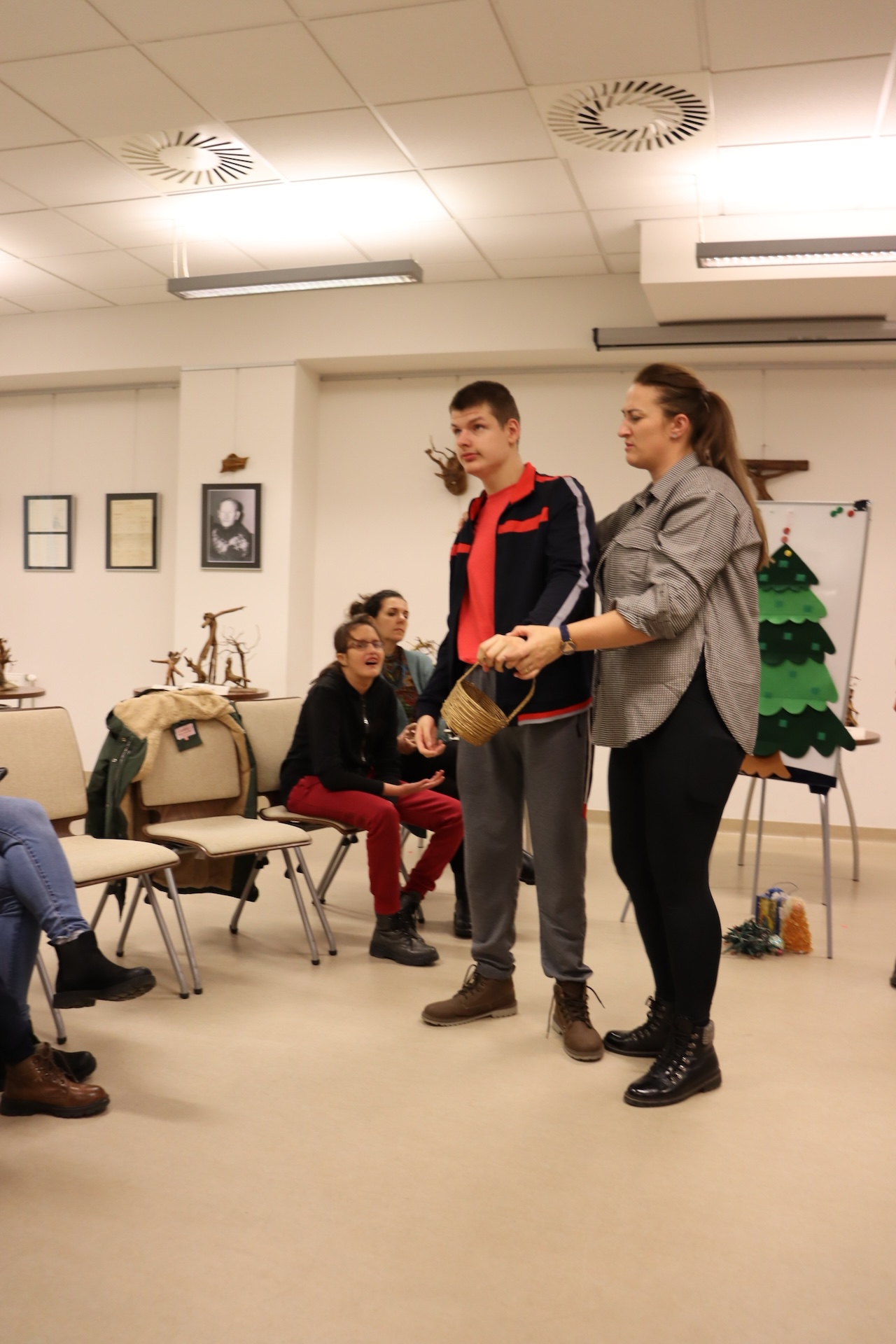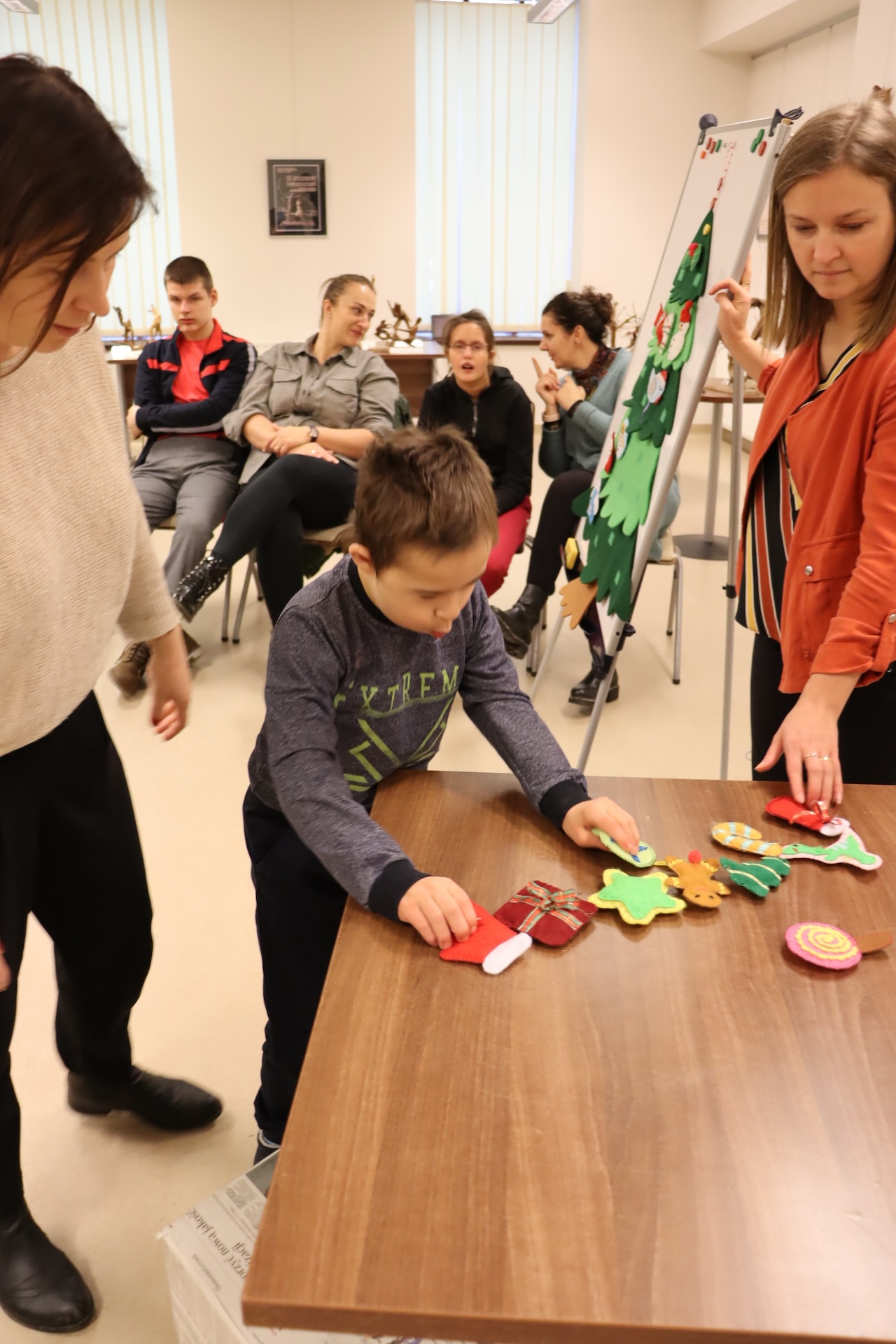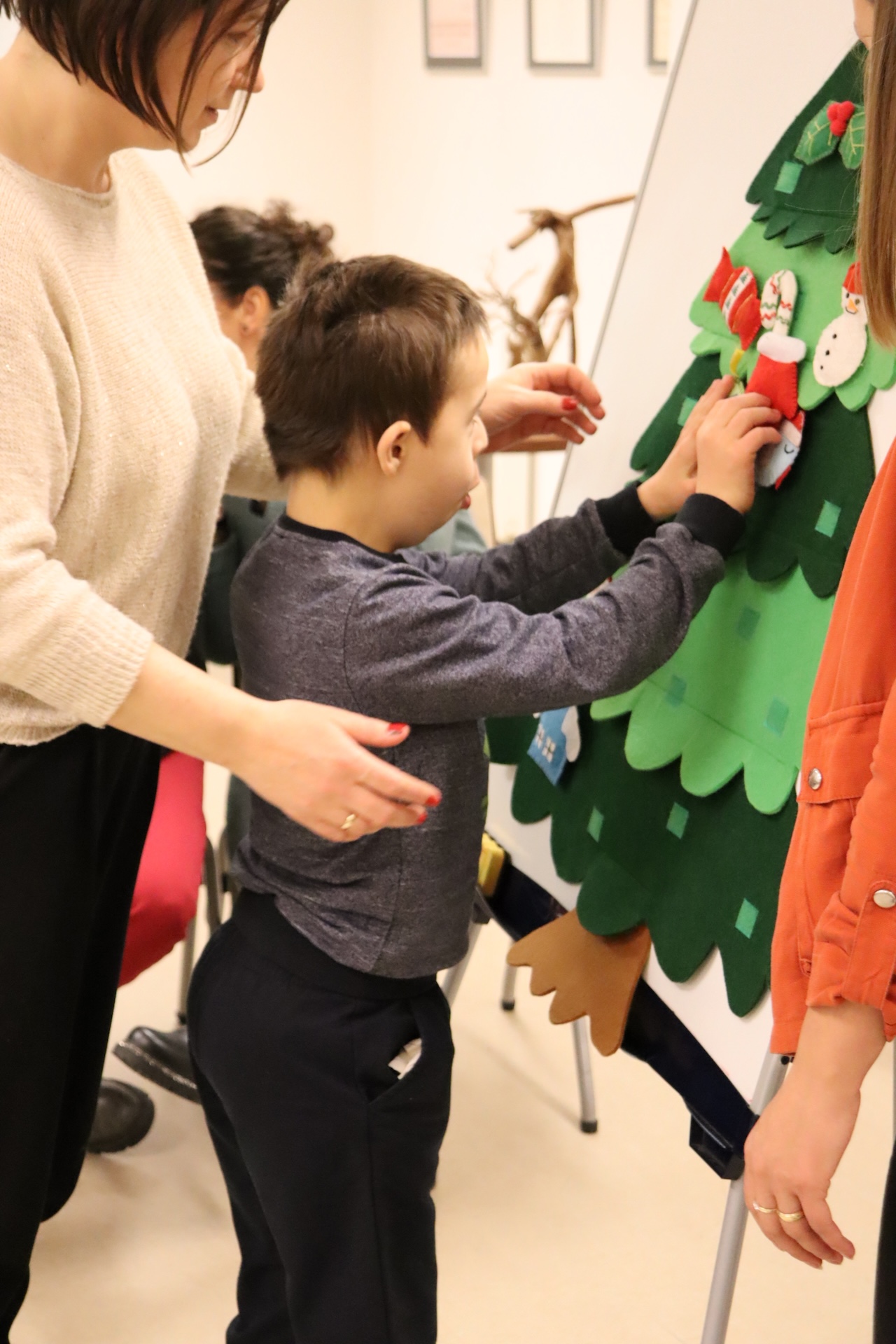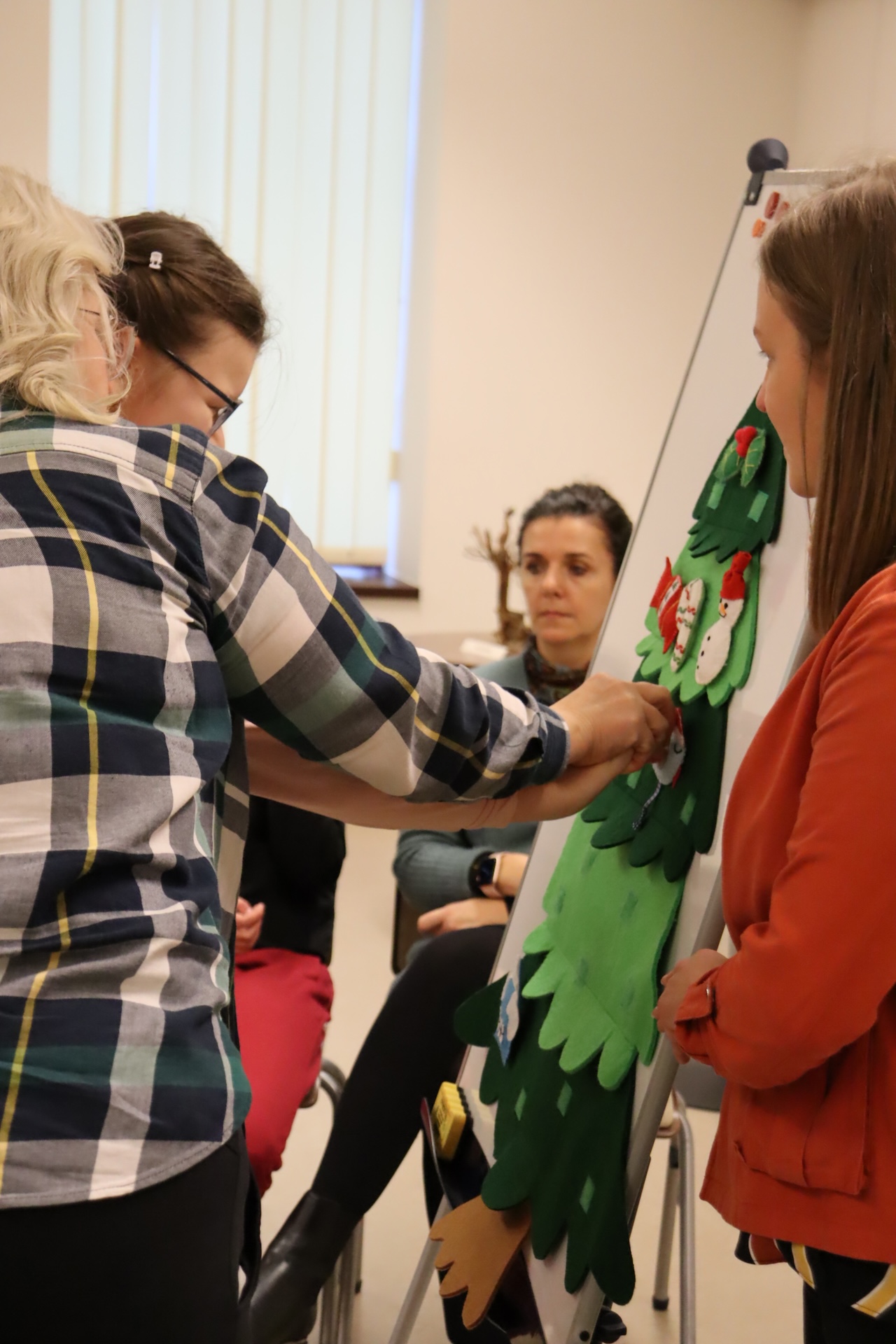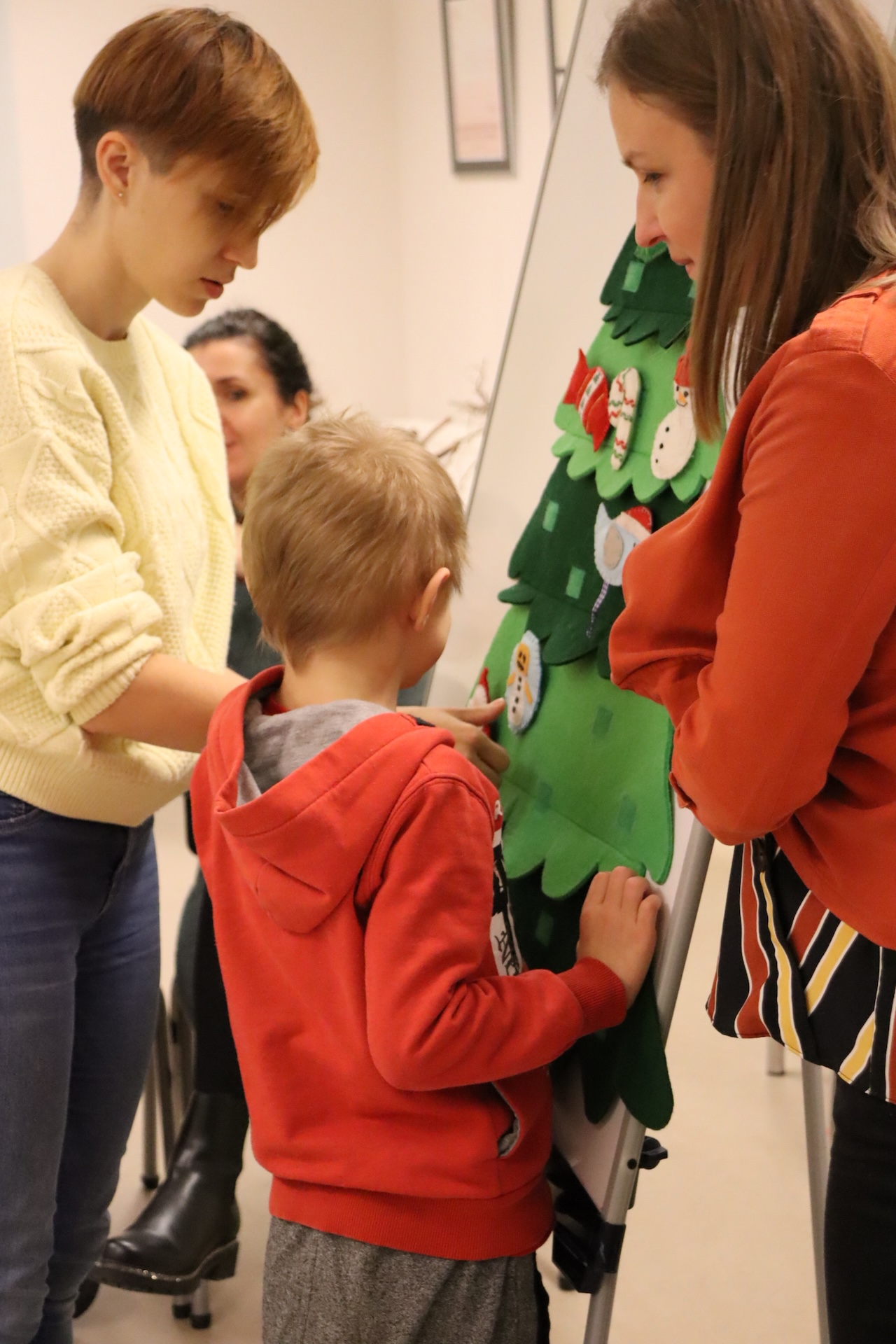 Podczas grudniowego spotkania poznaliśmy ciekawe pozycje książkowe o Mikołaju. Rozmawialiśmy o tradycji ubierania choinki na święta. Nazywaliśmy ozdoby świąteczne. Wspólnie, według przepisu Pani Karoliny, „piekliśmy pierniki”. A na koniec spotkania z gotowych elementów wykonaliśmy świąteczny portret Mikołaja.