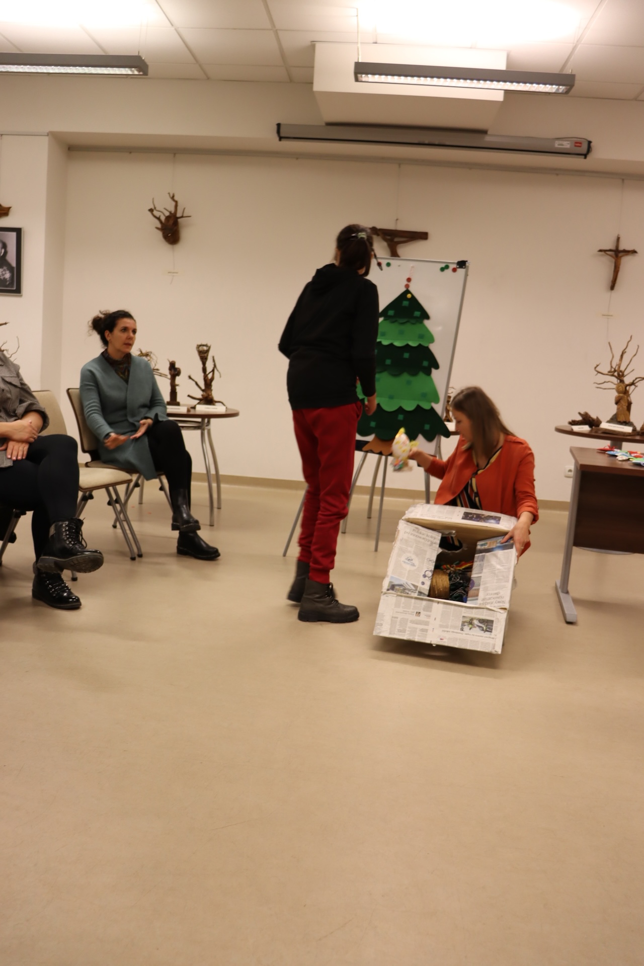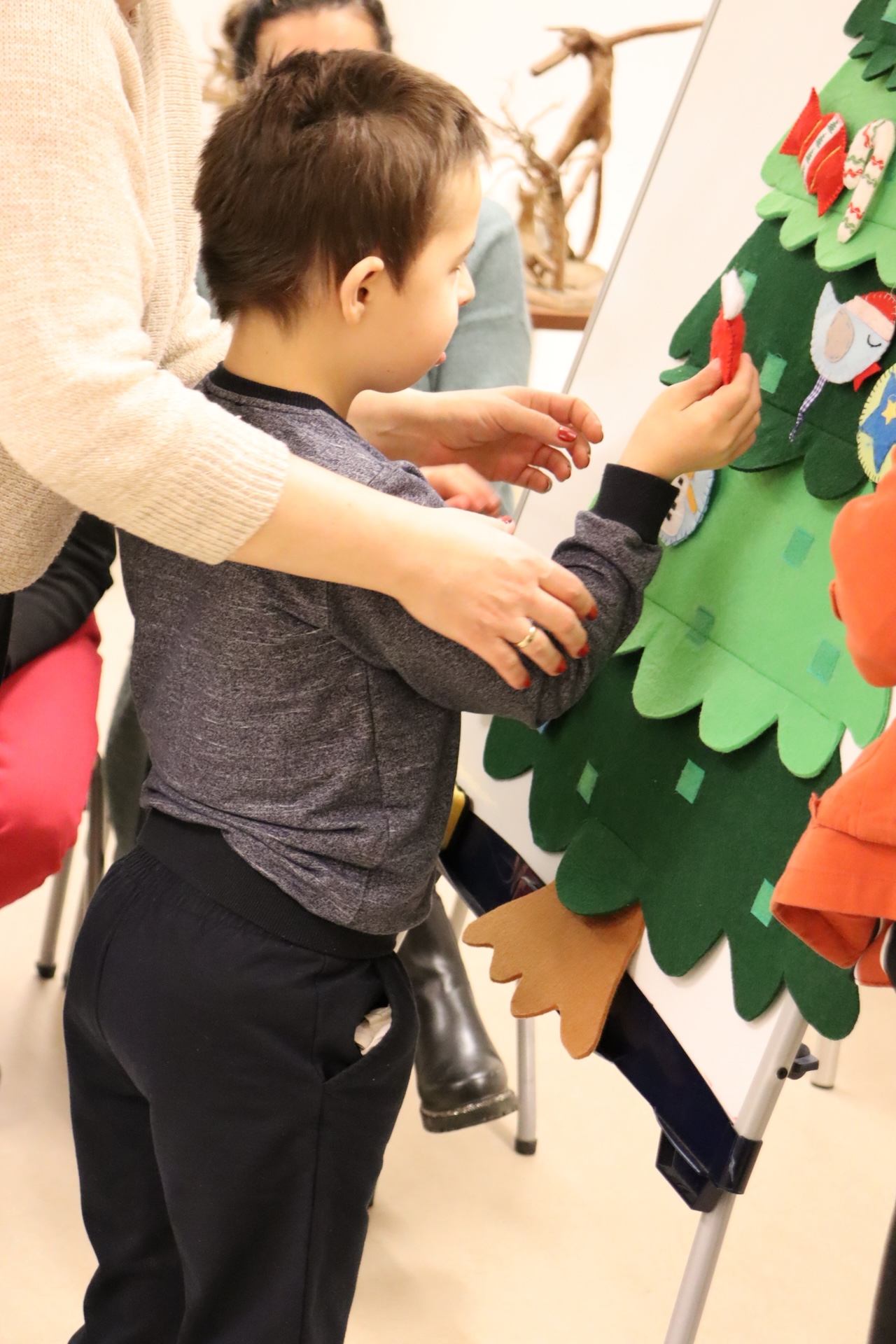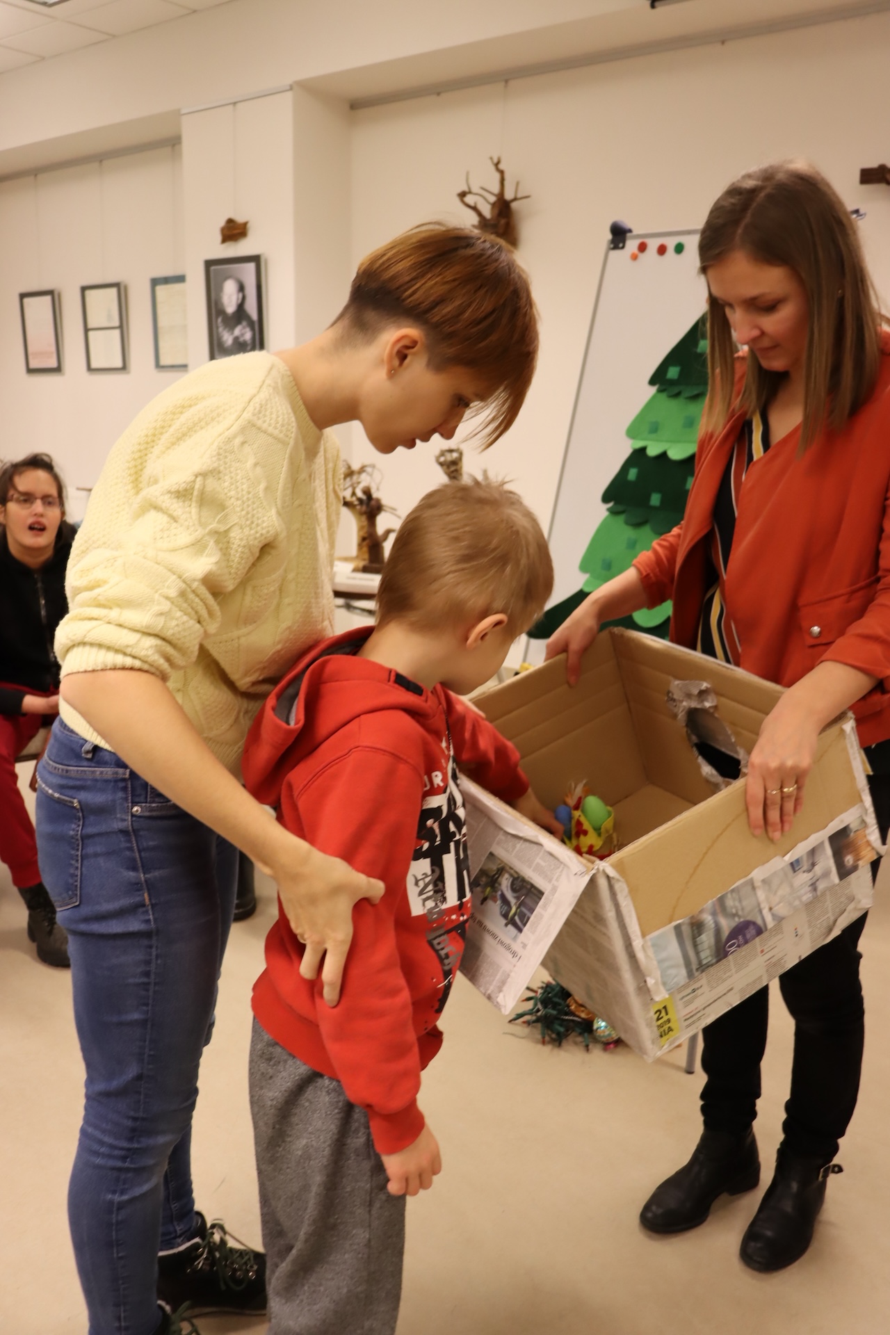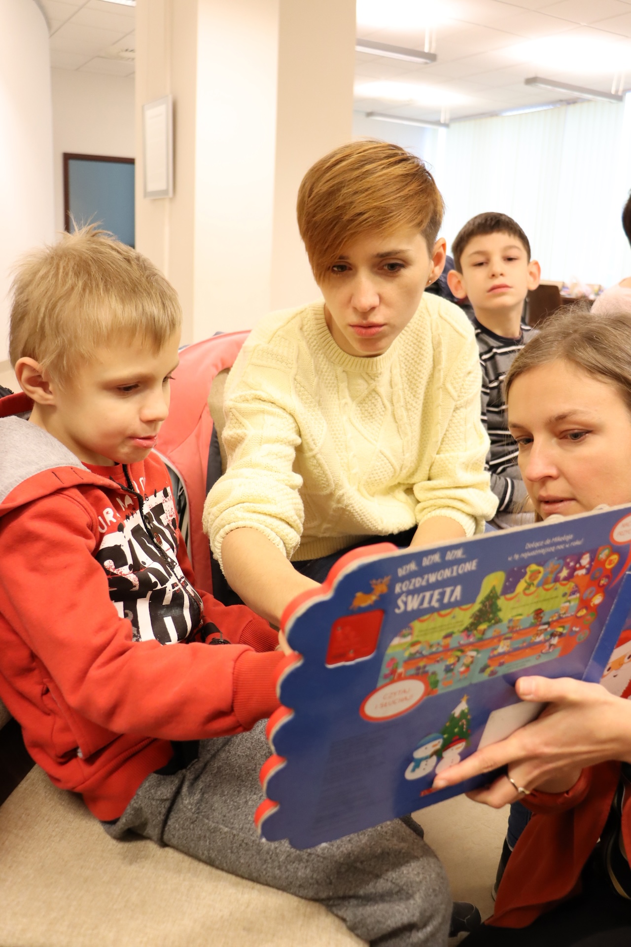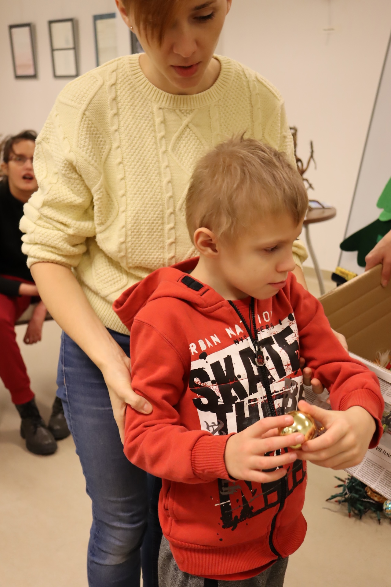 Podczas grudniowego spotkania poznaliśmy ciekawe pozycje książkowe o Mikołaju. Rozmawialiśmy o tradycji ubierania choinki na święta. Nazywaliśmy ozdoby świąteczne. Wspólnie, według przepisu Pani Karoliny, „piekliśmy pierniki”. A na koniec spotkania z gotowych elementów wykonaliśmy świąteczny portret Mikołaja.
