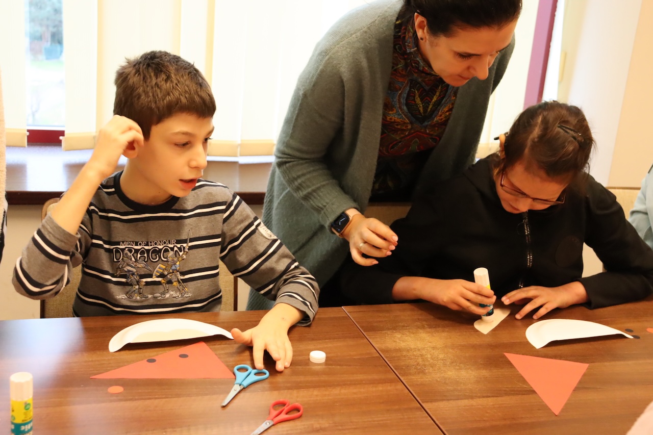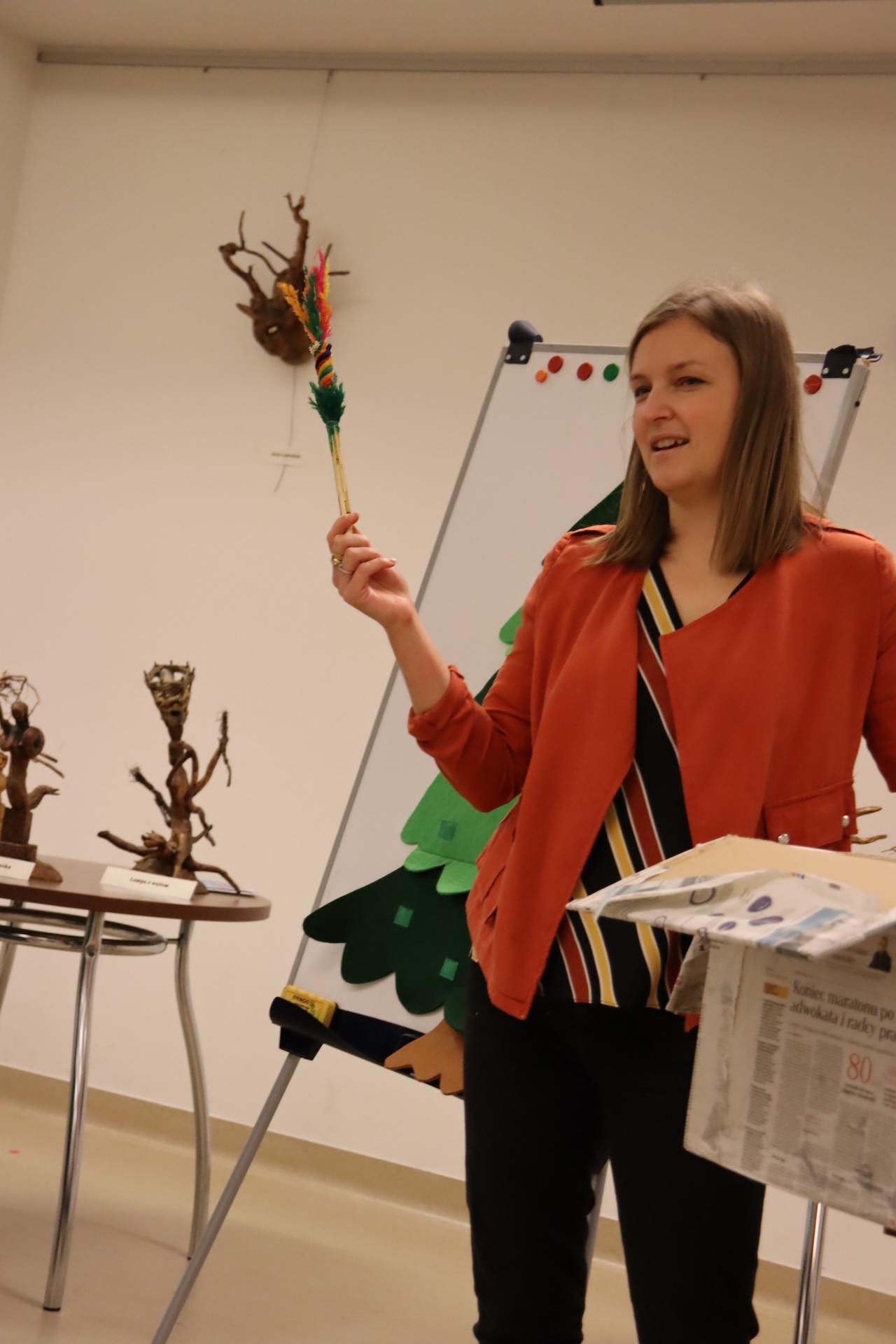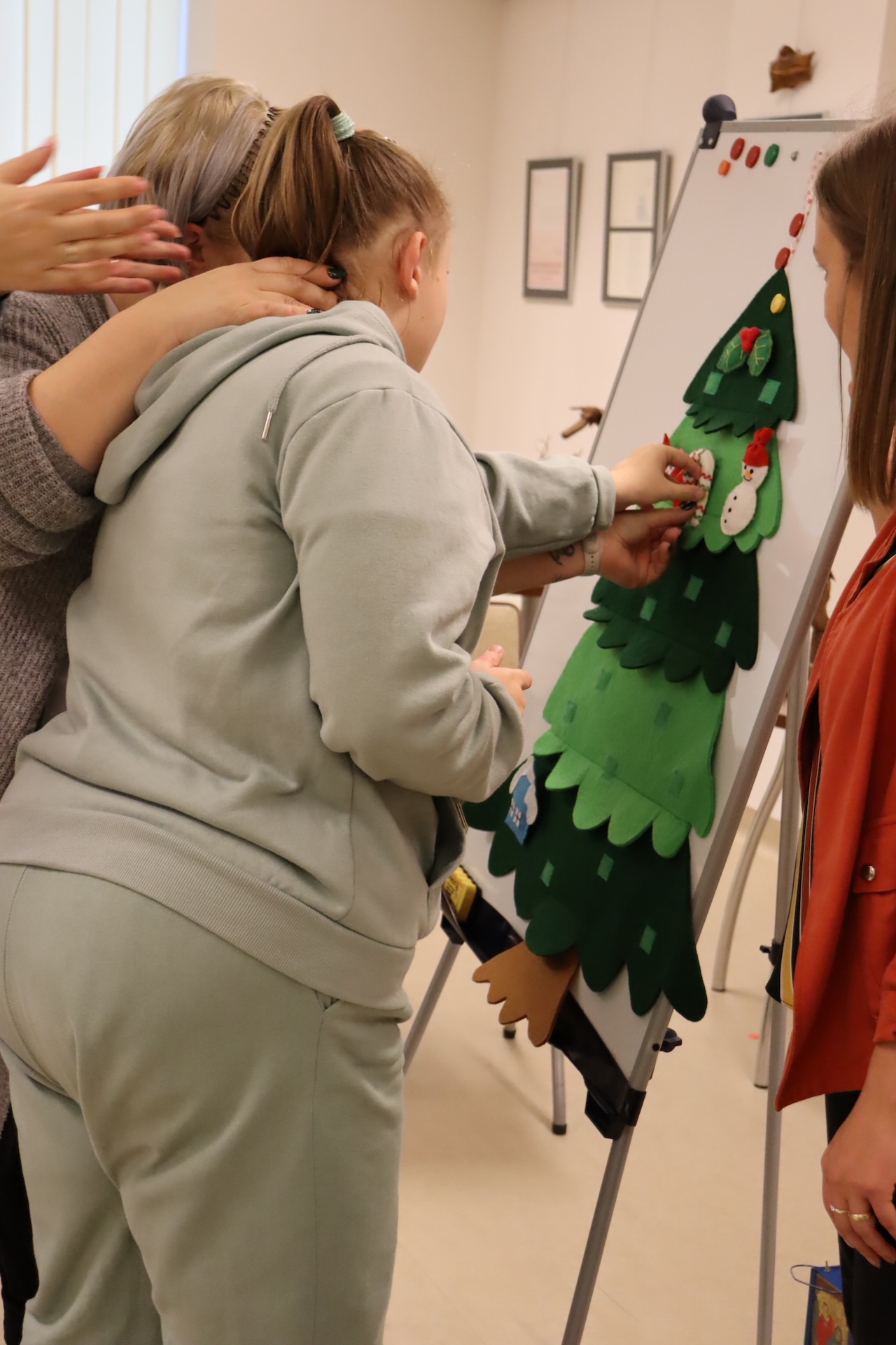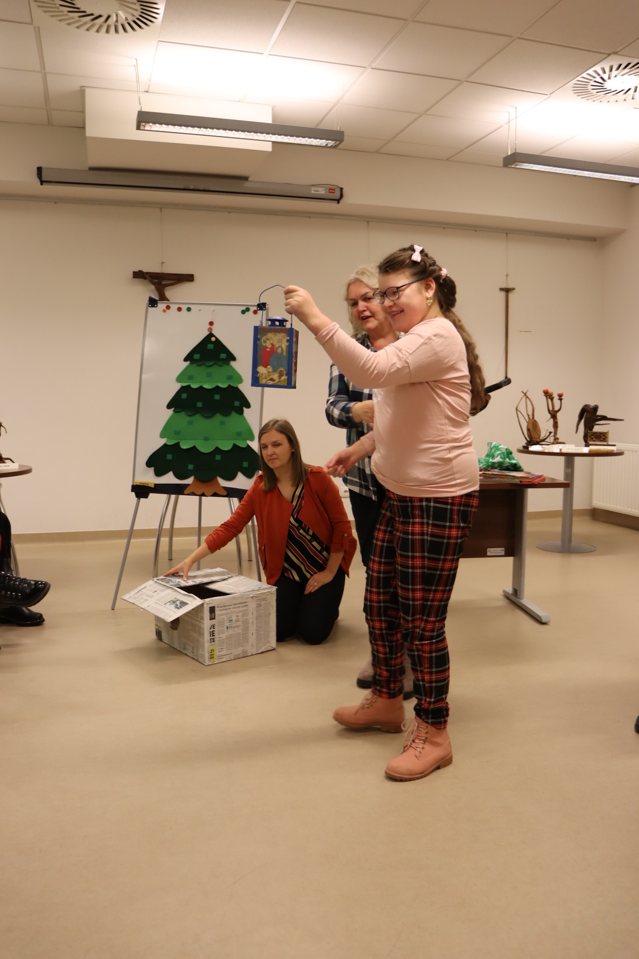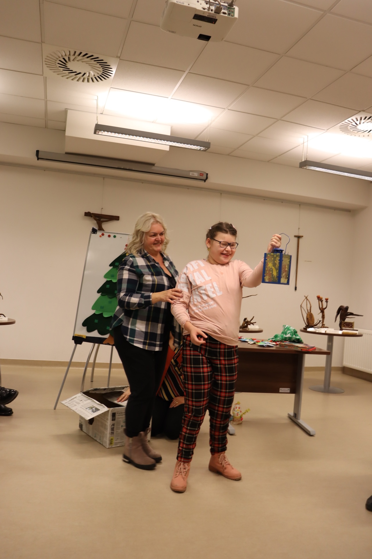 Podczas grudniowego spotkania poznaliśmy ciekawe pozycje książkowe o Mikołaju. Rozmawialiśmy o tradycji ubierania choinki na święta. Nazywaliśmy ozdoby świąteczne. Wspólnie, według przepisu Pani Karoliny, „piekliśmy pierniki”. A na koniec spotkania z gotowych elementów wykonaliśmy świąteczny portret Mikołaja.