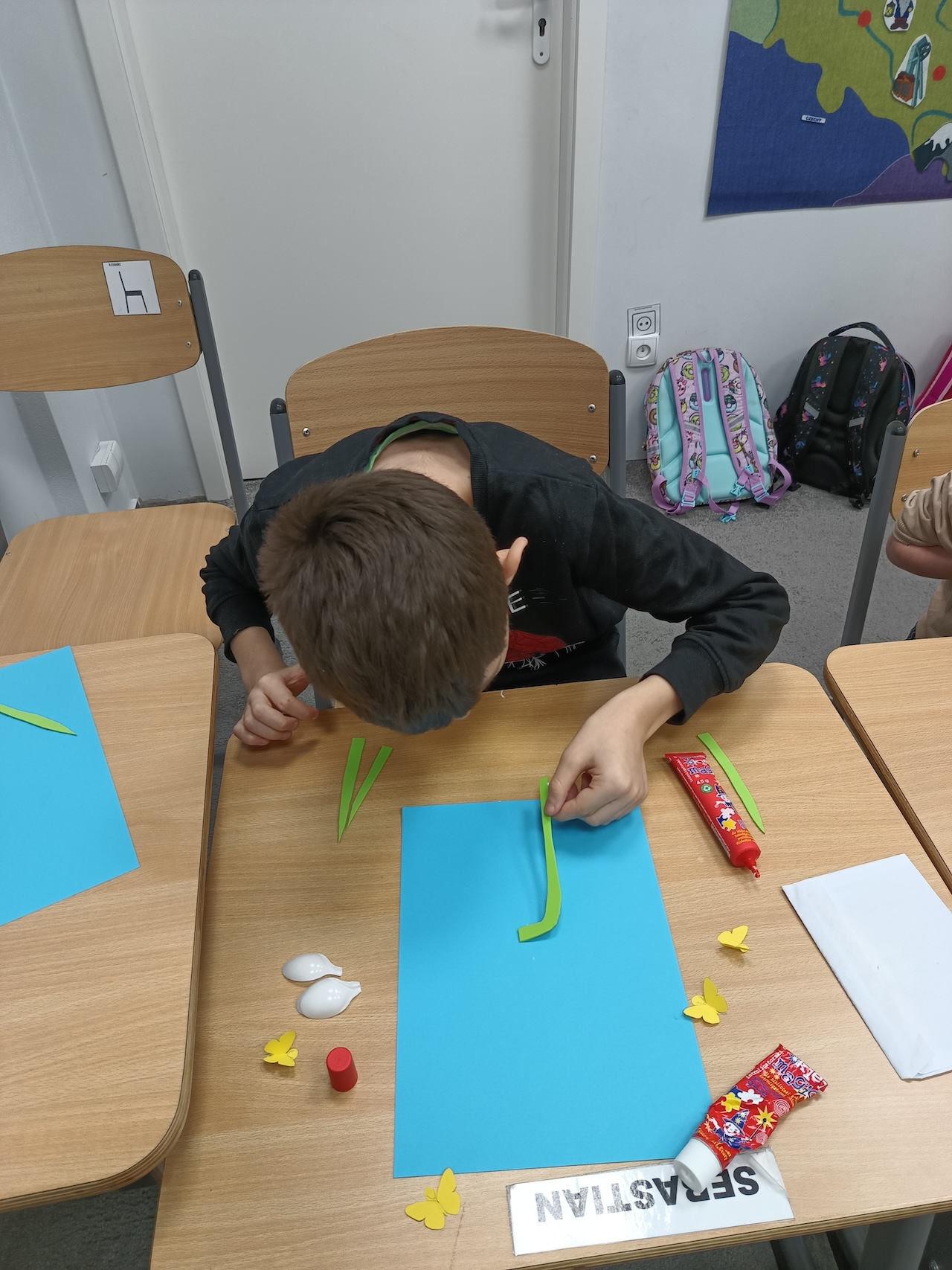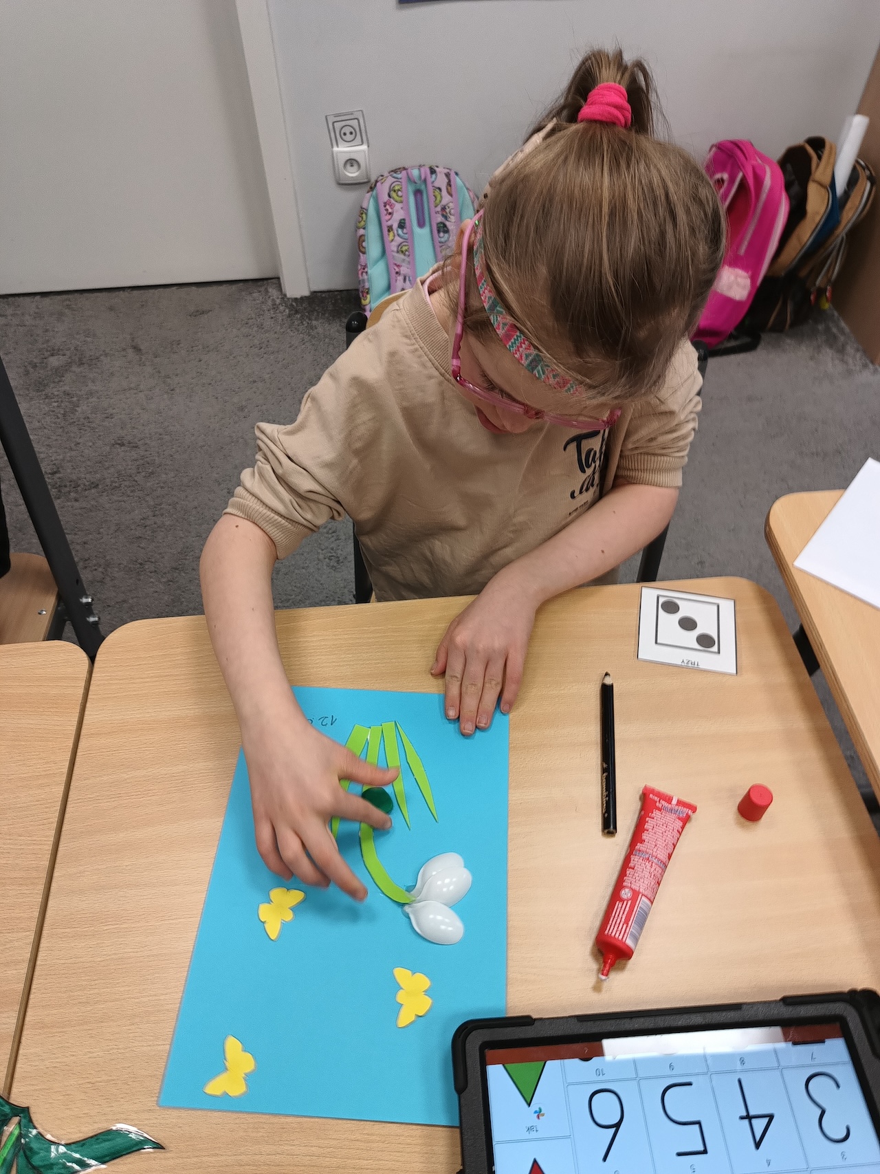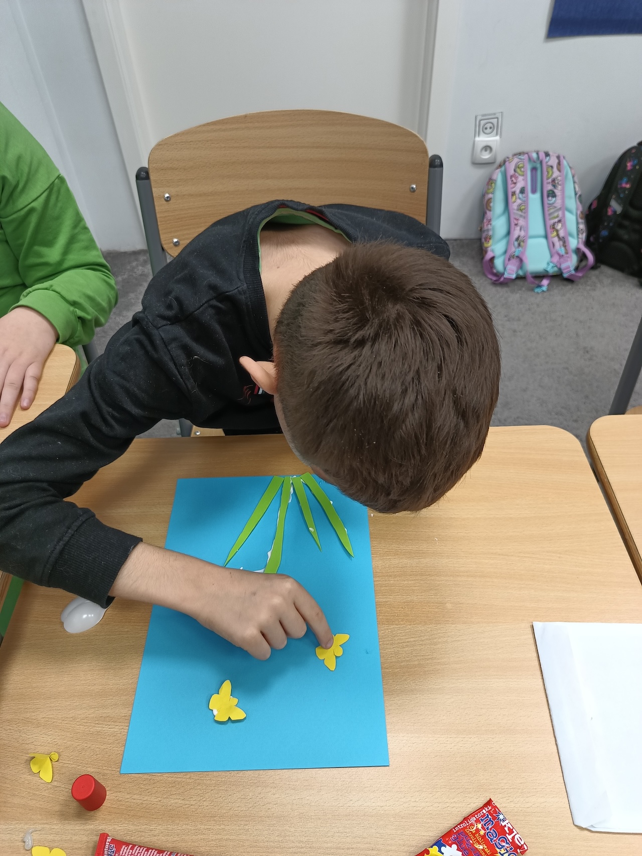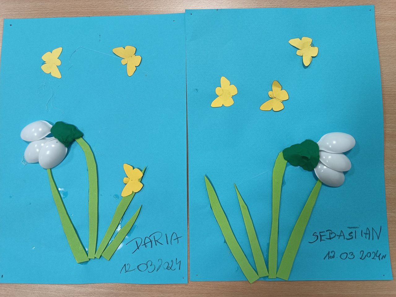 Uczniowie oddziału „I”, realizując temat tygodnia „Wiosna tuż, tuż”, poznawali i utrwalali nazwy pierwszych wiosennych kwiatów oraz wykonali pracę plastyczną „Przebiśnieg”. Rozwijali przy tym sprawność manualną. Utrwalali kolory: biały, zielony, żółty i niebieski, a także znak graficzny cyfry 3 oraz ćwiczyli przeliczanie do 3. Na ich prace przyleciały tez pierwsze wiosenne motylki-cytrynki.
